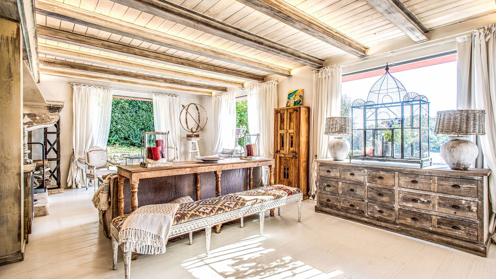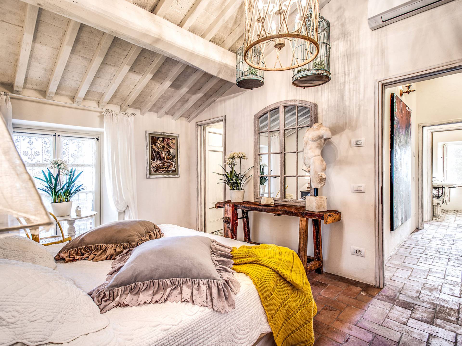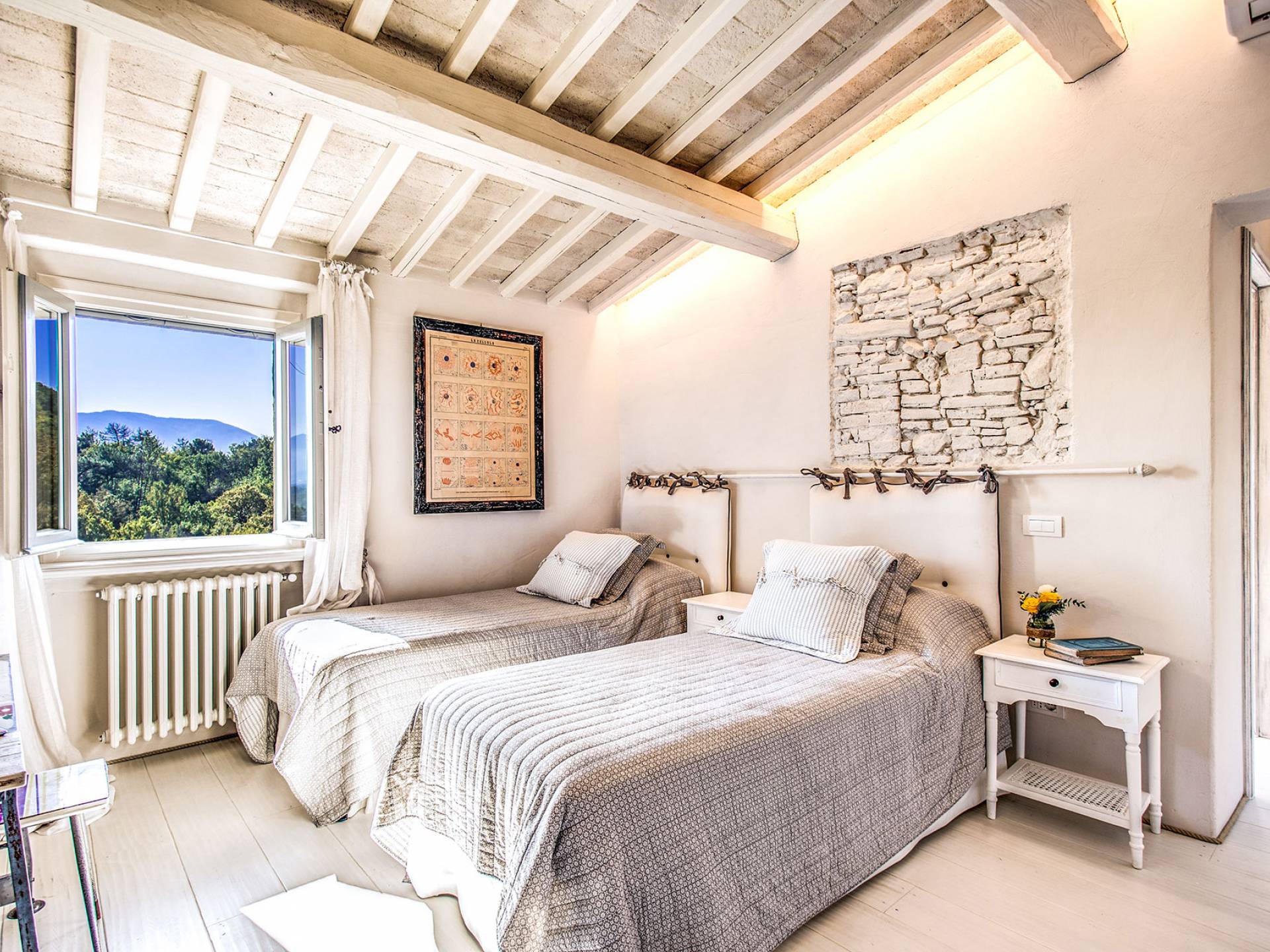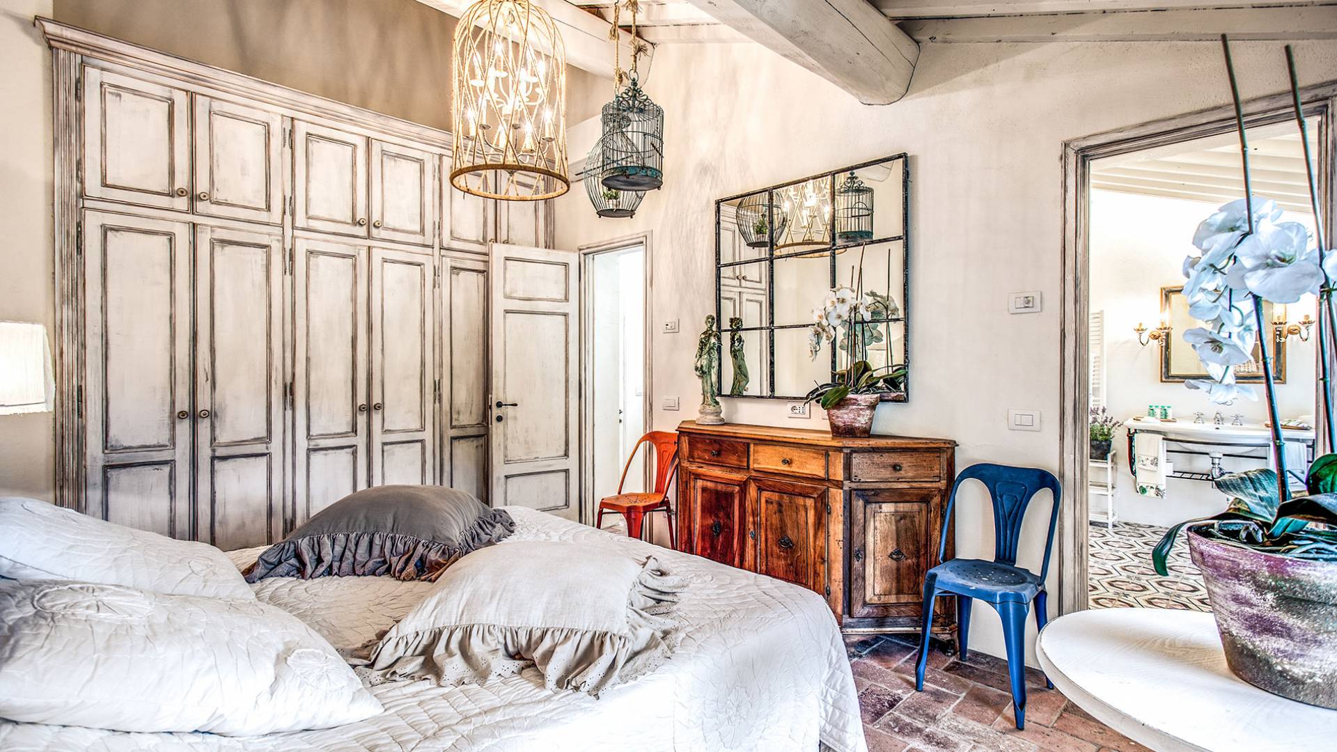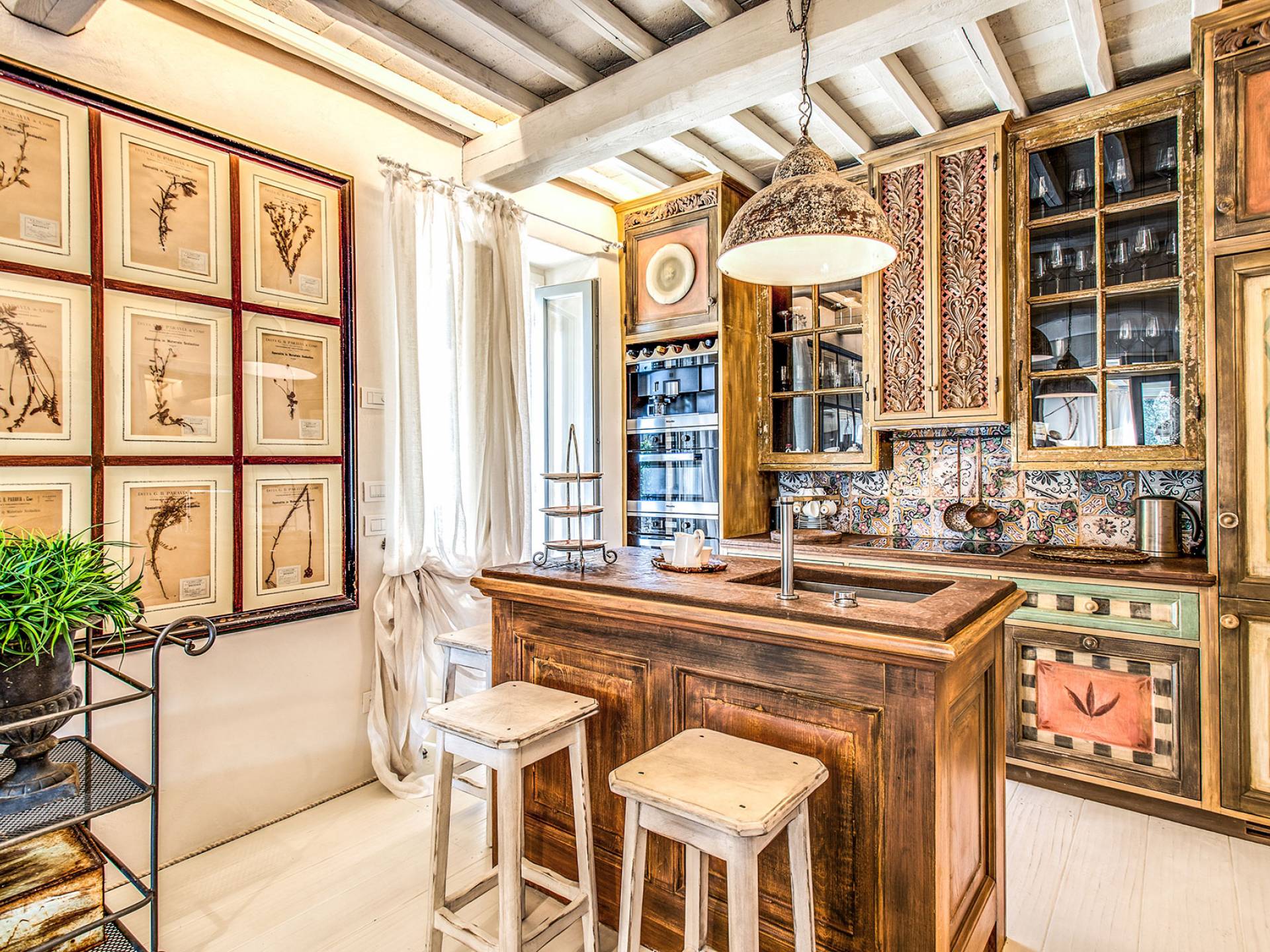 It is decorated in new-classic style with washed walls in pale shades, pietra serena and Italian wood. Countrymodern, the bohemian aesthetic of the property reflects its light and welcoming vibe: fresh and vintage, it oozes tranquillity and a home-like feeling which was exactly the intention of the owners, a couple of young artists and entrepreneurs dividing their time between Lucca, Forte dei Marmi, Ibiza and Geneva. The style encompasses traditional elements brought into the now with updated add-on’s for today’s lifestyles, offering a tennis court, a soccer field, a helipad, a pizza woodenoven and a security system with controlled circuit. Environmentally friendly and ecorestored, it also features a twenty metres heated swimming pool with view on the estate vineyards.