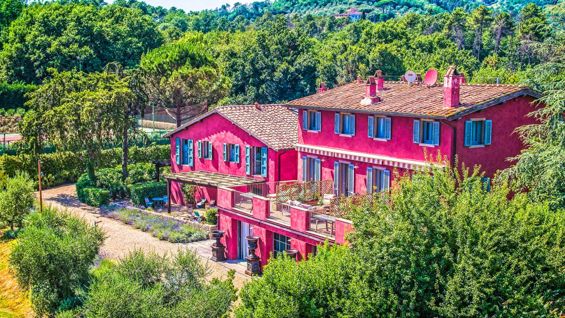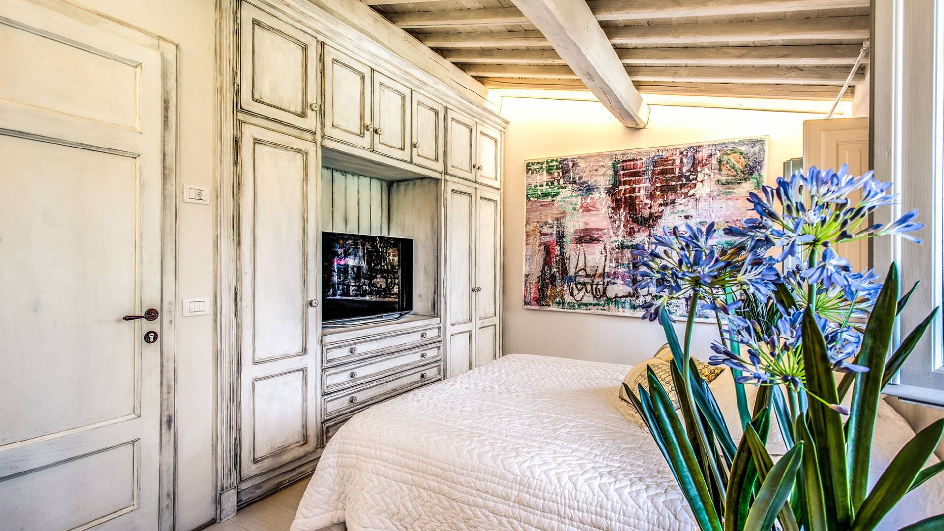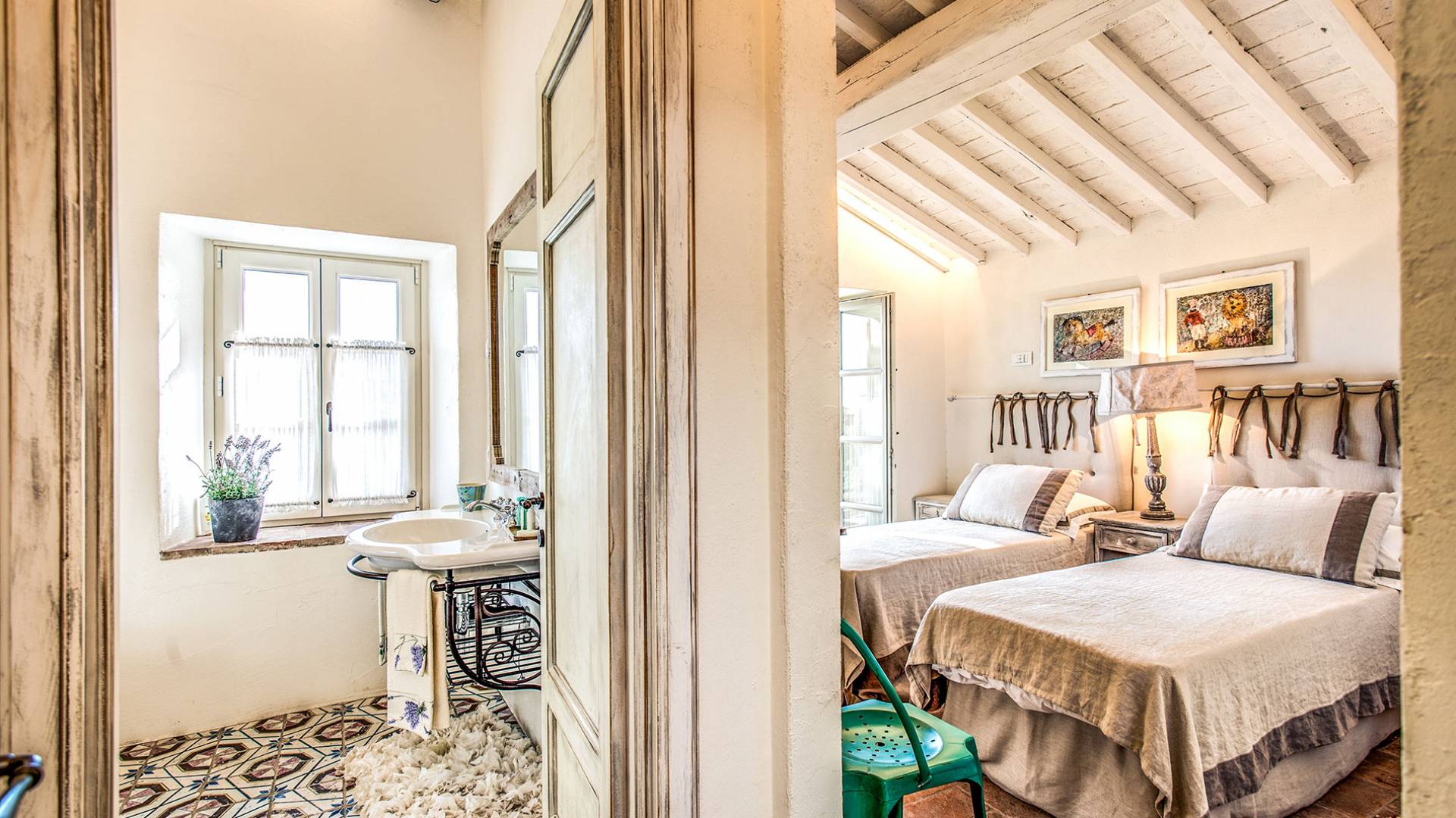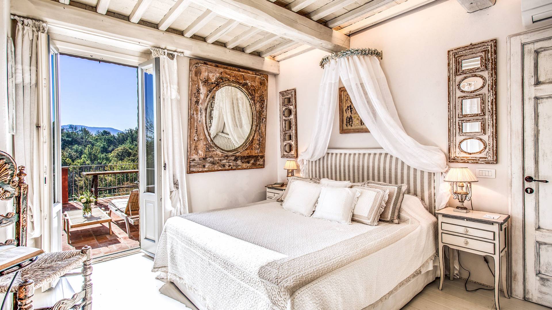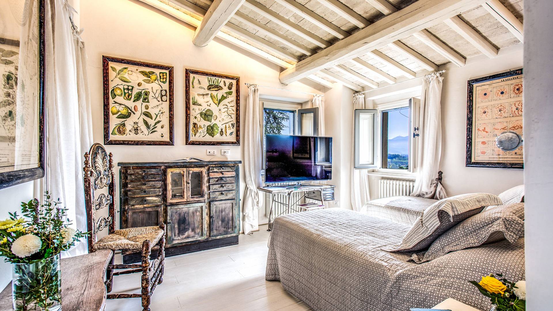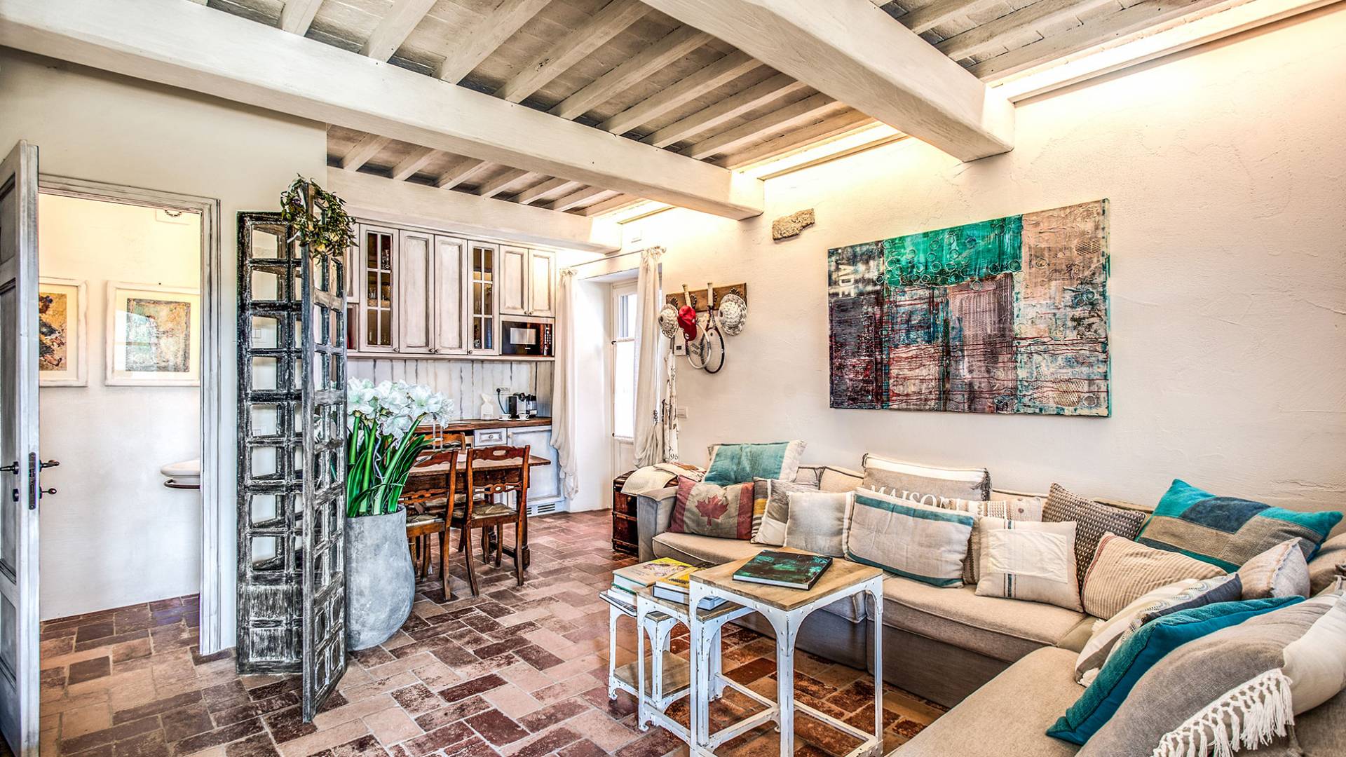 It is decorated in new-classic style with washed walls in pale shades, pietra serena and Italian wood. Countrymodern, the bohemian aesthetic of the property reflects its light and welcoming vibe: fresh and vintage, it oozes tranquillity and a home-like feeling which was exactly the intention of the owners, a couple of young artists and entrepreneurs dividing their time between Lucca, Forte dei Marmi, Ibiza and Geneva. The style encompasses traditional elements brought into the now with updated add-on’s for today’s lifestyles, offering a tennis court, a soccer field, a helipad, a pizza woodenoven and a security system with controlled circuit. Environmentally friendly and ecorestored, it also features a twenty metres heated swimming pool with view on the estate vineyards.