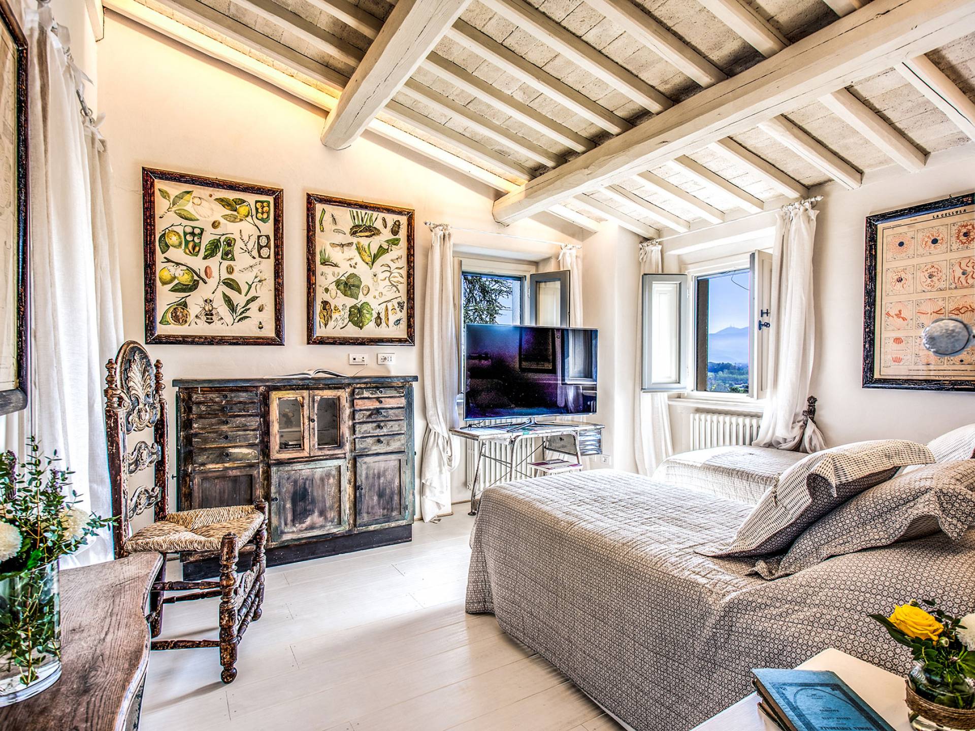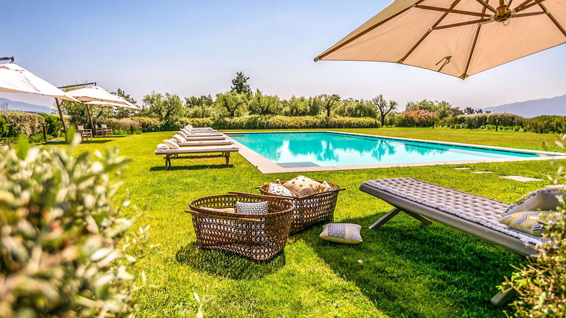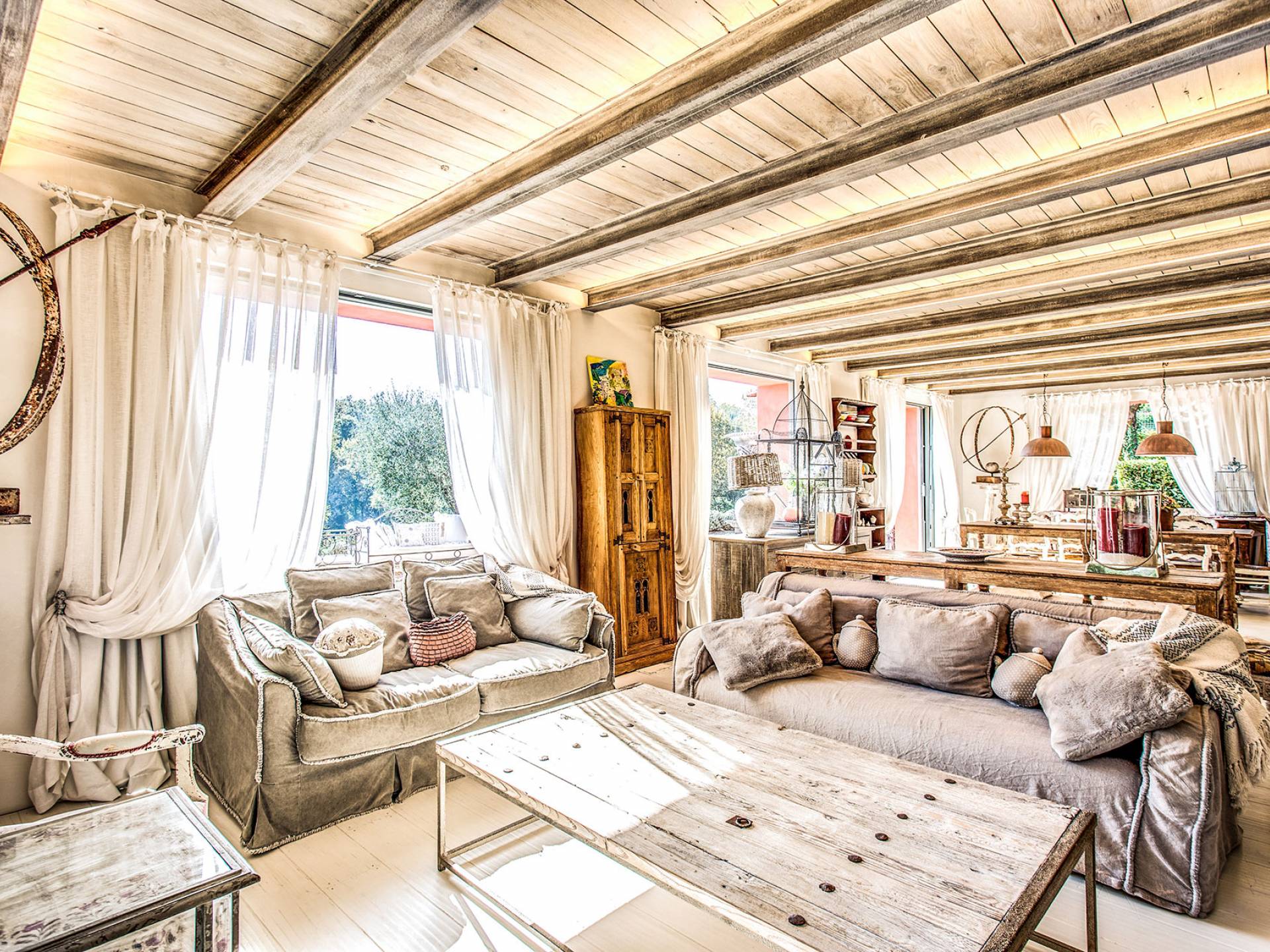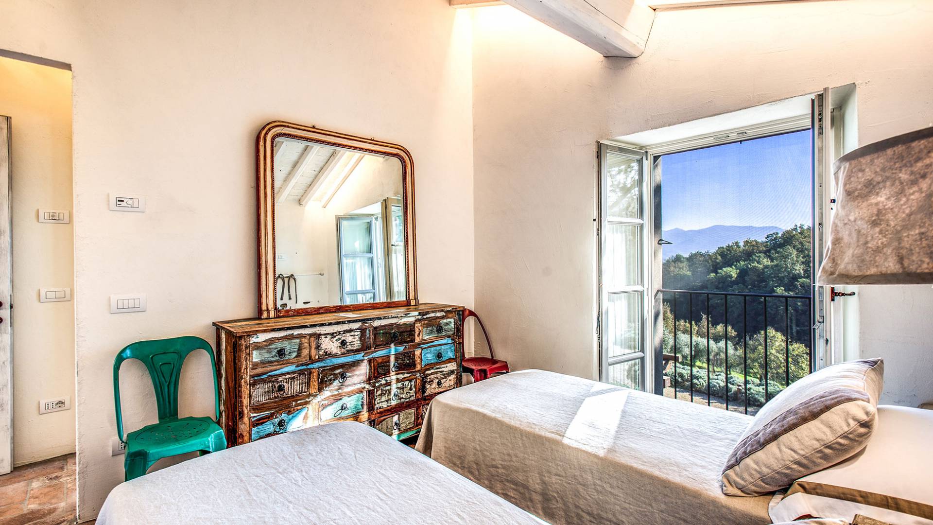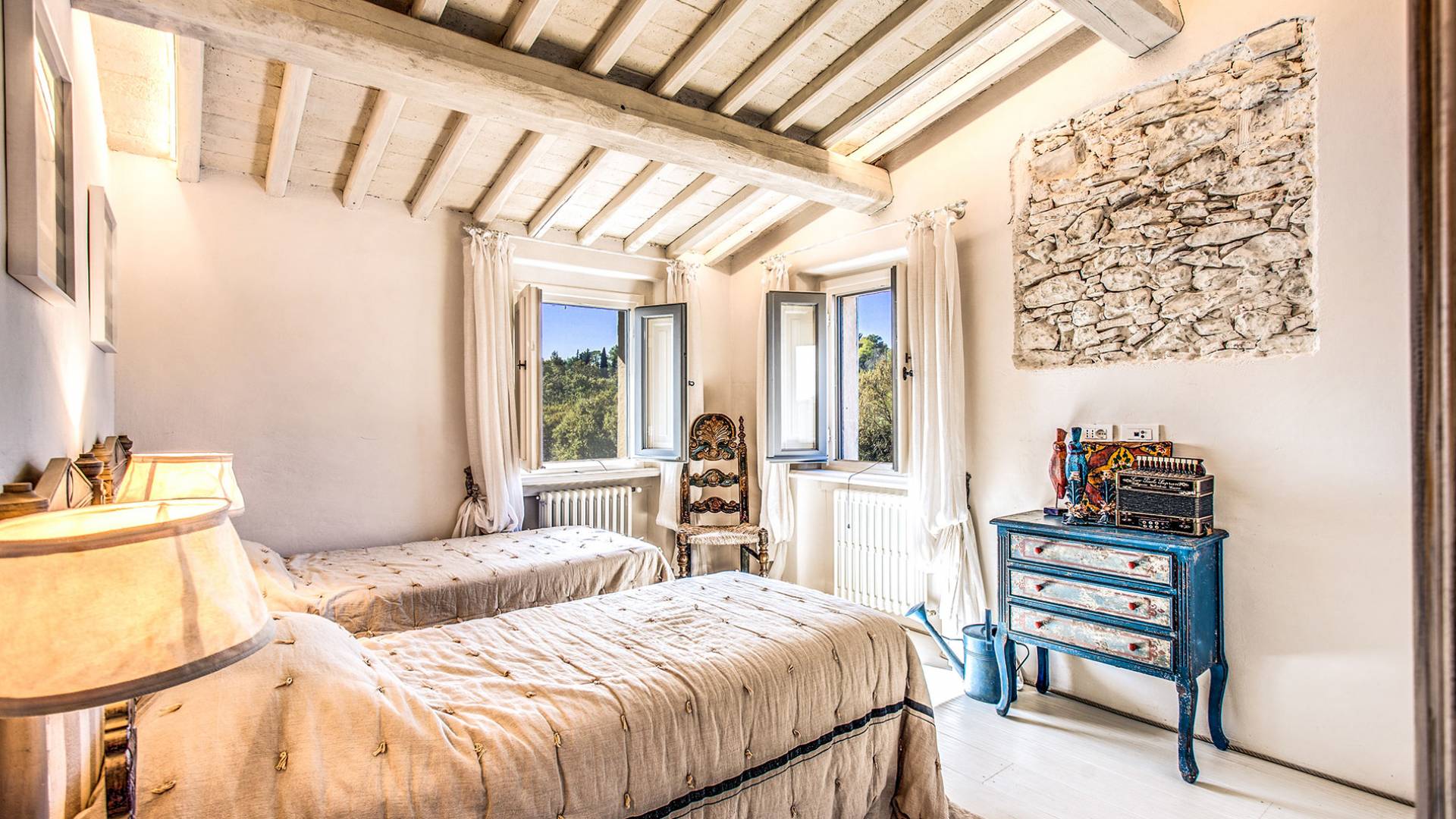 It is decorated in new-classic style with washed walls in pale shades, pietra serena and Italian wood. Countrymodern, the bohemian aesthetic of the property reflects its light and welcoming vibe: fresh and vintage, it oozes tranquillity and a home-like feeling which was exactly the intention of the owners, a couple of young artists and entrepreneurs dividing their time between Lucca, Forte dei Marmi, Ibiza and Geneva. The style encompasses traditional elements brought into the now with updated add-on’s for today’s lifestyles, offering a tennis court, a soccer field, a helipad, a pizza woodenoven and a security system with controlled circuit. Environmentally friendly and ecorestored, it also features a twenty metres heated swimming pool with view on the estate vineyards.