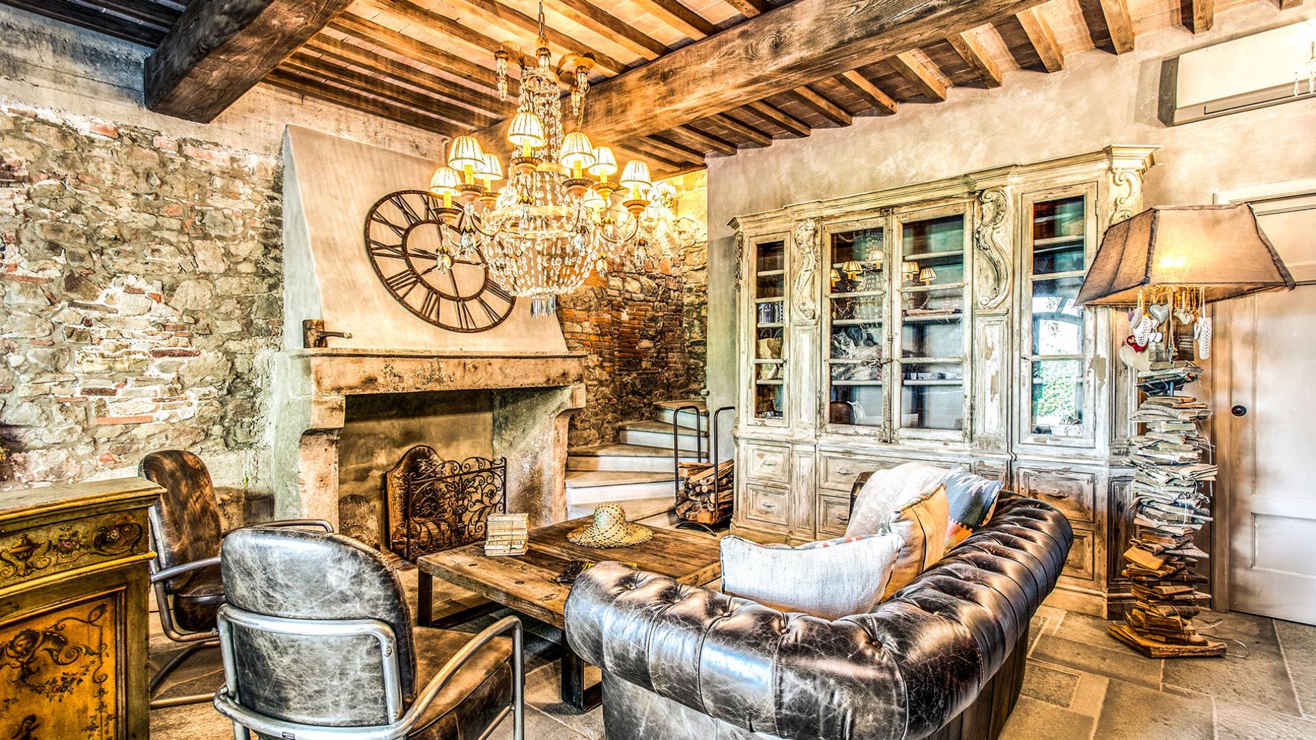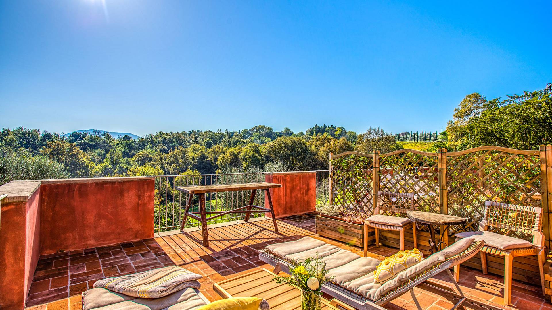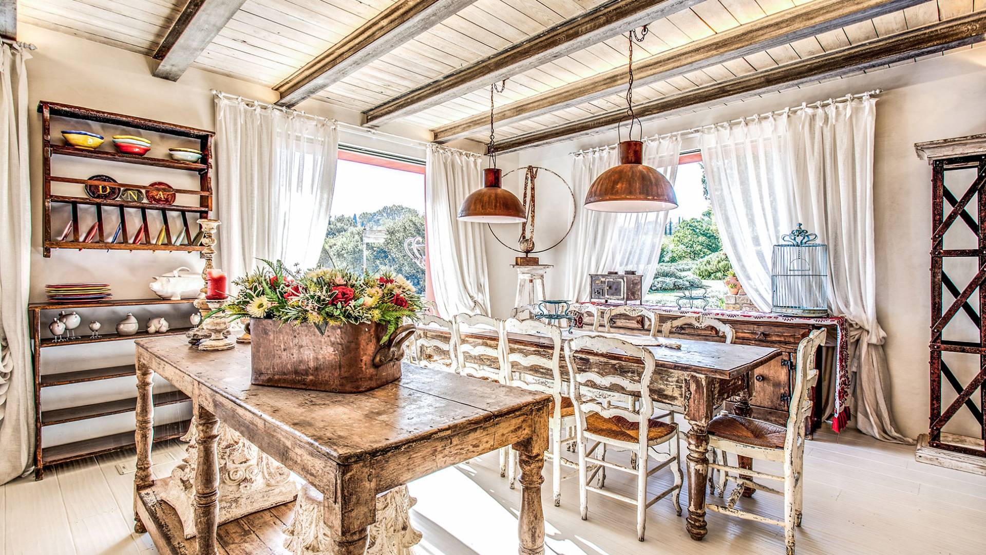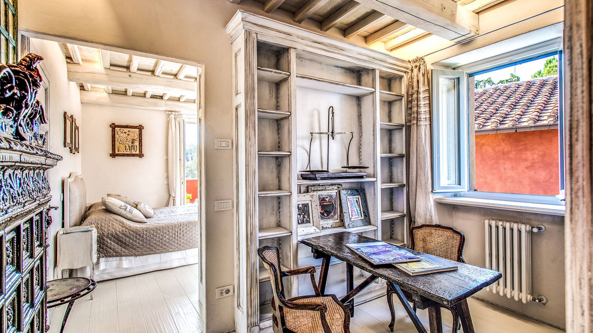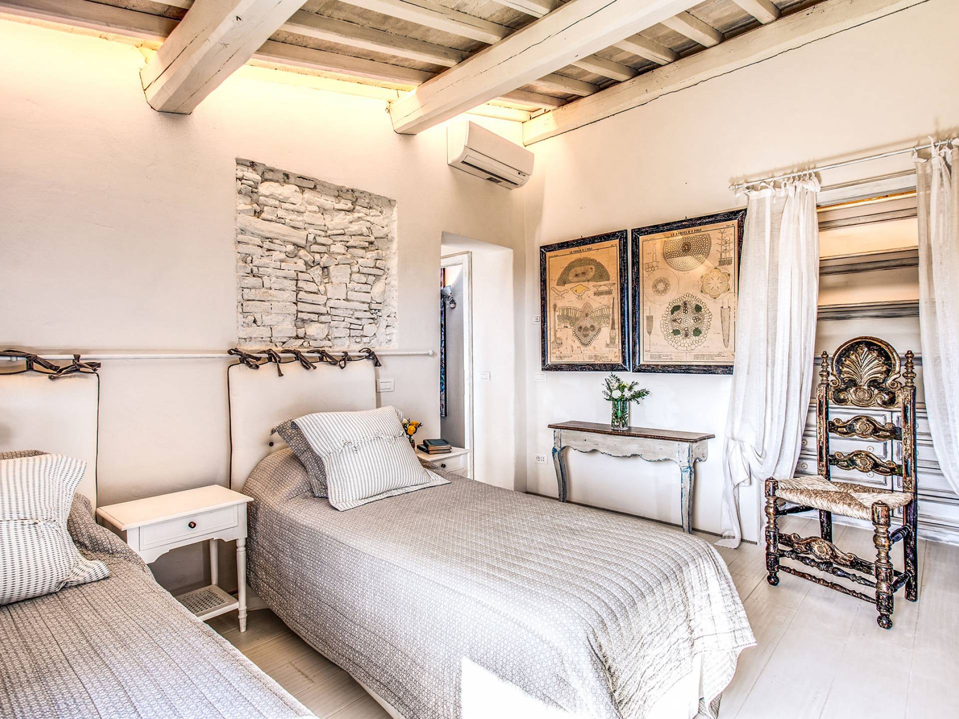 It is decorated in new-classic style with washed walls in pale shades, pietra serena and Italian wood. Countrymodern, the bohemian aesthetic of the property reflects its light and welcoming vibe: fresh and vintage, it oozes tranquillity and a home-like feeling which was exactly the intention of the owners, a couple of young artists and entrepreneurs dividing their time between Lucca, Forte dei Marmi, Ibiza and Geneva. The style encompasses traditional elements brought into the now with updated add-on’s for today’s lifestyles, offering a tennis court, a soccer field, a helipad, a pizza woodenoven and a security system with controlled circuit. Environmentally friendly and ecorestored, it also features a twenty metres heated swimming pool with view on the estate vineyards.