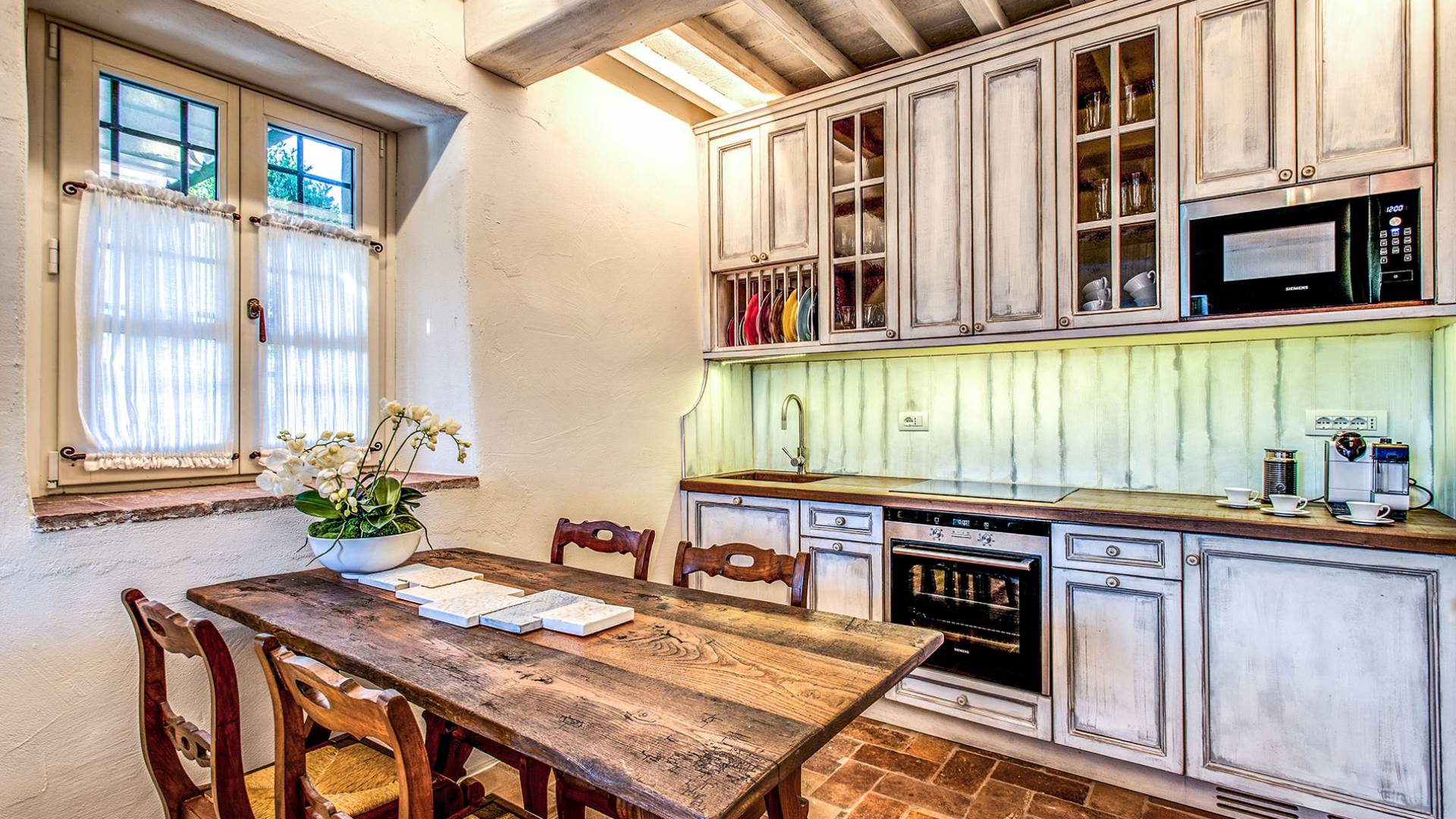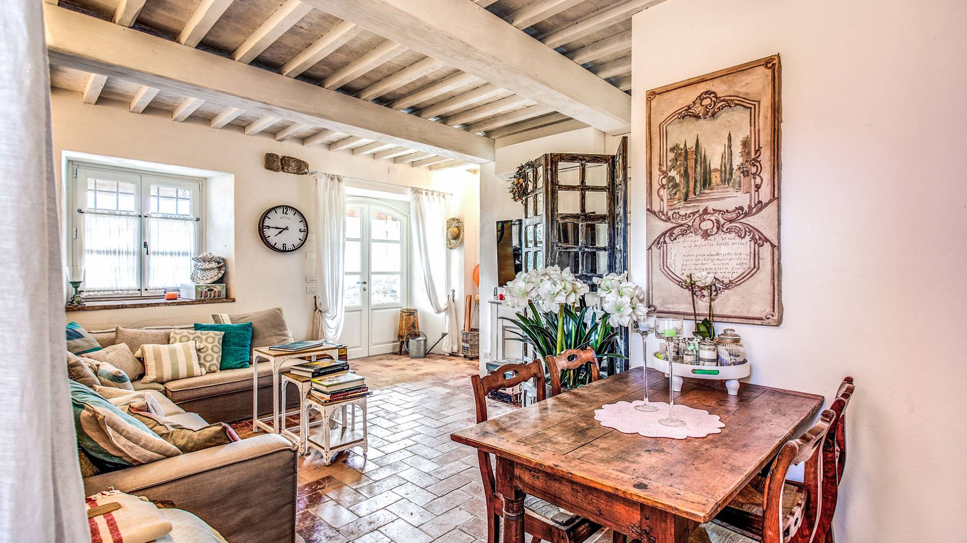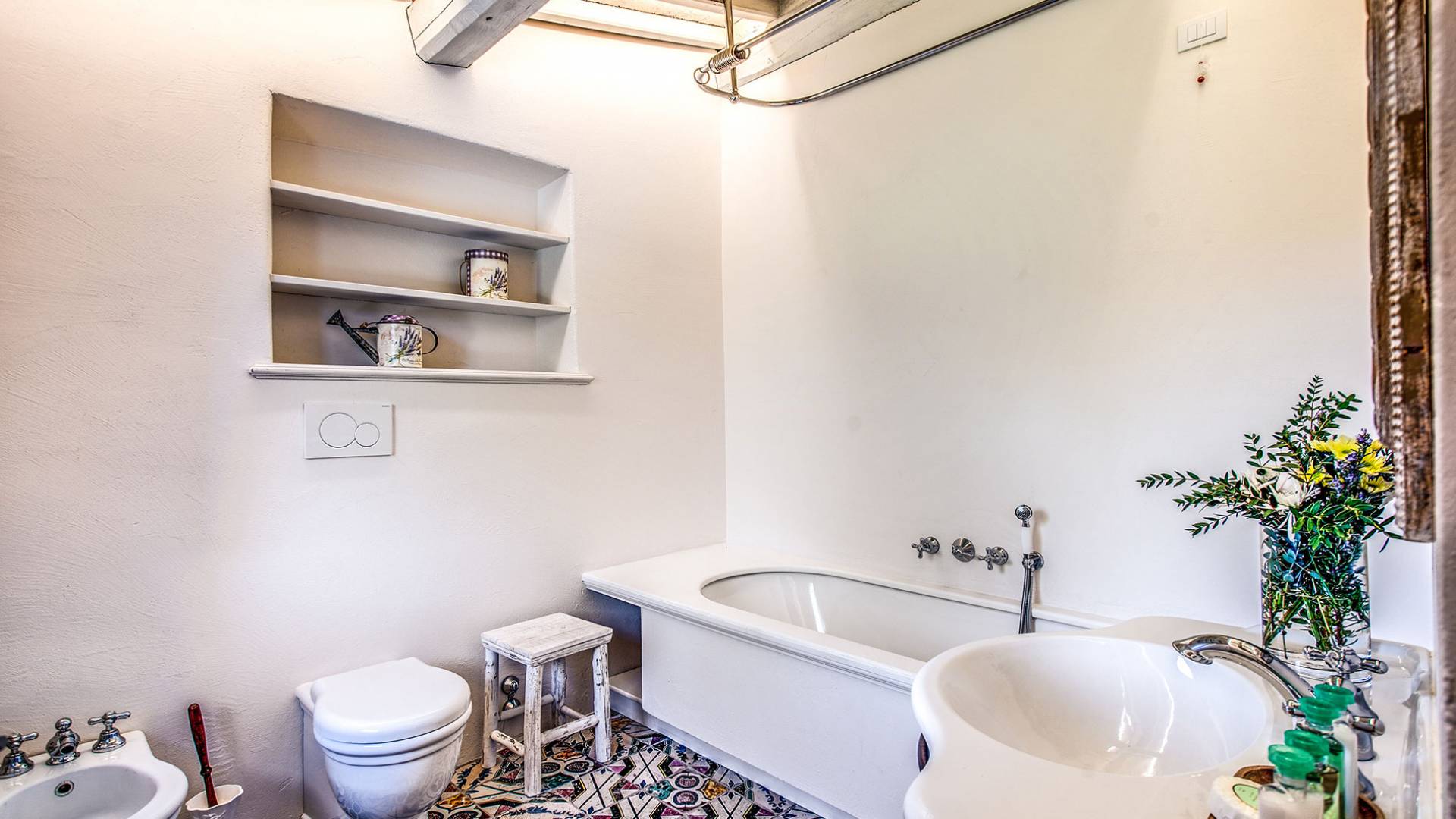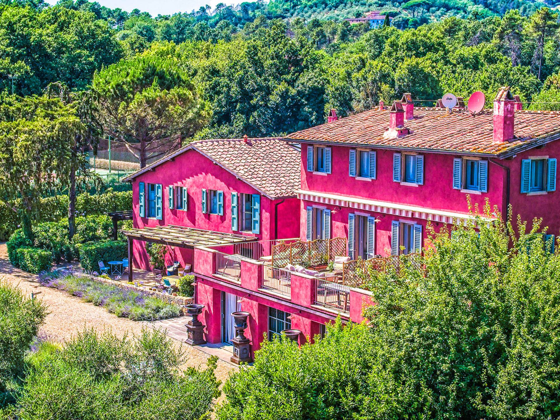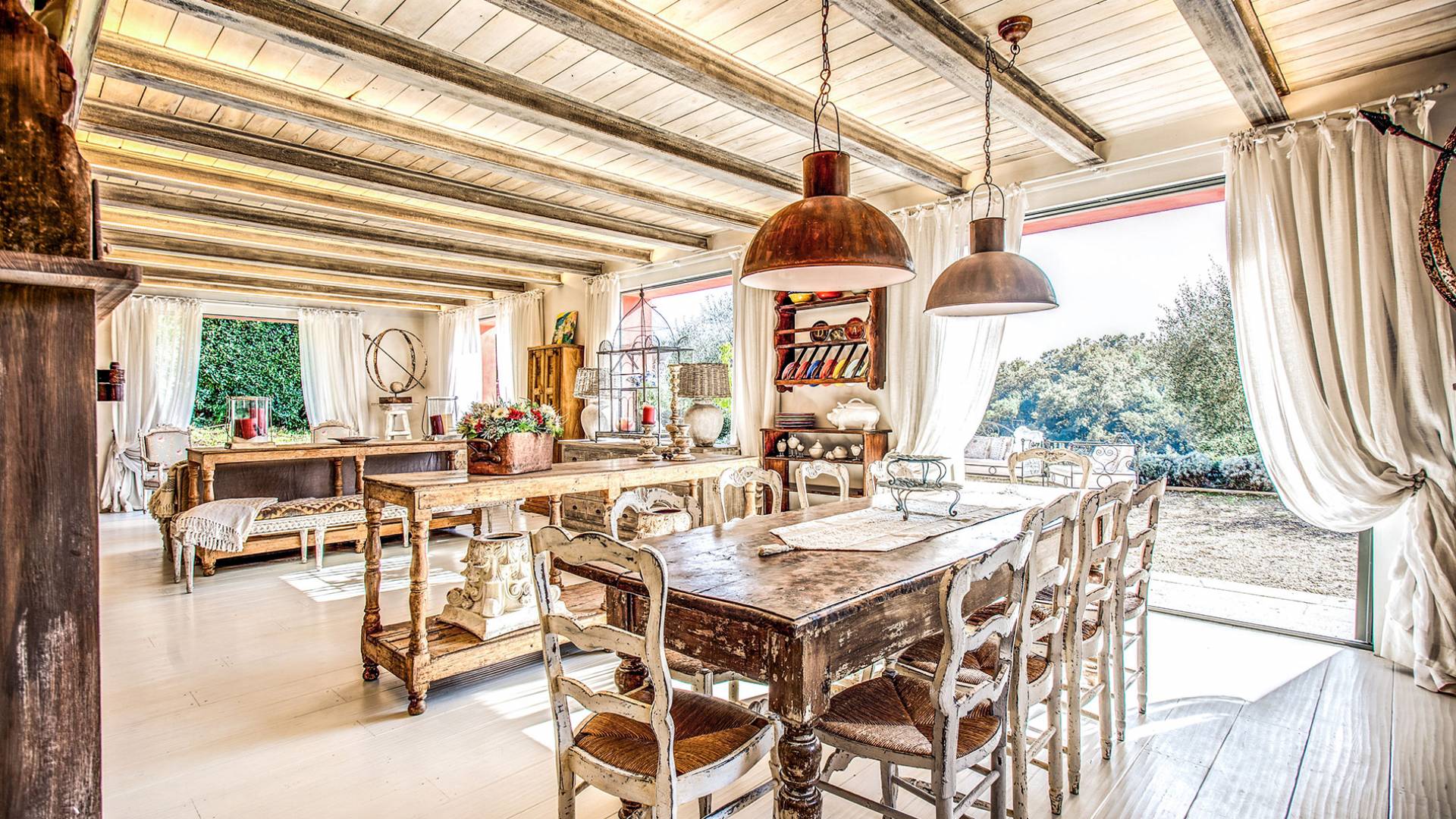 It is decorated in new-classic style with washed walls in pale shades, pietra serena and Italian wood. Countrymodern, the bohemian aesthetic of the property reflects its light and welcoming vibe: fresh and vintage, it oozes tranquillity and a home-like feeling which was exactly the intention of the owners, a couple of young artists and entrepreneurs dividing their time between Lucca, Forte dei Marmi, Ibiza and Geneva. The style encompasses traditional elements brought into the now with updated add-on’s for today’s lifestyles, offering a tennis court, a soccer field, a helipad, a pizza woodenoven and a security system with controlled circuit. Environmentally friendly and ecorestored, it also features a twenty metres heated swimming pool with view on the estate vineyards.