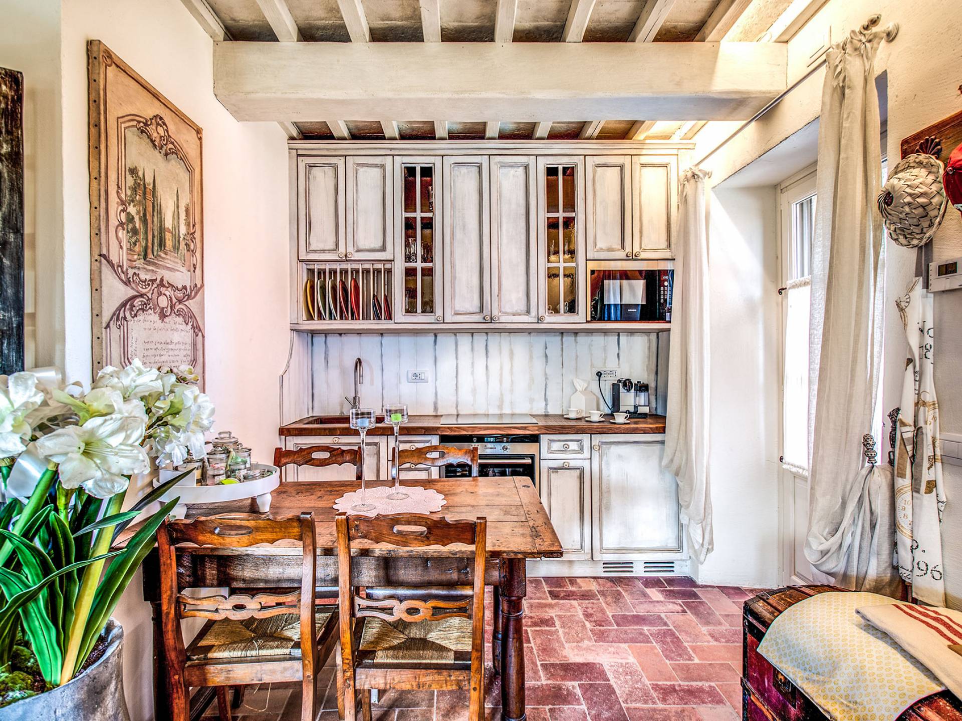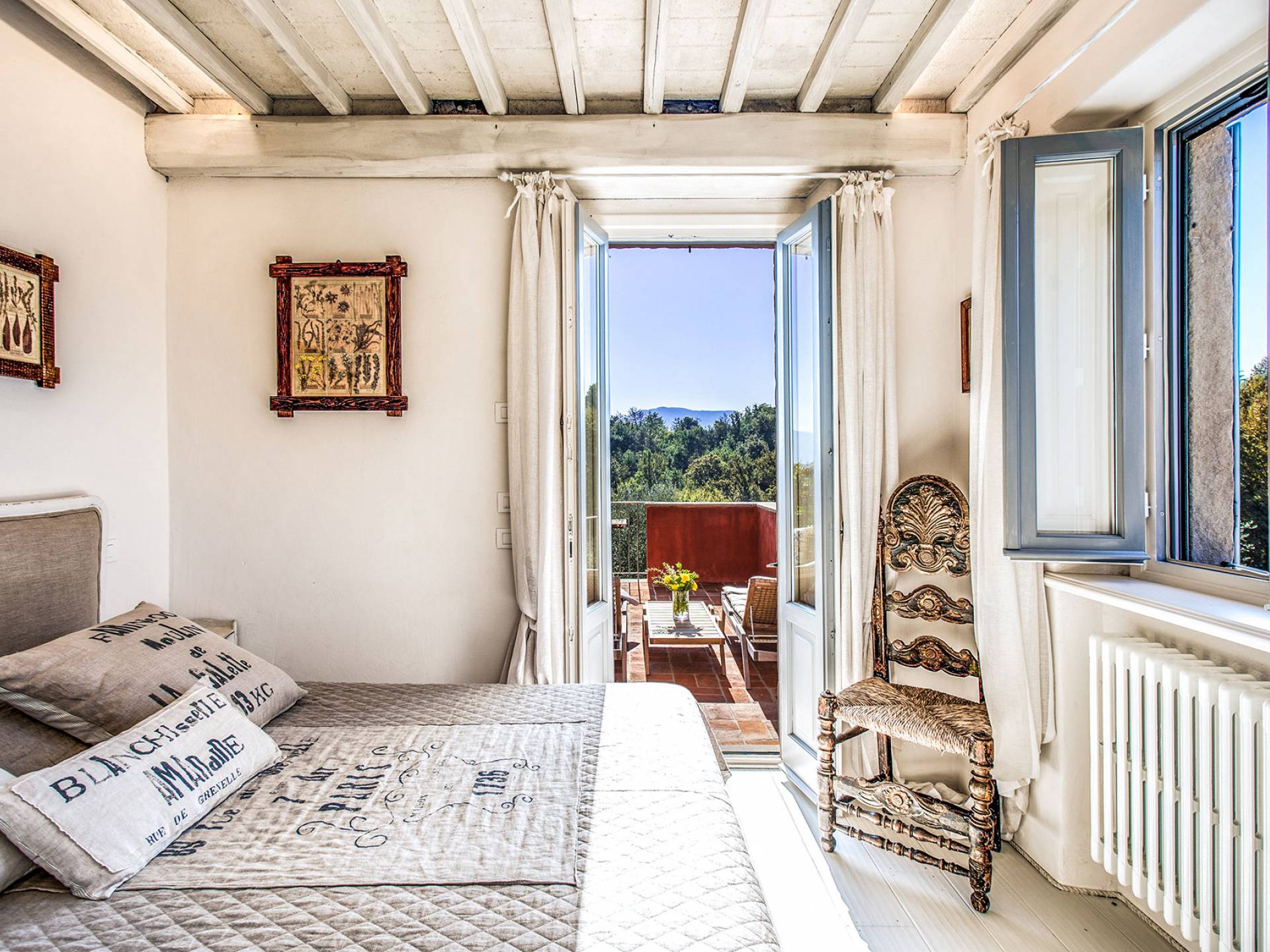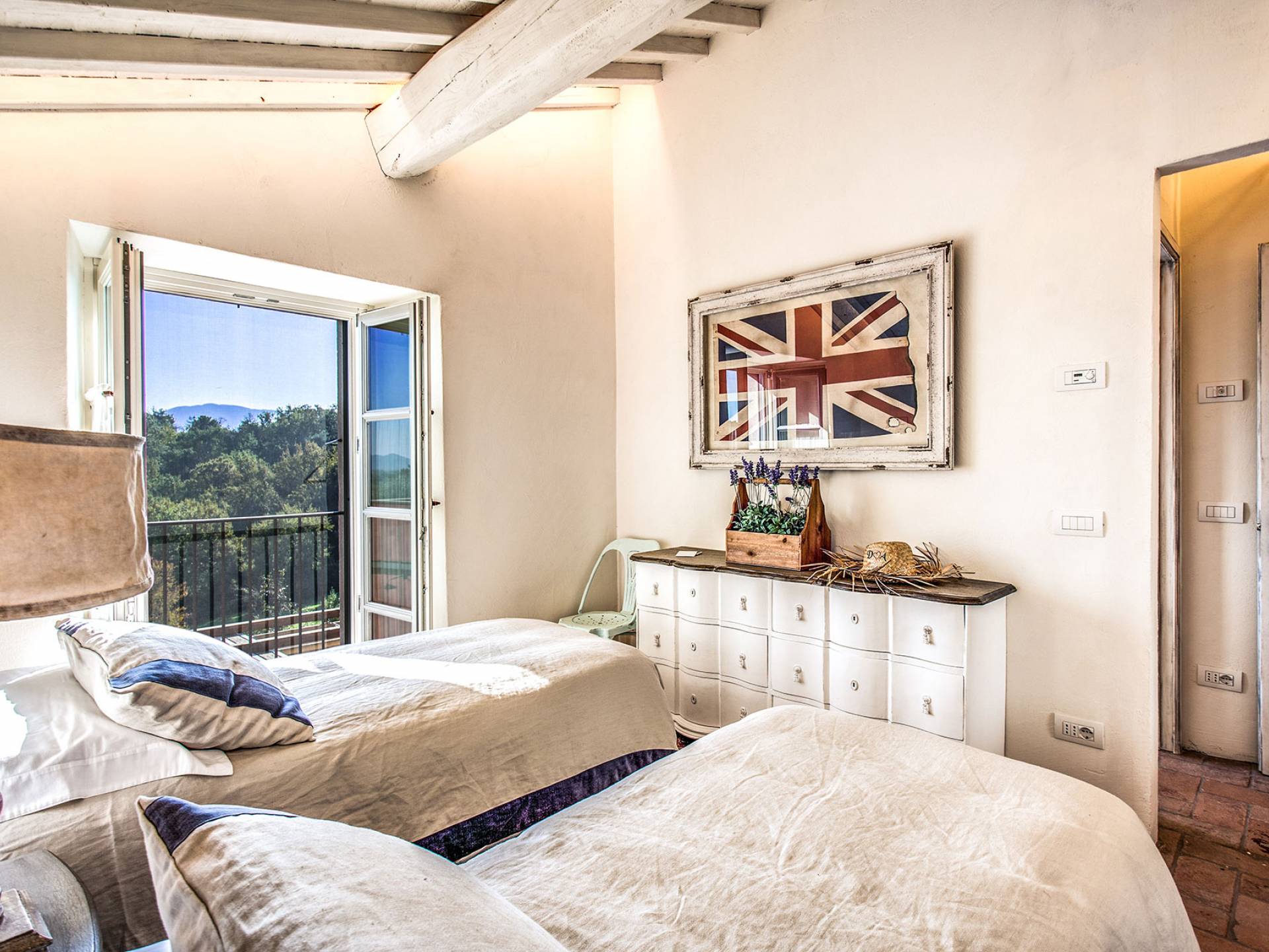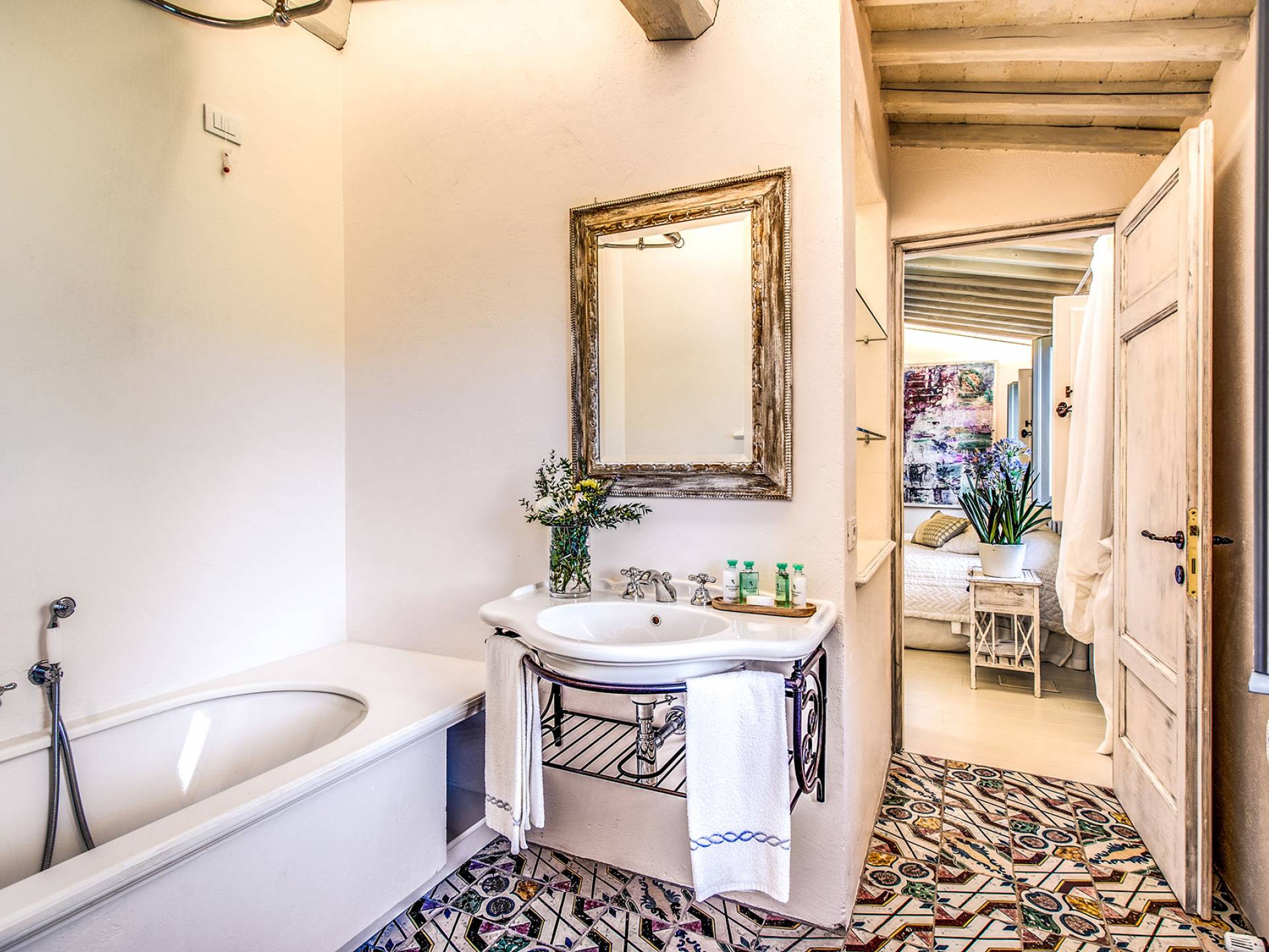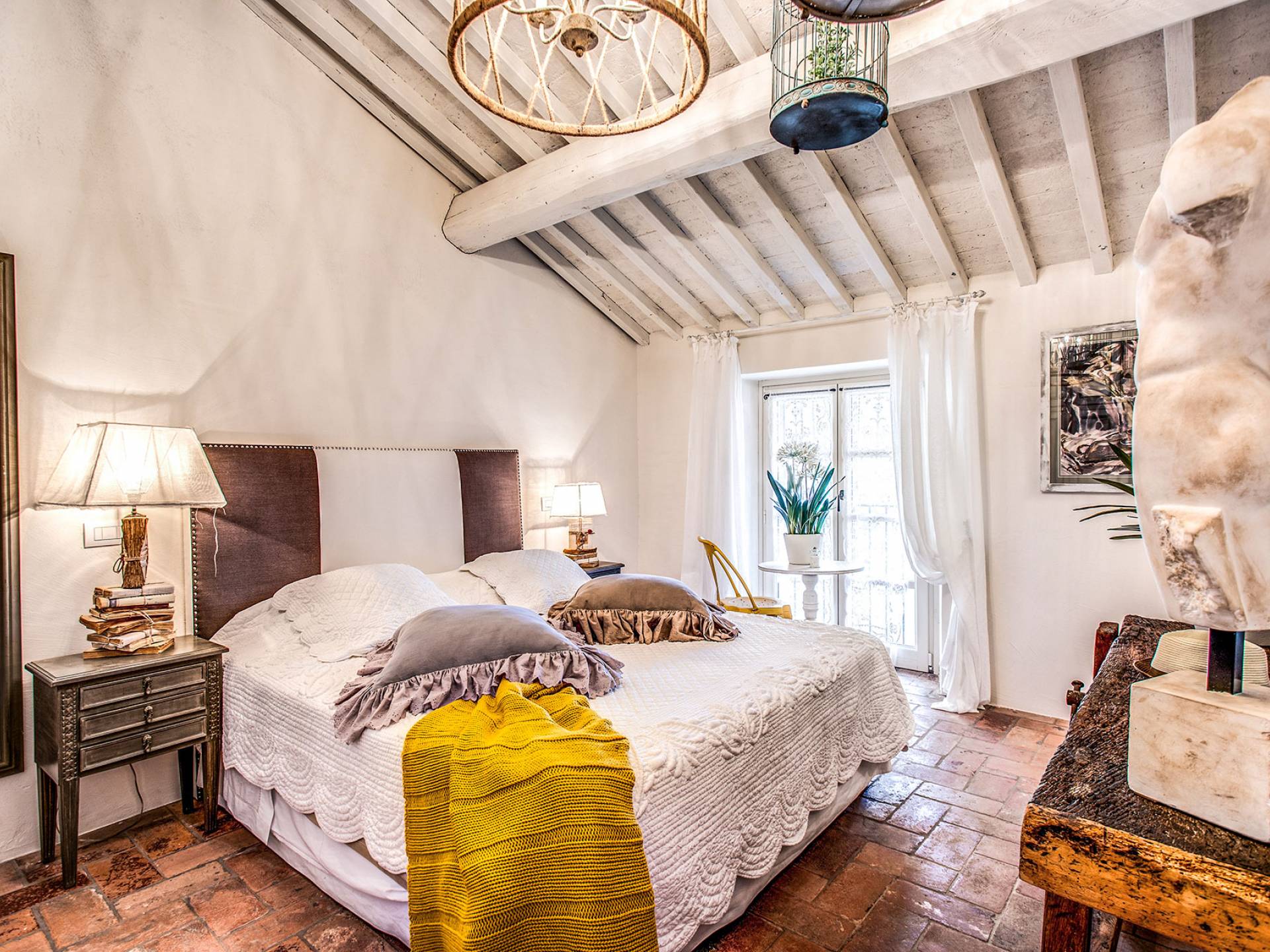 It is decorated in new-classic style with washed walls in pale shades, pietra serena and Italian wood. Countrymodern, the bohemian aesthetic of the property reflects its light and welcoming vibe: fresh and vintage, it oozes tranquillity and a home-like feeling which was exactly the intention of the owners, a couple of young artists and entrepreneurs dividing their time between Lucca, Forte dei Marmi, Ibiza and Geneva. The style encompasses traditional elements brought into the now with updated add-on’s for today’s lifestyles, offering a tennis court, a soccer field, a helipad, a pizza woodenoven and a security system with controlled circuit. Environmentally friendly and ecorestored, it also features a twenty metres heated swimming pool with view on the estate vineyards.