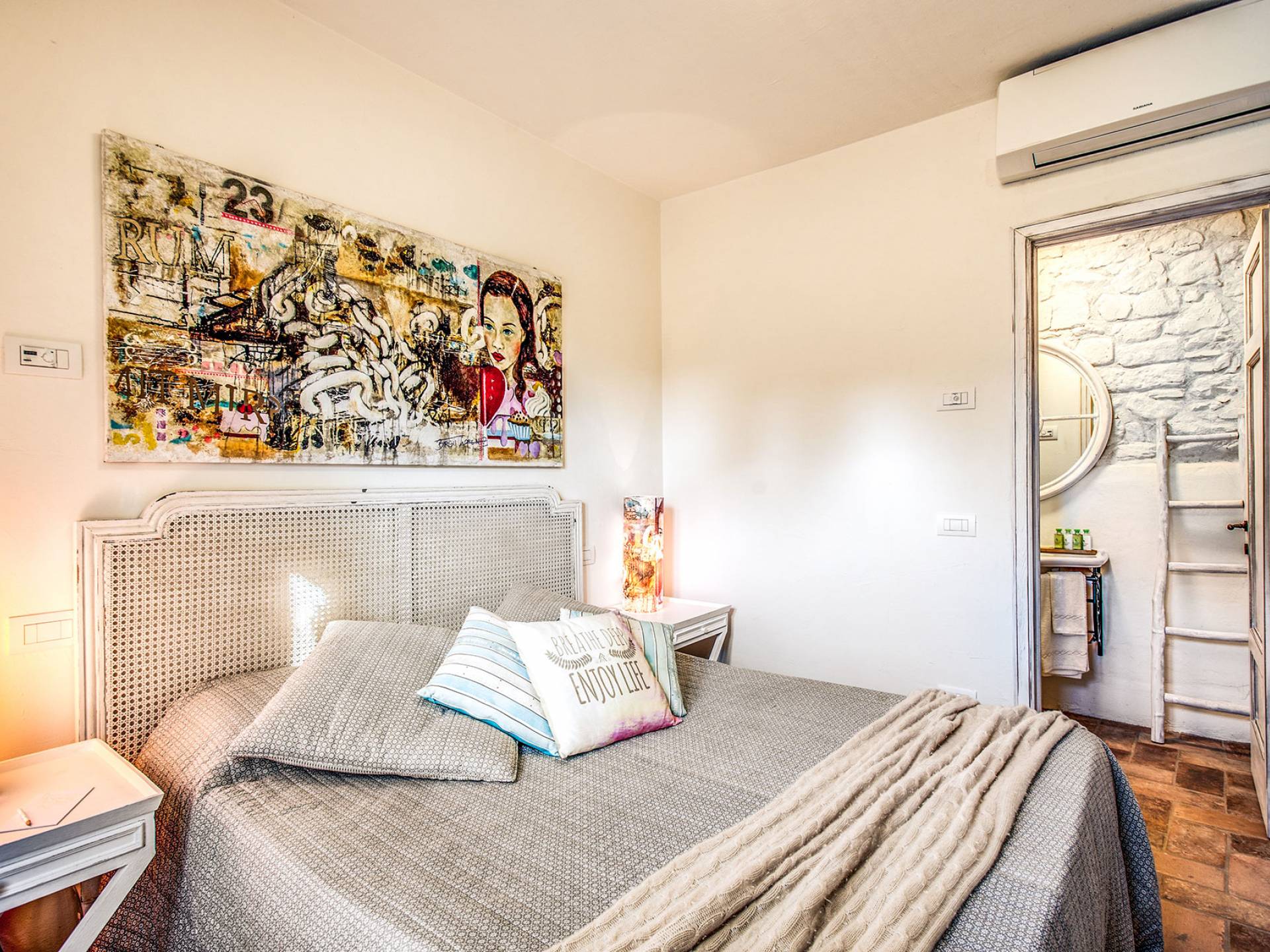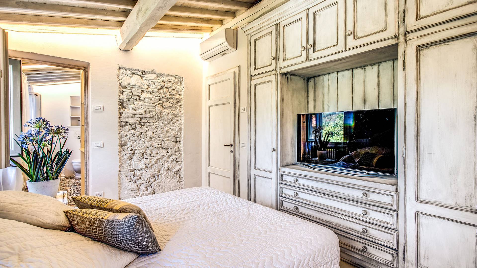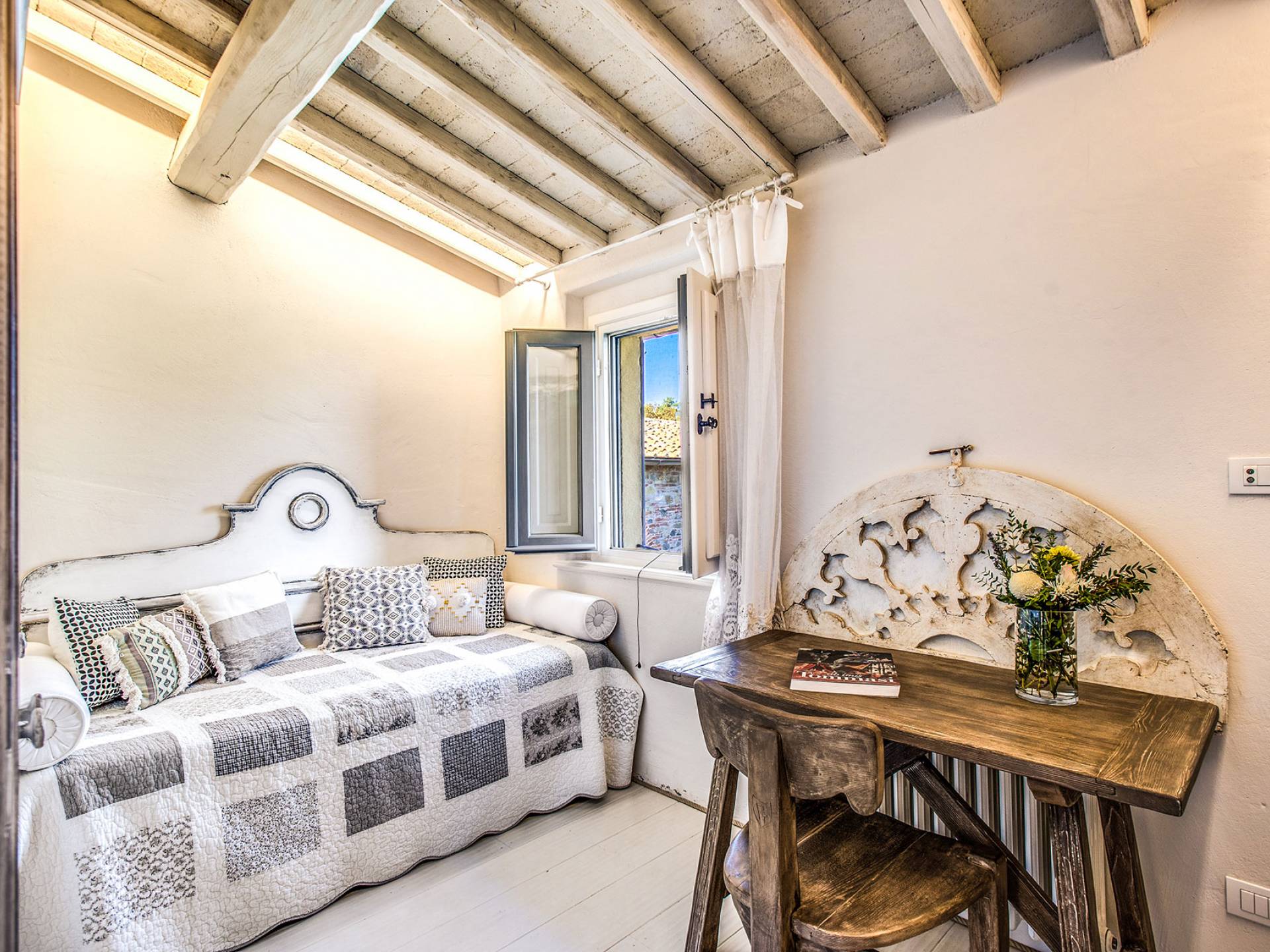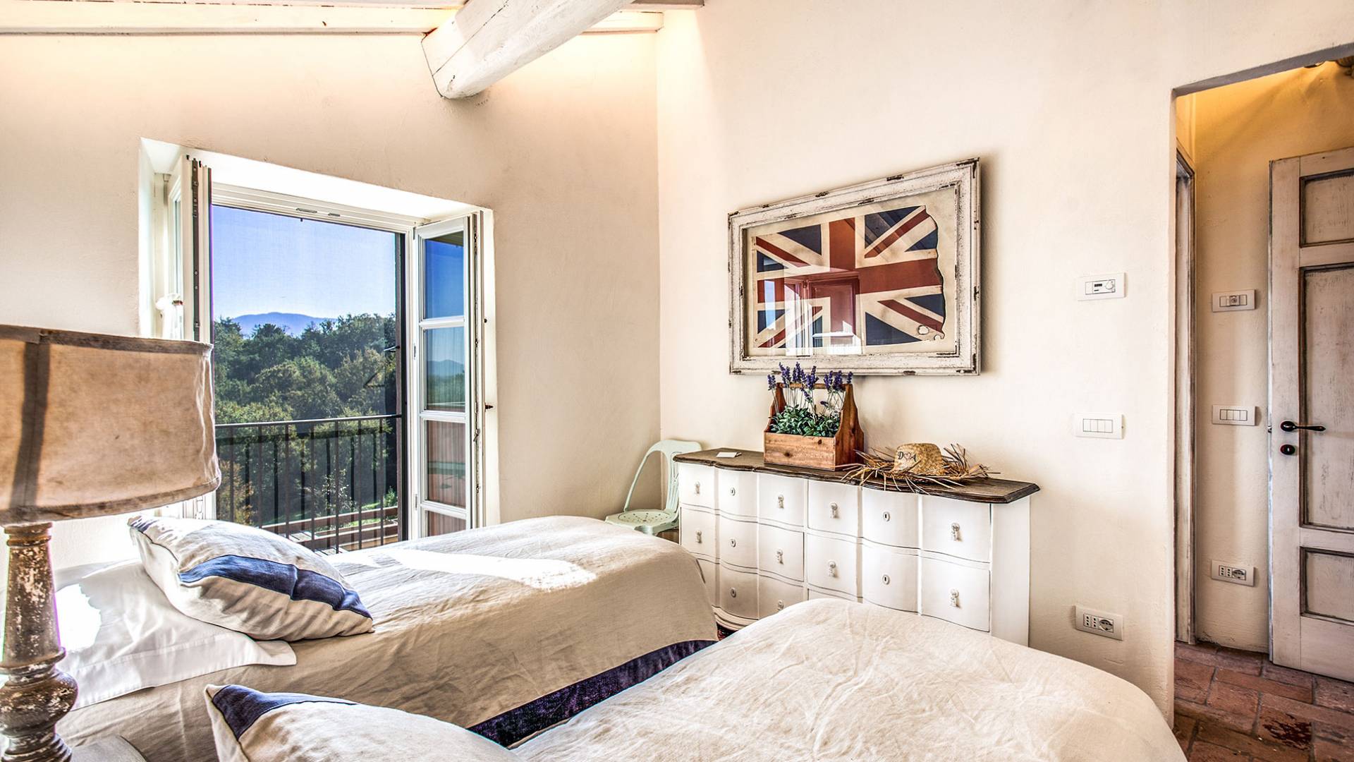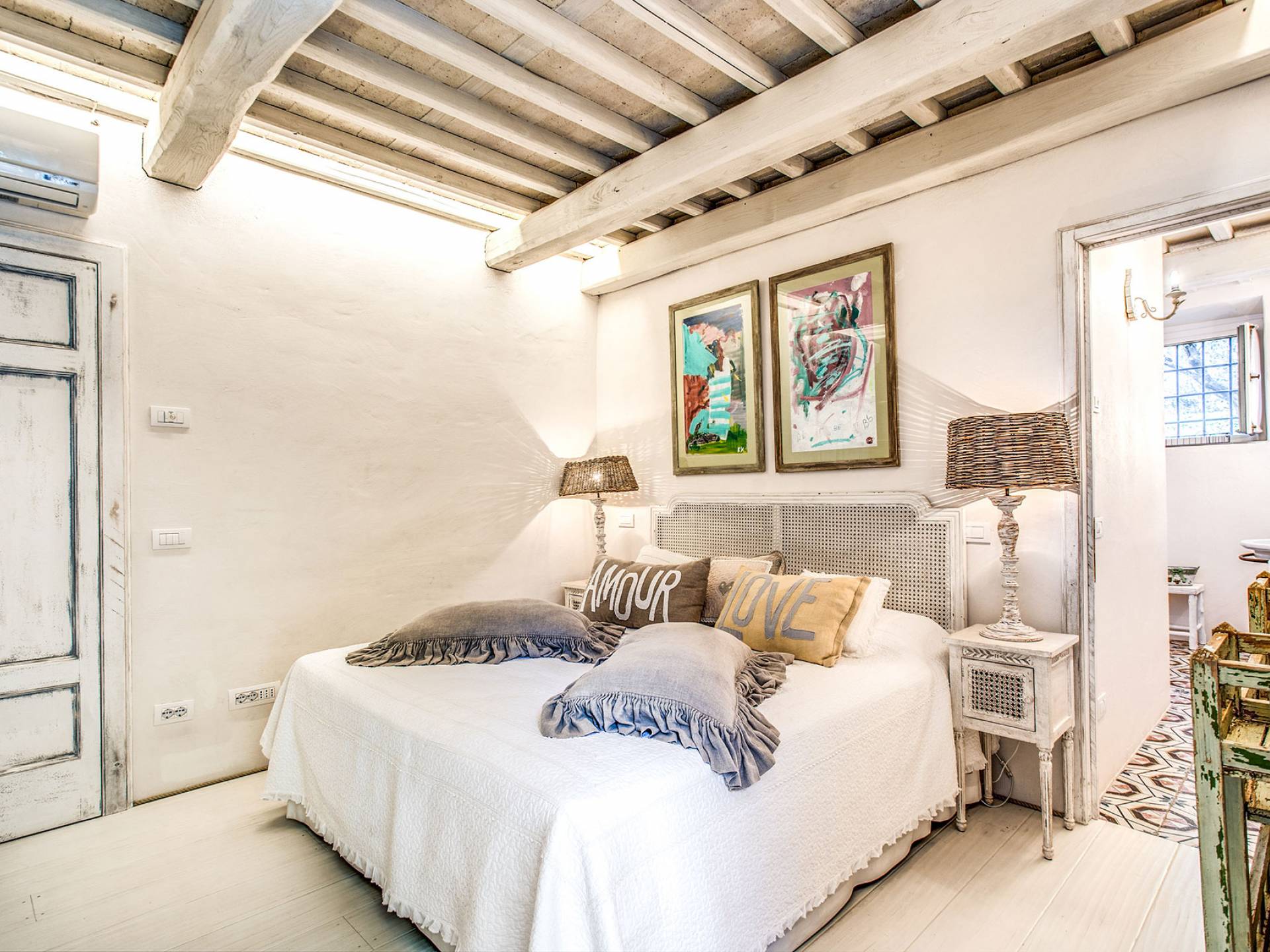 It is decorated in new-classic style with washed walls in pale shades, pietra serena and Italian wood. Countrymodern, the bohemian aesthetic of the property reflects its light and welcoming vibe: fresh and vintage, it oozes tranquillity and a home-like feeling which was exactly the intention of the owners, a couple of young artists and entrepreneurs dividing their time between Lucca, Forte dei Marmi, Ibiza and Geneva. The style encompasses traditional elements brought into the now with updated add-on’s for today’s lifestyles, offering a tennis court, a soccer field, a helipad, a pizza woodenoven and a security system with controlled circuit. Environmentally friendly and ecorestored, it also features a twenty metres heated swimming pool with view on the estate vineyards.