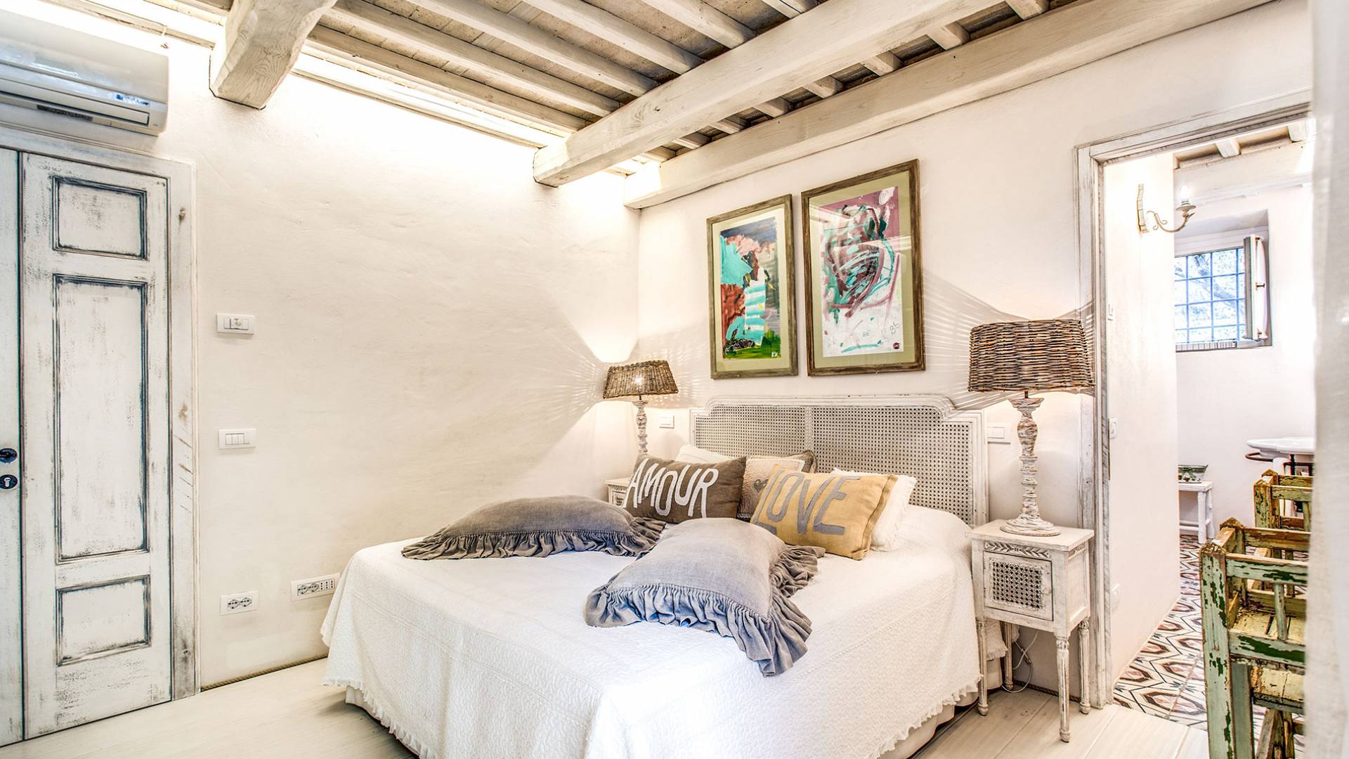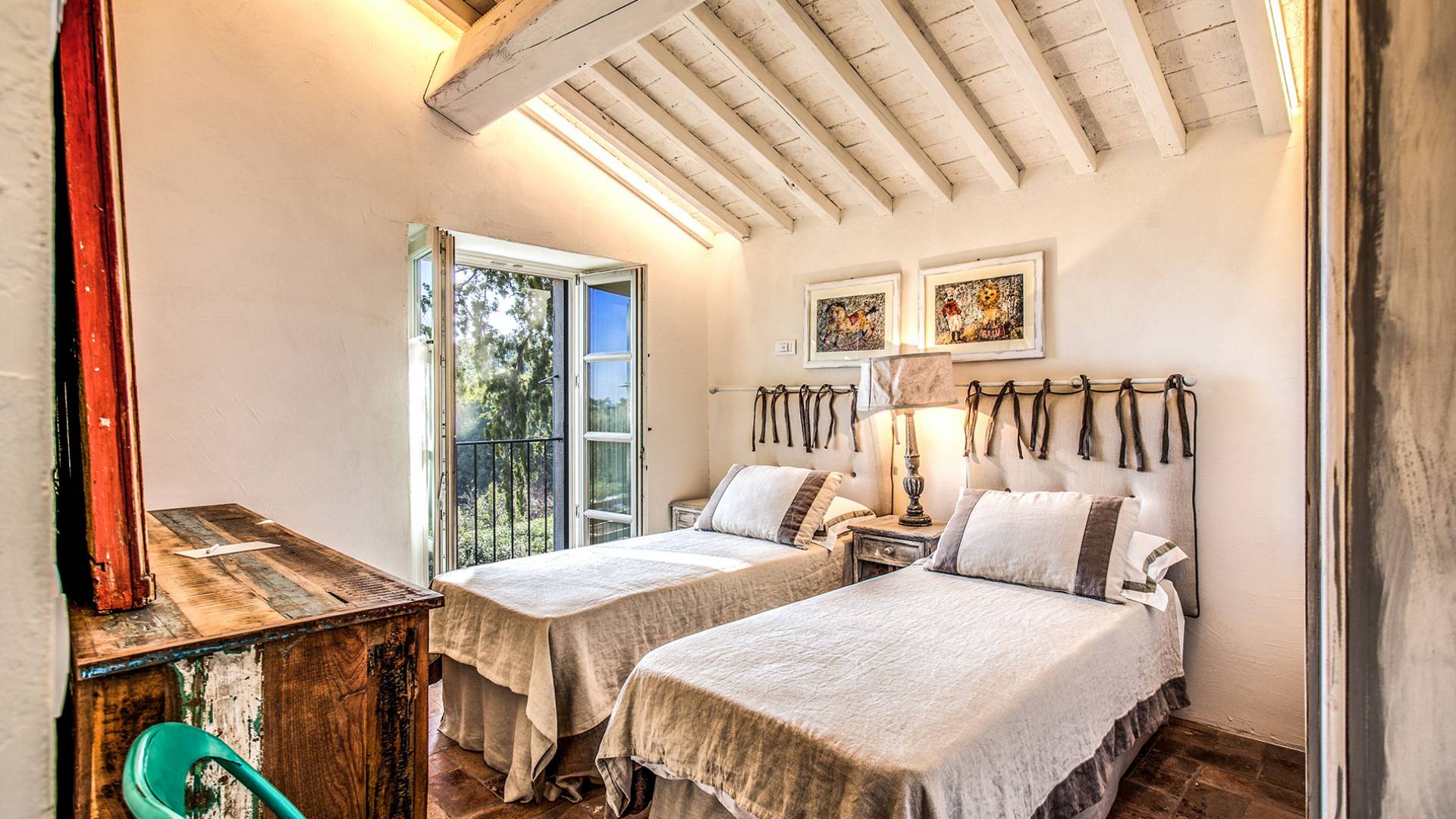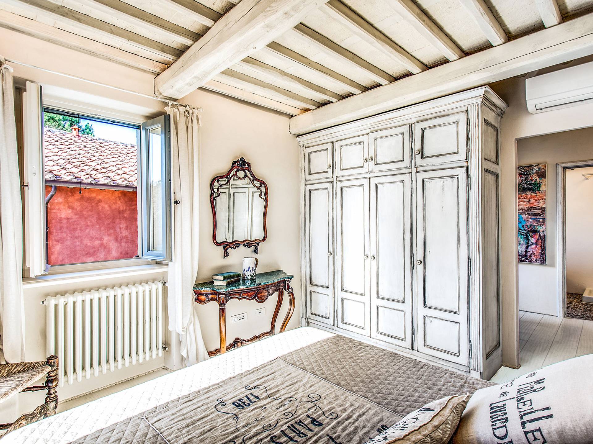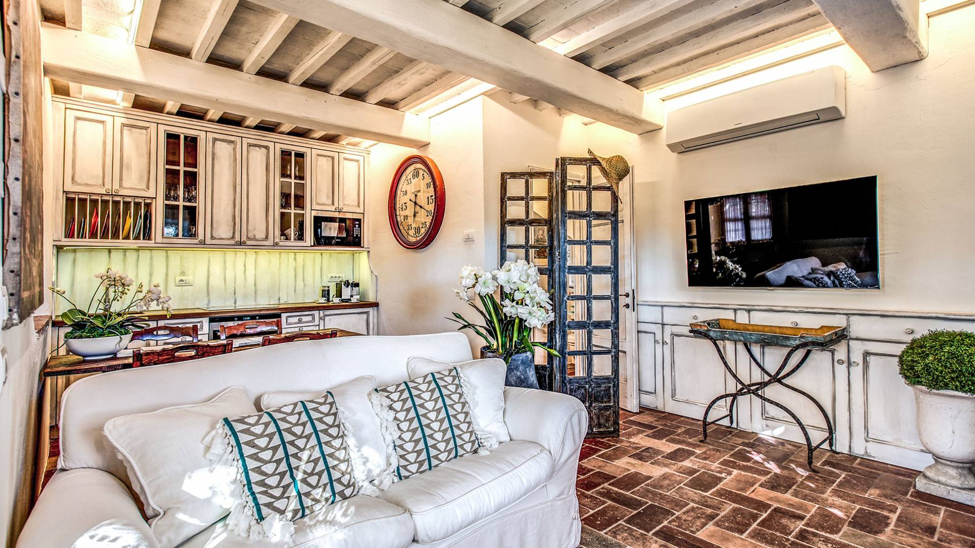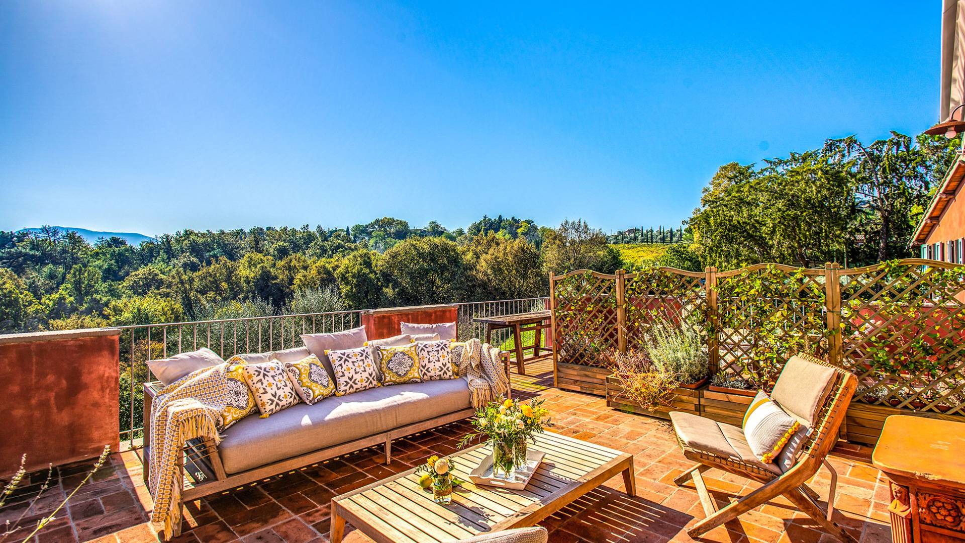 It is decorated in new-classic style with washed walls in pale shades, pietra serena and Italian wood. Countrymodern, the bohemian aesthetic of the property reflects its light and welcoming vibe: fresh and vintage, it oozes tranquillity and a home-like feeling which was exactly the intention of the owners, a couple of young artists and entrepreneurs dividing their time between Lucca, Forte dei Marmi, Ibiza and Geneva. The style encompasses traditional elements brought into the now with updated add-on’s for today’s lifestyles, offering a tennis court, a soccer field, a helipad, a pizza woodenoven and a security system with controlled circuit. Environmentally friendly and ecorestored, it also features a twenty metres heated swimming pool with view on the estate vineyards.