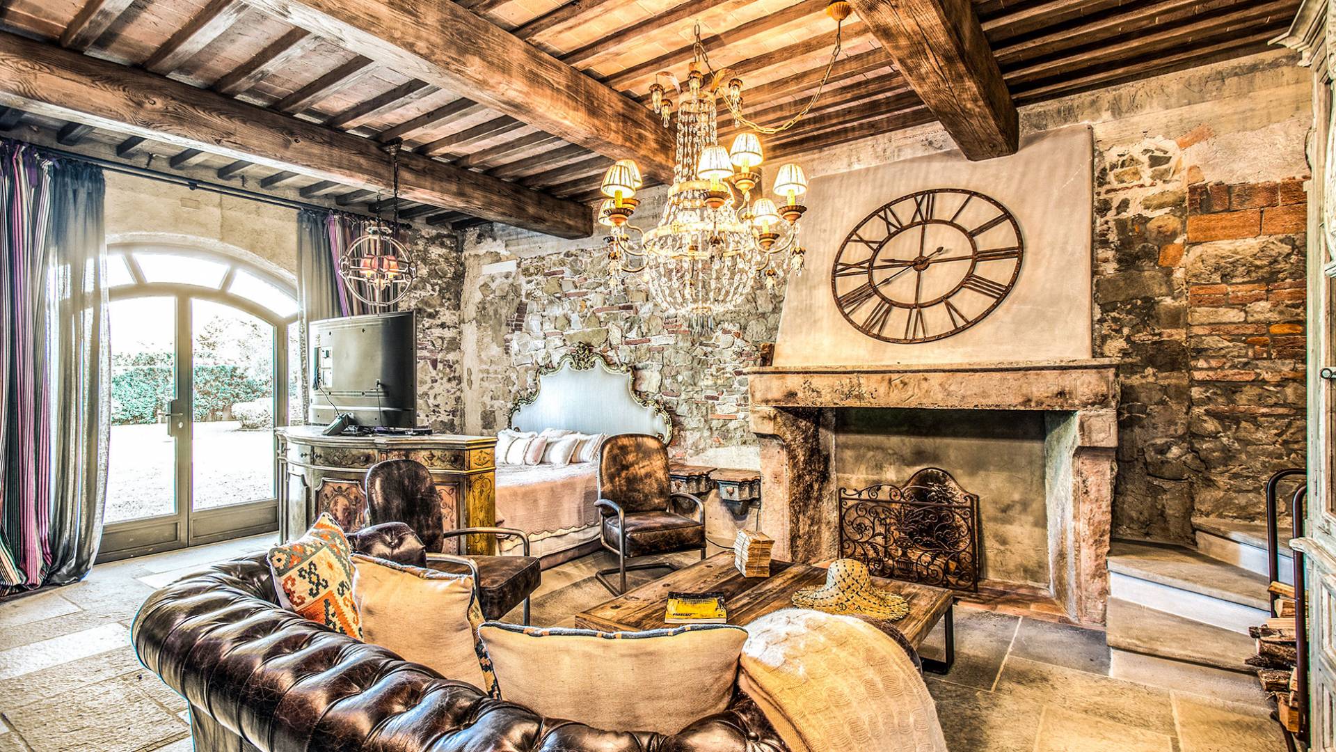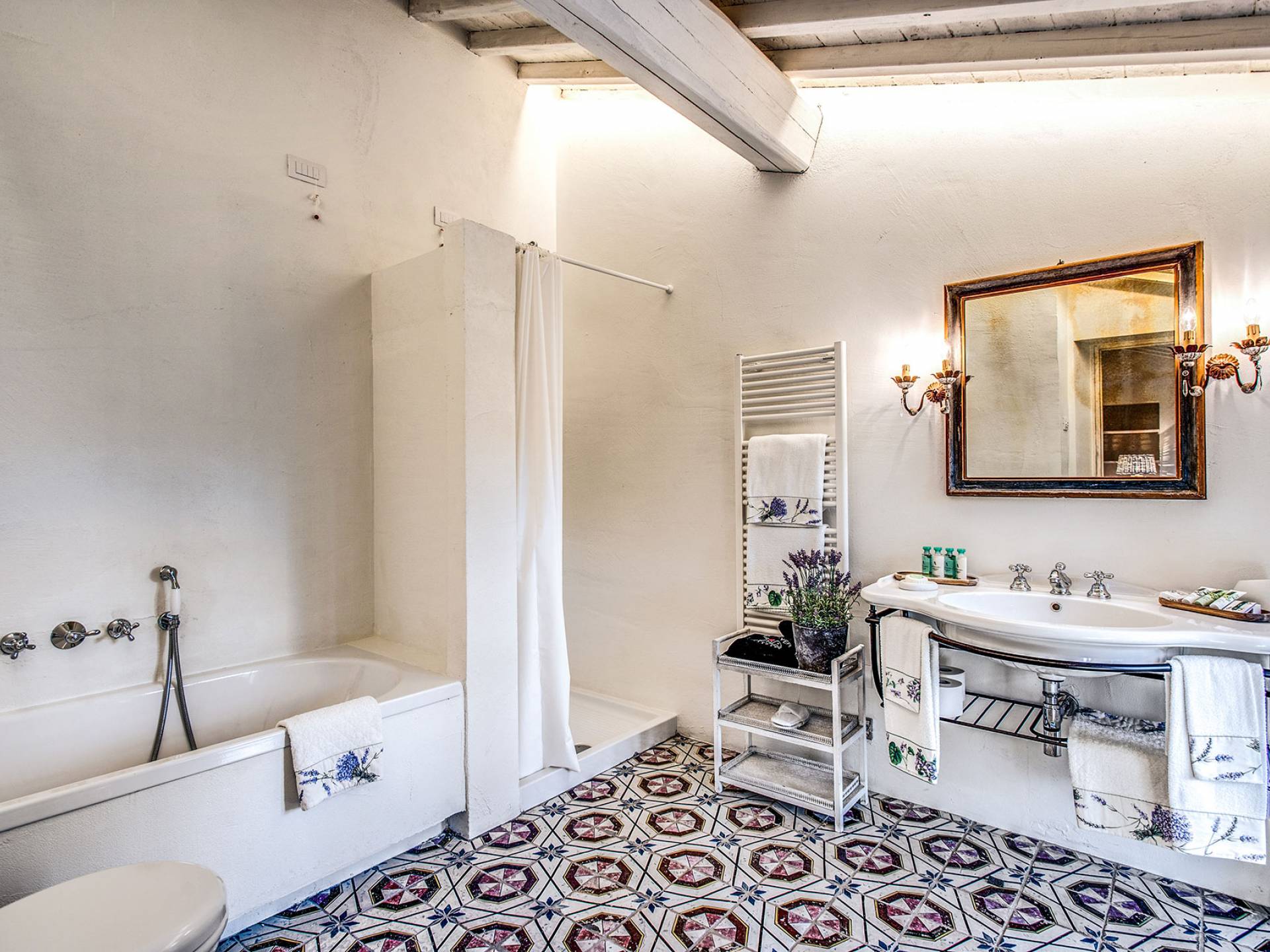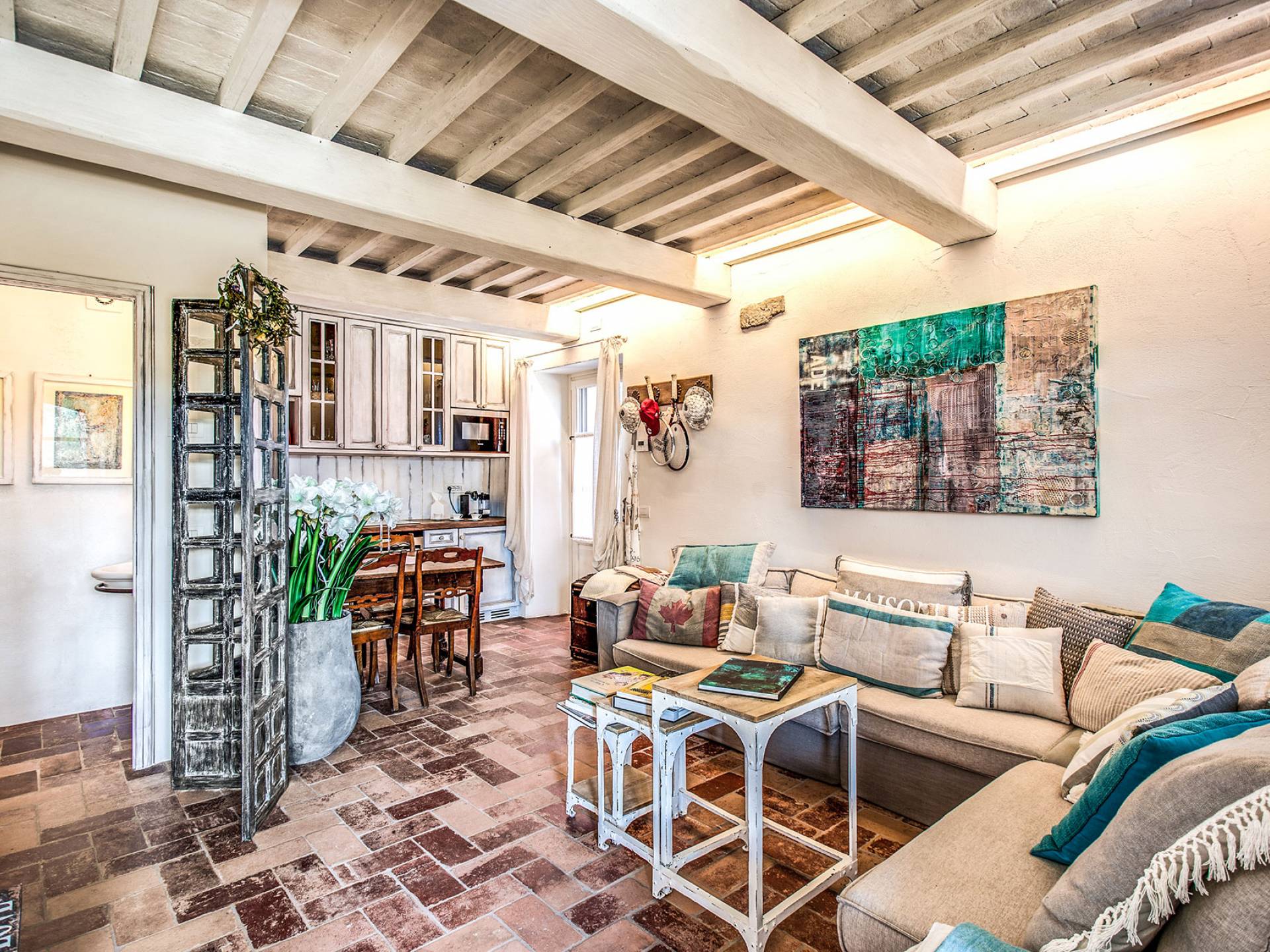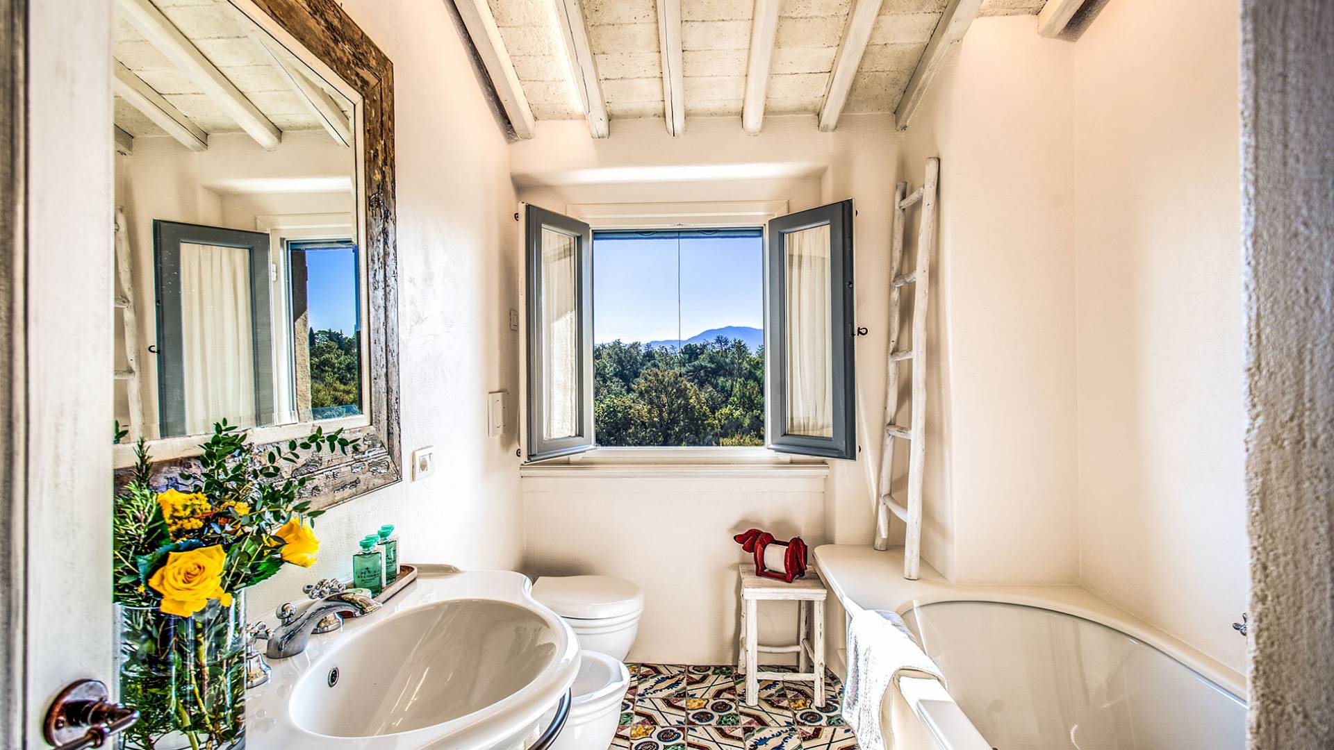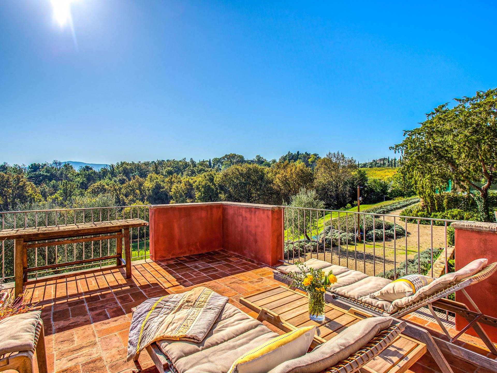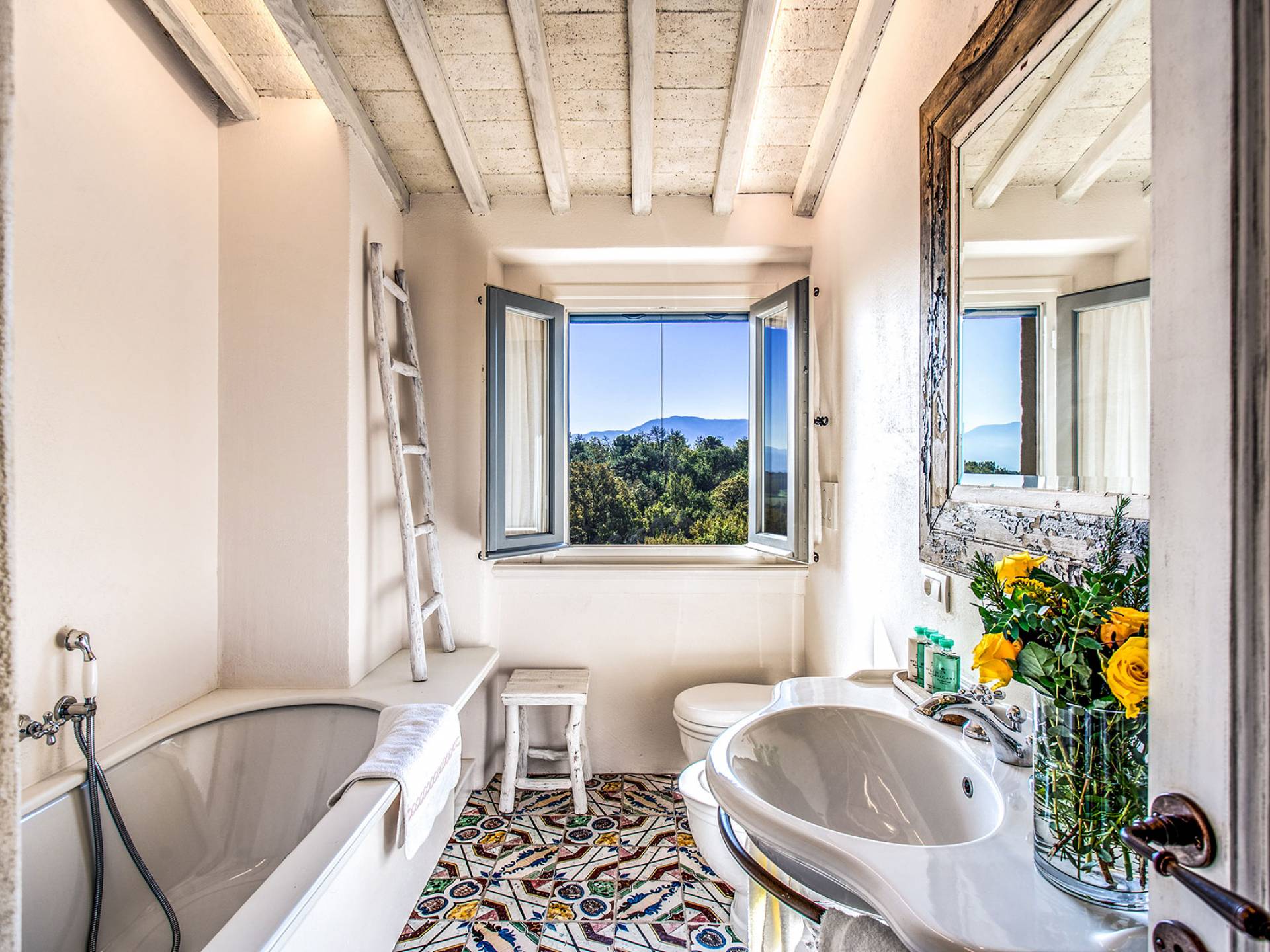 It is decorated in new-classic style with washed walls in pale shades, pietra serena and Italian wood. Countrymodern, the bohemian aesthetic of the property reflects its light and welcoming vibe: fresh and vintage, it oozes tranquillity and a home-like feeling which was exactly the intention of the owners, a couple of young artists and entrepreneurs dividing their time between Lucca, Forte dei Marmi, Ibiza and Geneva. The style encompasses traditional elements brought into the now with updated add-on’s for today’s lifestyles, offering a tennis court, a soccer field, a helipad, a pizza woodenoven and a security system with controlled circuit. Environmentally friendly and ecorestored, it also features a twenty metres heated swimming pool with view on the estate vineyards.