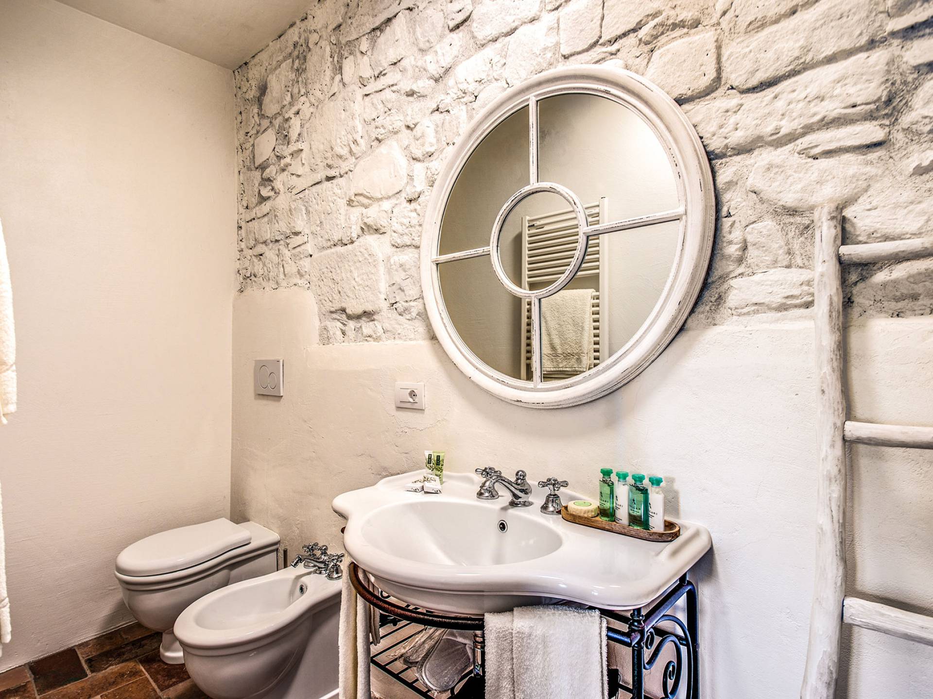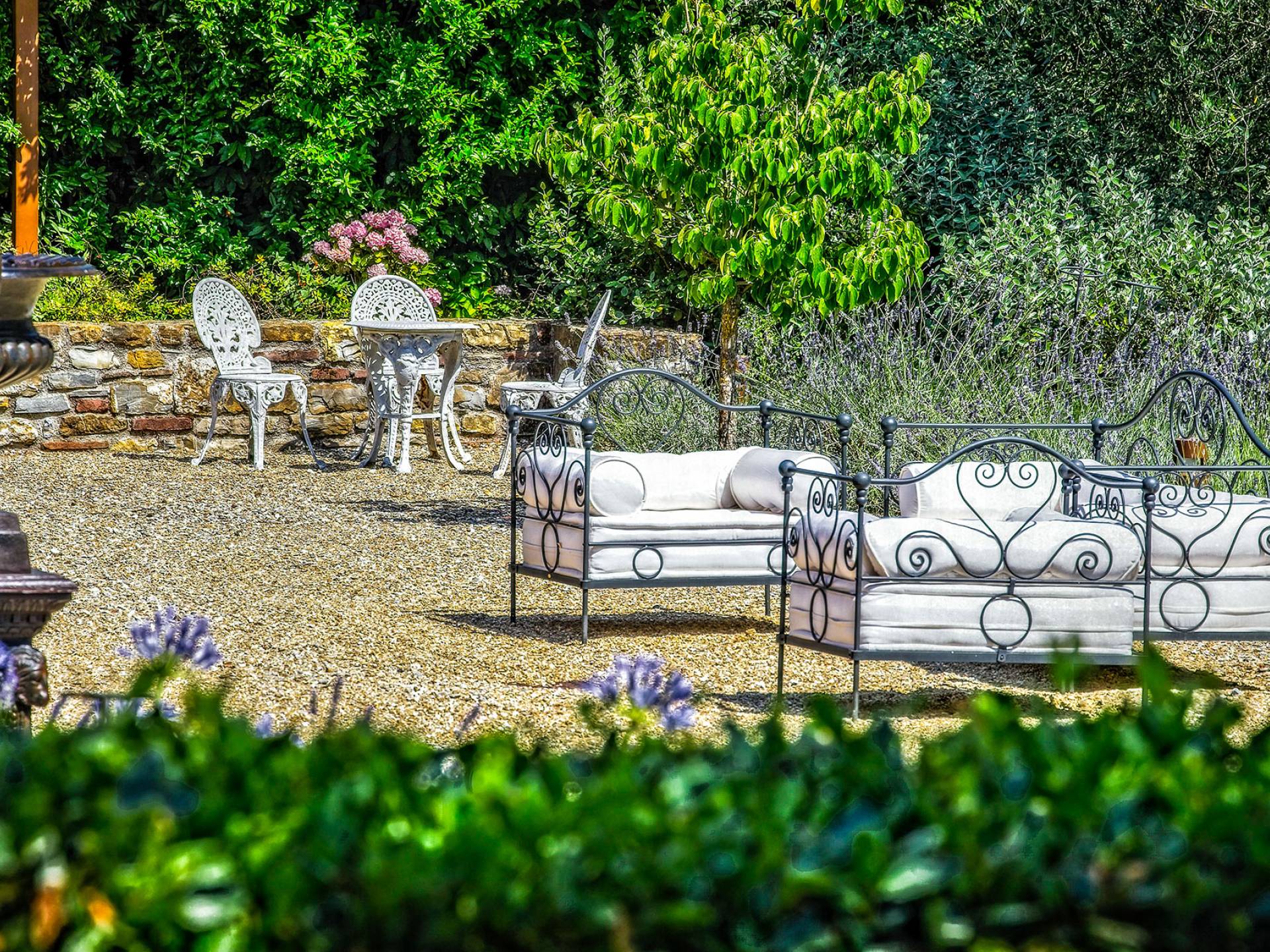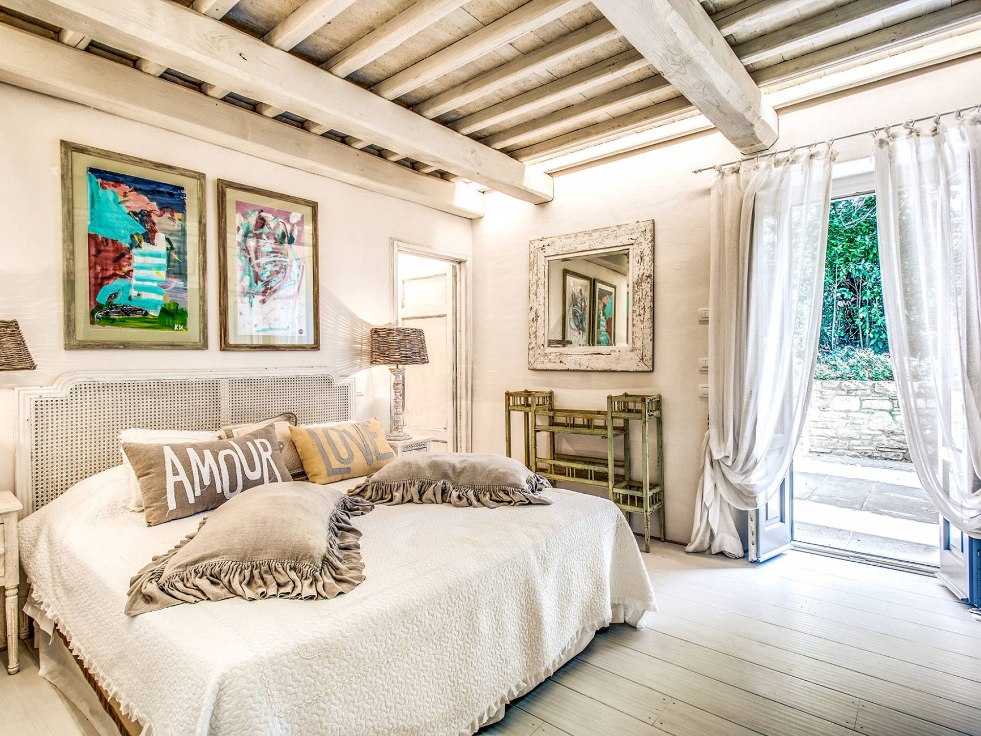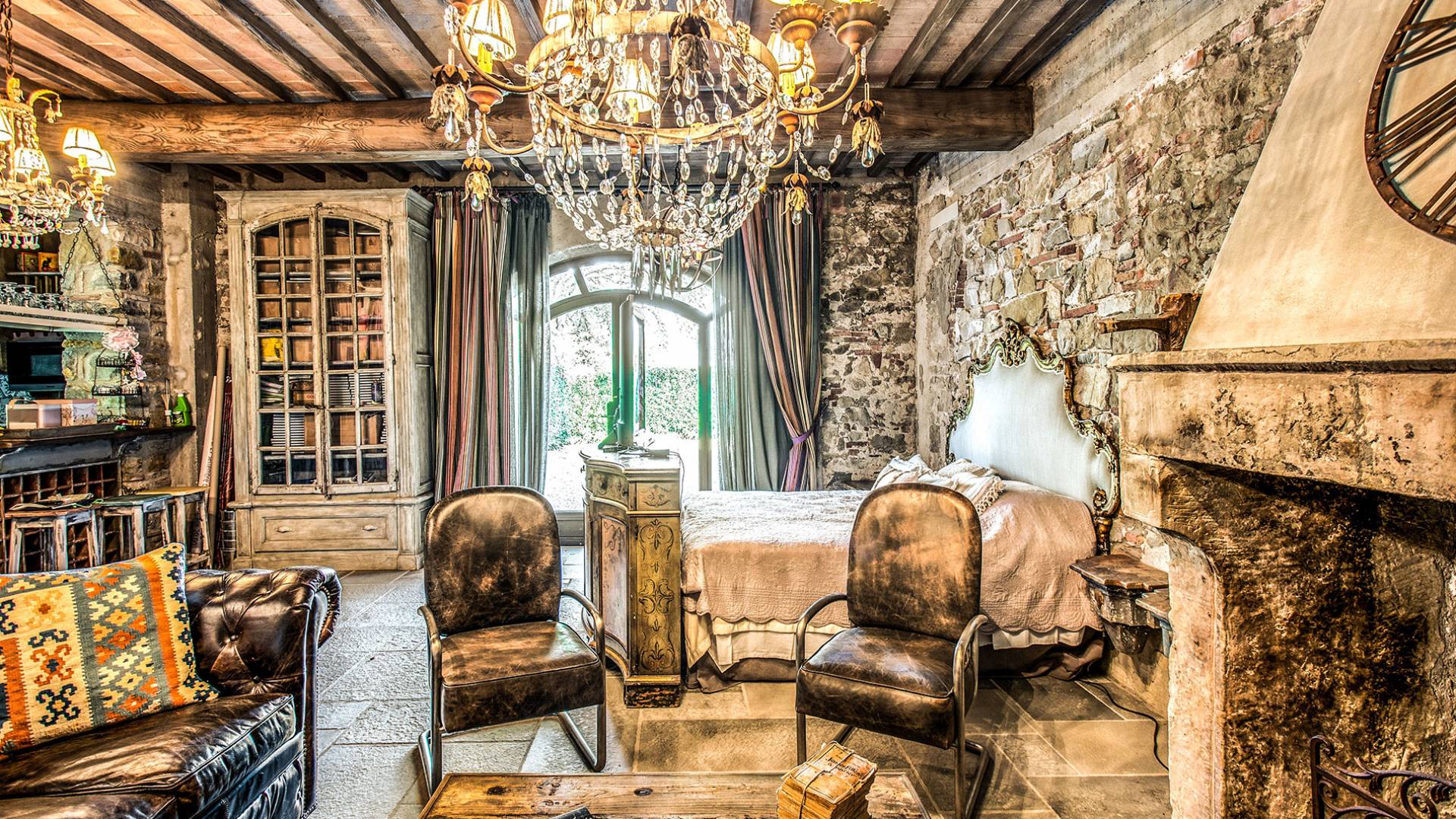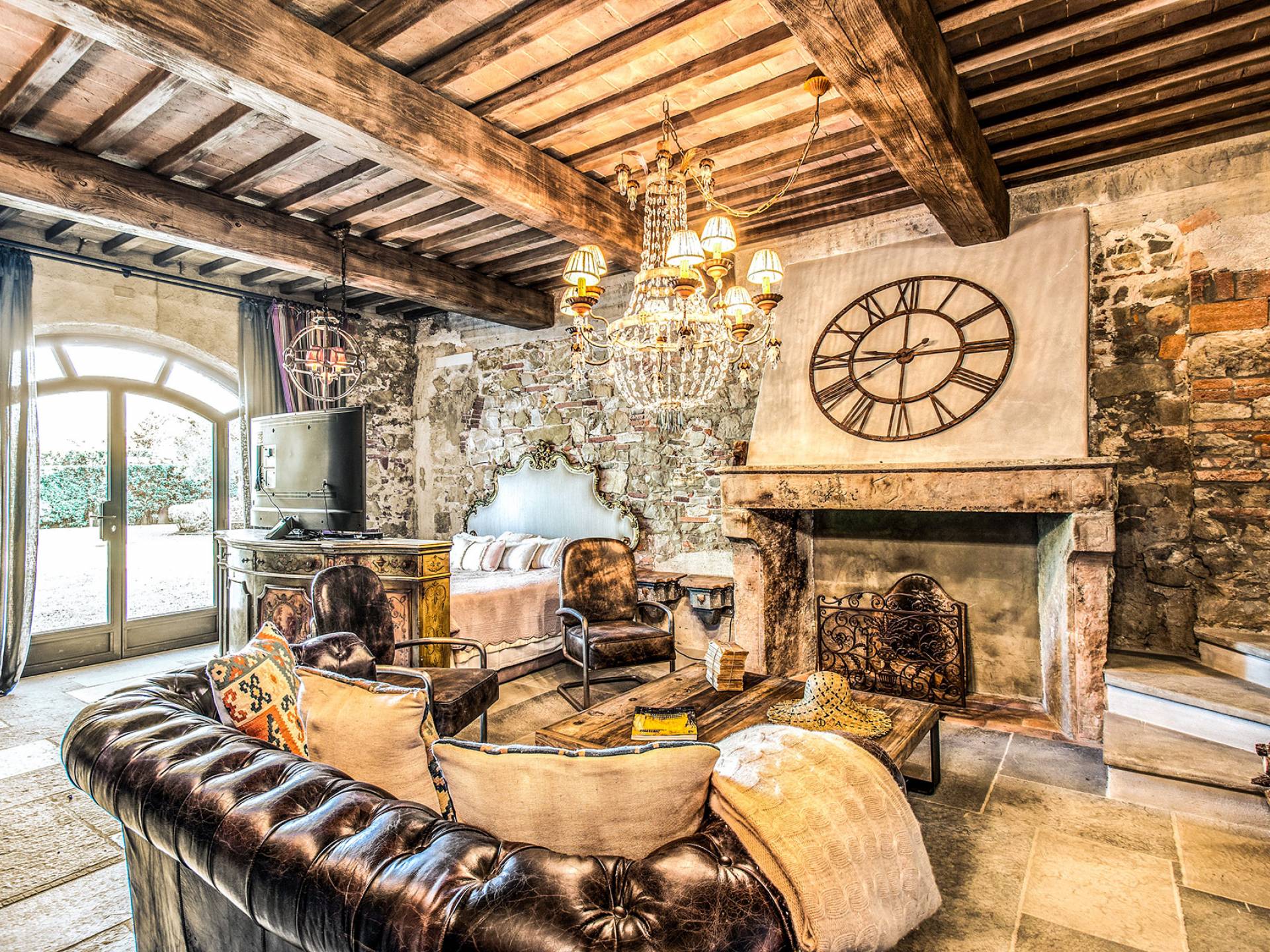Stone, wood and exposed bricks with 3 suites consisting of 5 bedrooms, each with private bathroom, featuring outdoor patios equipped with garden chairs and tables. Paved in antique terracotta.