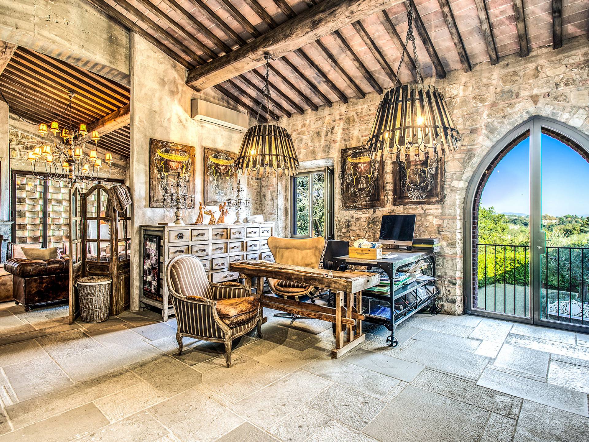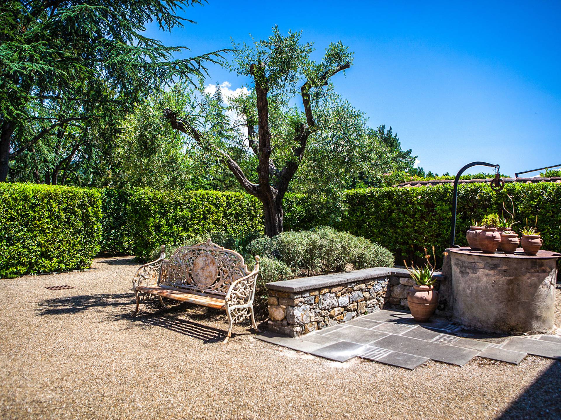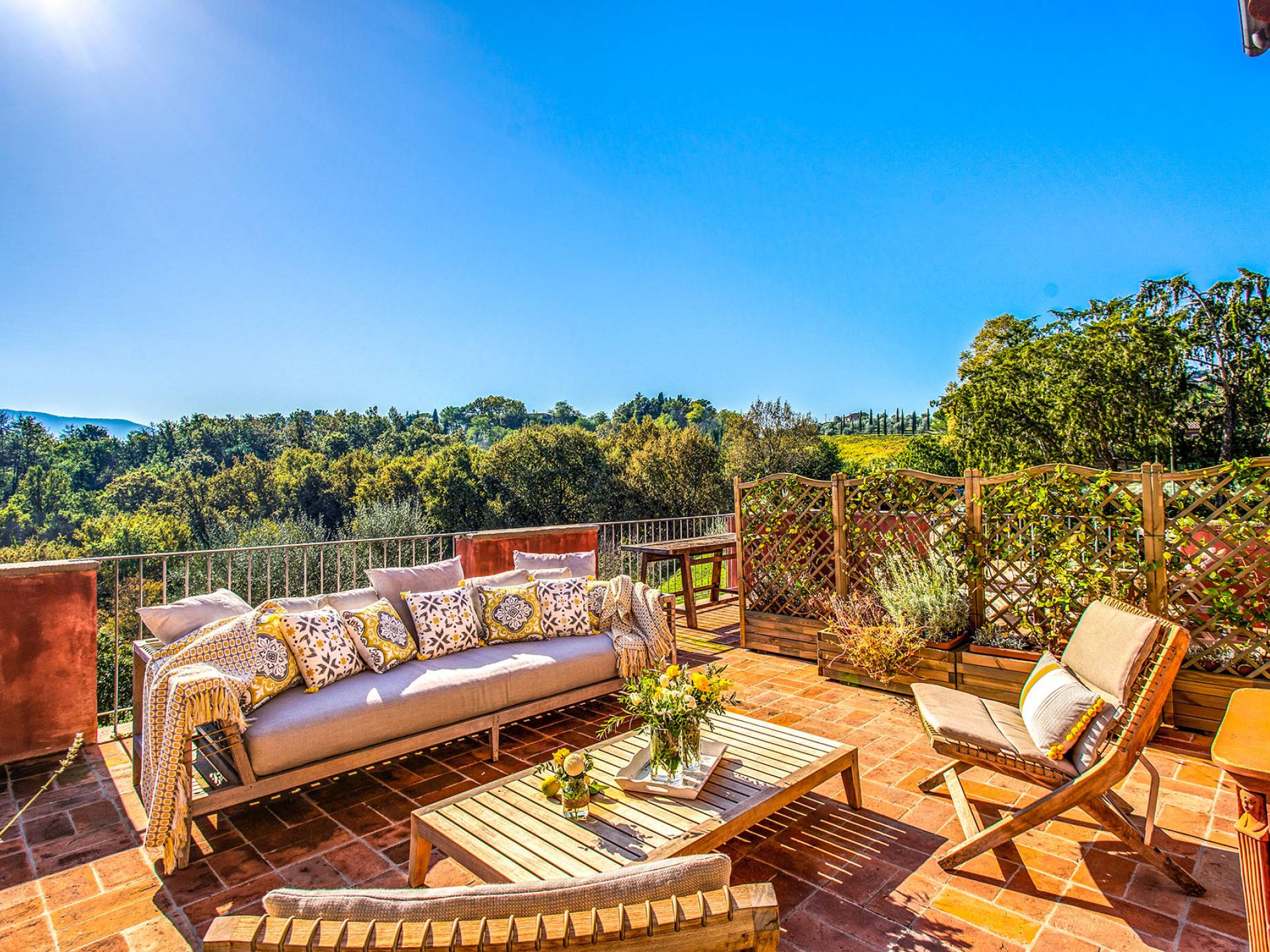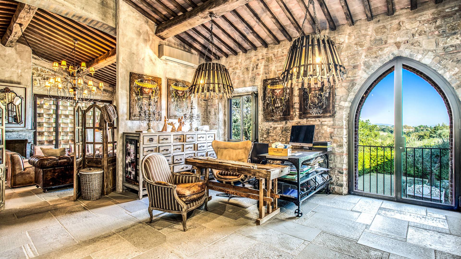 Stone, wood and exposed bricks with 3 suites consisting of 5 bedrooms, each with private bathroom, featuring outdoor patios equipped with garden chairs and tables. Paved in antique terracotta.