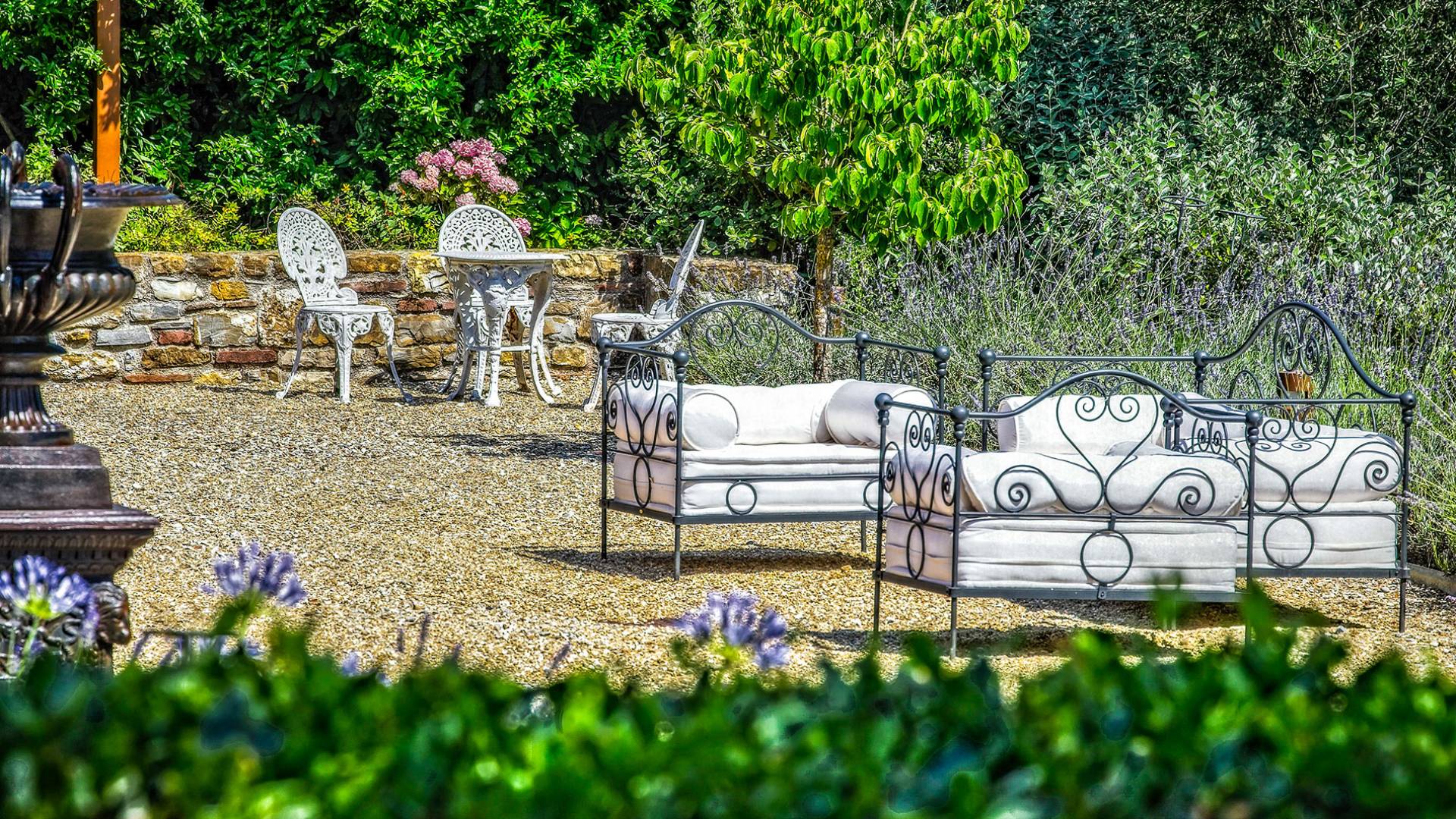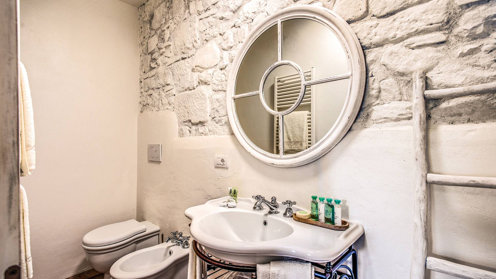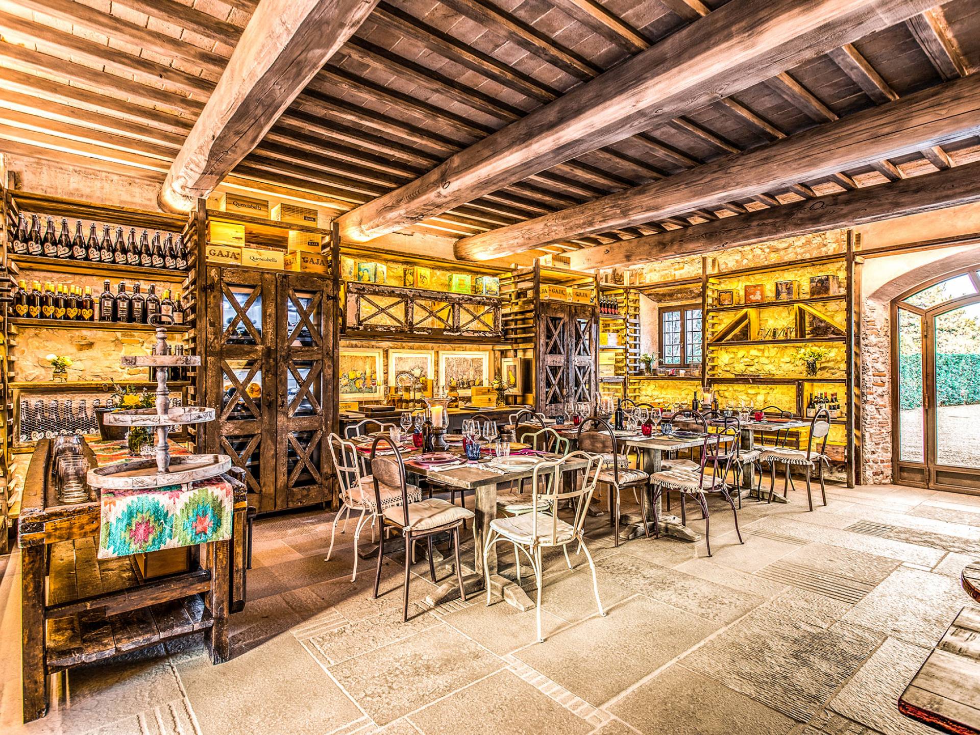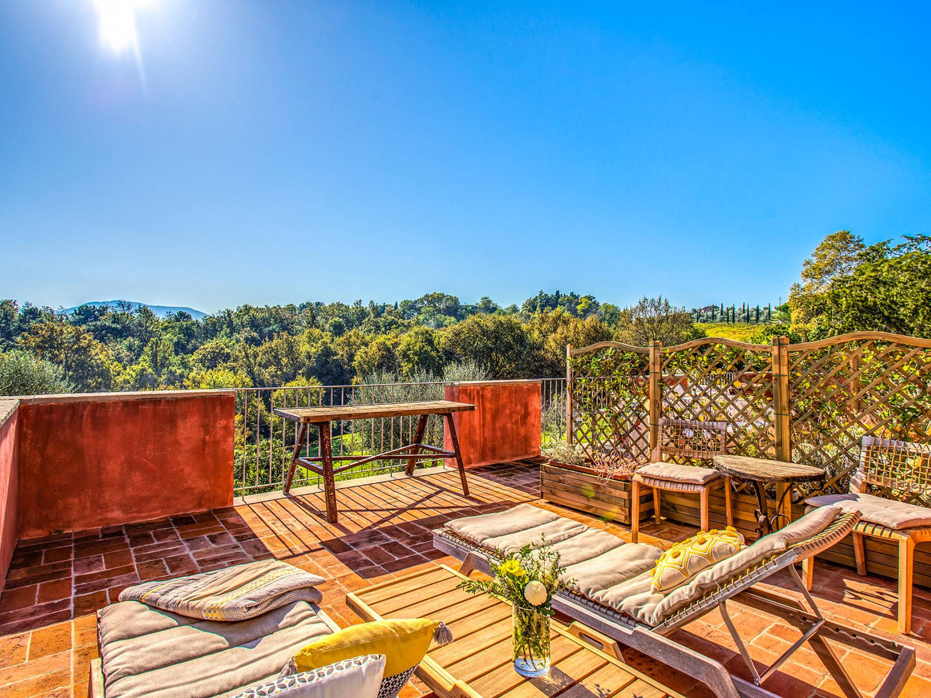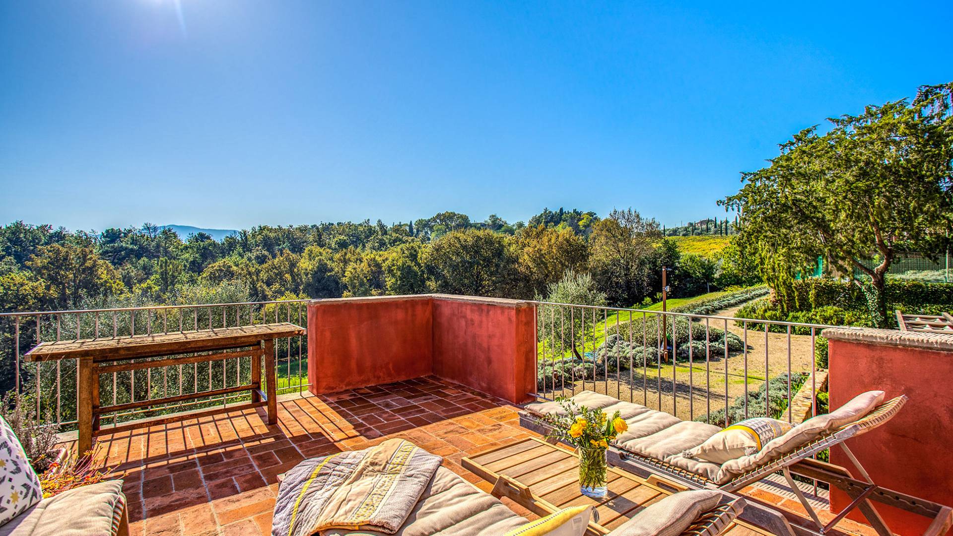 Stone, wood and exposed bricks with 3 suites consisting of 5 bedrooms, each with private bathroom, featuring outdoor patios equipped with garden chairs and tables. Paved in antique terracotta.