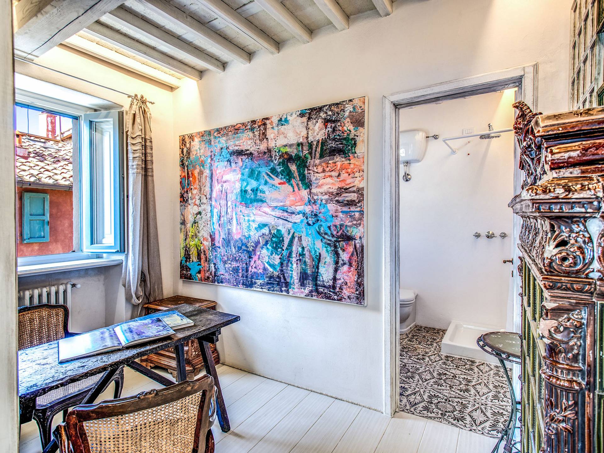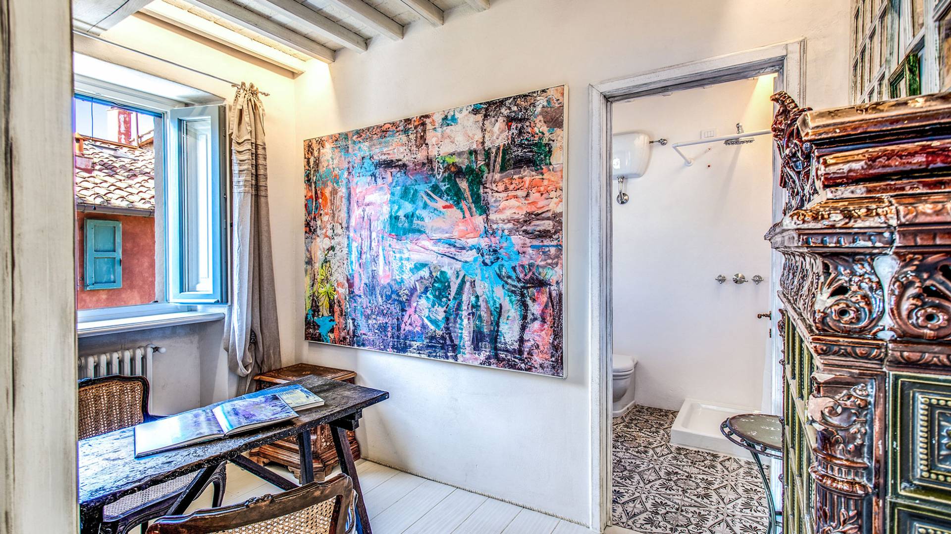 A master suite with living room, kitchenette, bathroom and paintings of the owner's private collection, featuring plenty of space and a unique romantic ambiance.