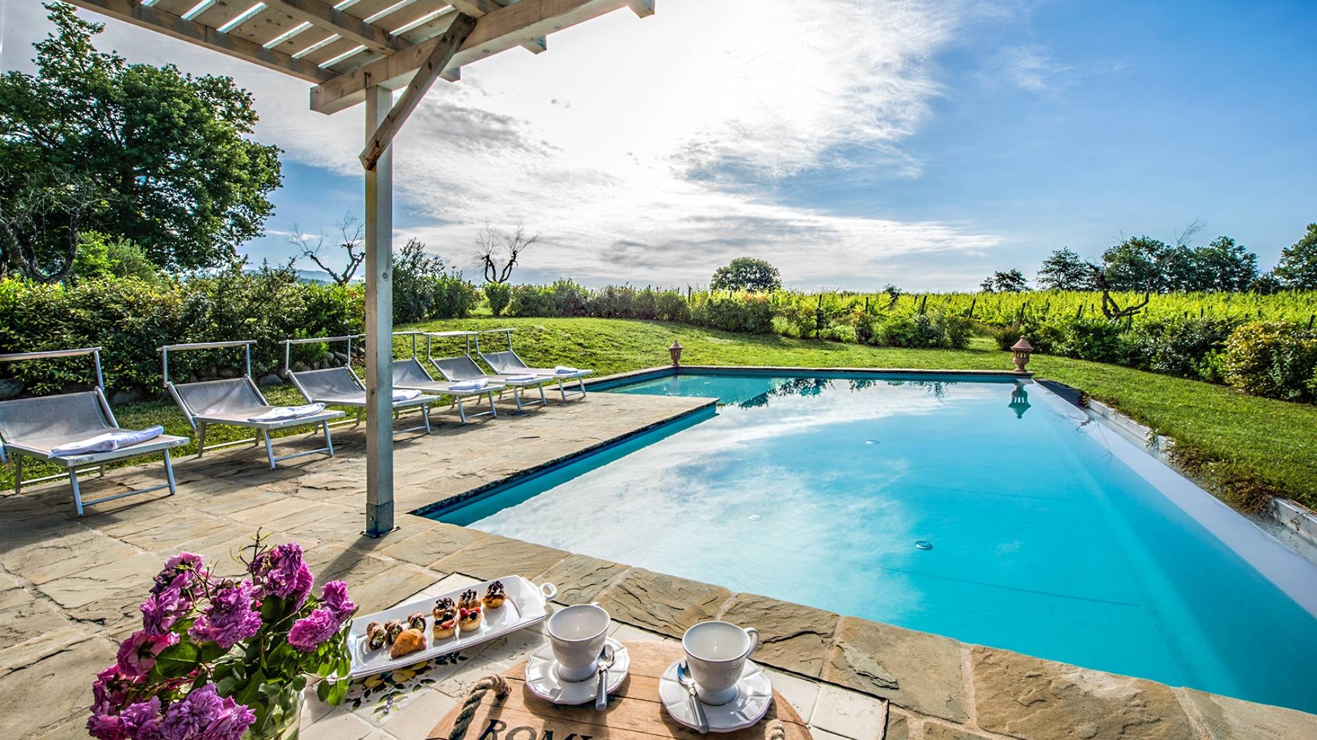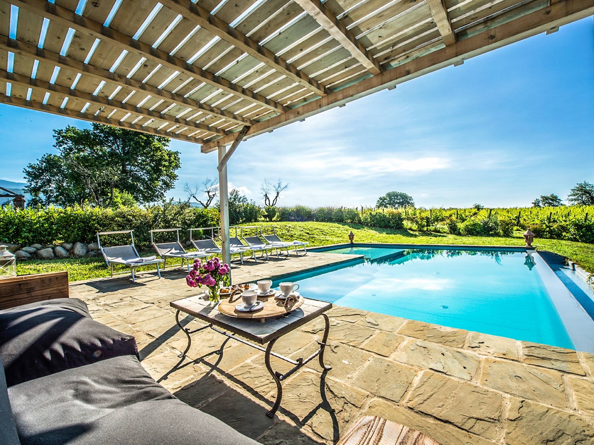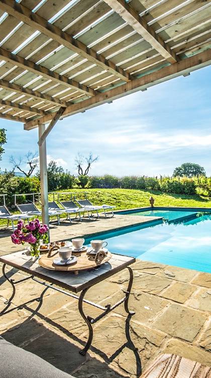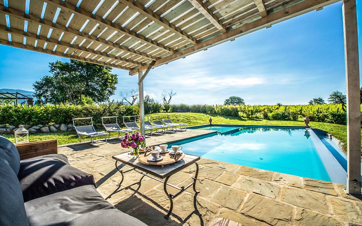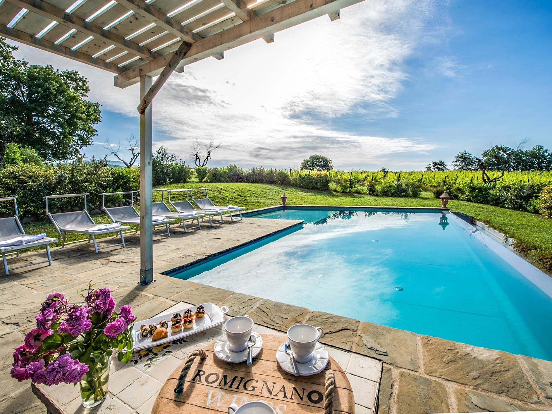 Inside a large property, surrounded by rows of vines and an immense expanse of greenery, Villa Chianti with a wonderful landscape and direct contact with nature, offers lots of relaxation in a warm and exclusive atmosphere. Here the welcome is celebrated by opening a good bottle of wine. A unique business card that will immediately make you toast your stay!