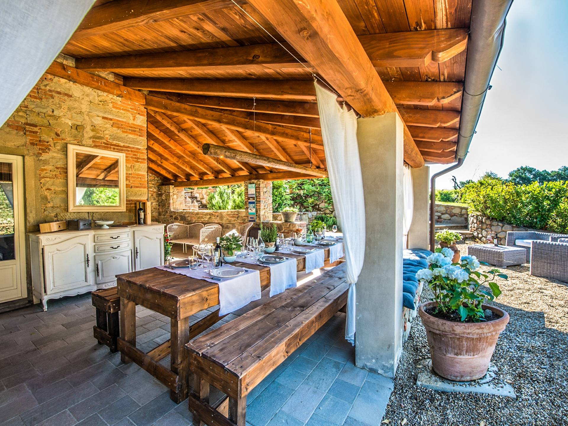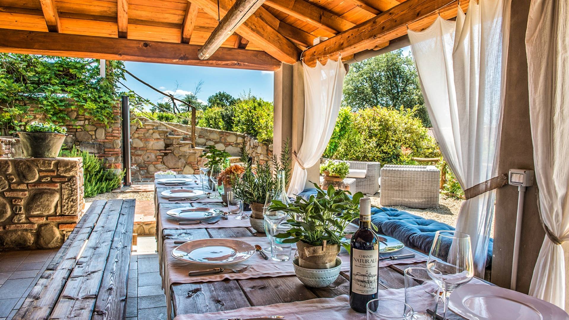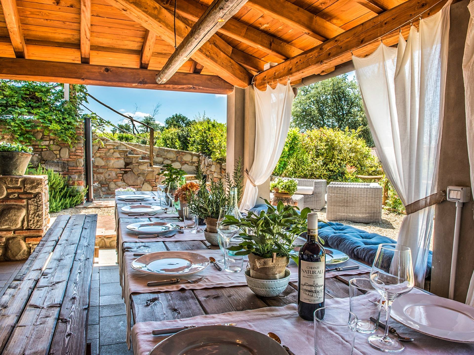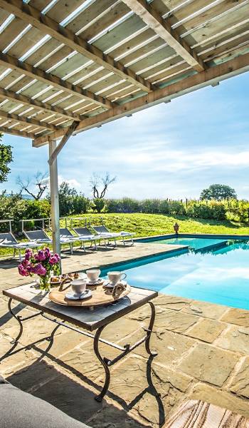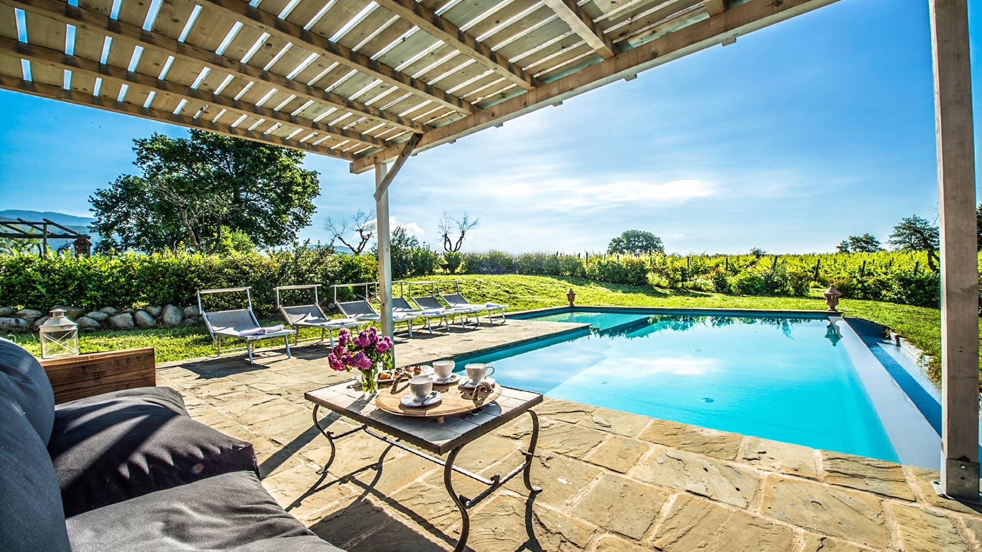 Inside a large property, surrounded by rows of vines and an immense expanse of greenery, Villa Chianti with a wonderful landscape and direct contact with nature, offers lots of relaxation in a warm and exclusive atmosphere. Here the welcome is celebrated by opening a good bottle of wine. A unique business card that will immediately make you toast your stay!