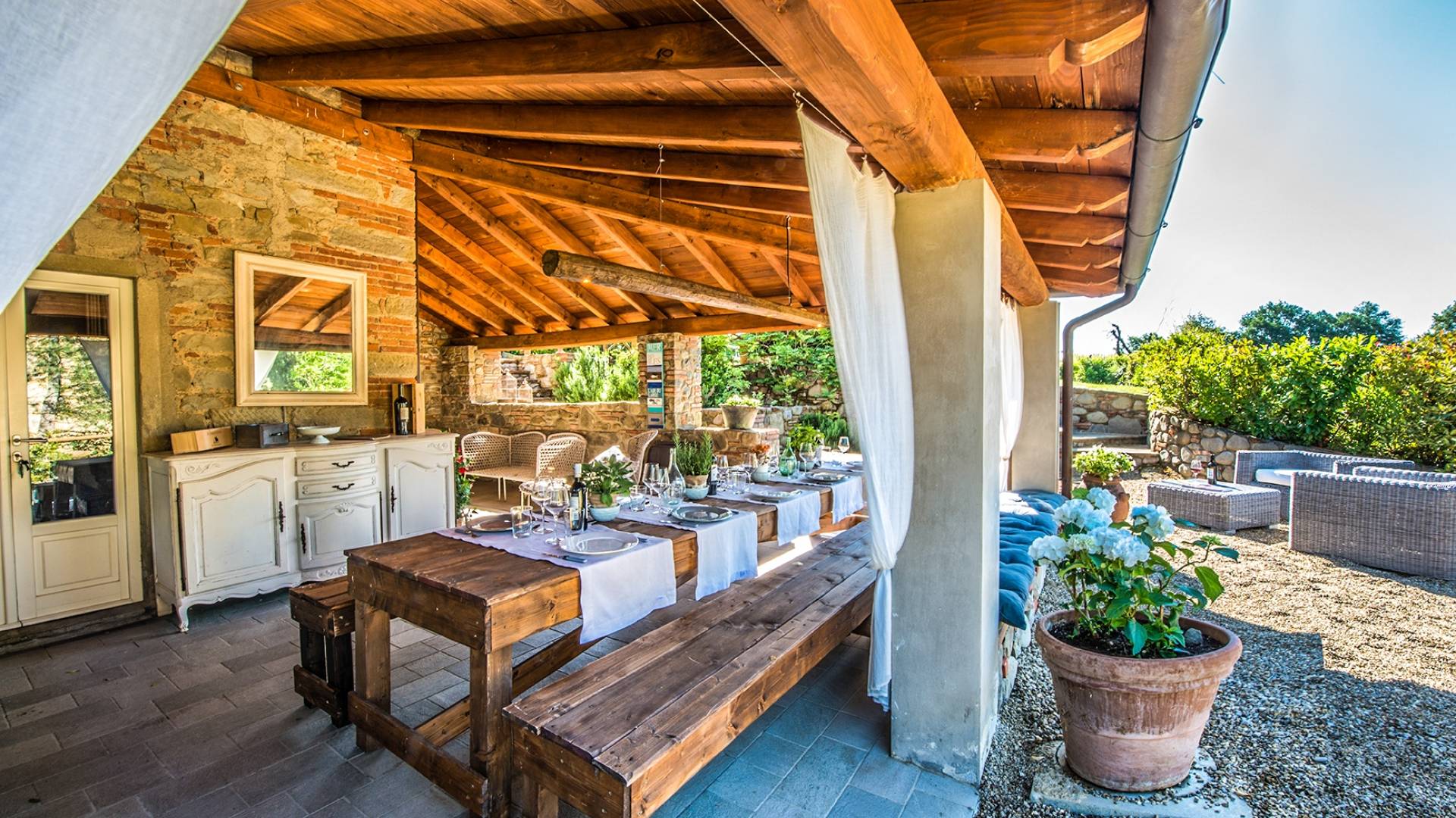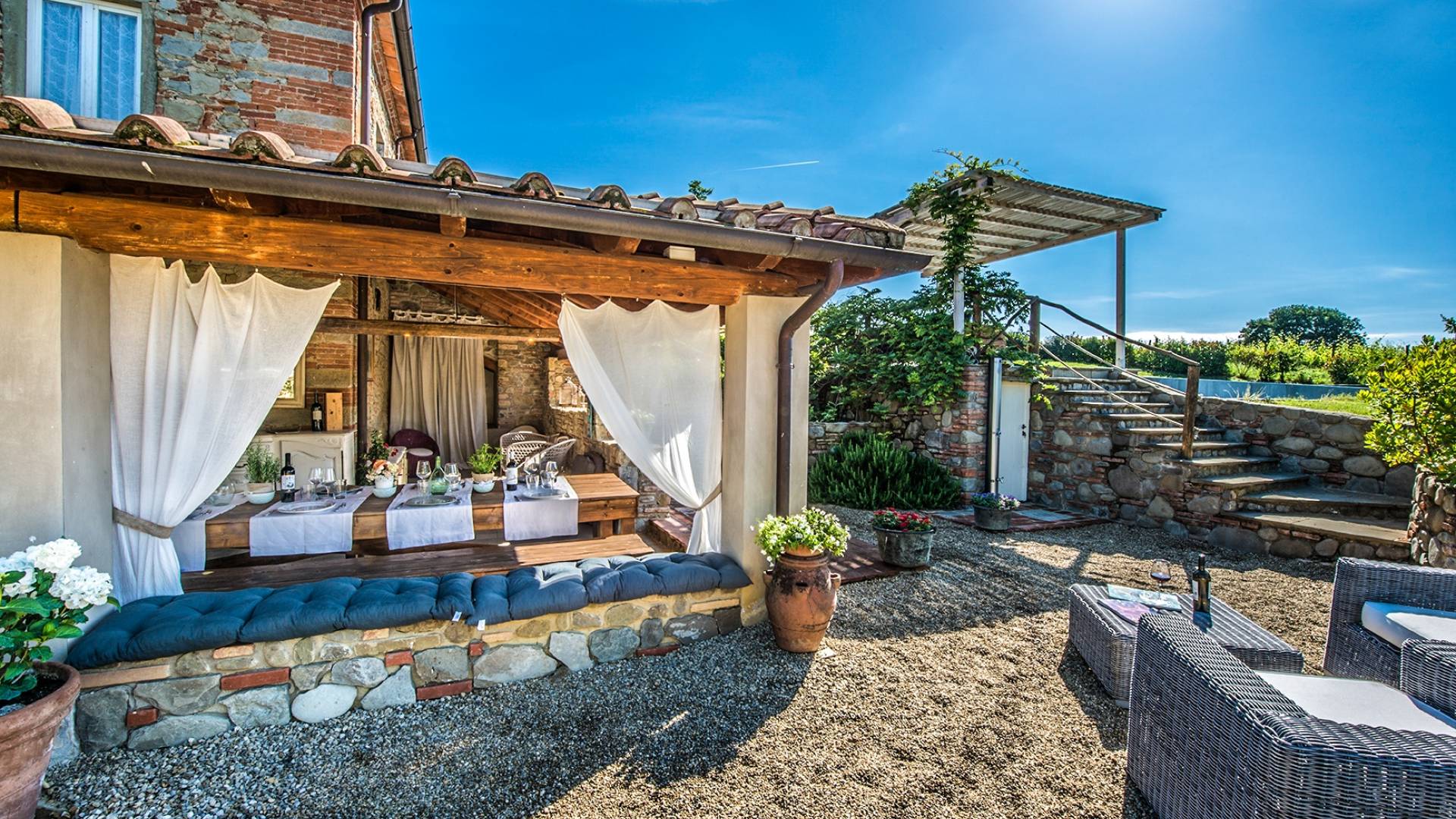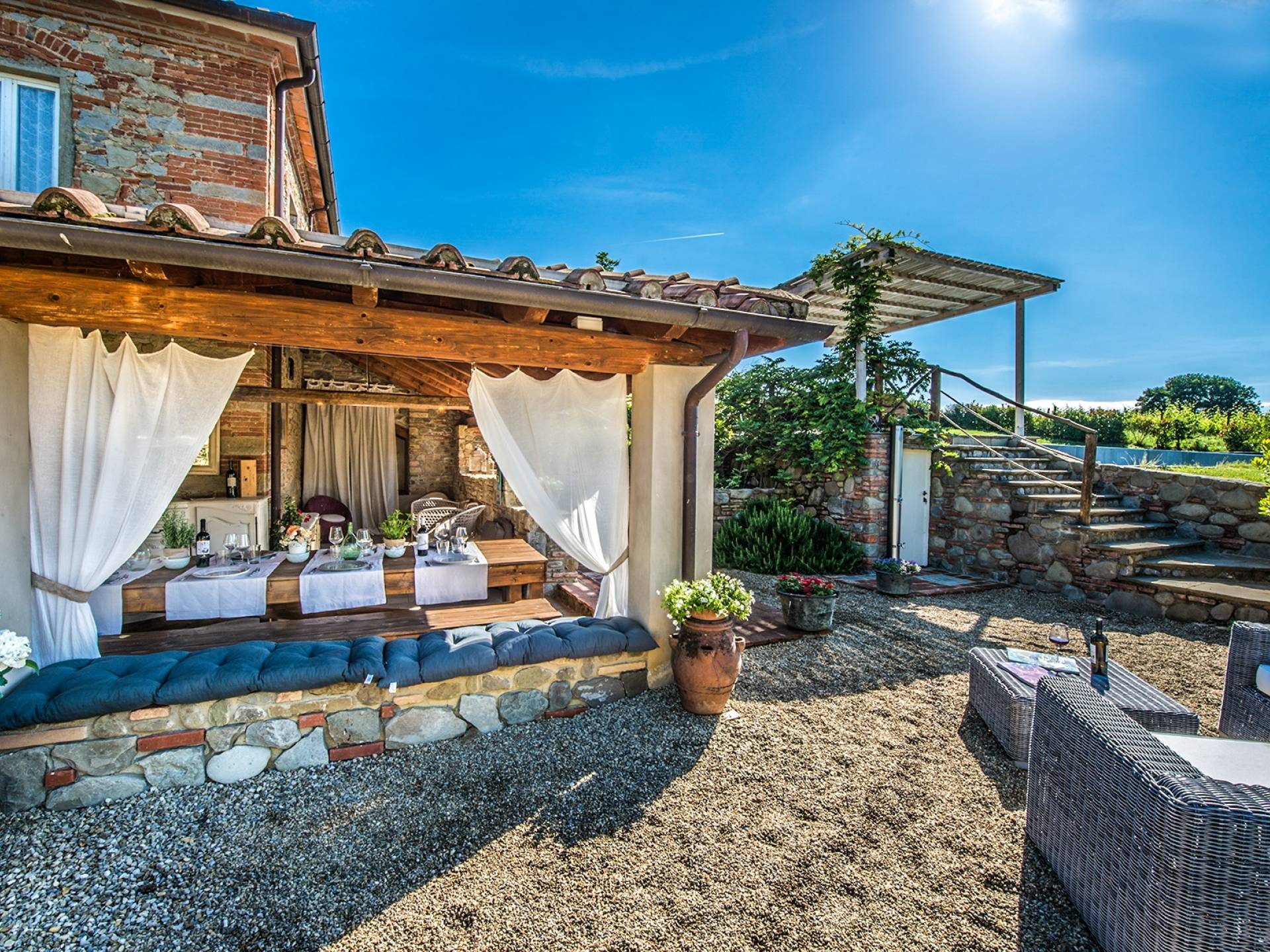 The house can accommodate up to 8 people in 4 bedrooms. The outside space is very large with a comfortable swimming pool bordered by greenery on two sides and a tiled with sun loungers and a pergola on the rest. Here you can also sit on comfortable sofas for an aperitif, a long drink or a chat with friends. Always outdoor you can easily have lunch or dinner as the structure offers different open-air or indoor solutions all capable of welcoming families, groups, and small groups.