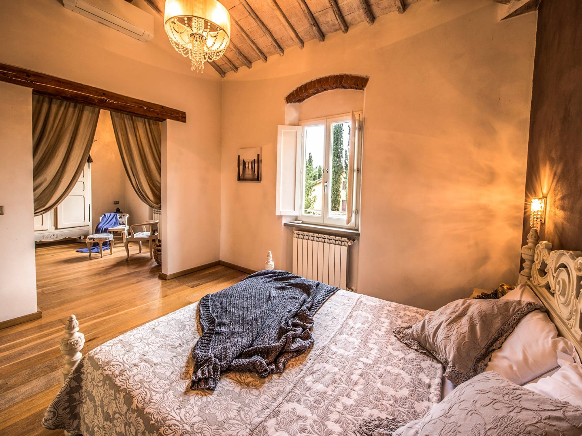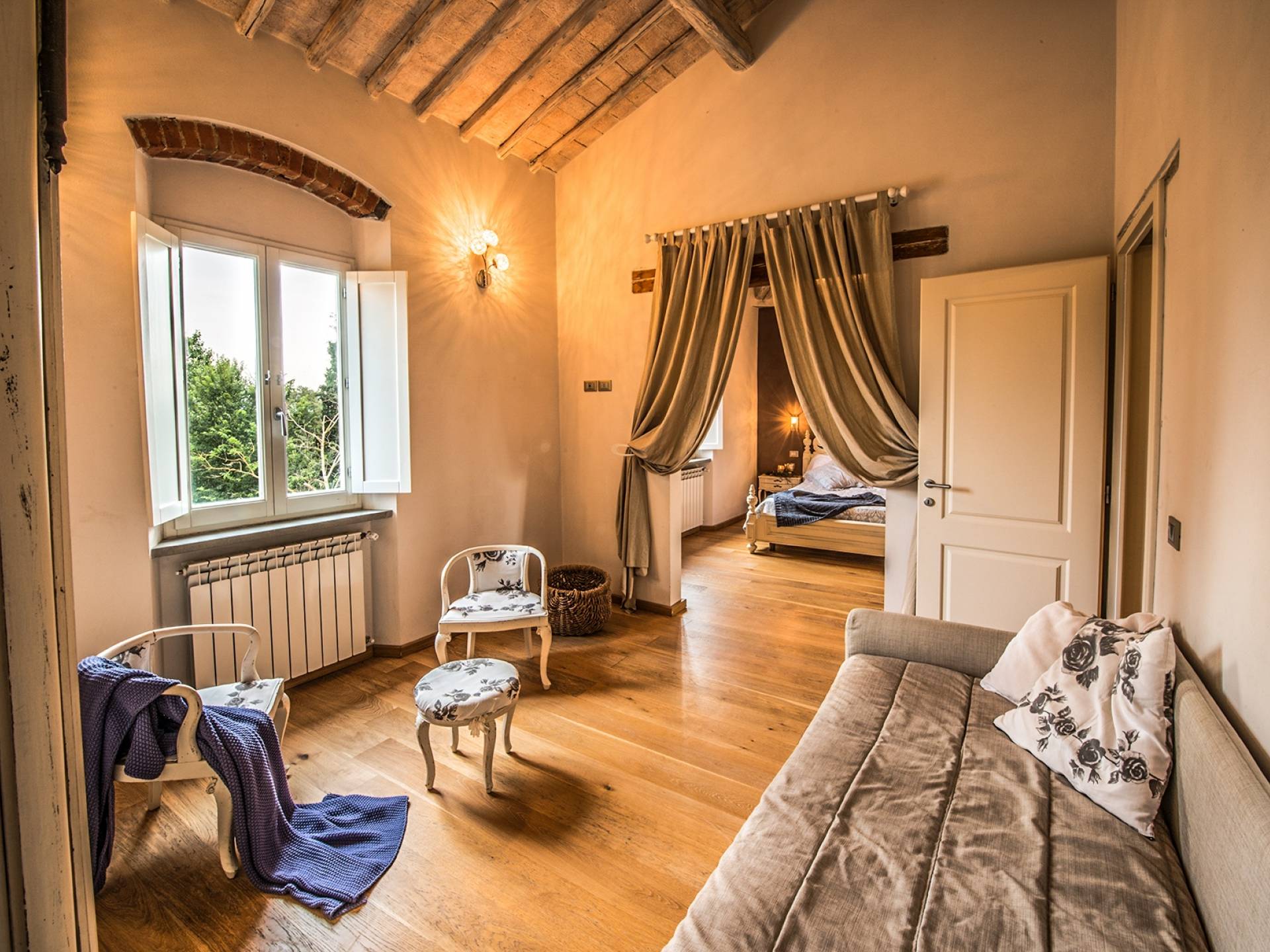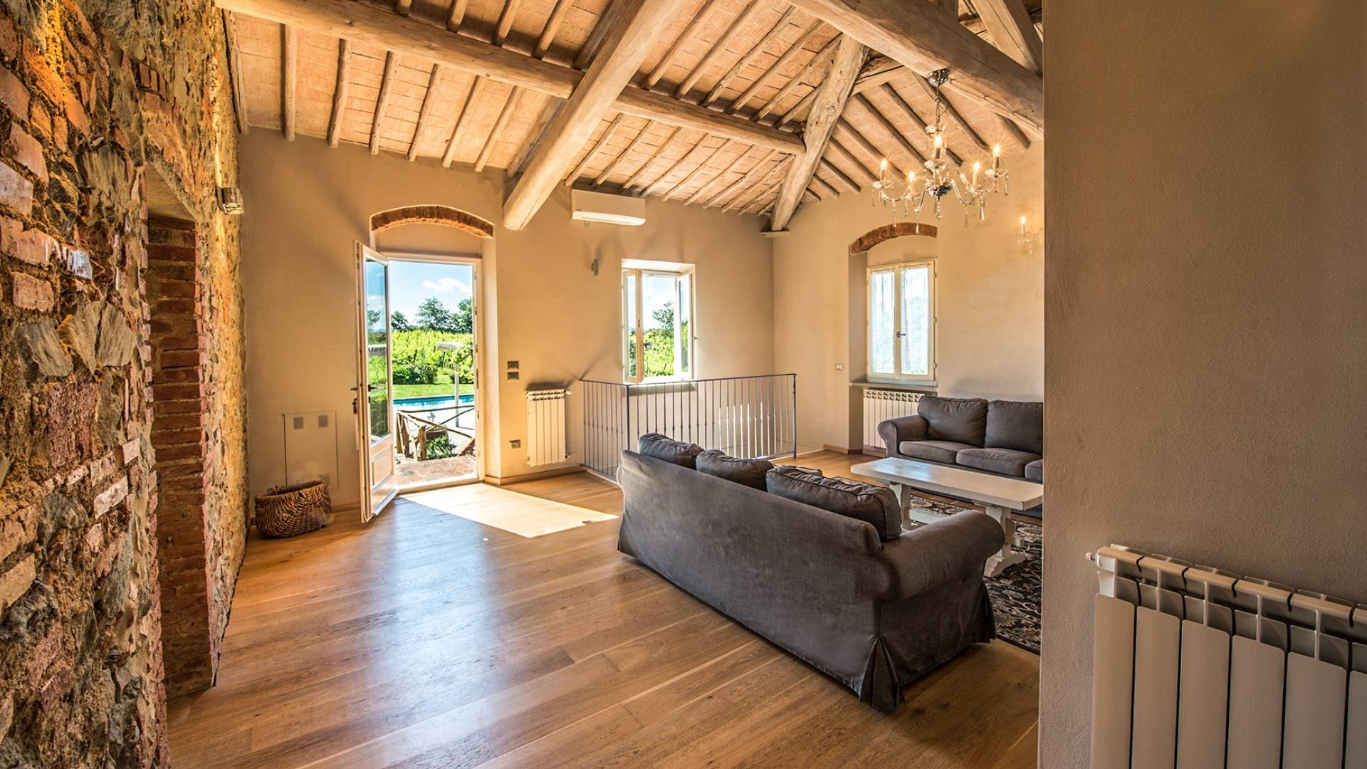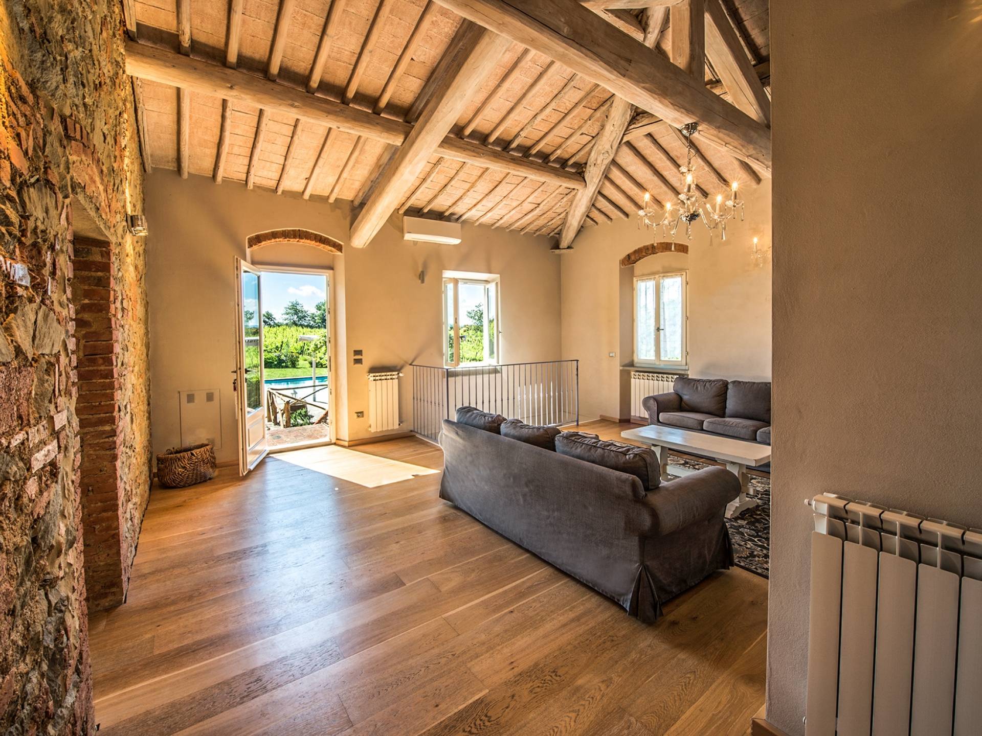 Inside you will be welcomed in a large hall with very high trussed ceilings, wooden beams, terracotta tiles. The warm colors of the walls and the large openings to the outside make the environment warm and bright at the same time. The bedrooms in the sleeping area are also very large, some with a mezzanine and all overlooking the countryside.