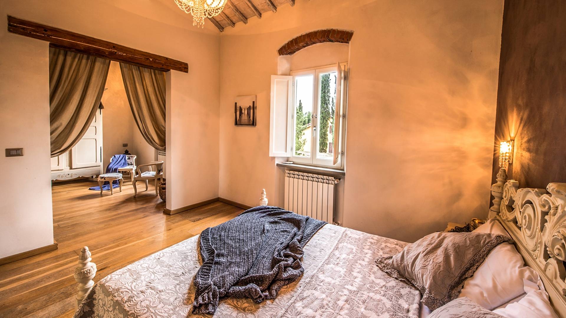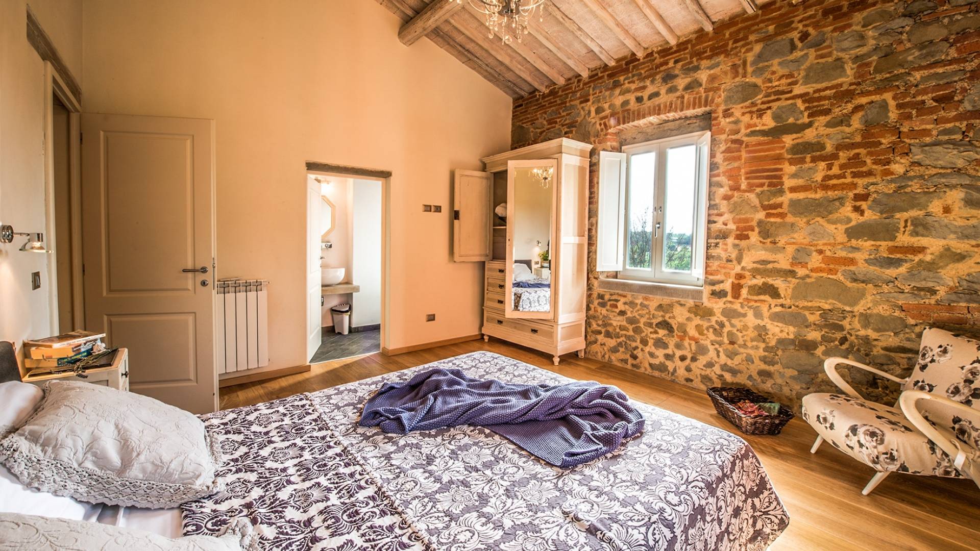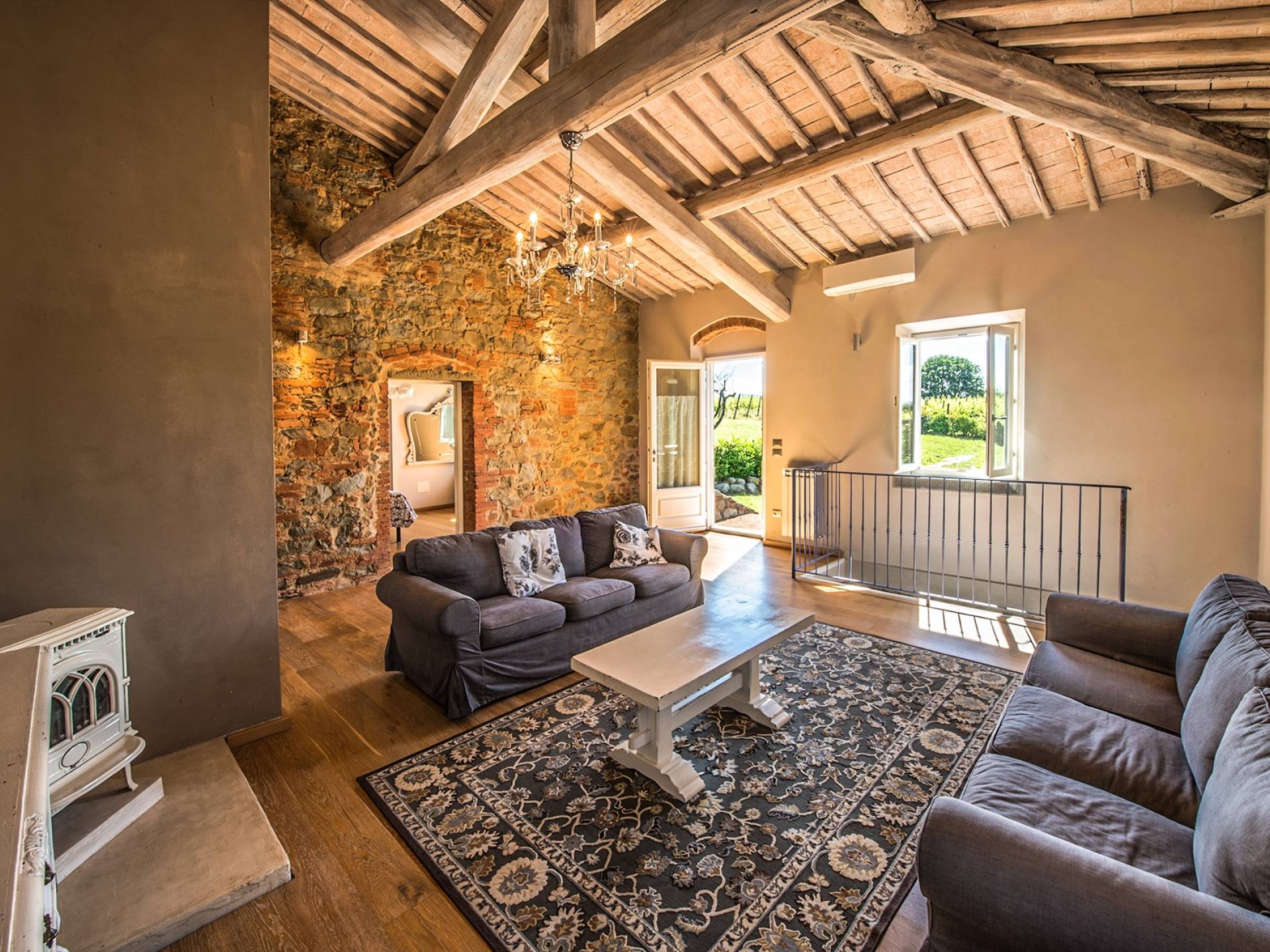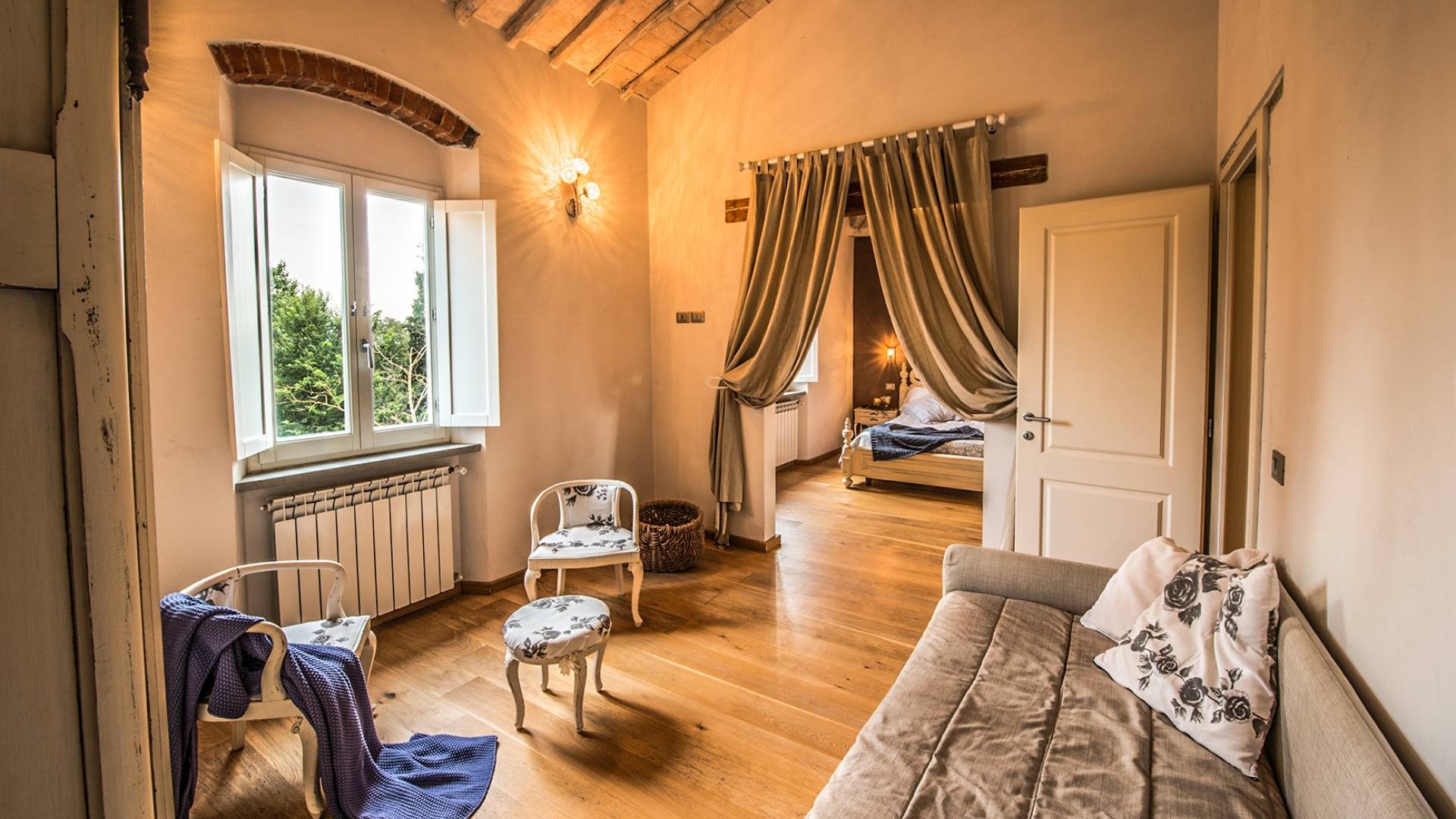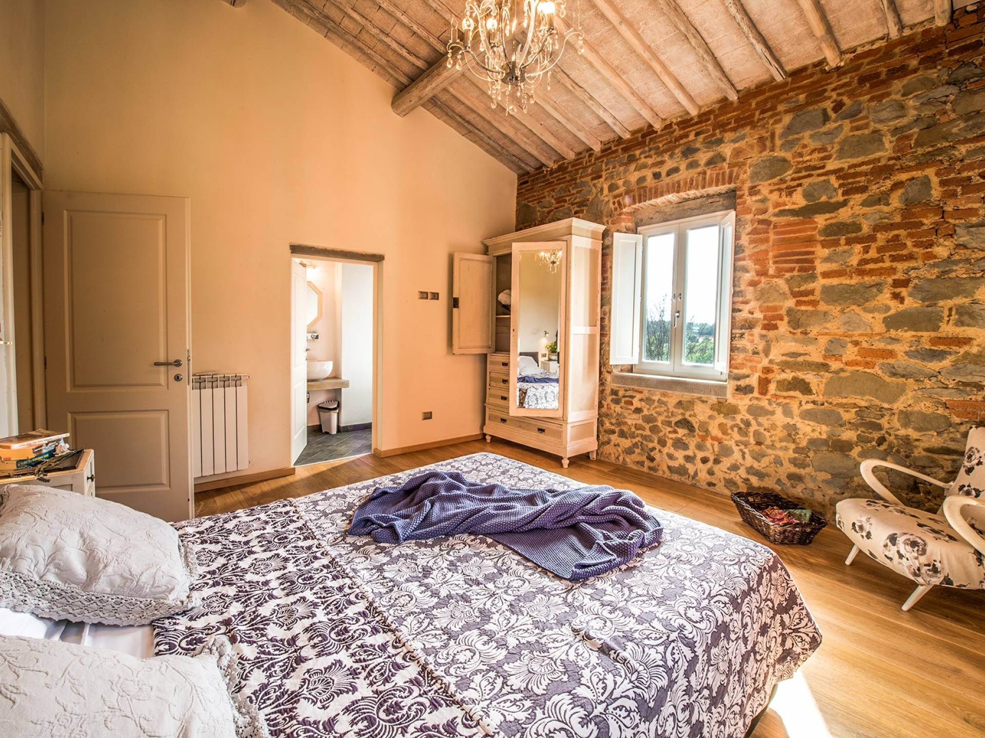 Inside you will be welcomed in a large hall with very high trussed ceilings, wooden beams, terracotta tiles. The warm colors of the walls and the large openings to the outside make the environment warm and bright at the same time. The bedrooms in the sleeping area are also very large, some with a mezzanine and all overlooking the countryside.