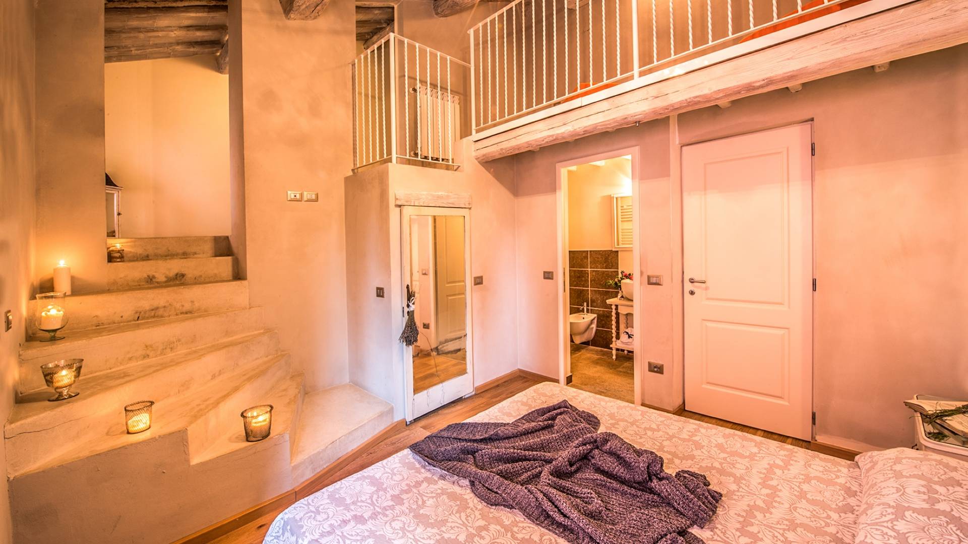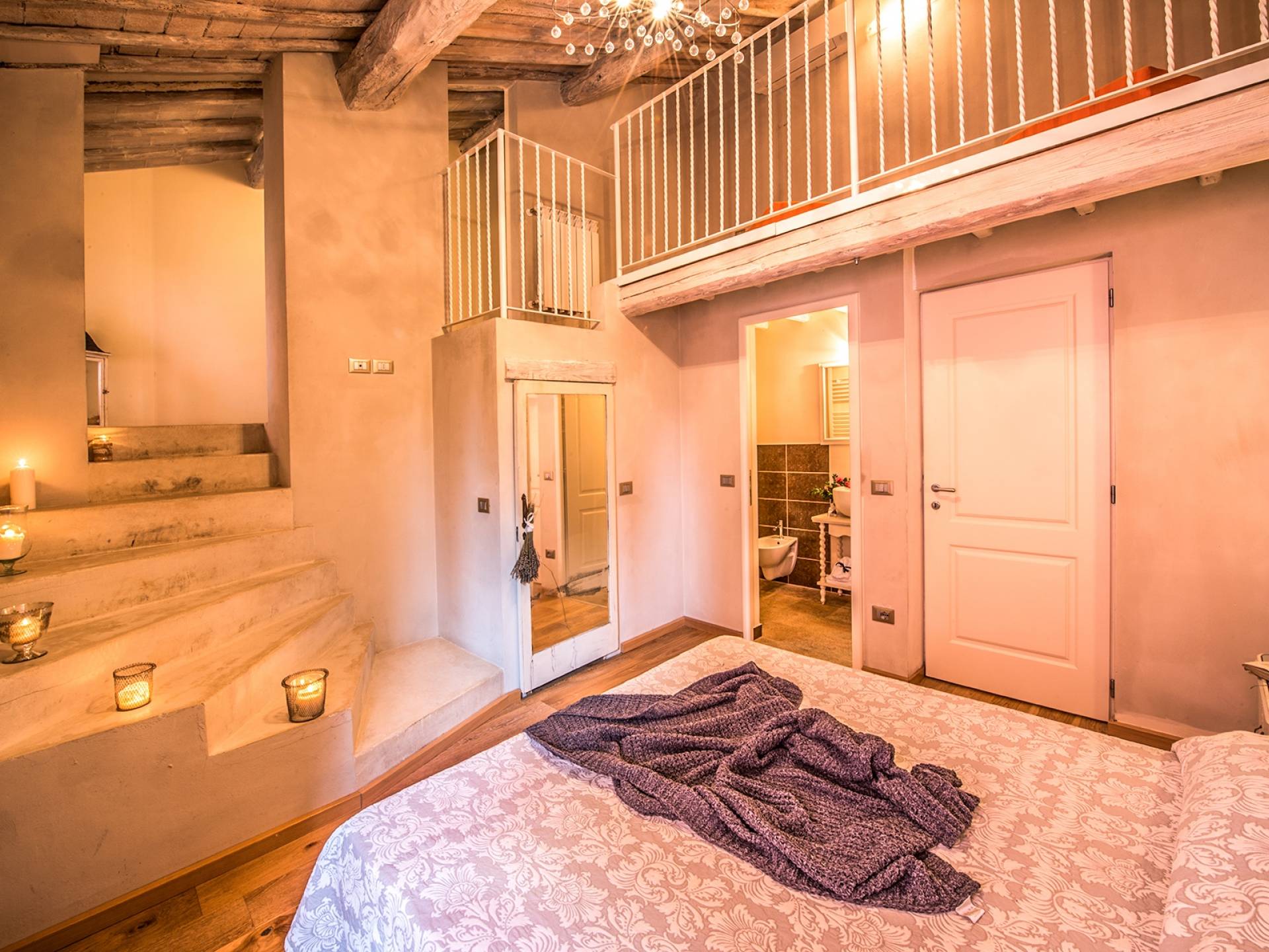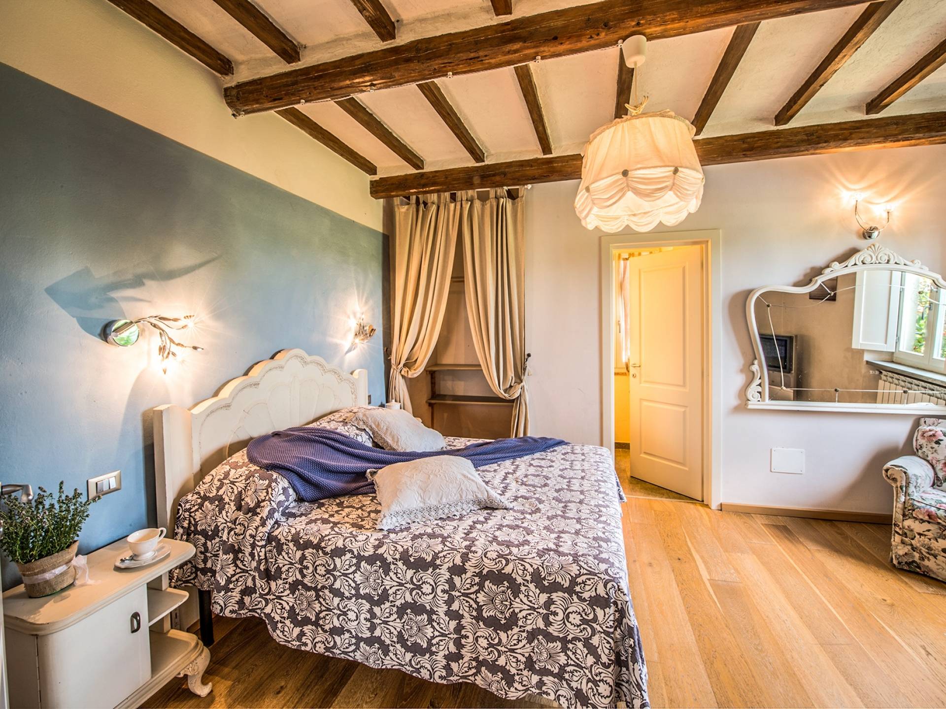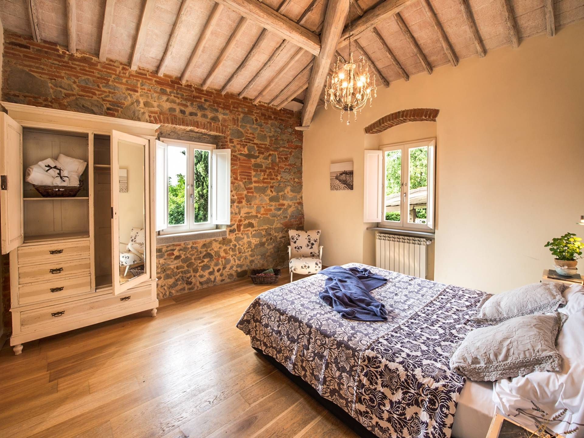 Inside you will be welcomed in a large hall with very high trussed ceilings, wooden beams, terracotta tiles. The warm colors of the walls and the large openings to the outside make the environment warm and bright at the same time. The bedrooms in the sleeping area are also very large, some with a mezzanine and all overlooking the countryside.
