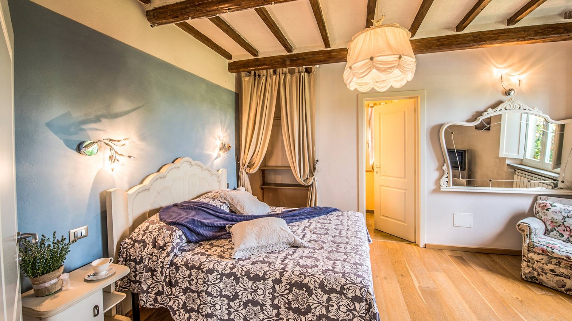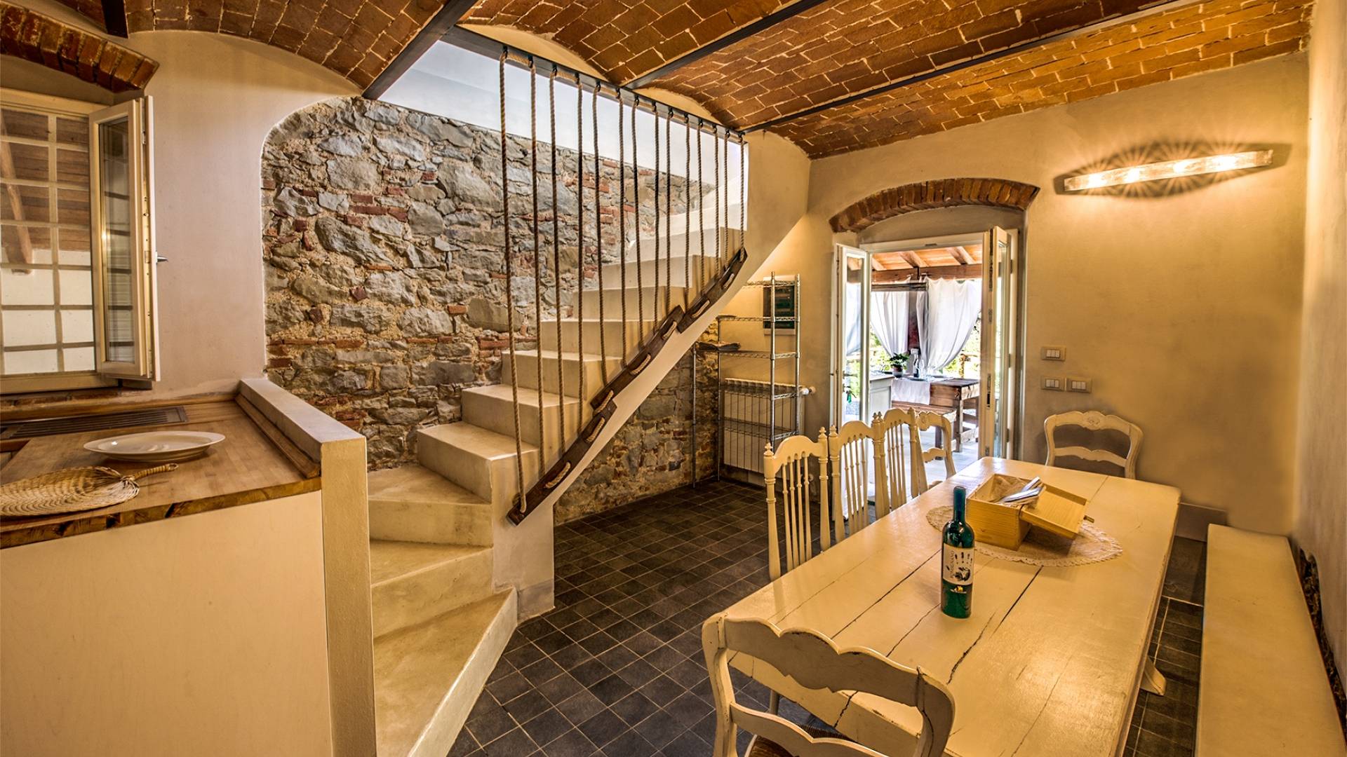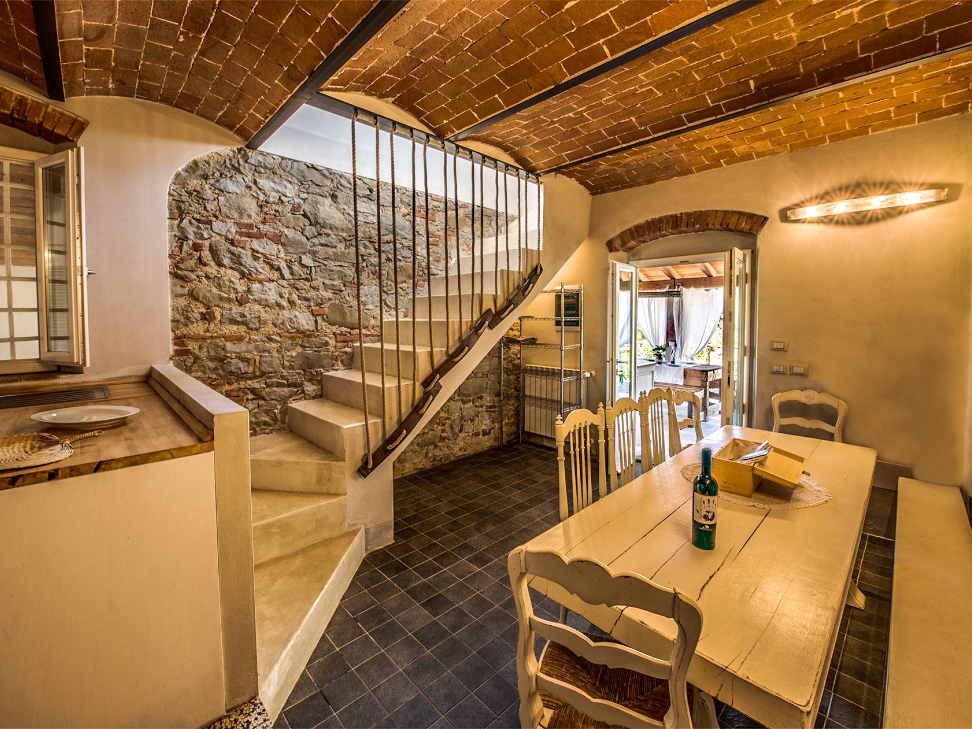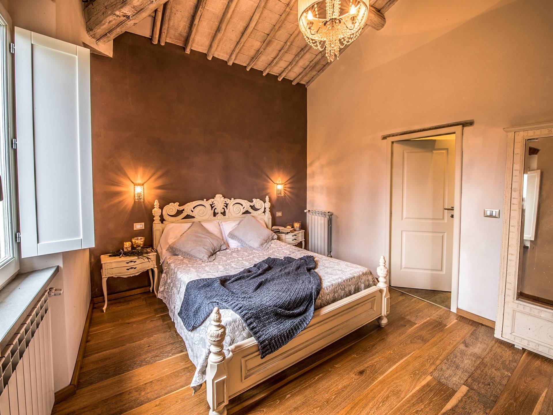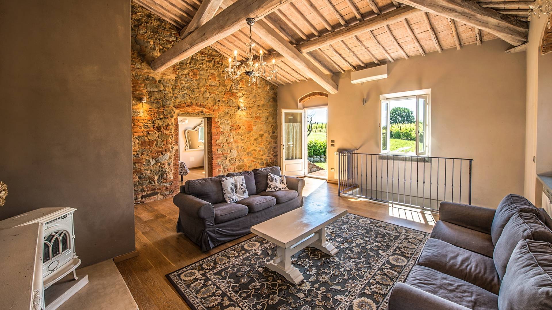 Inside you will be welcomed in a large hall with very high trussed ceilings, wooden beams, terracotta tiles. The warm colors of the walls and the large openings to the outside make the environment warm and bright at the same time. The bedrooms in the sleeping area are also very large, some with a mezzanine and all overlooking the countryside.