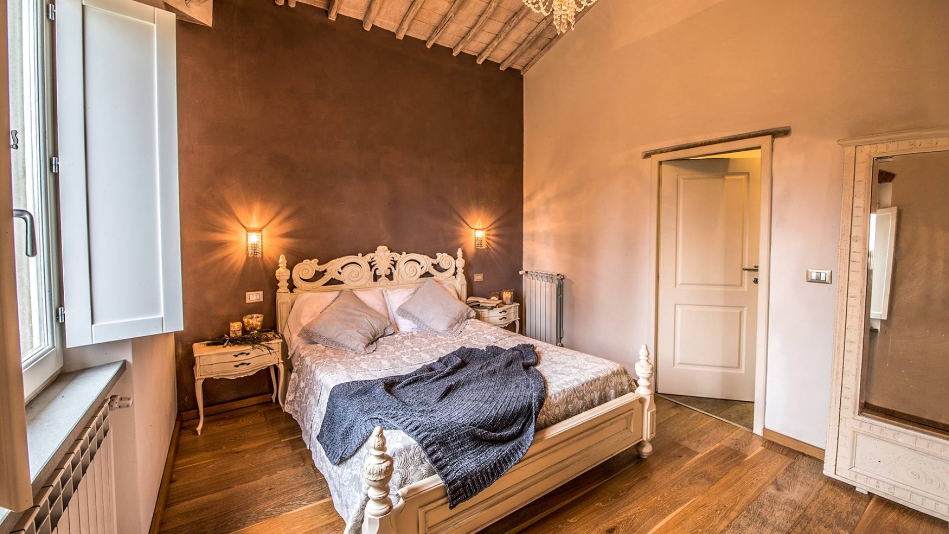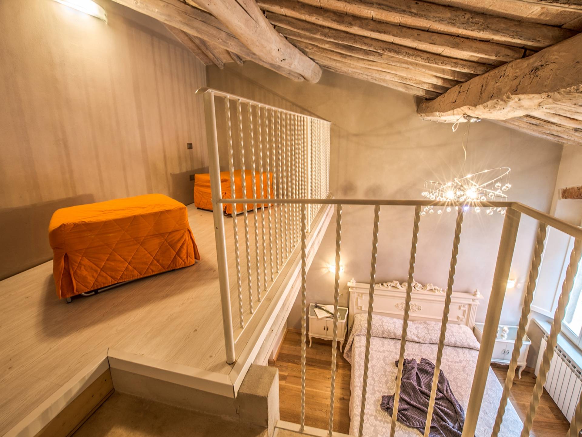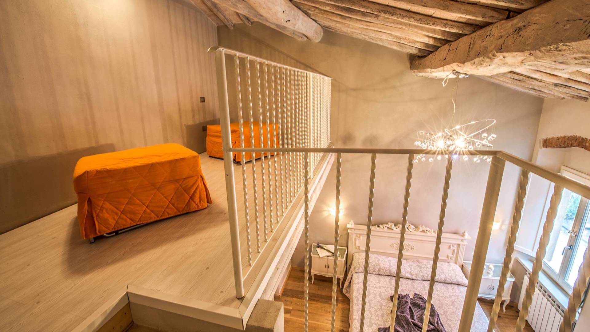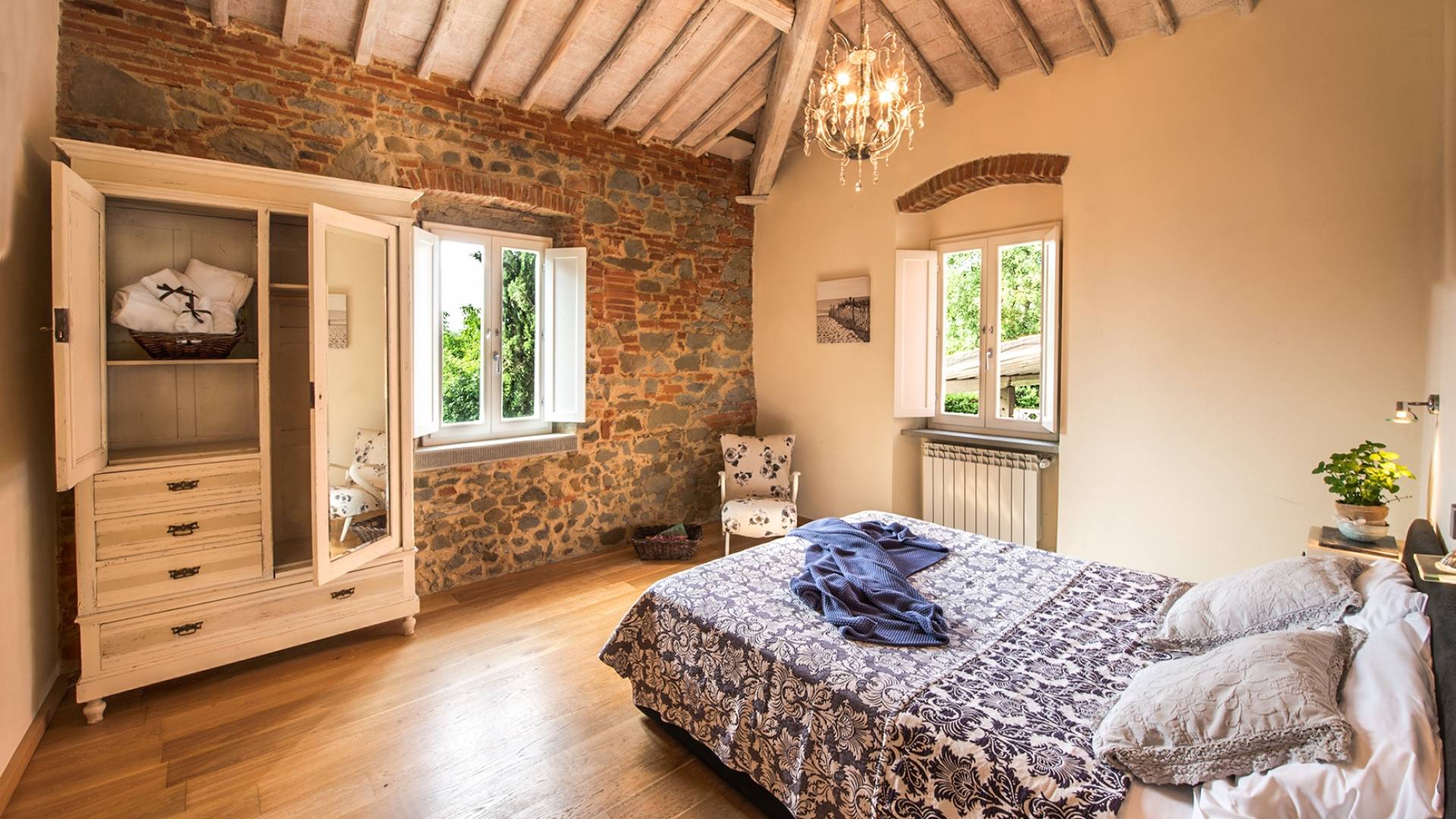 Inside you will be welcomed in a large hall with very high trussed ceilings, wooden beams, terracotta tiles. The warm colors of the walls and the large openings to the outside make the environment warm and bright at the same time. The bedrooms in the sleeping area are also very large, some with a mezzanine and all overlooking the countryside.