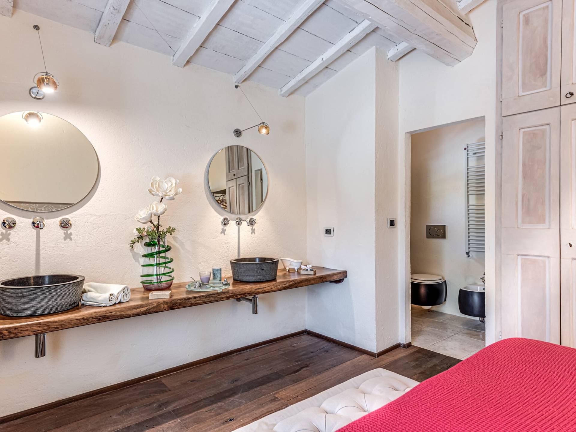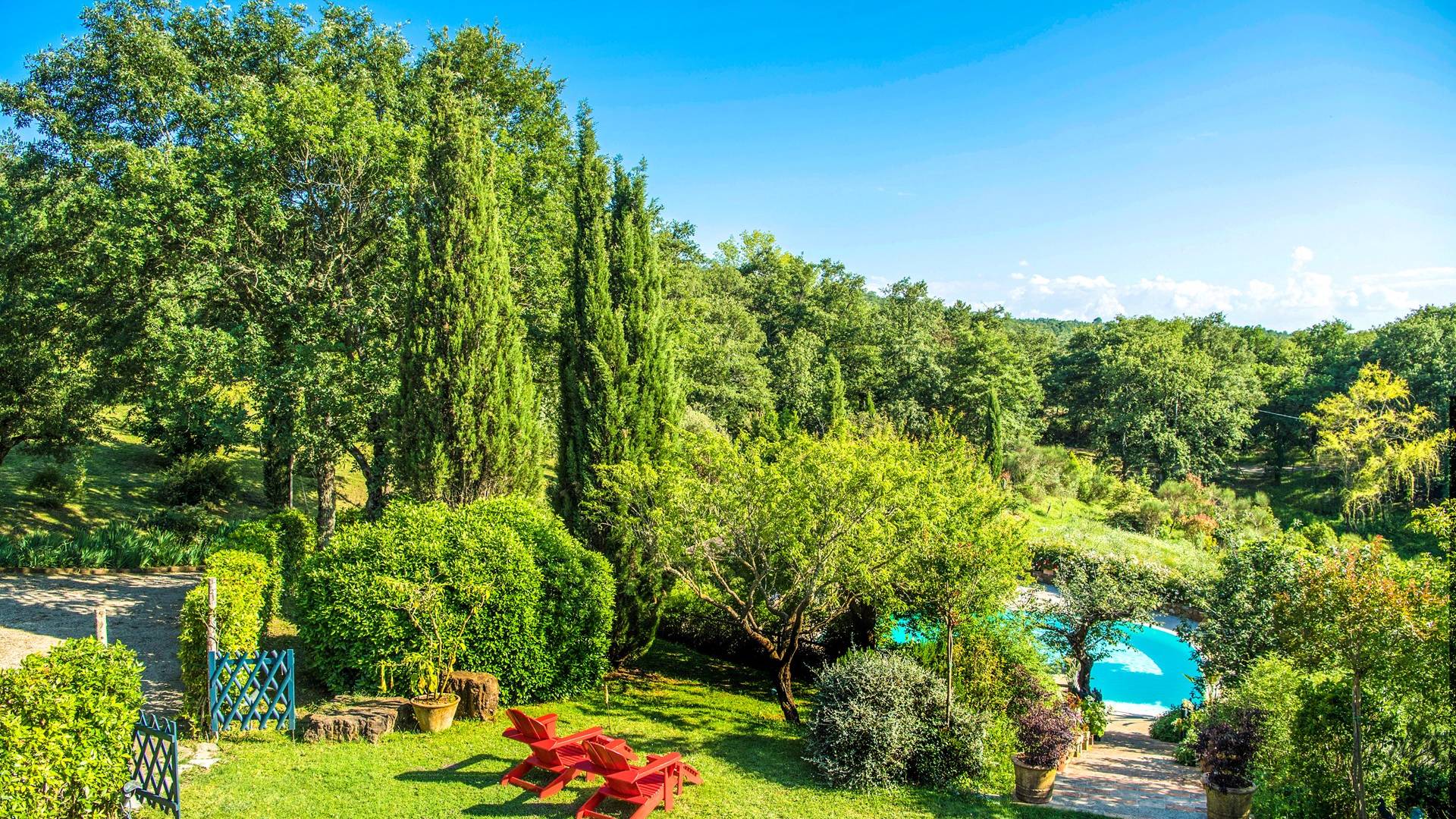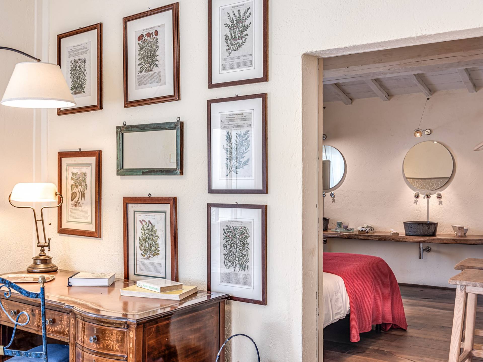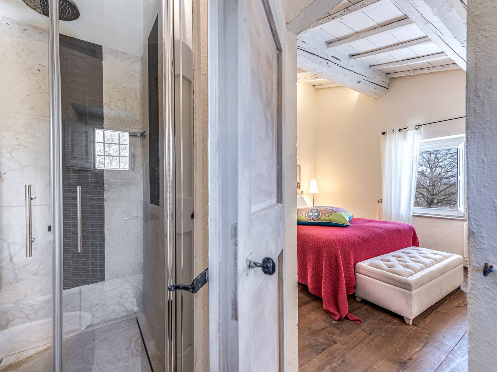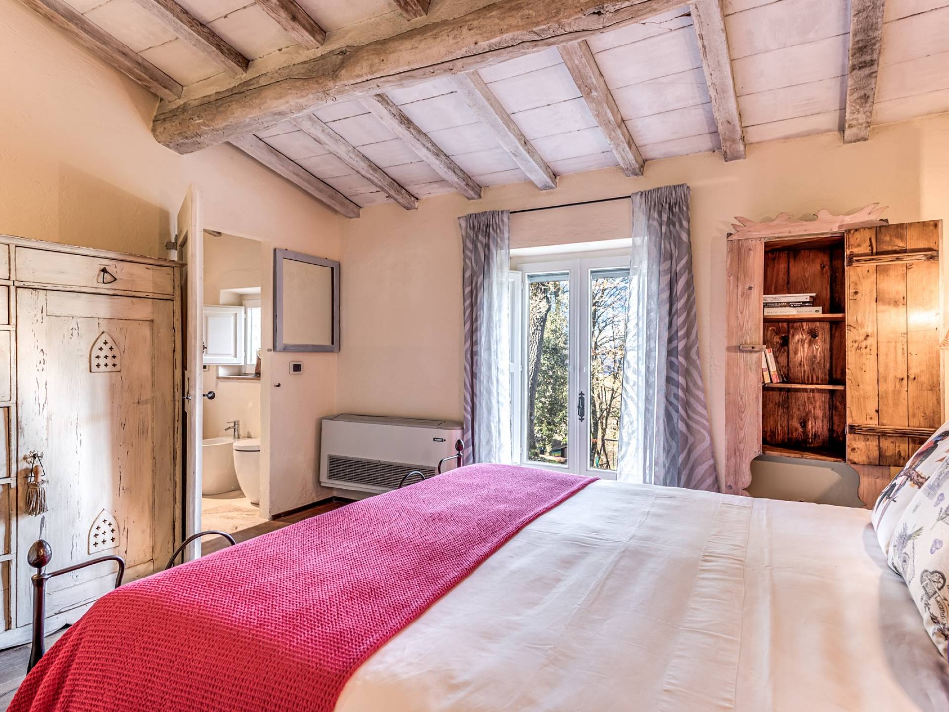 The home design, approached with simple yet tasteful additions, results in a classic/rustic style with quality oak-tiled floors in bedrooms and terracotta floors in the living area. Vaulted wood-beamed ceilings show elements of tradition that were kept during the renovation. Aesthetically, the house recalls traditional typologies — for instance, the classic farmhouse type of building and location— as well as traditional materials, including Rapolano marble, Travertine stone, and ancient oak wood locally sourced. Italian design elements populate the bathrooms. A lawn and large shade trees introduce this two-story villa, located amid the Val d'Orcia hills and woods. Nestled on a verdant hill overlooking the Val d'Orcia woods and valleys, this villa features a heated swimming pool and landscaped garden, with comforts like alfresco areas in the garden and around the swimming pool. Its current owners embarked on a total renovation in 2012, preserving the 18th-century rustic mood with all the required comforts.