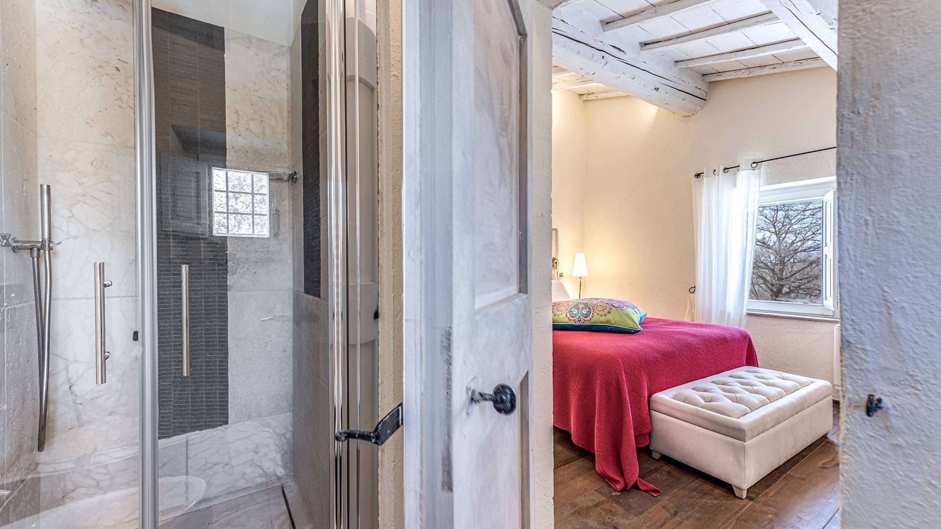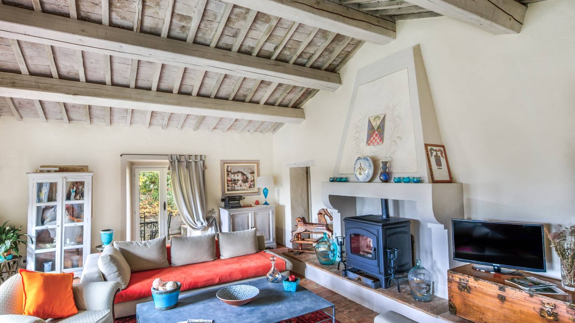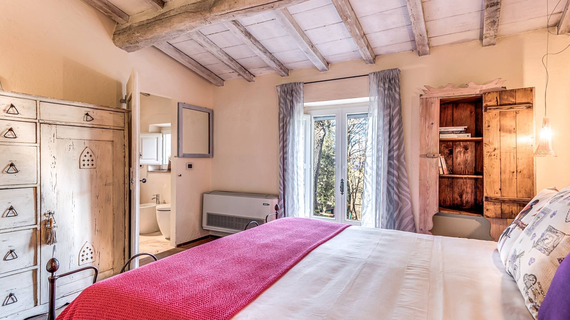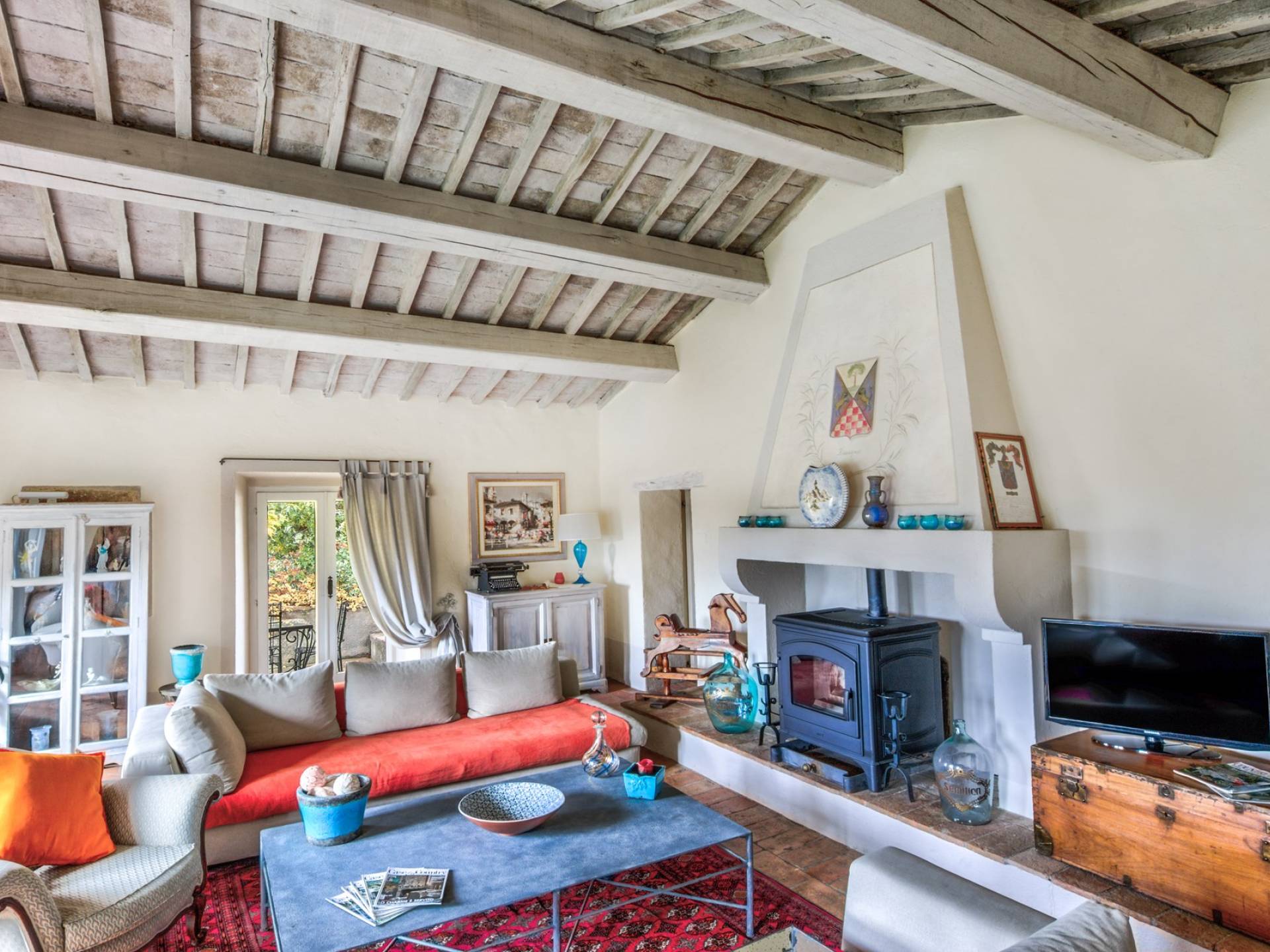 The home design, approached with simple yet tasteful additions, results in a classic/rustic style with quality oak-tiled floors in bedrooms and terracotta floors in the living area. Vaulted wood-beamed ceilings show elements of tradition that were kept during the renovation. Aesthetically, the house recalls traditional typologies — for instance, the classic farmhouse type of building and location— as well as traditional materials, including Rapolano marble, Travertine stone, and ancient oak wood locally sourced. Italian design elements populate the bathrooms. A lawn and large shade trees introduce this two-story villa, located amid the Val d'Orcia hills and woods. Nestled on a verdant hill overlooking the Val d'Orcia woods and valleys, this villa features a heated swimming pool and landscaped garden, with comforts like alfresco areas in the garden and around the swimming pool. Its current owners embarked on a total renovation in 2012, preserving the 18th-century rustic mood with all the required comforts.