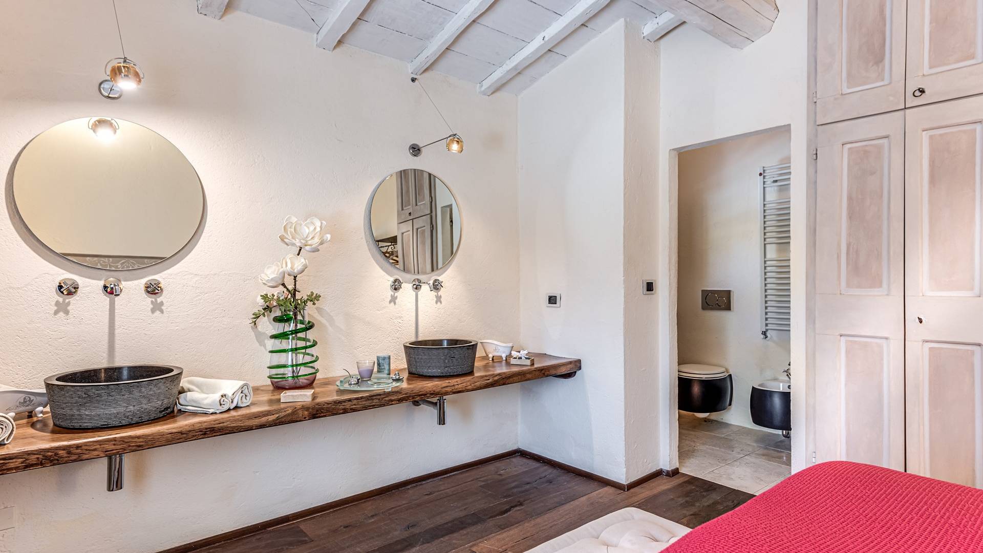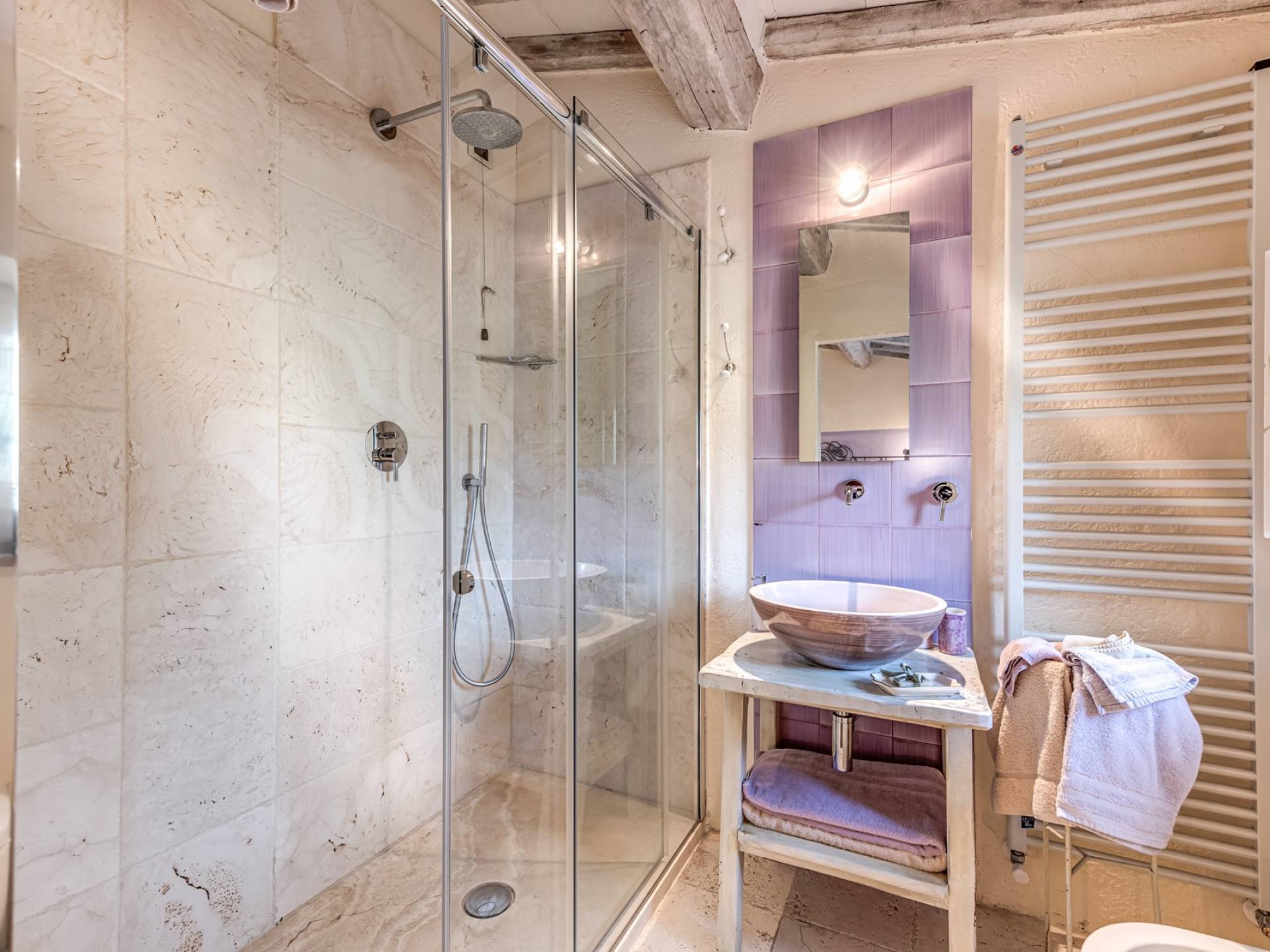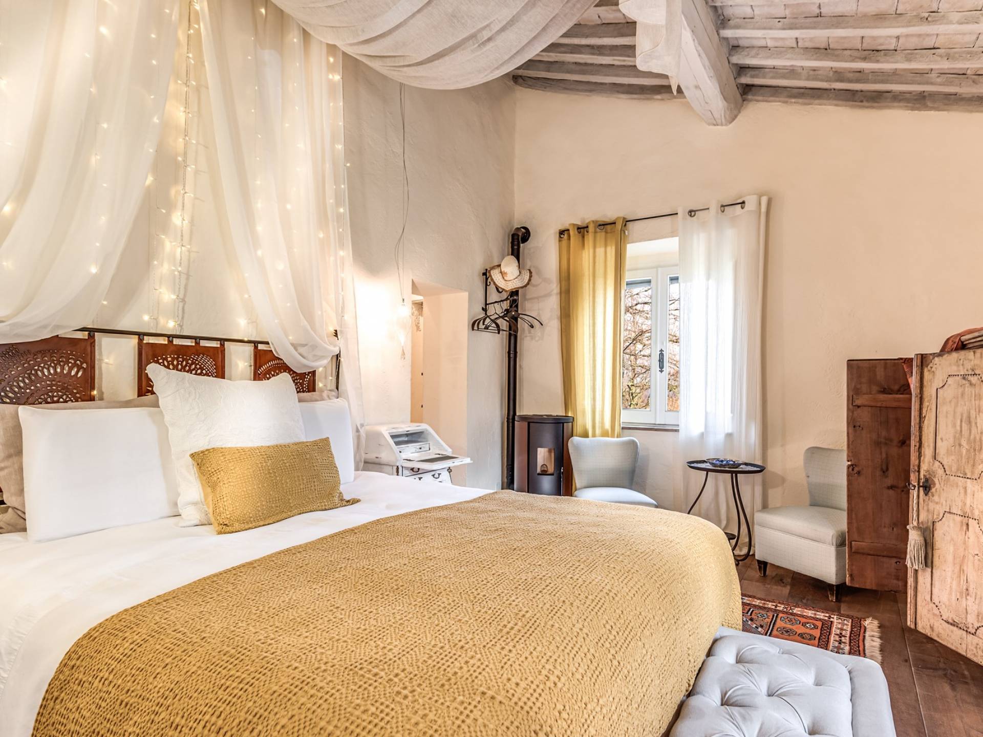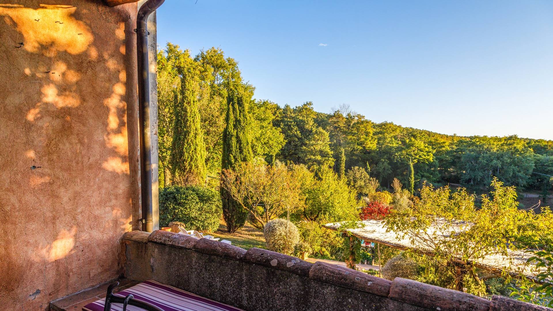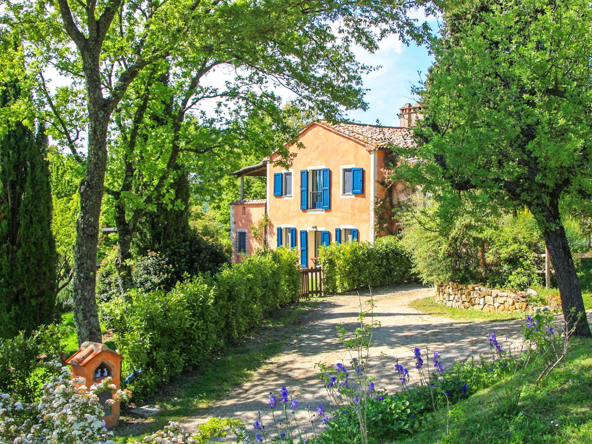 The home design, approached with simple yet tasteful additions, results in a classic/rustic style with quality oak-tiled floors in bedrooms and terracotta floors in the living area. Vaulted wood-beamed ceilings show elements of tradition that were kept during the renovation. Aesthetically, the house recalls traditional typologies — for instance, the classic farmhouse type of building and location— as well as traditional materials, including Rapolano marble, Travertine stone, and ancient oak wood locally sourced. Italian design elements populate the bathrooms. A lawn and large shade trees introduce this two-story villa, located amid the Val d'Orcia hills and woods. Nestled on a verdant hill overlooking the Val d'Orcia woods and valleys, this villa features a heated swimming pool and landscaped garden, with comforts like alfresco areas in the garden and around the swimming pool. Its current owners embarked on a total renovation in 2012, preserving the 18th-century rustic mood with all the required comforts.