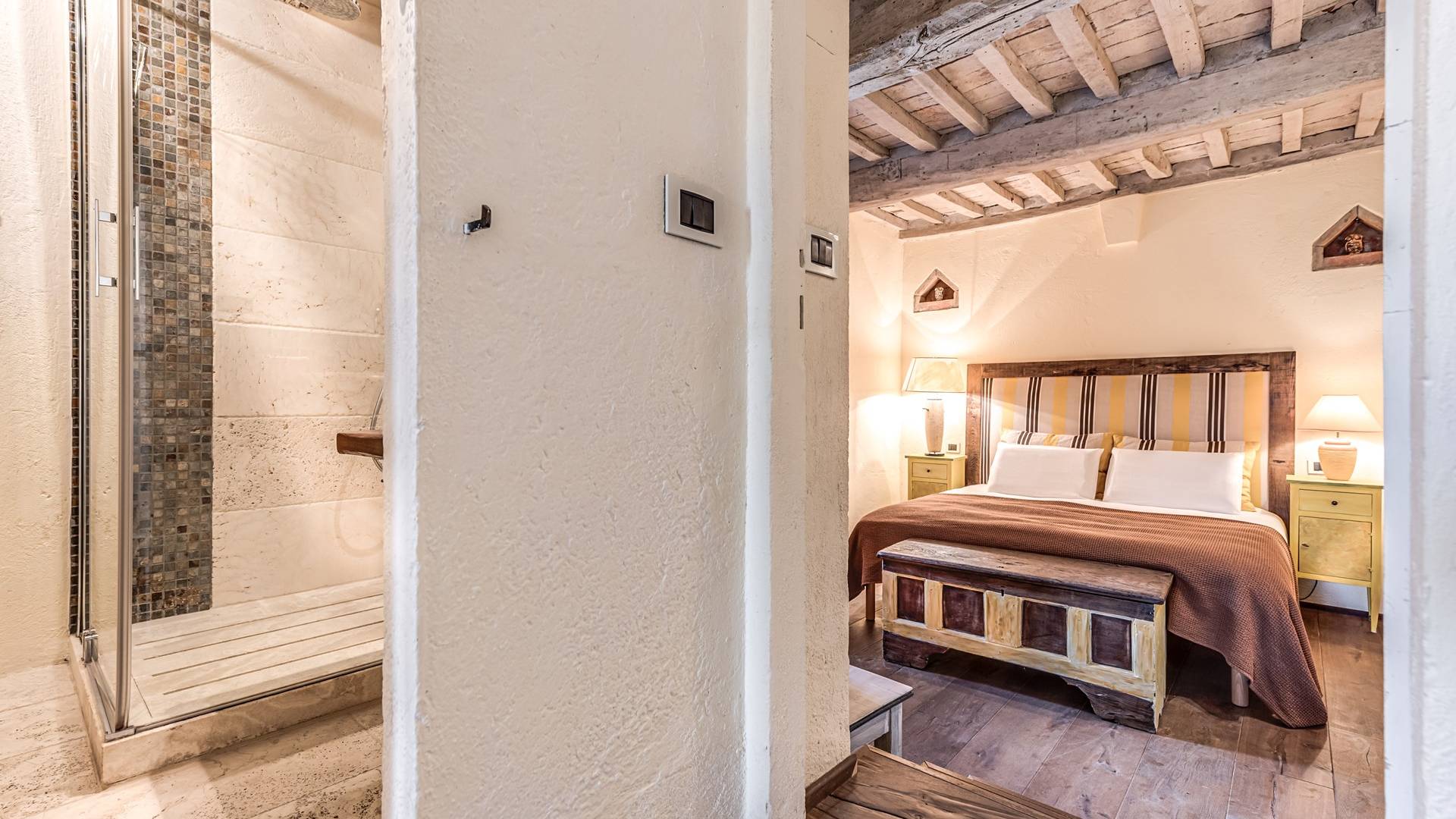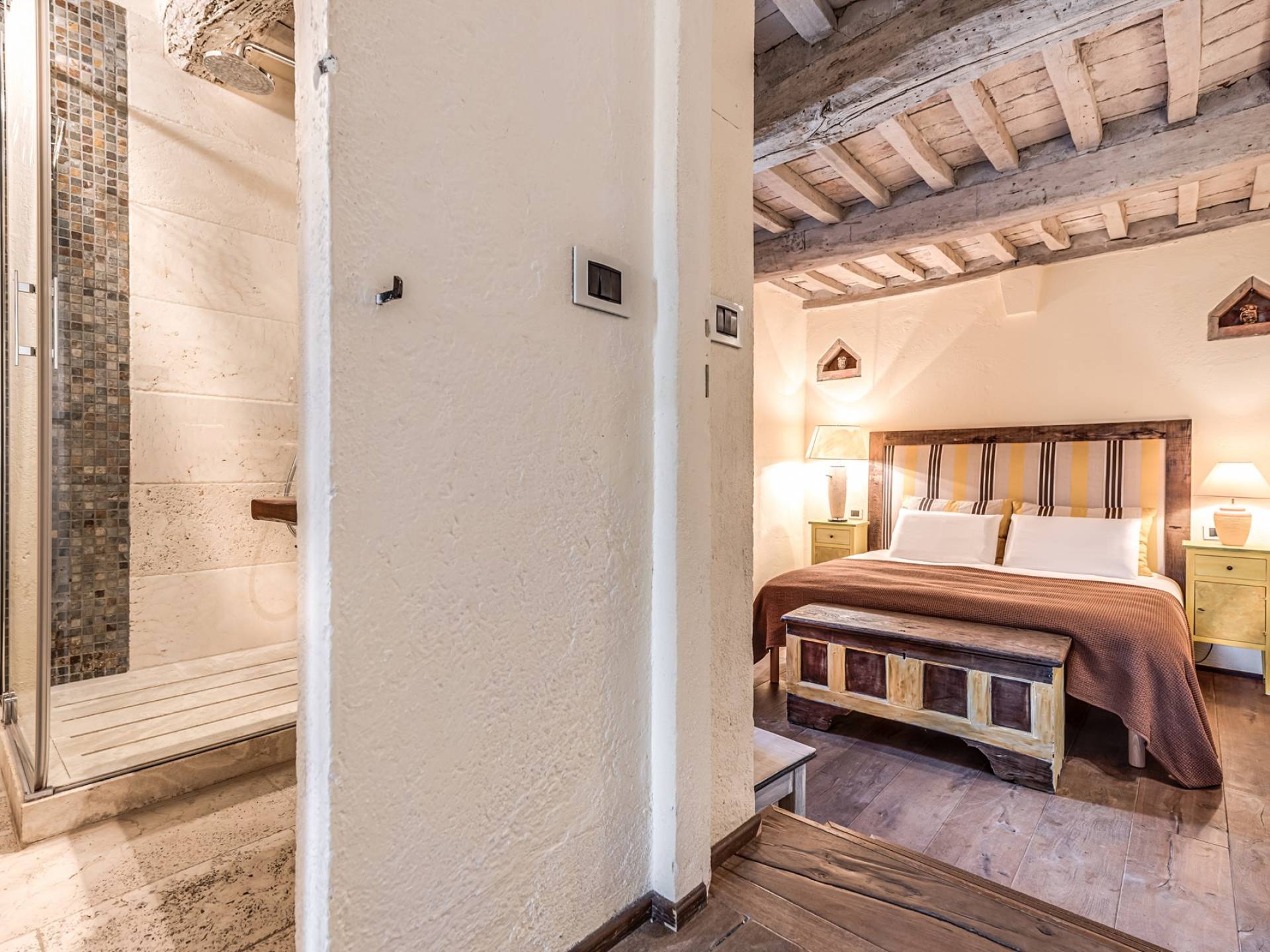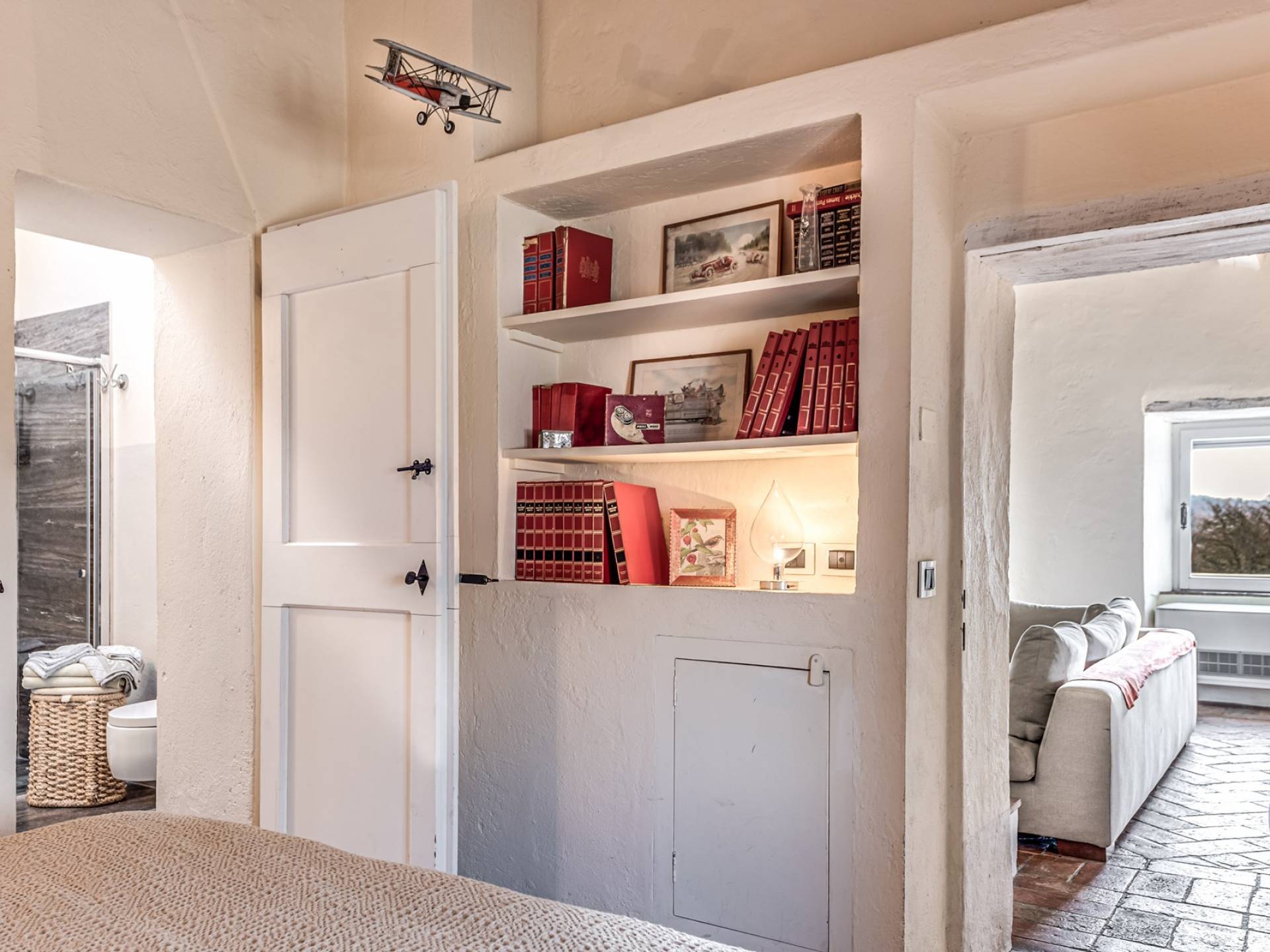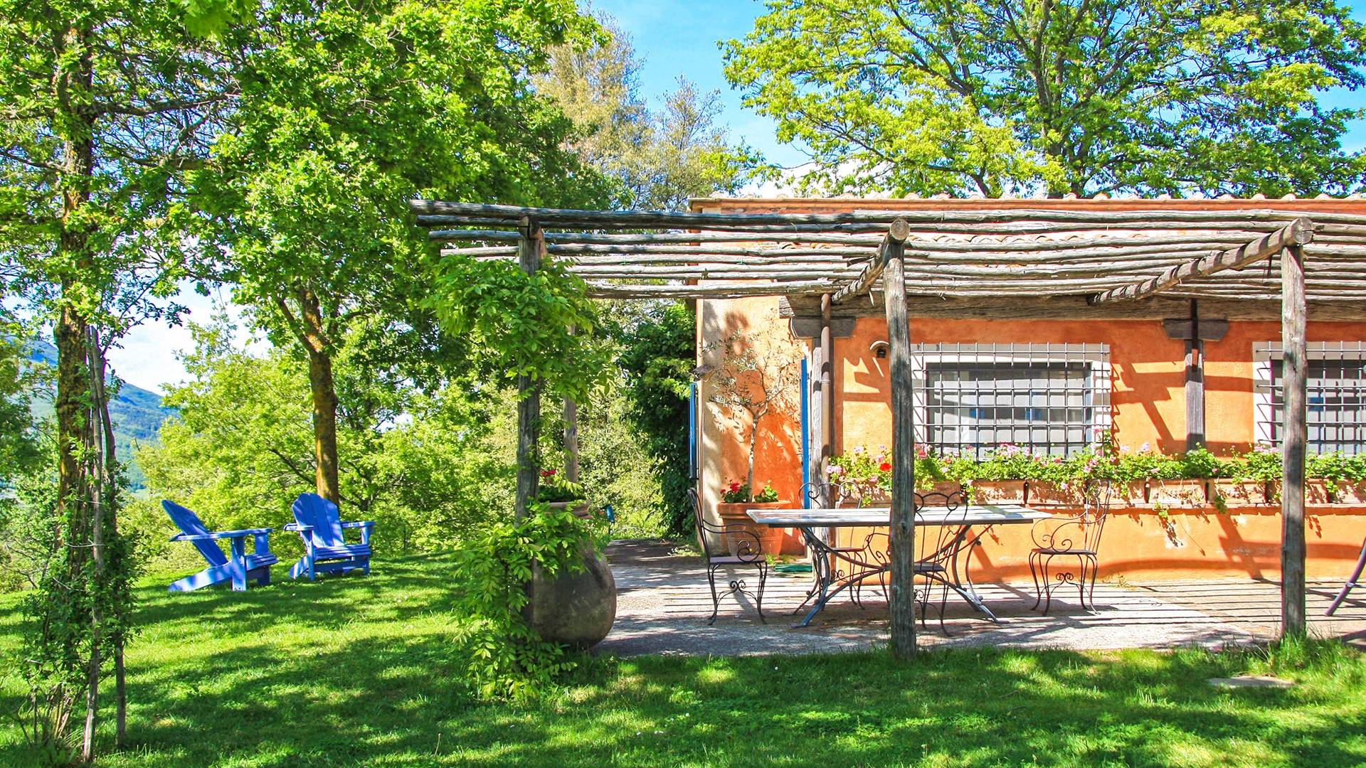 The home design, approached with simple yet tasteful additions, results in a classic/rustic style with quality oak-tiled floors in bedrooms and terracotta floors in the living area. Vaulted wood-beamed ceilings show elements of tradition that were kept during the renovation. Aesthetically, the house recalls traditional typologies — for instance, the classic farmhouse type of building and location— as well as traditional materials, including Rapolano marble, Travertine stone, and ancient oak wood locally sourced. Italian design elements populate the bathrooms. A lawn and large shade trees introduce this two-story villa, located amid the Val d'Orcia hills and woods. Nestled on a verdant hill overlooking the Val d'Orcia woods and valleys, this villa features a heated swimming pool and landscaped garden, with comforts like alfresco areas in the garden and around the swimming pool. Its current owners embarked on a total renovation in 2012, preserving the 18th-century rustic mood with all the required comforts.