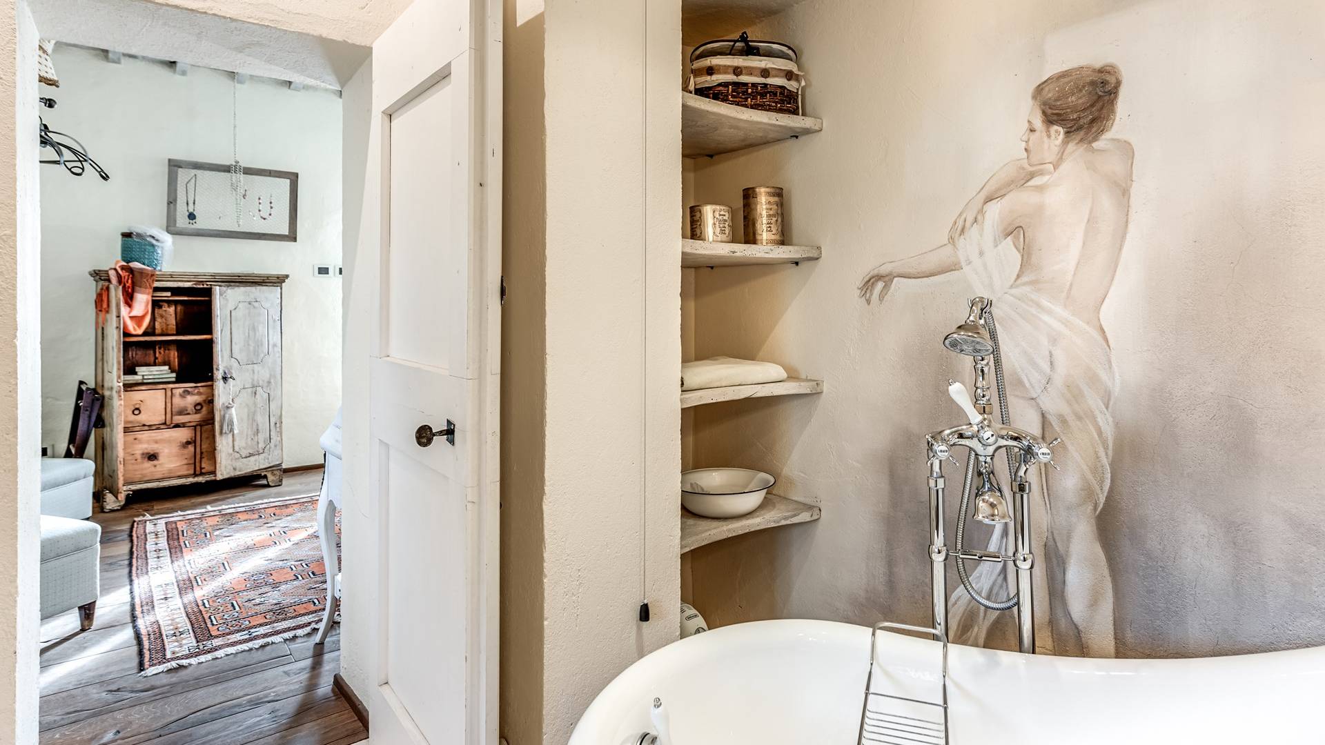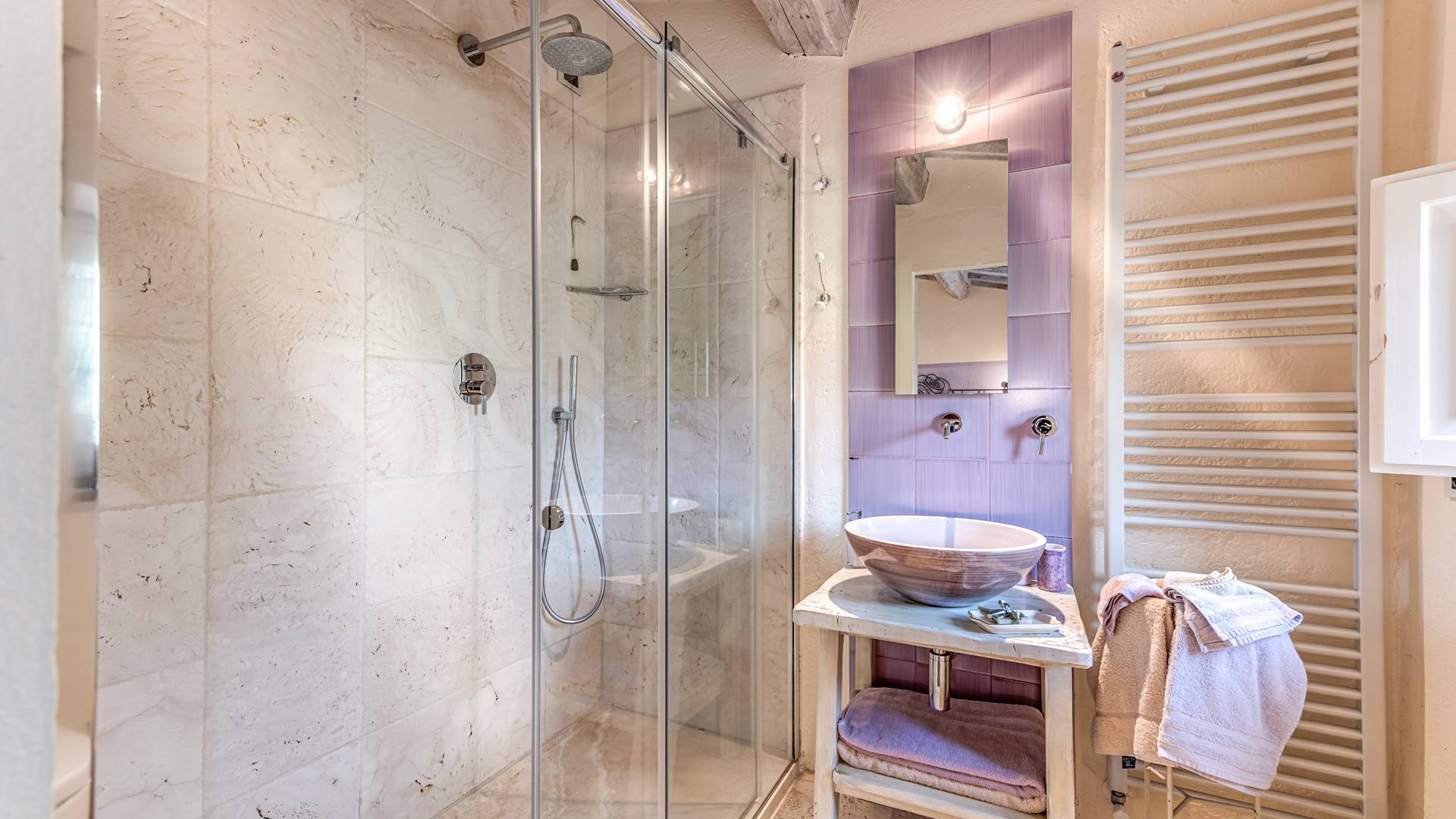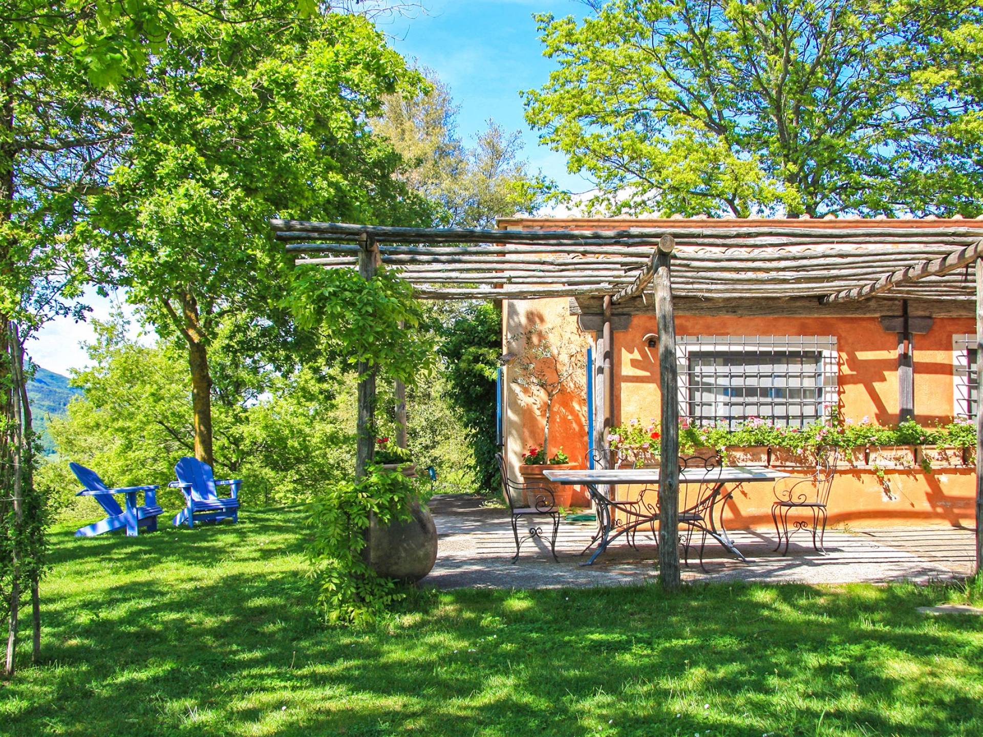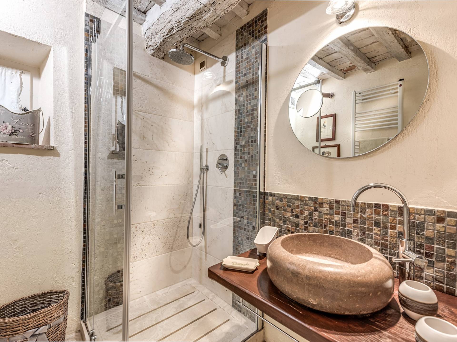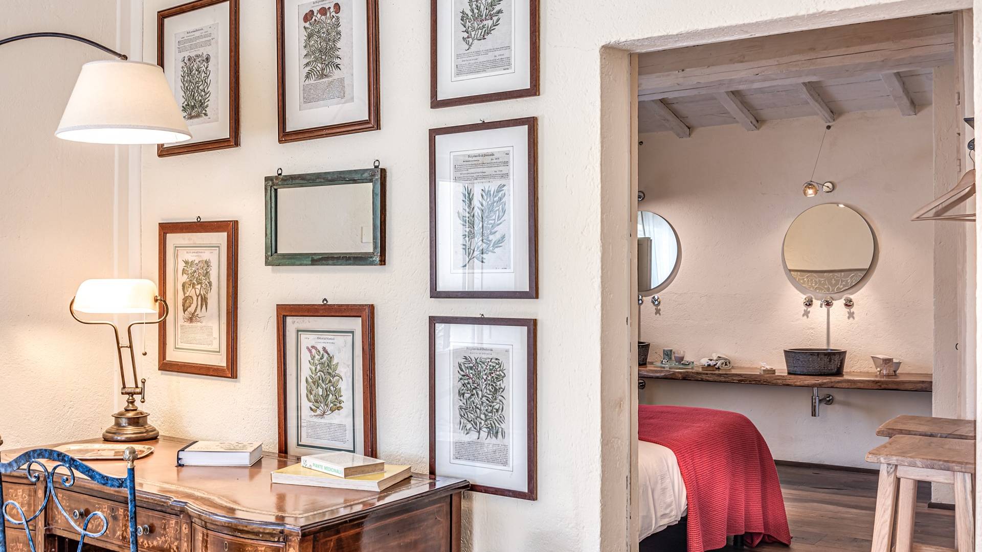 The home design, approached with simple yet tasteful additions, results in a classic/rustic style with quality oak-tiled floors in bedrooms and terracotta floors in the living area. Vaulted wood-beamed ceilings show elements of tradition that were kept during the renovation. Aesthetically, the house recalls traditional typologies — for instance, the classic farmhouse type of building and location— as well as traditional materials, including Rapolano marble, Travertine stone, and ancient oak wood locally sourced. Italian design elements populate the bathrooms. A lawn and large shade trees introduce this two-story villa, located amid the Val d'Orcia hills and woods. Nestled on a verdant hill overlooking the Val d'Orcia woods and valleys, this villa features a heated swimming pool and landscaped garden, with comforts like alfresco areas in the garden and around the swimming pool. Its current owners embarked on a total renovation in 2012, preserving the 18th-century rustic mood with all the required comforts.