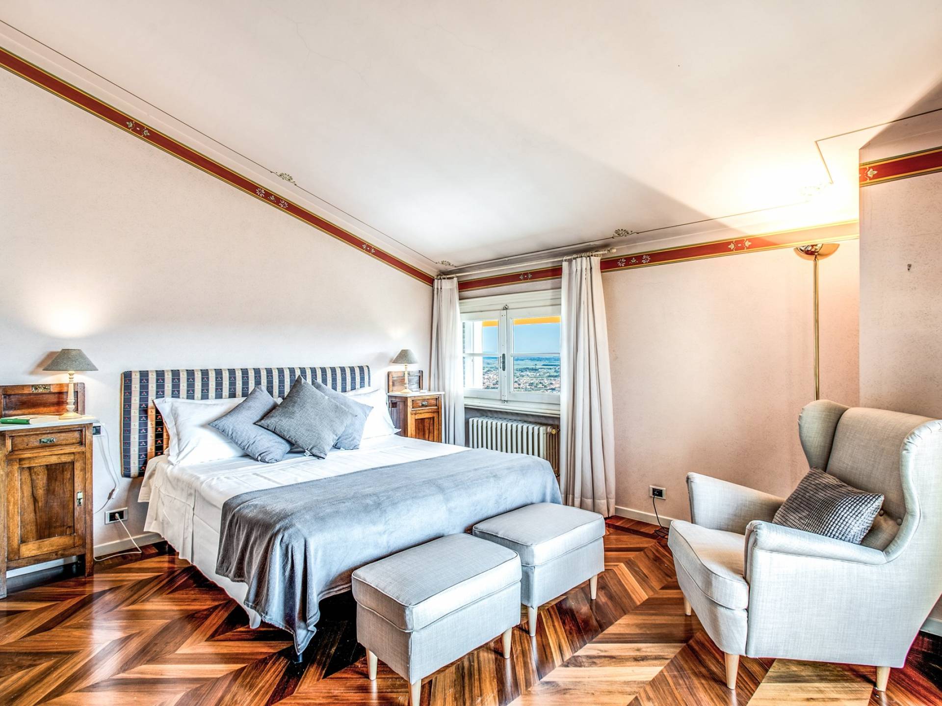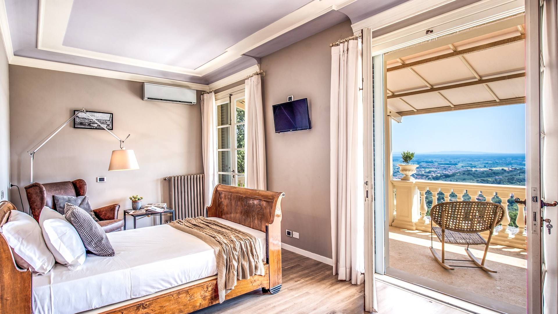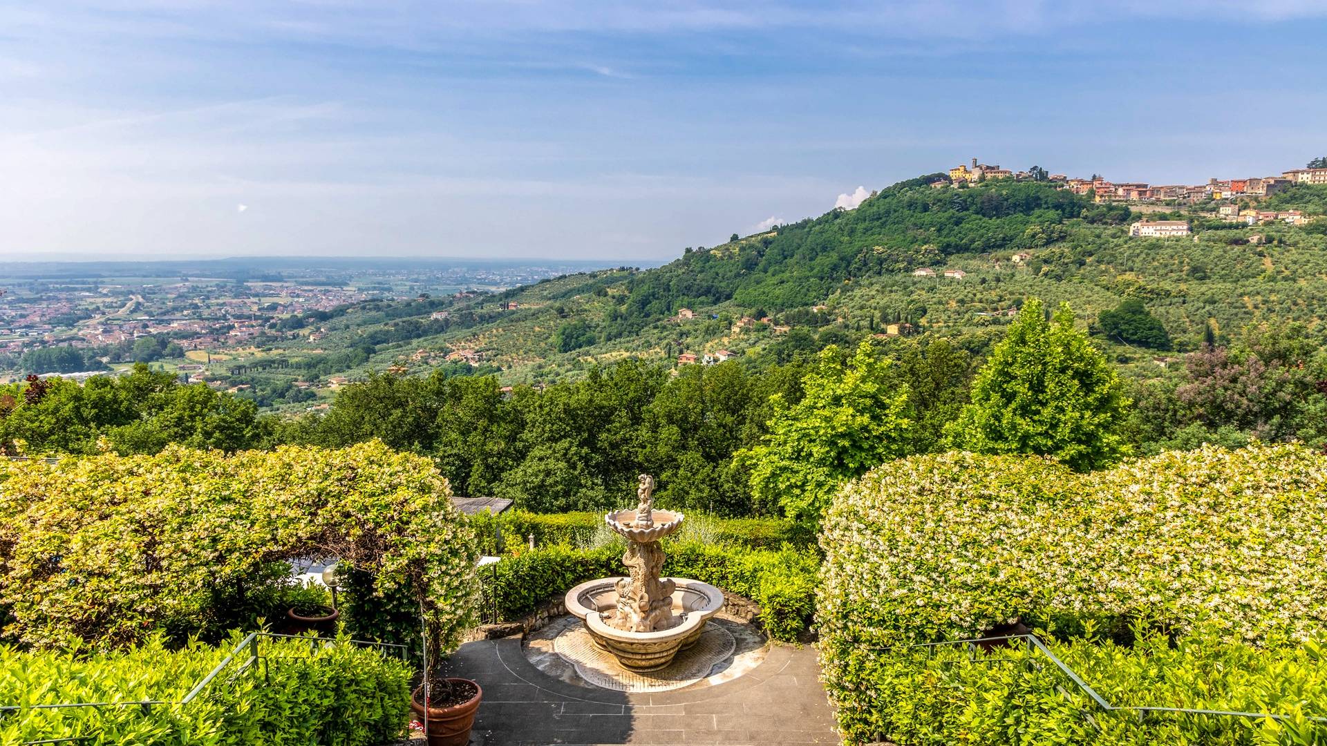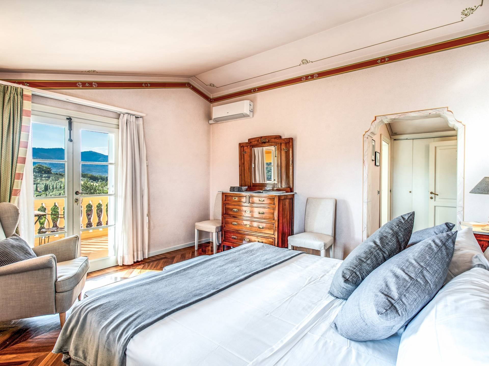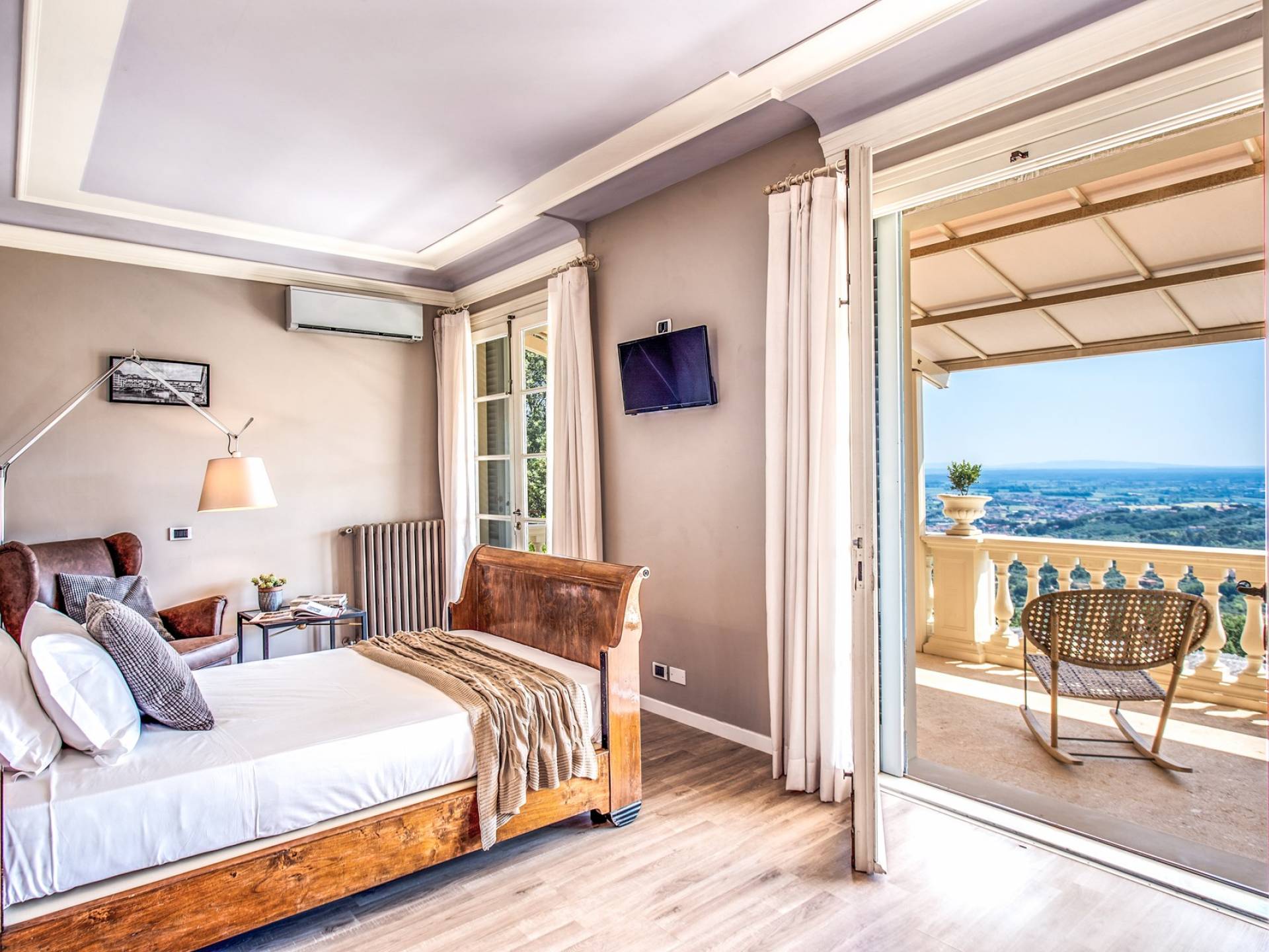 Villa Convento Tuscany is set on the highest point of the property, the three-level main house affords views of the scenic landscape from almost every angle. On the sweeping grounds, there’s a large pool, a solarium, and multiple chairs and chaise-longues for guests or to use as rentals. Hidden away, yet very close to the village of Montecatini Alto center, this estate offers six bedrooms decorated in elegant style with color-washed walls in pale shades, and contemporary fabrics, which lend a very personal touch.