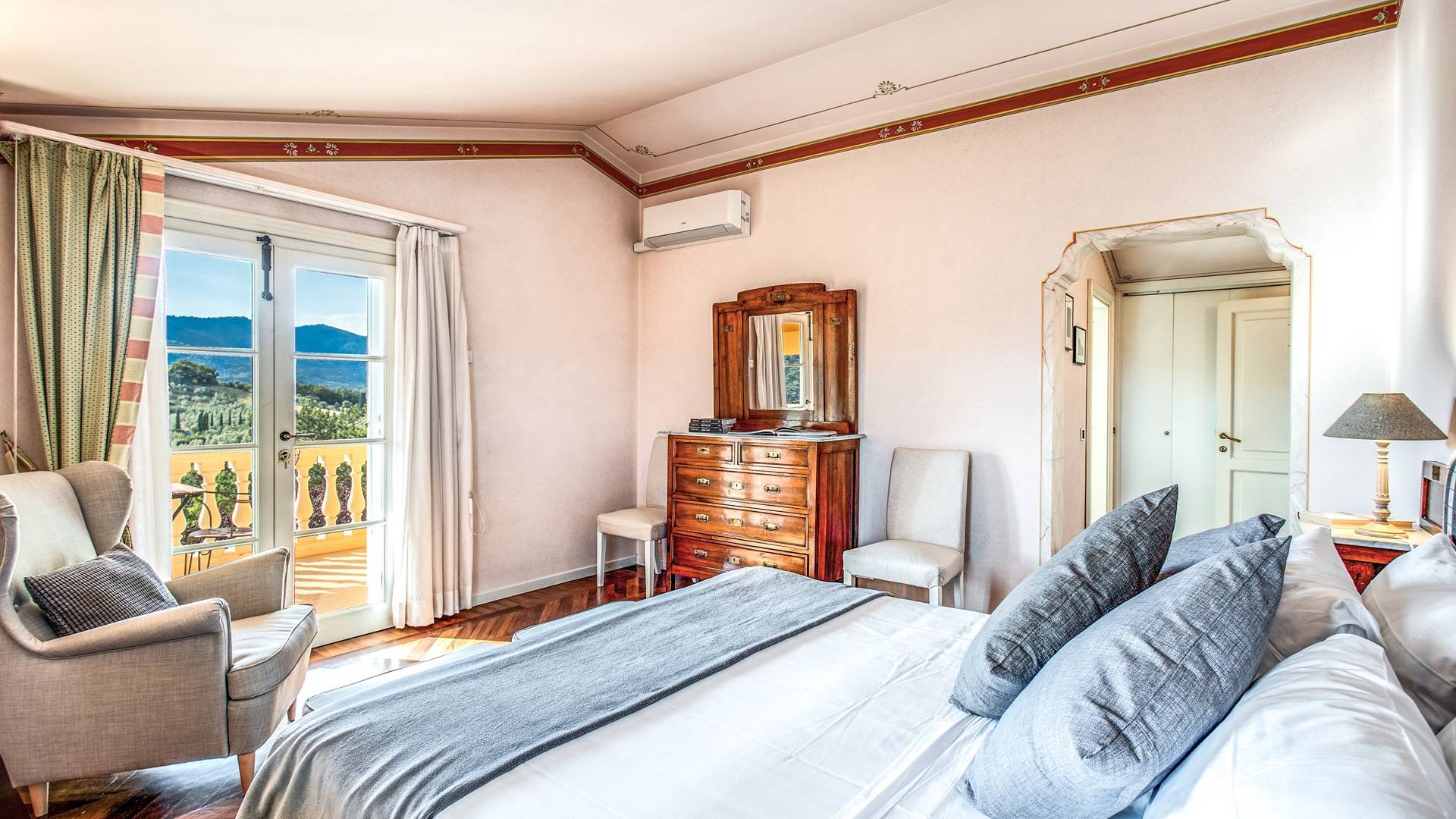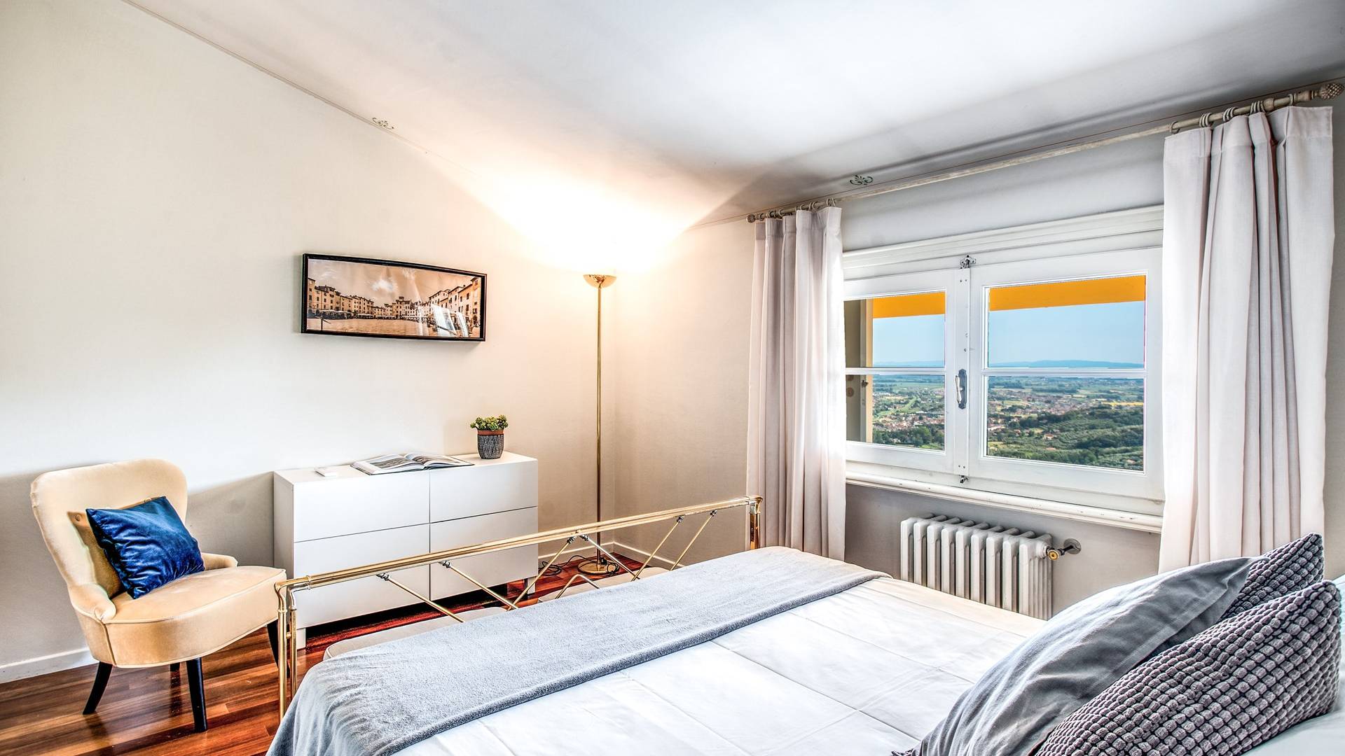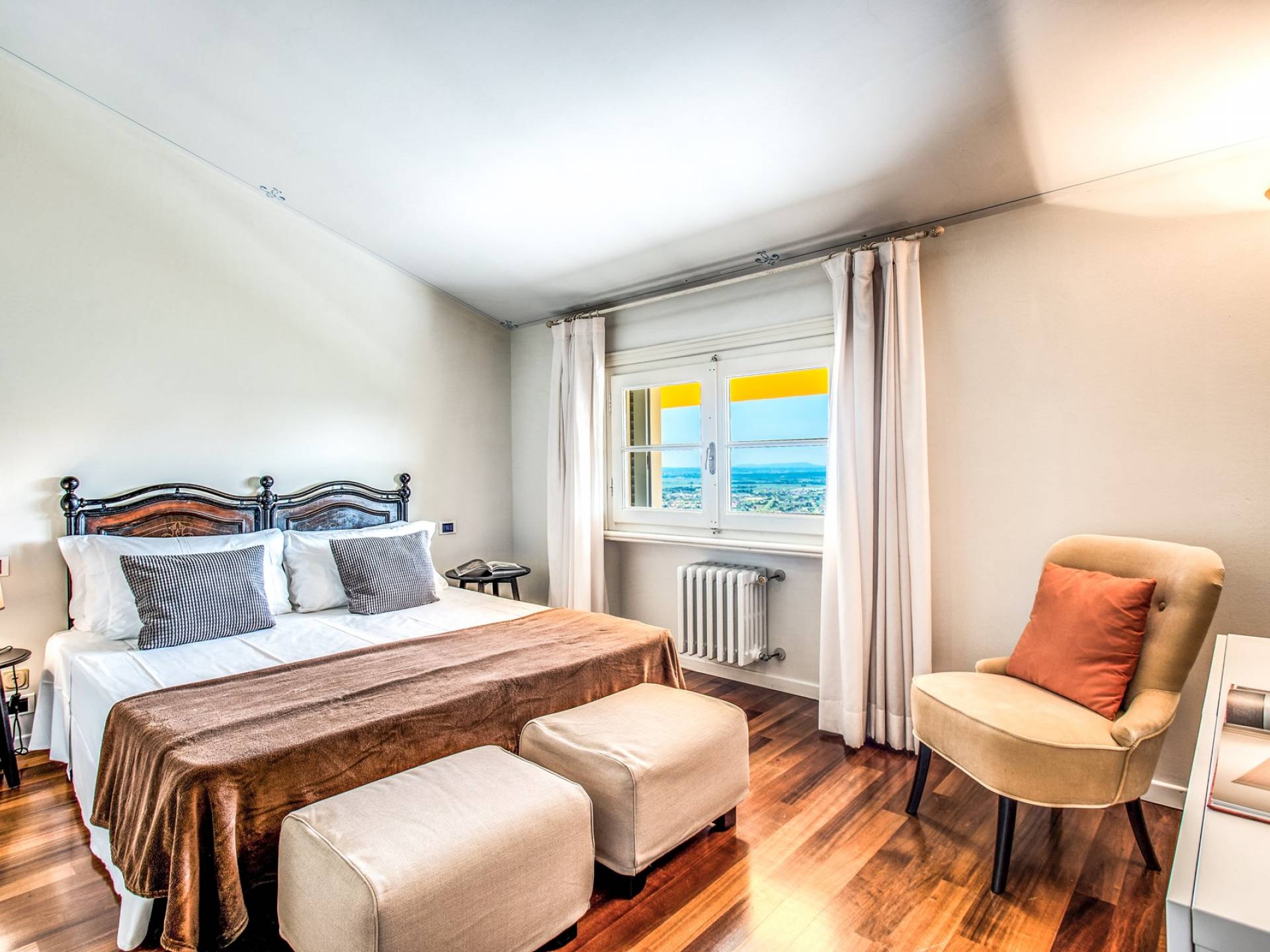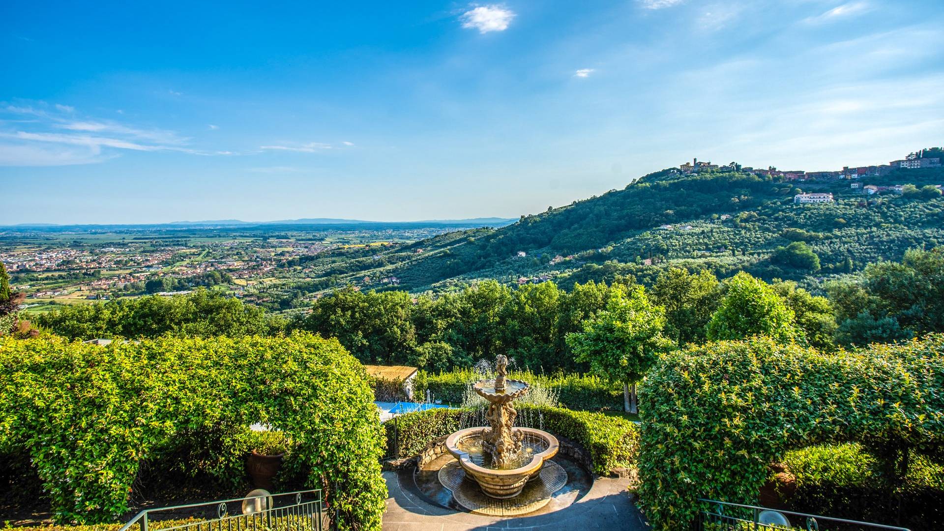 Villa Convento Tuscany is set on the highest point of the property, the three-level main house affords views of the scenic landscape from almost every angle. On the sweeping grounds, there’s a large pool, a solarium, and multiple chairs and chaise-longues for guests or to use as rentals. Hidden away, yet very close to the village of Montecatini Alto center, this estate offers six bedrooms decorated in elegant style with color-washed walls in pale shades, and contemporary fabrics, which lend a very personal touch.