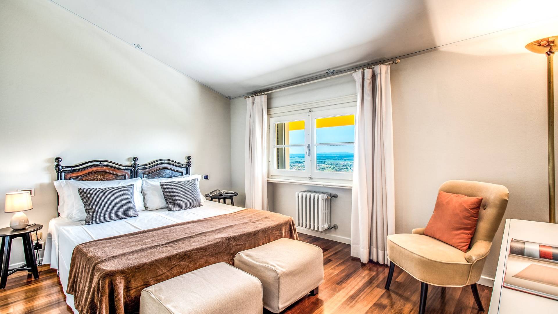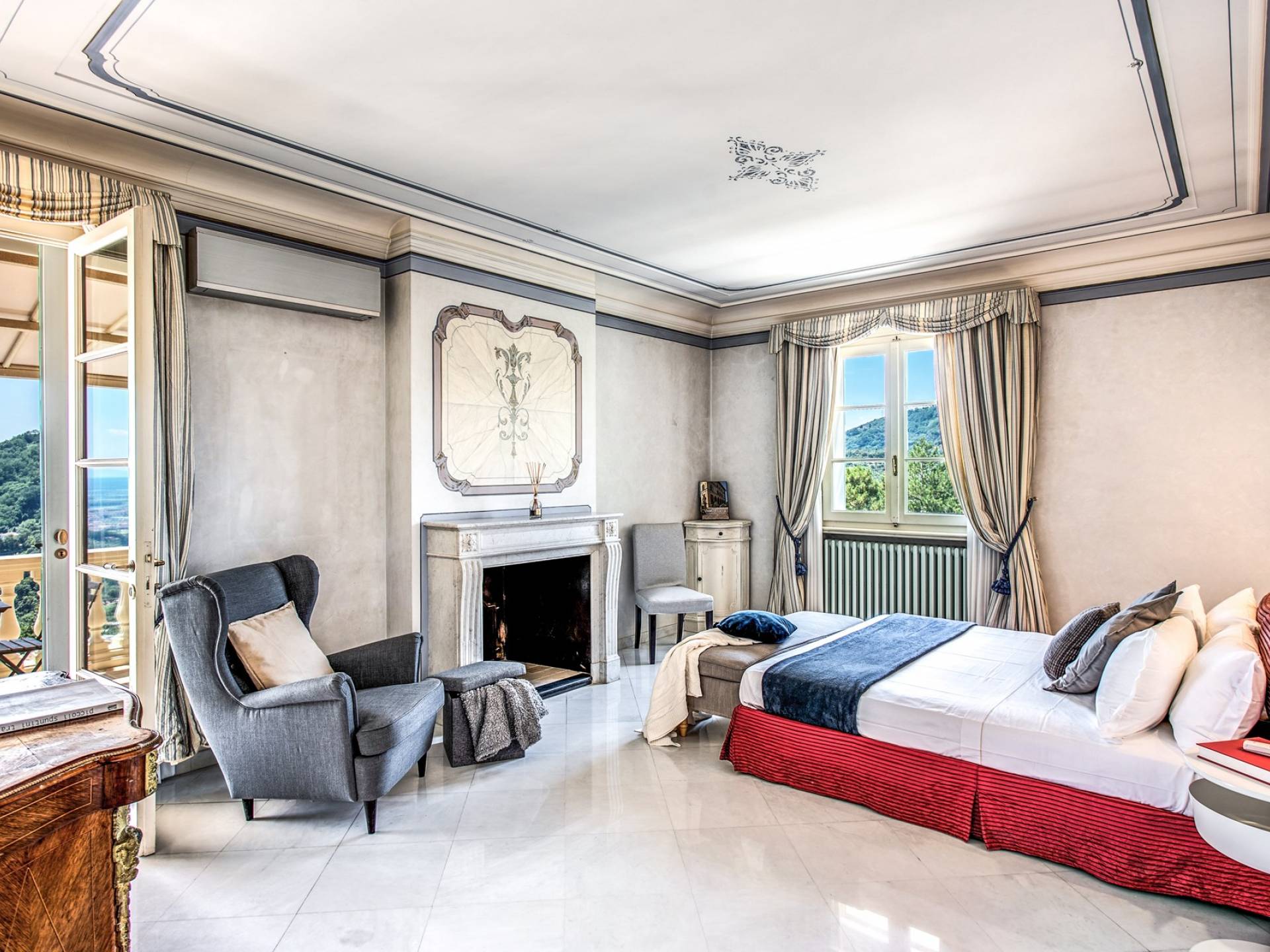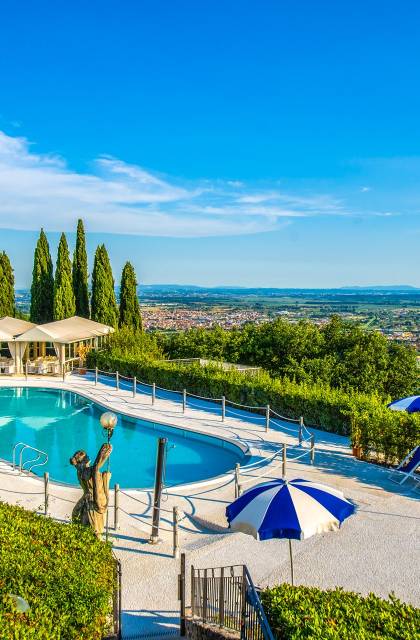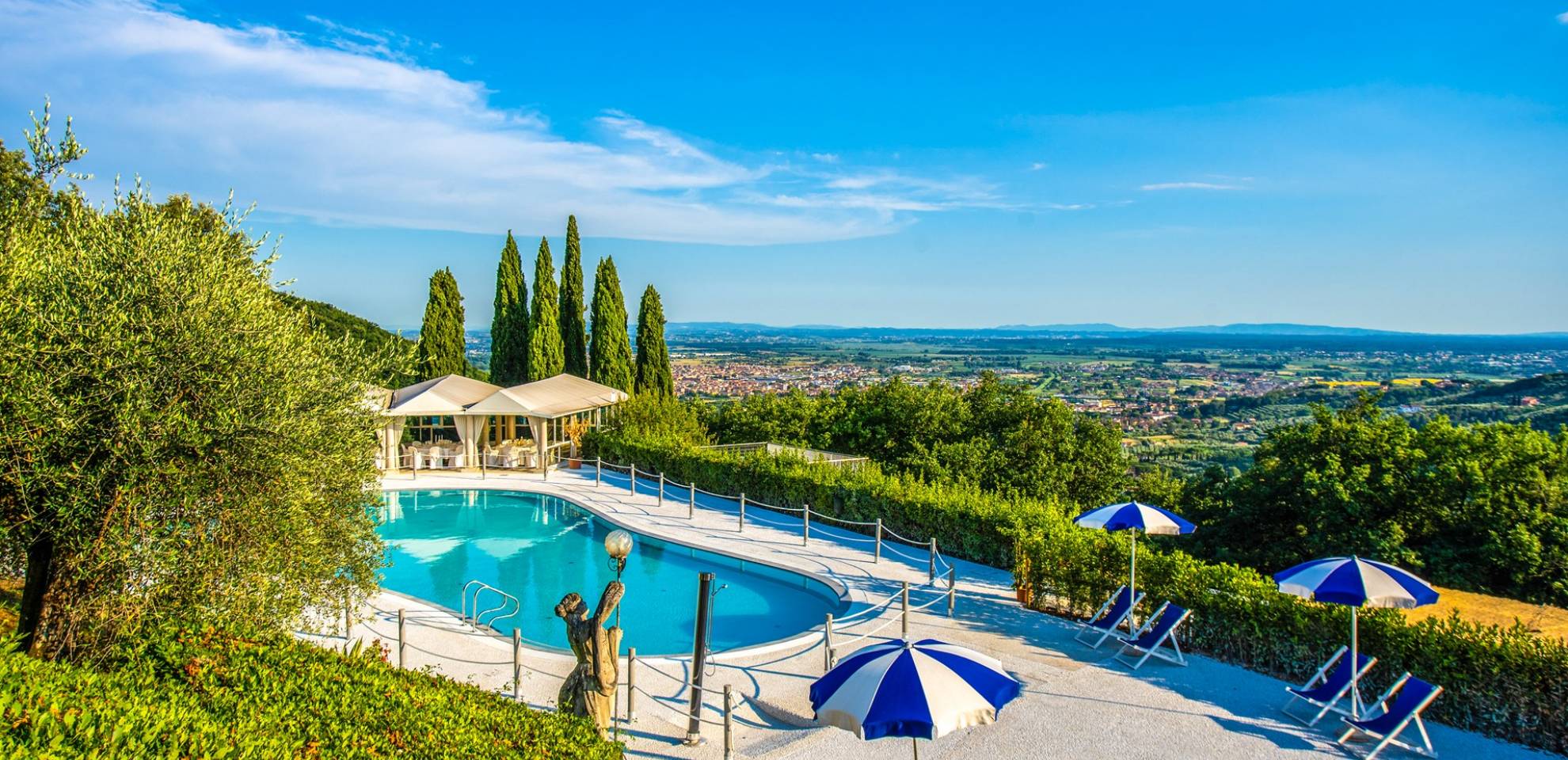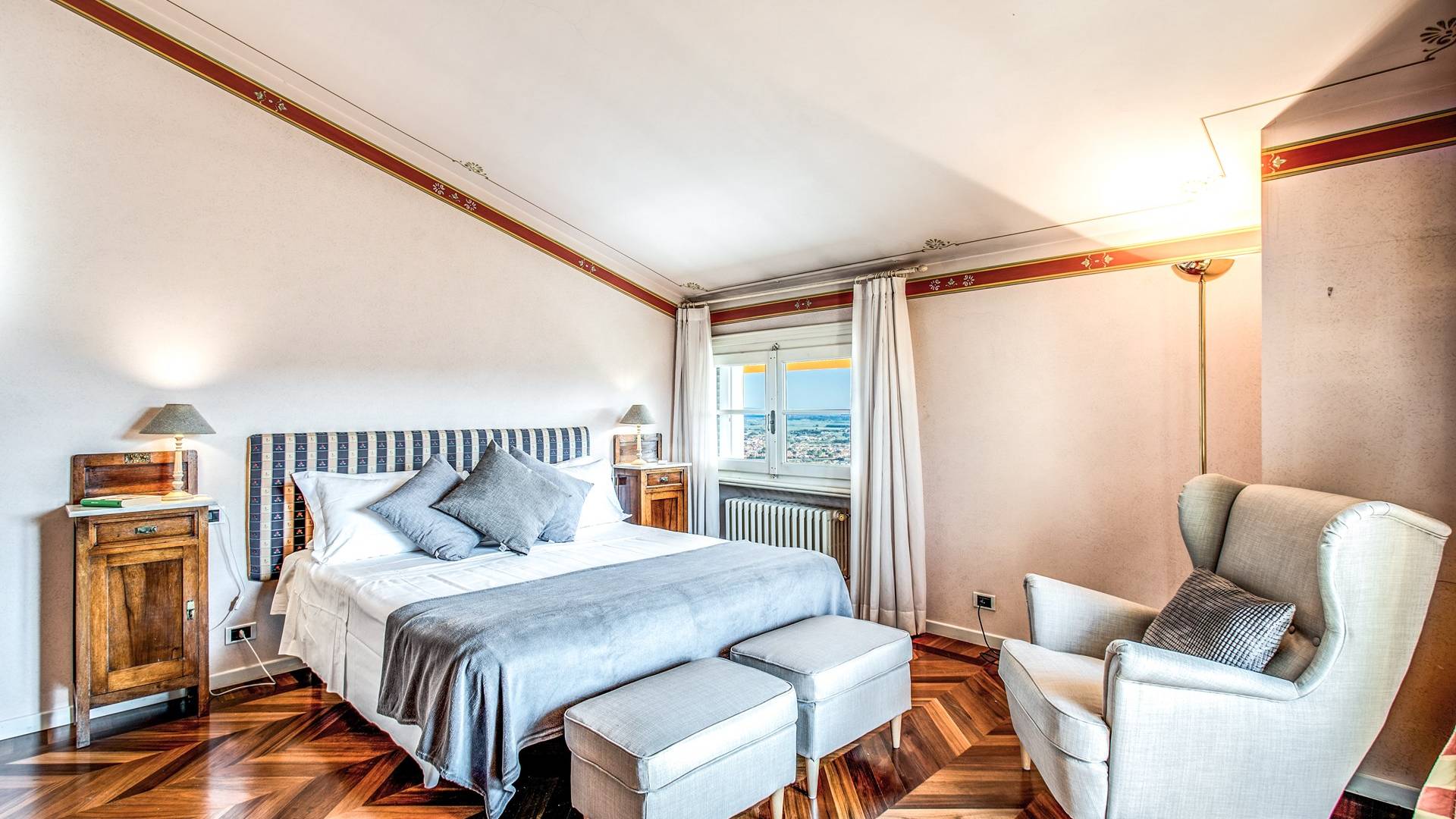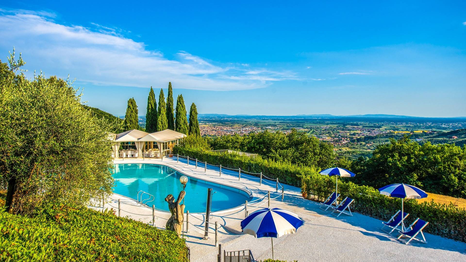 Villa Convento Tuscany is set on the highest point of the property, the three-level main house affords views of the scenic landscape from almost every angle. On the sweeping grounds, there’s a large pool, a solarium, and multiple chairs and chaise-longues for guests or to use as rentals. Hidden away, yet very close to the village of Montecatini Alto center, this estate offers six bedrooms decorated in elegant style with color-washed walls in pale shades, and contemporary fabrics, which lend a very personal touch.