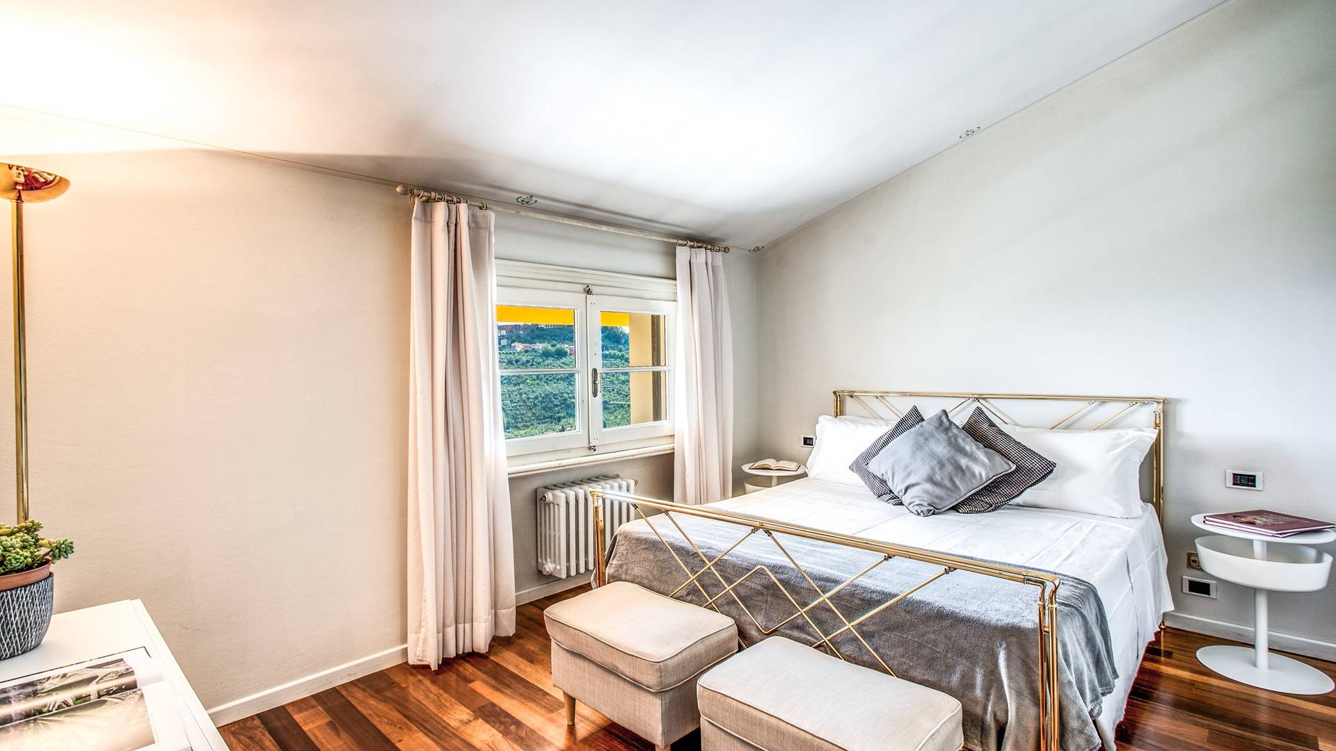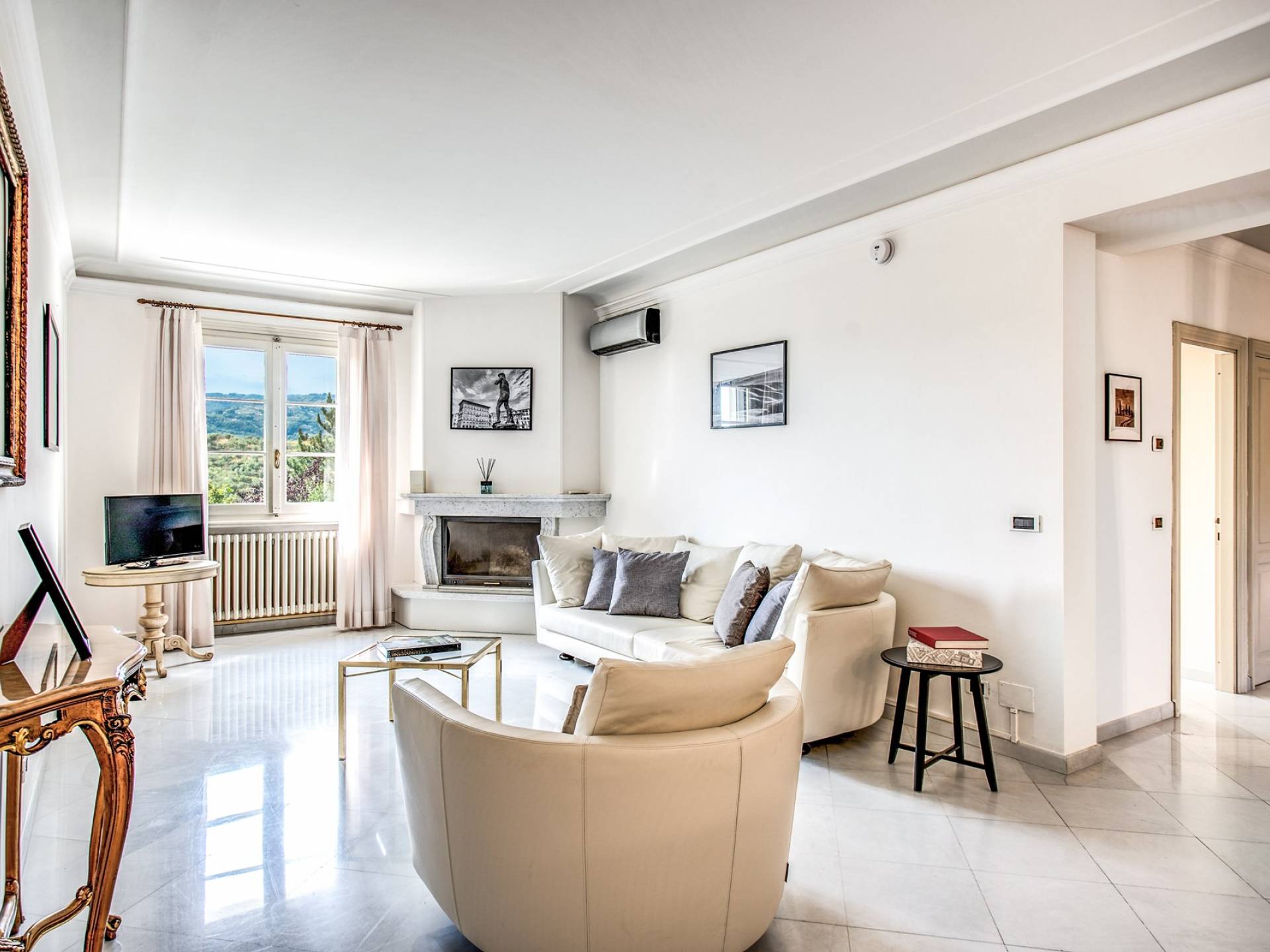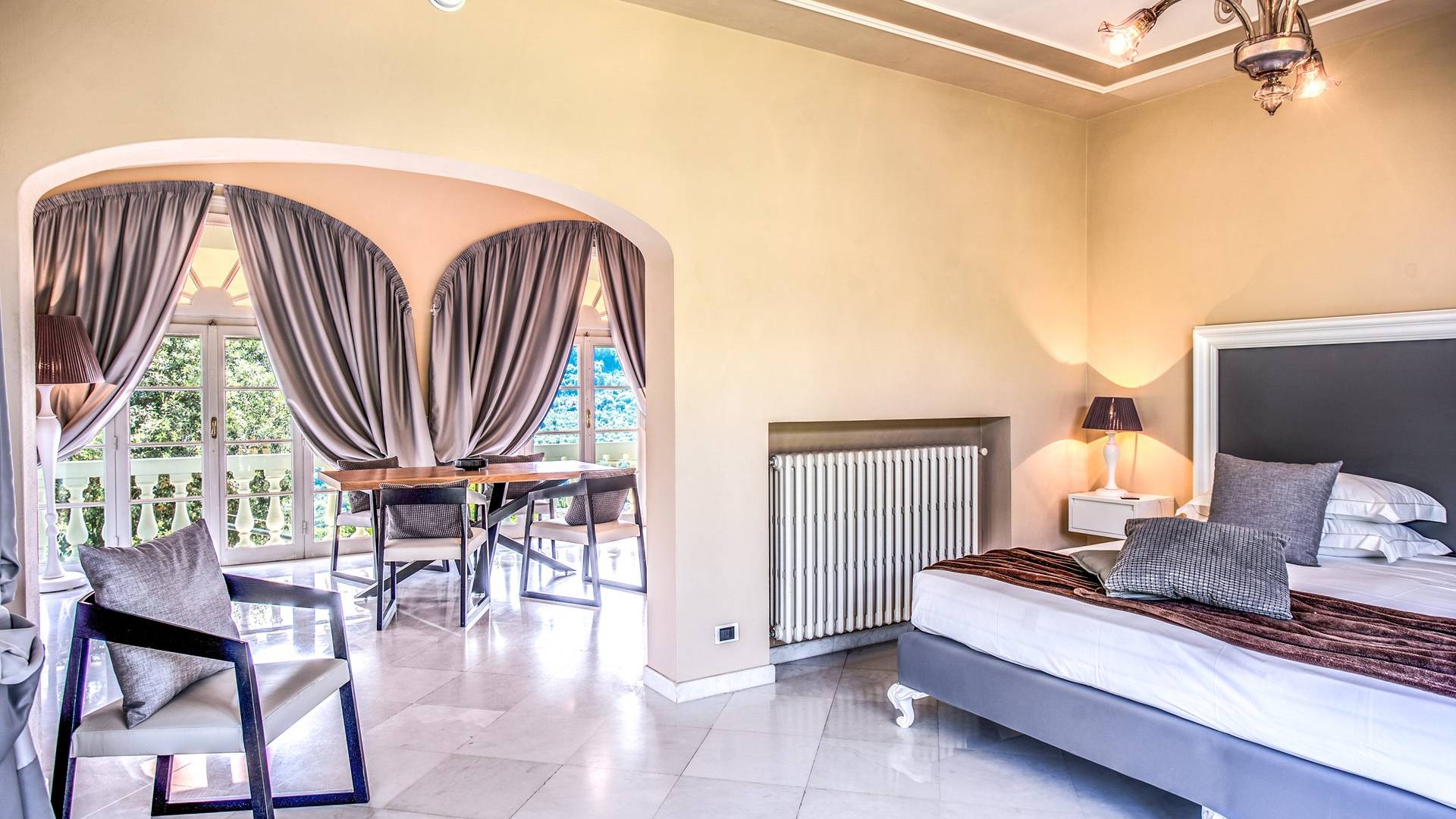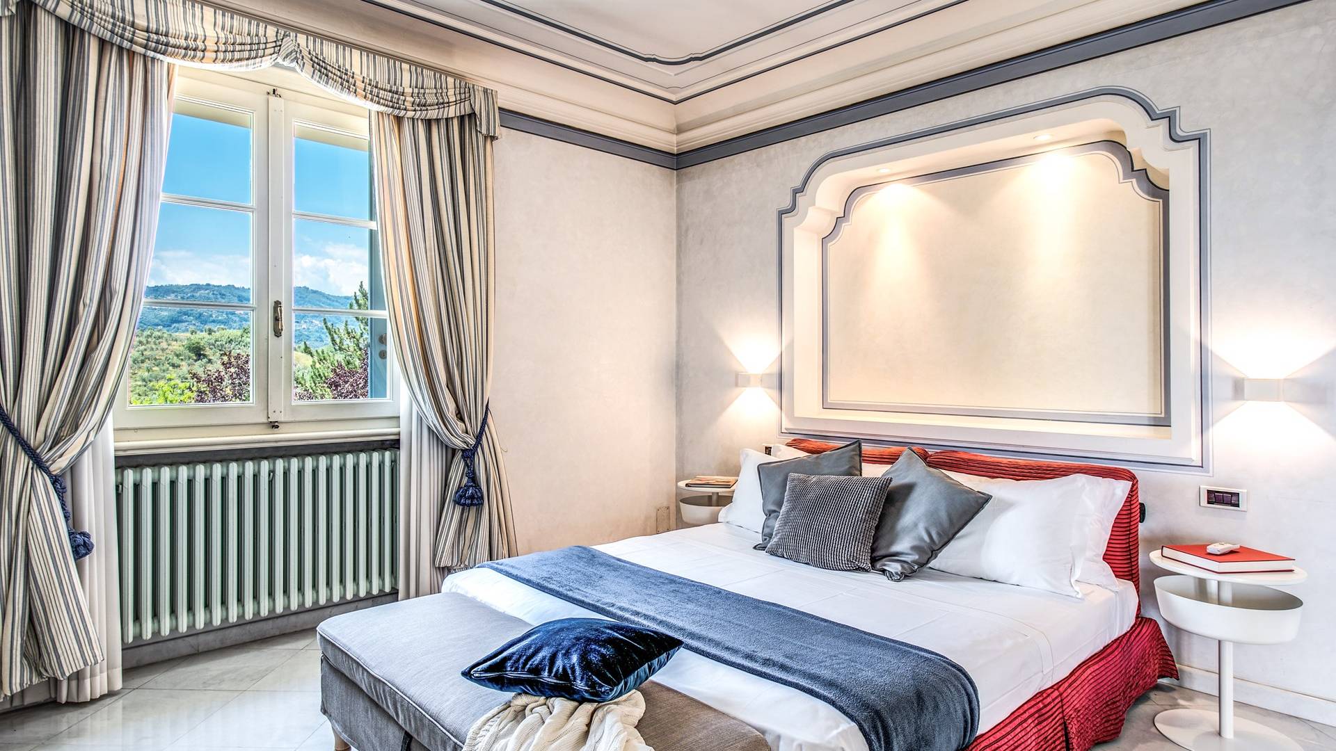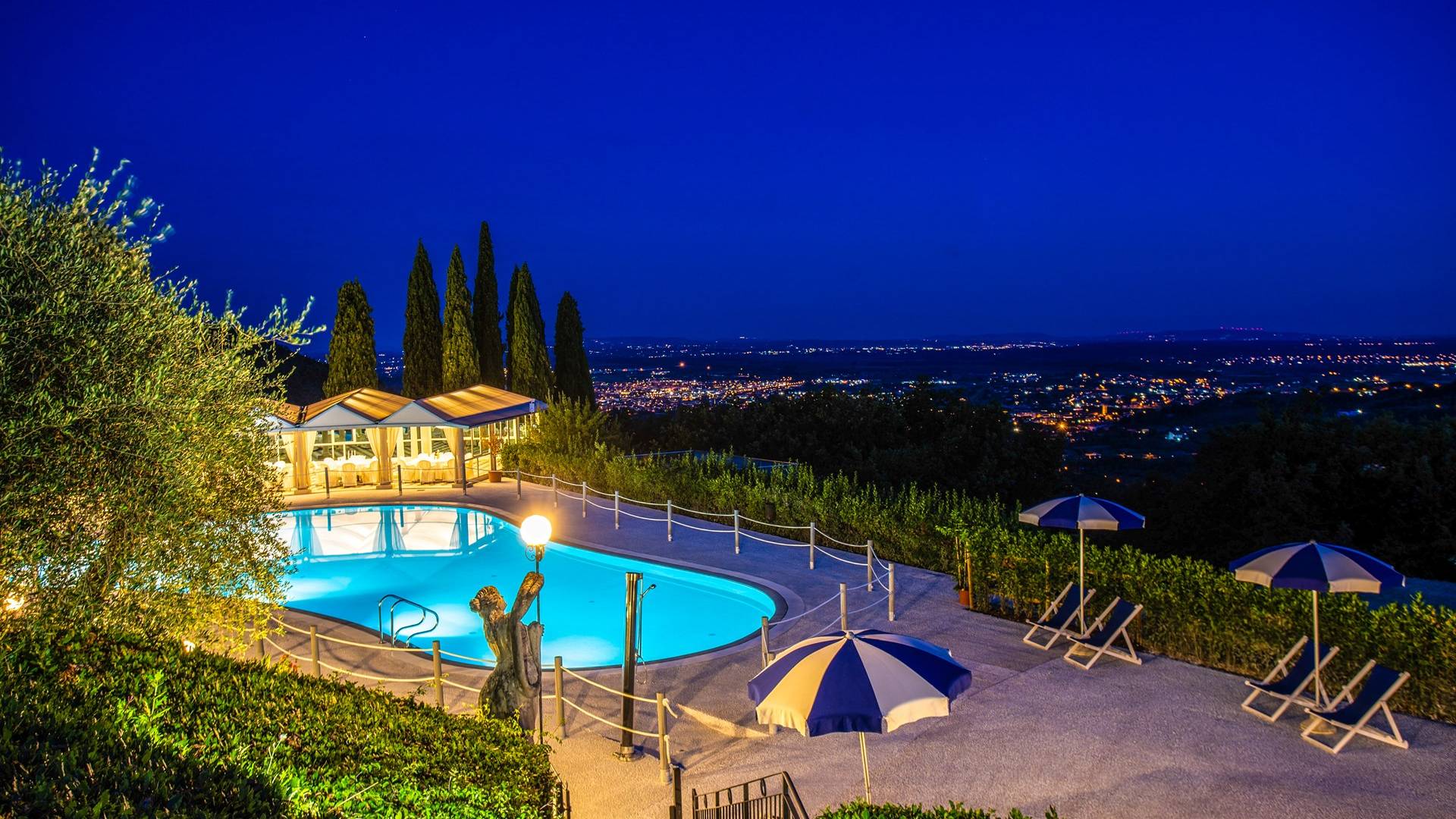 Villa Convento Tuscany is set on the highest point of the property, the three-level main house affords views of the scenic landscape from almost every angle. On the sweeping grounds, there’s a large pool, a solarium, and multiple chairs and chaise-longues for guests or to use as rentals. Hidden away, yet very close to the village of Montecatini Alto center, this estate offers six bedrooms decorated in elegant style with color-washed walls in pale shades, and contemporary fabrics, which lend a very personal touch.