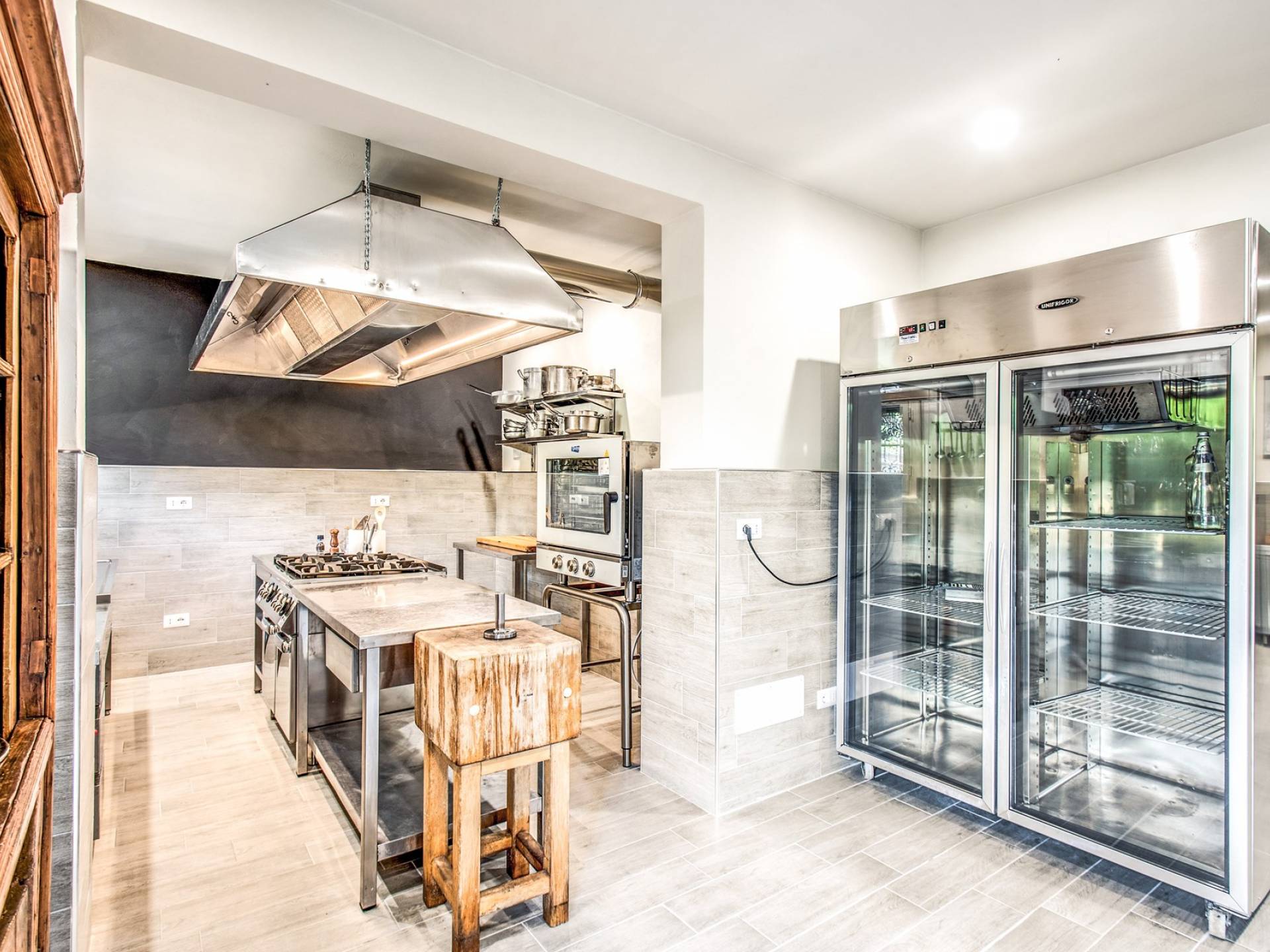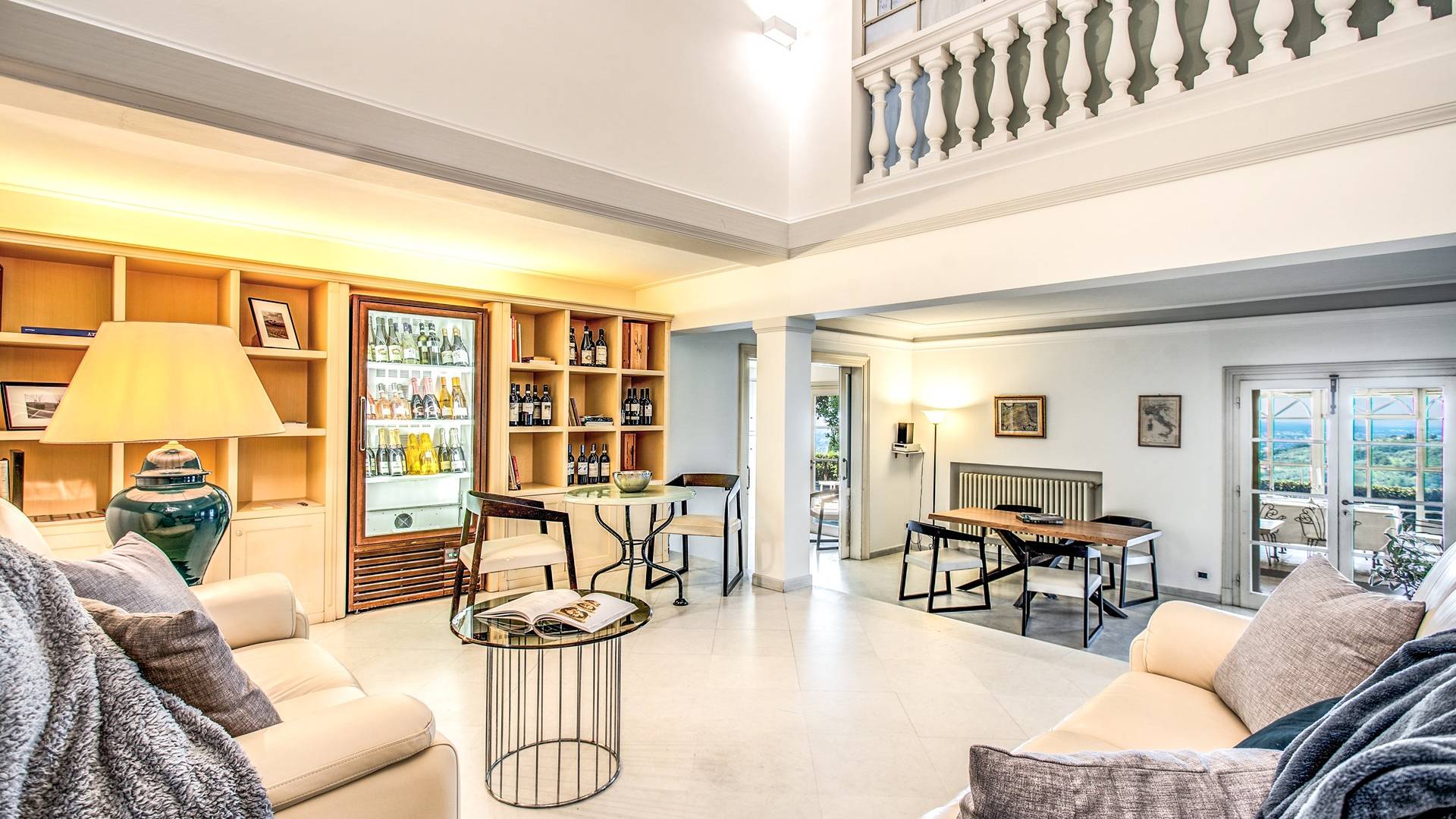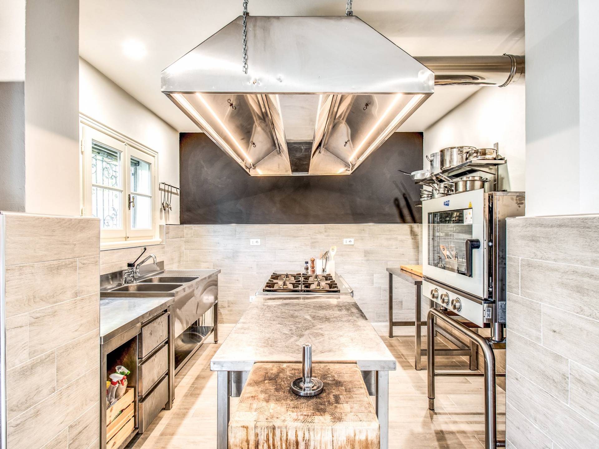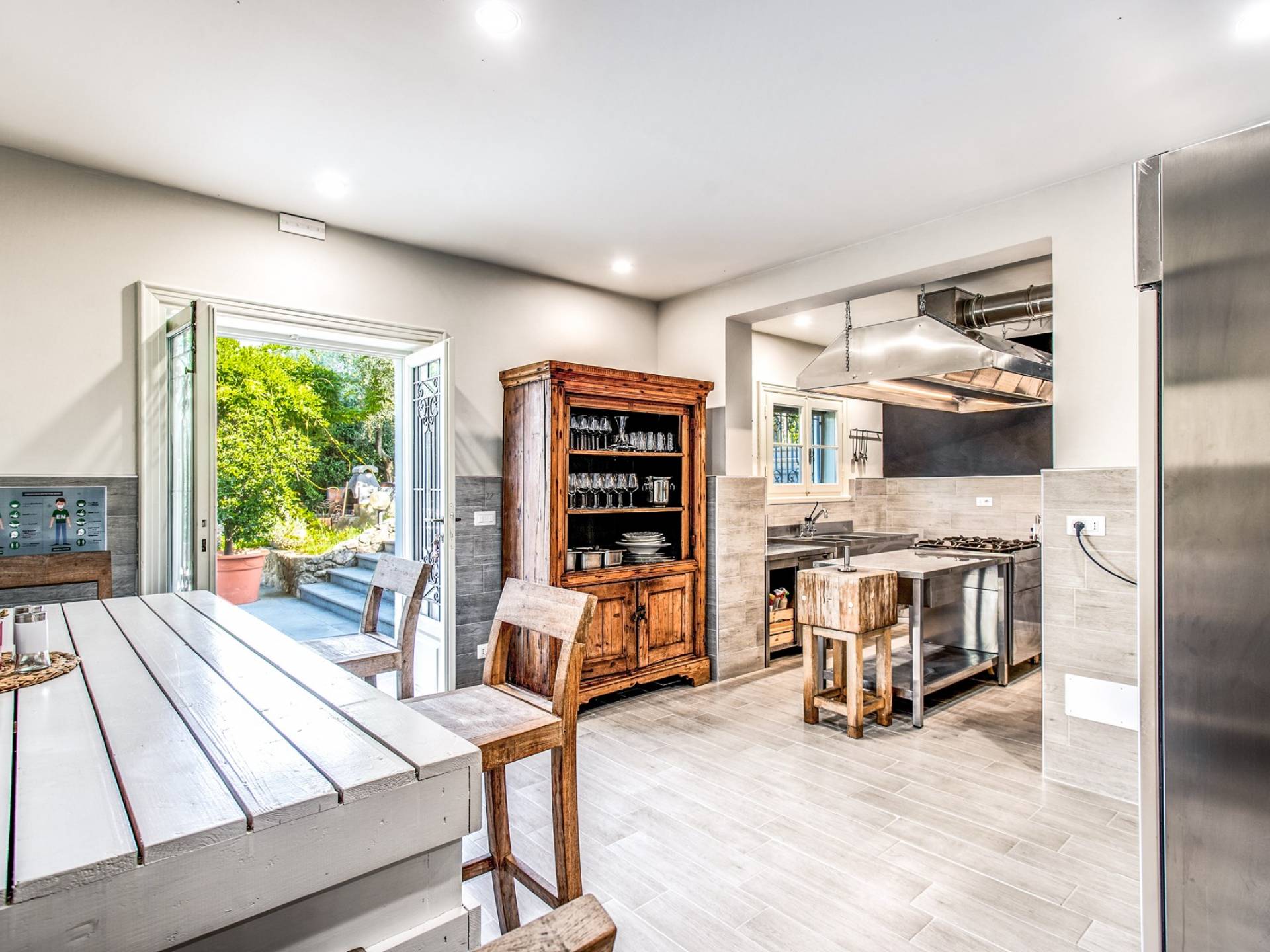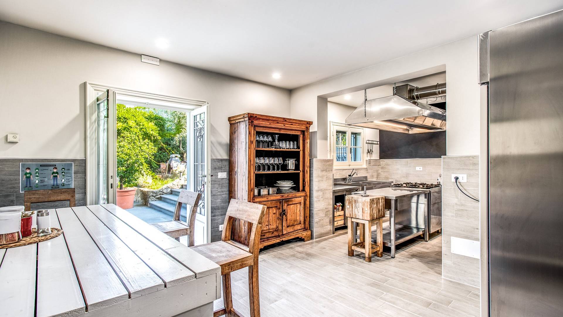 The interiors include a spacious living room, a veranda and dining area with spectacular garden vistas, and a professional kitchen that will make a perfect location for cooking classes. The home design, approached with simplicity and space for light, results in a modern style, comfortable and soothing: this is a family retreat full of light and a joyful, welcoming vibe.