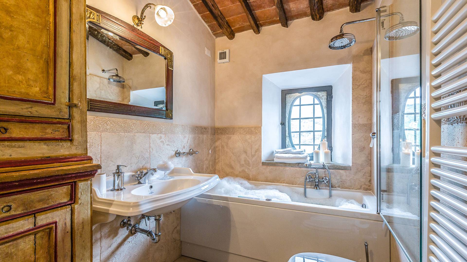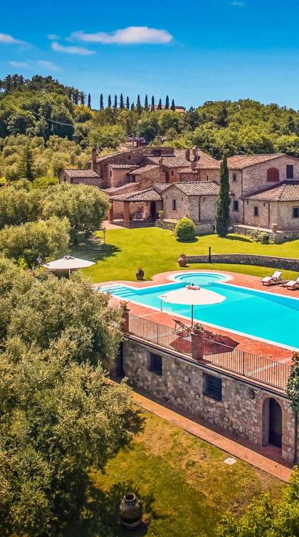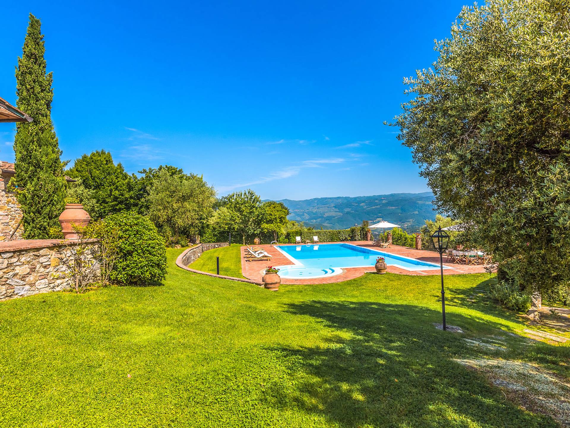 Villa dell' Angelo Tuscany consists of two floors and each room has air conditioning and central heating. On the first floor, there is a kitchen with an exit to a terrace, a dining room, a living room, a laundry room, a bathroom, and a bedroom with its own exit to a terrace. A beautiful stone staircase leads up to the second floor where you will find three bedrooms and two bathrooms. In the beautiful garden, there are a number of terraces and furnished patios where guests can enjoy Italian meals. A few steps below the house is a pool terrace with outstanding views of the surrounding countryside. There is a 16x8 m. pool with an attached whirlpool, sun loungers, and parasols.