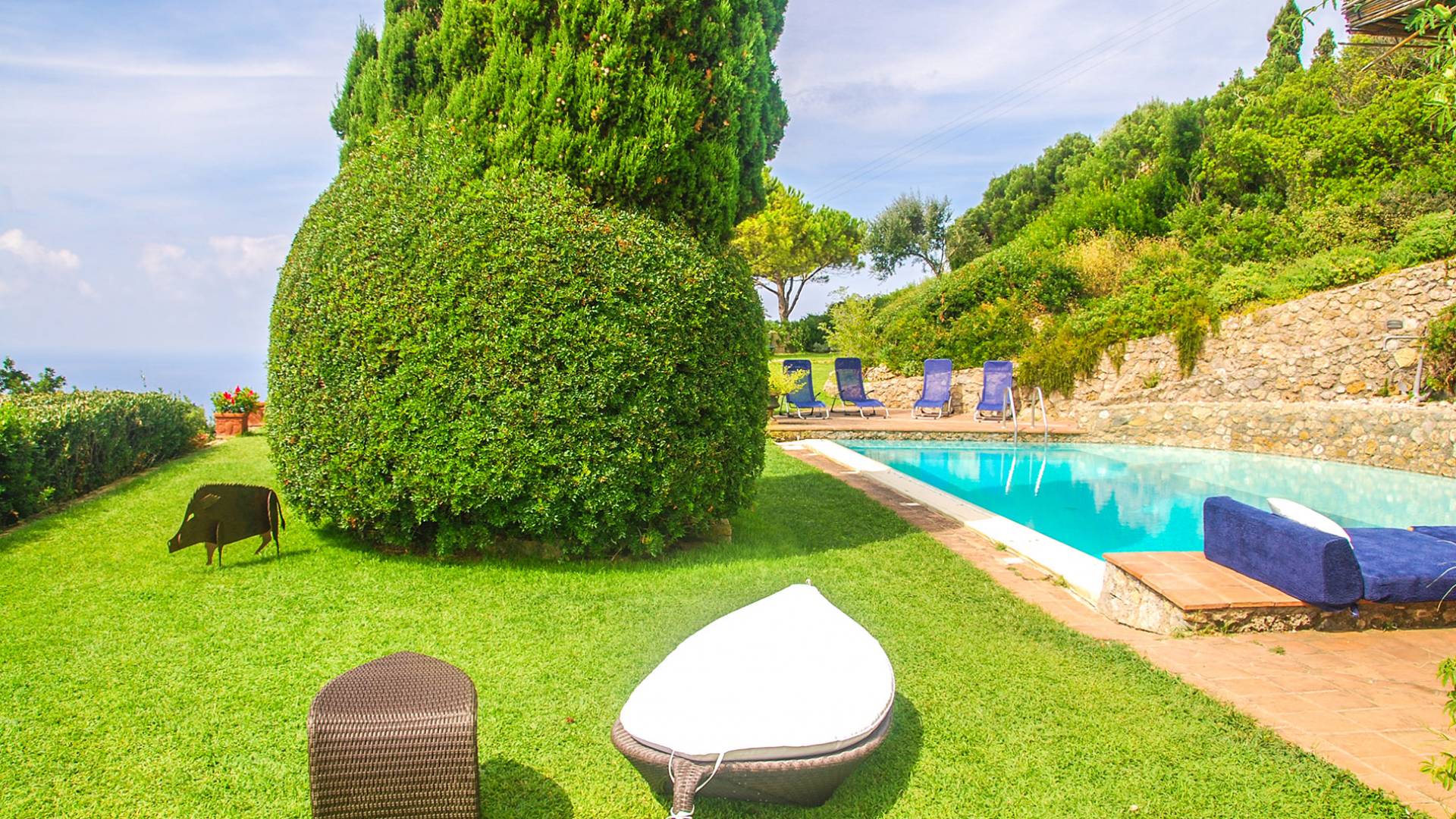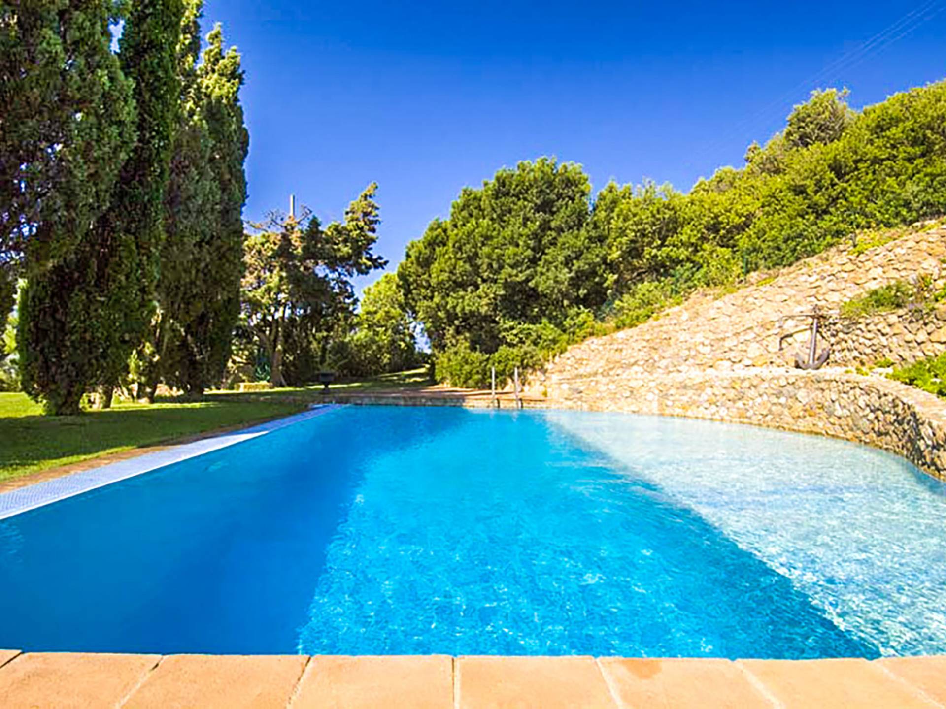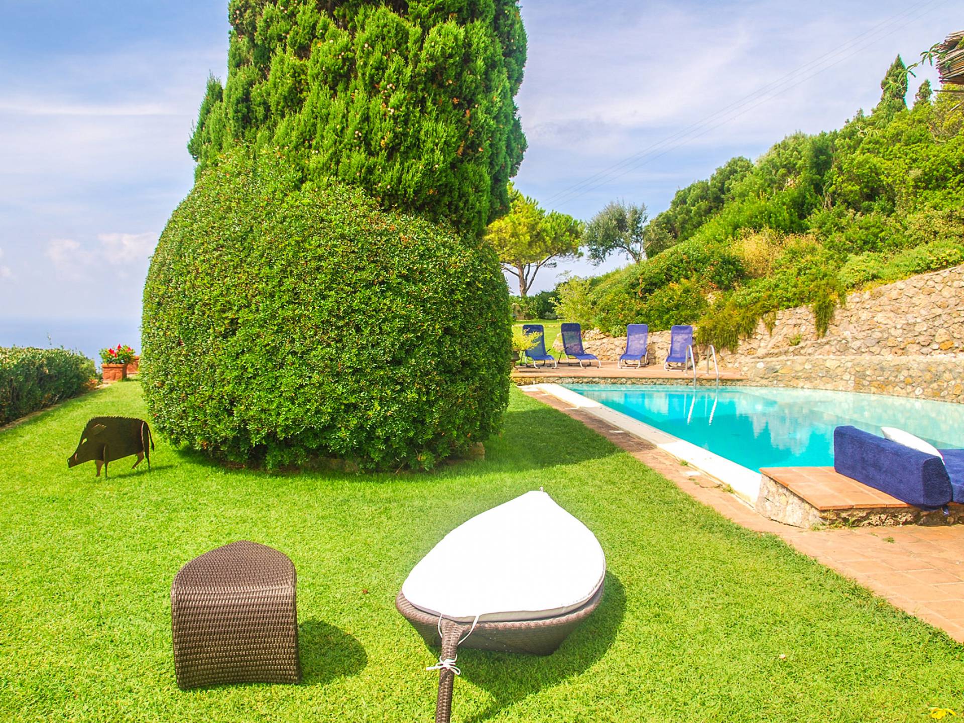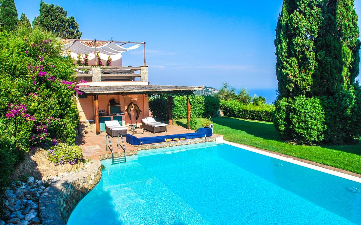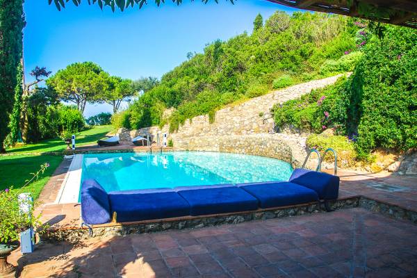 Many reasons have urged travellers to visit this splendid resort during the course of time: the crystal clear sea, of course, the toxic scent of the Mediterranean maquis and the quiet snobbery of this location off the beaten path. However, it is the overall bohemian, chic atmosphere that still today leads discerning travellers, painters, poets and artists to this very place. The villa accommodates up to ten adults and two children in six double bedrooms and five bathrooms, although is at its best when used for ten. It is set in six hectares of extensive lawns and enjoys panoramic views of the Mediterranean, with the islands of Giannutri and Giglio in the distance and of the romantic, wild and rugged coastline.