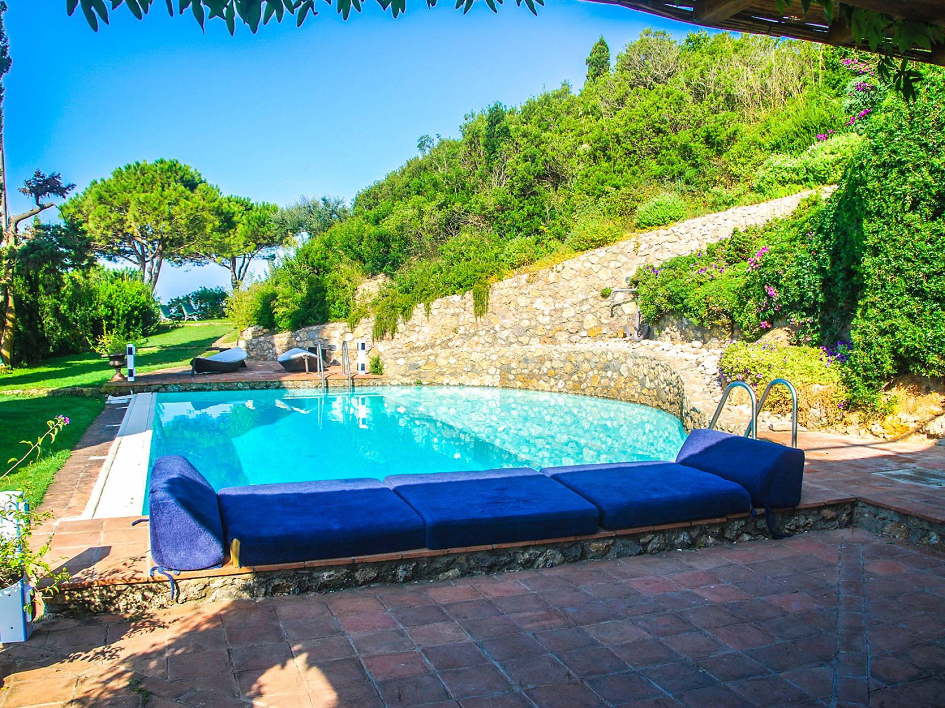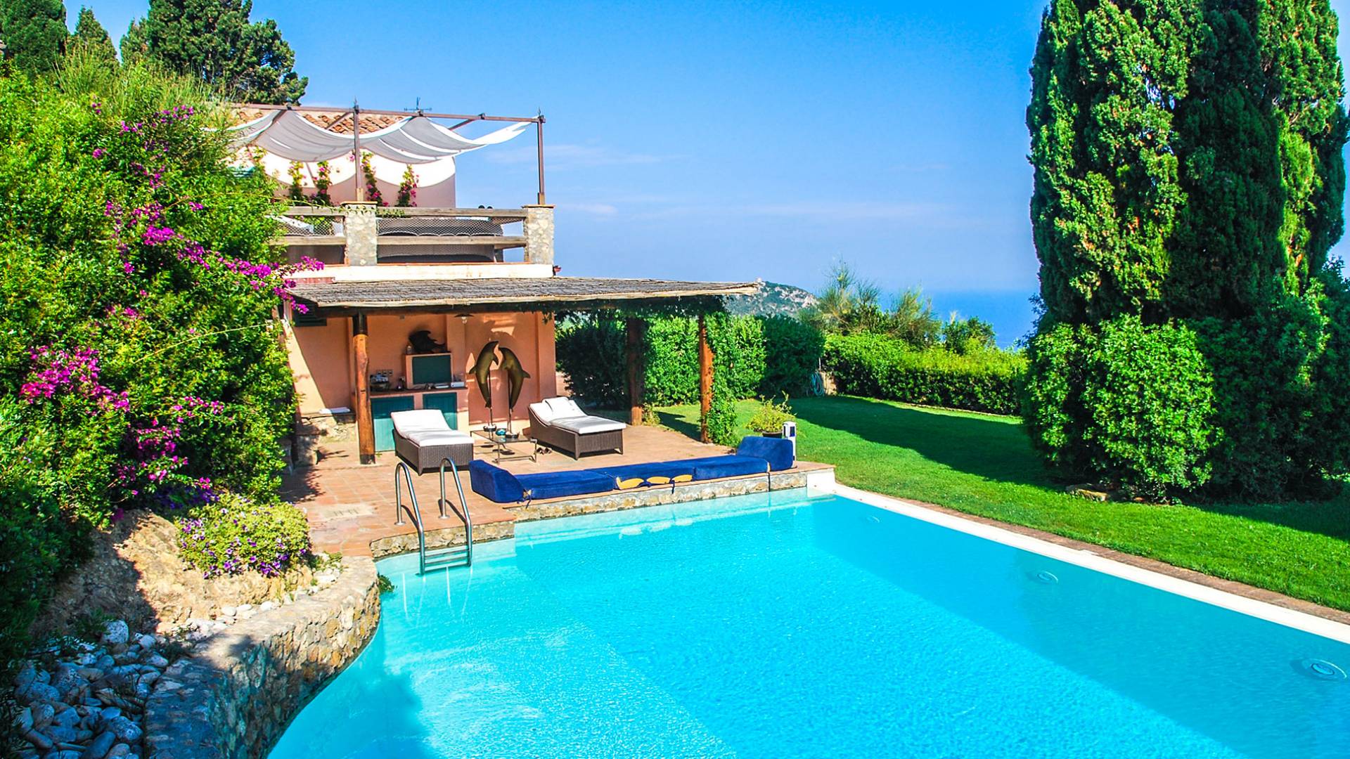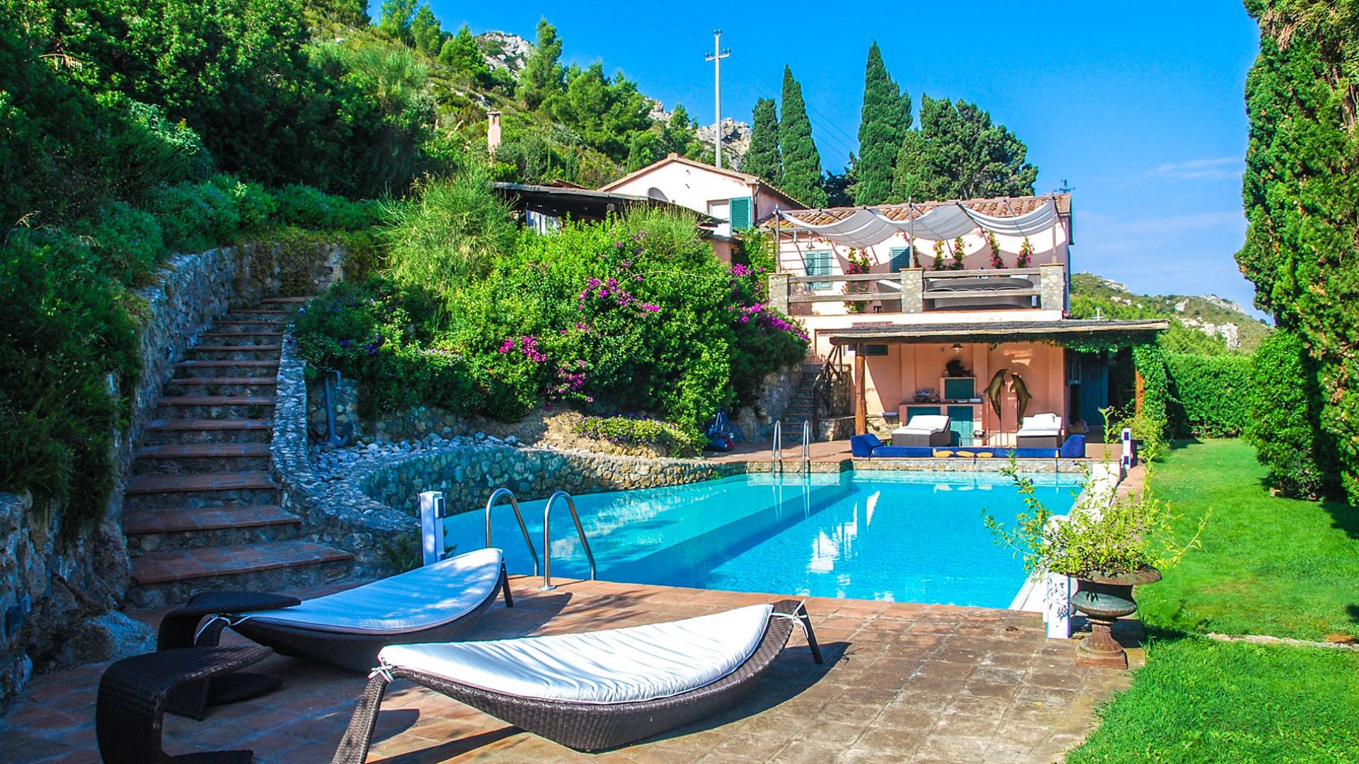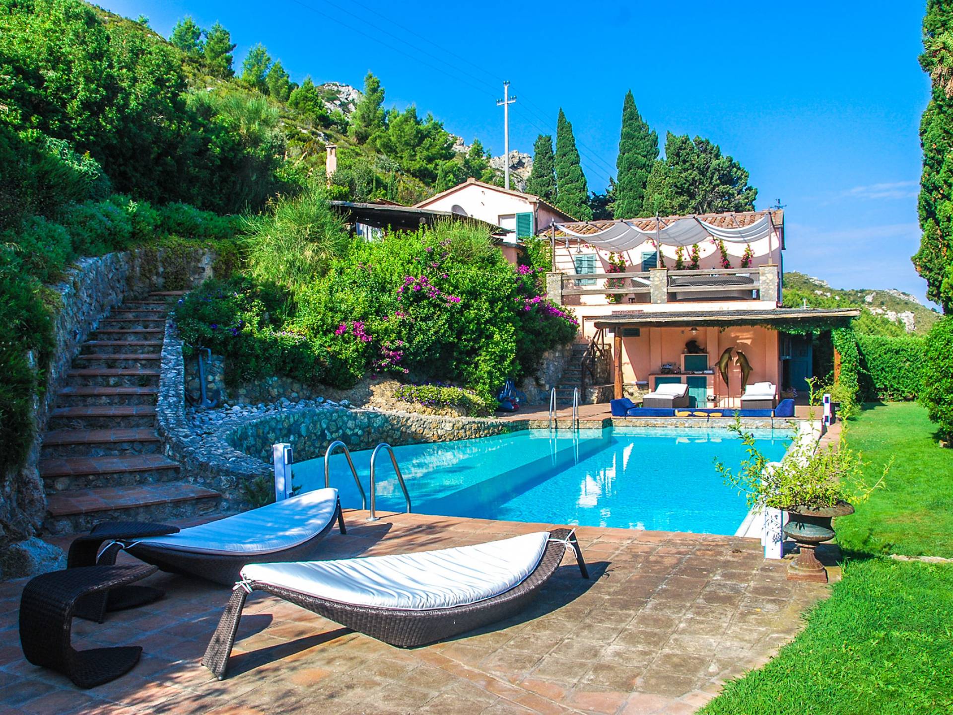 Built in typical Mediterranean style, Villa Gatto Tuscany is set on a rocky cliff climbing down to the beach with a breath-taking view, surrounded by a terraced garden with several outdoor nooks and crannies for quiet sunbathing and reading, and a swimming pool (14 by 6 metres) with a shallow paddling end, together with a large sunbathing terrace as well as a partly shaded area.