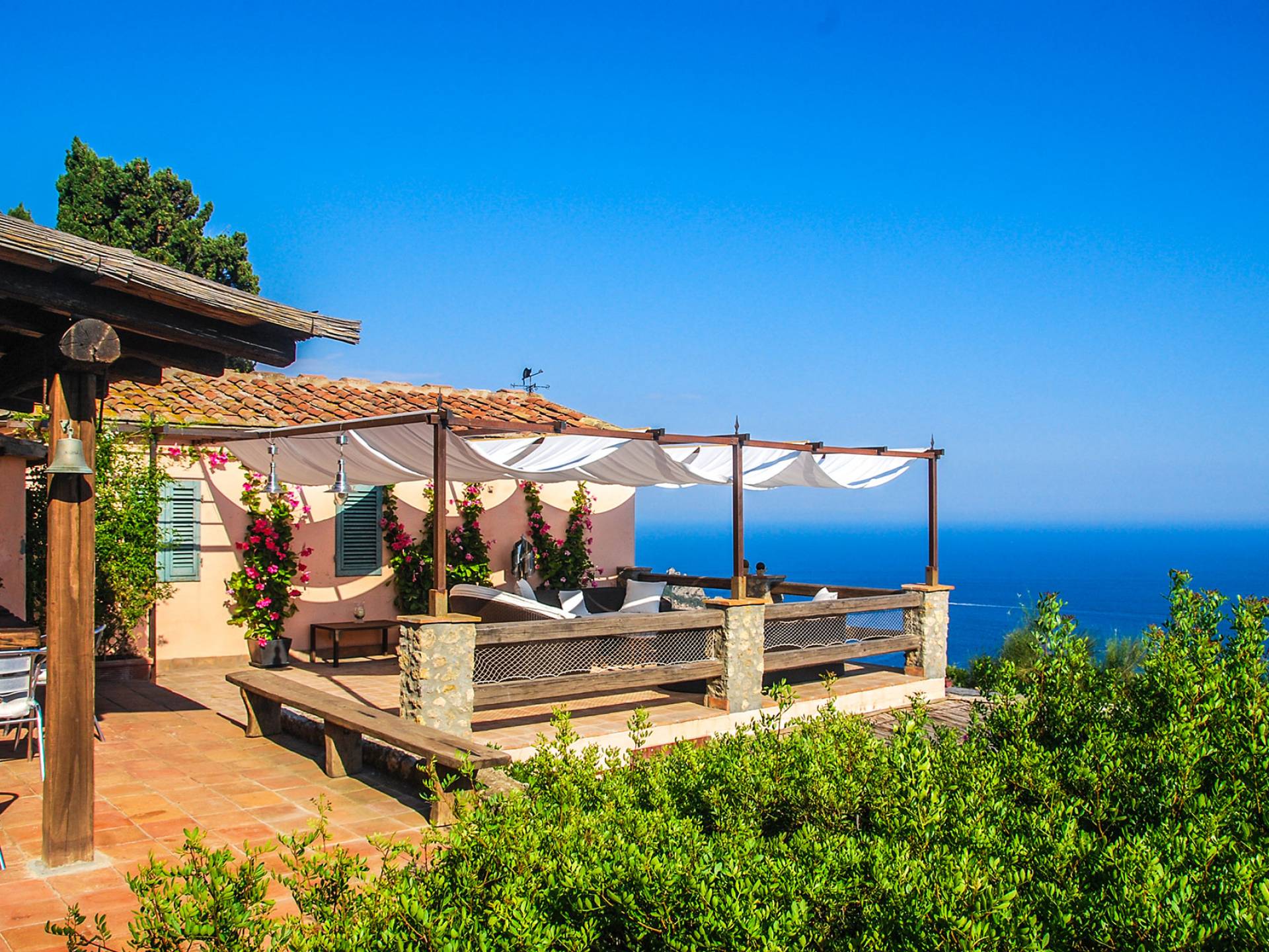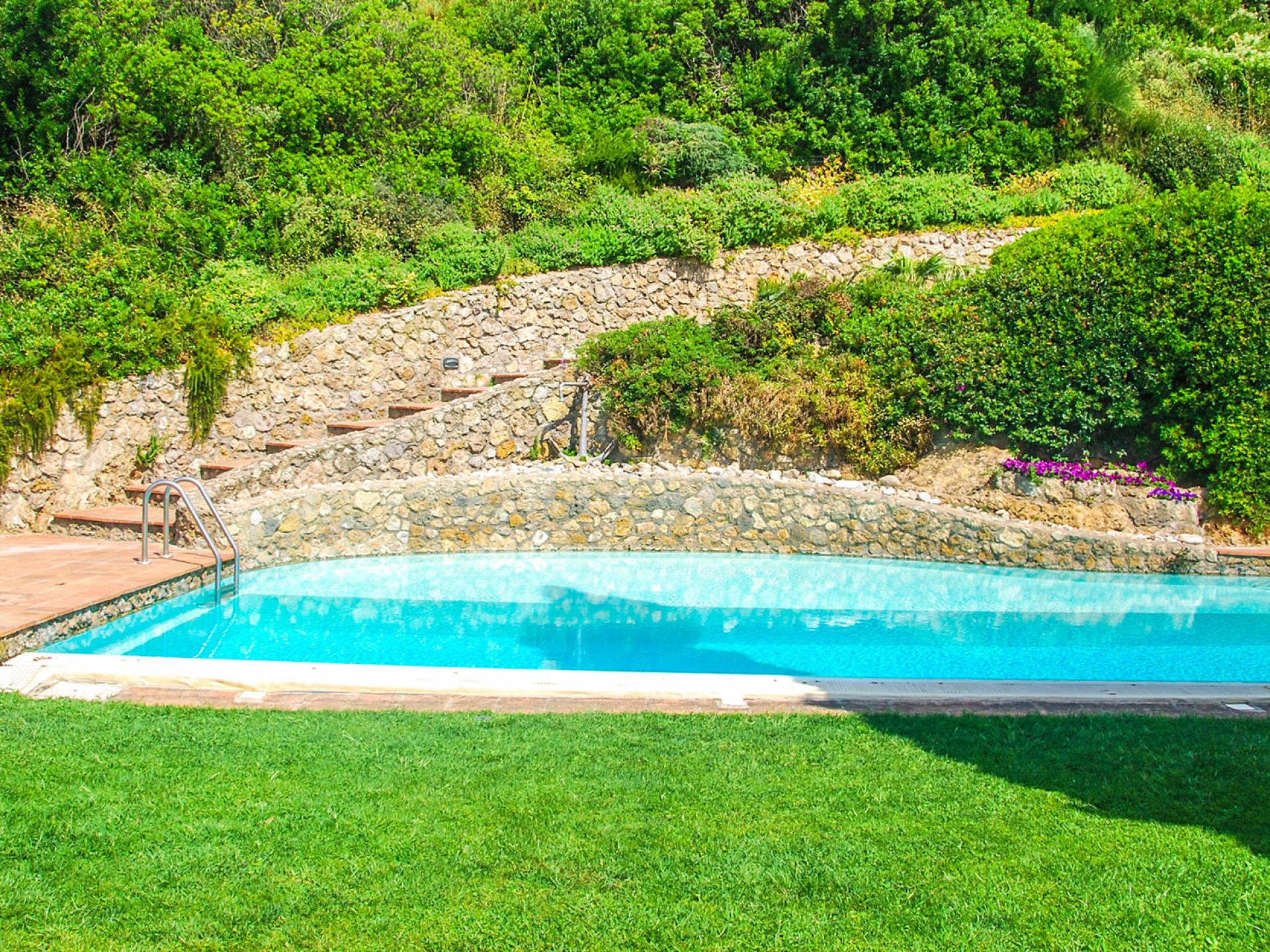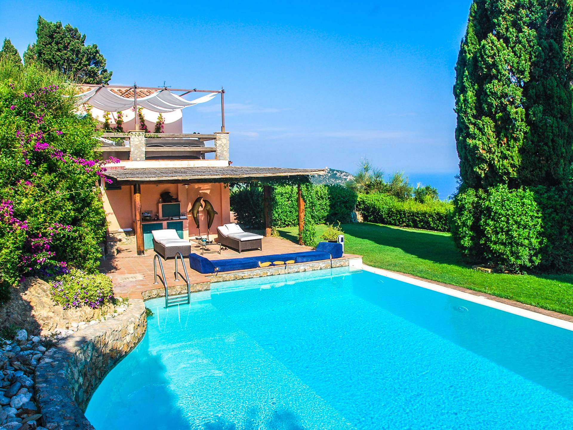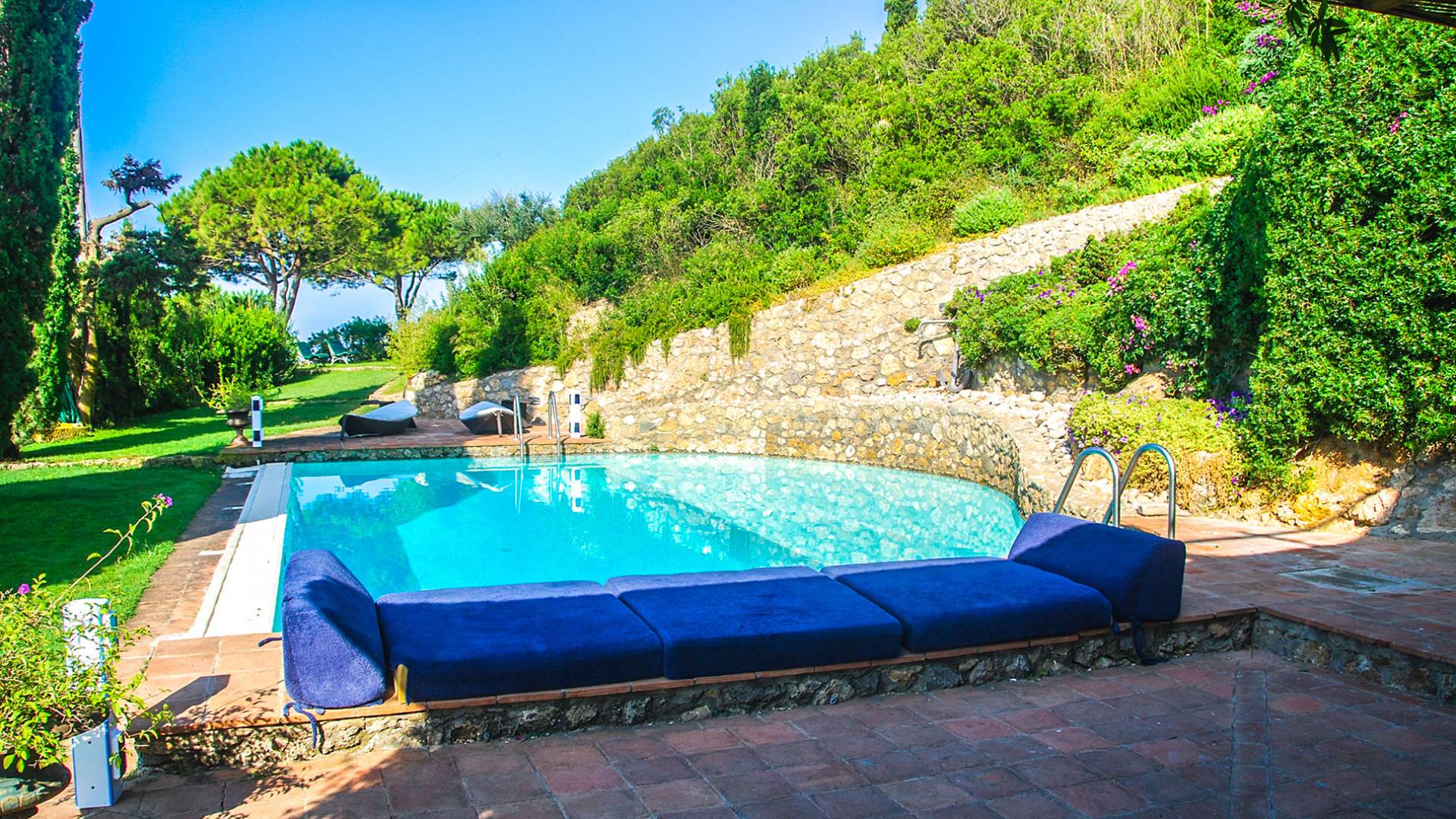 Built in typical Mediterranean style, Villa Gatto Tuscany is set on a rocky cliff climbing down to the beach with a breath-taking view, surrounded by a terraced garden with several outdoor nooks and crannies for quiet sunbathing and reading, and a swimming pool (14 by 6 metres) with a shallow paddling end, together with a large sunbathing terrace as well as a partly shaded area.