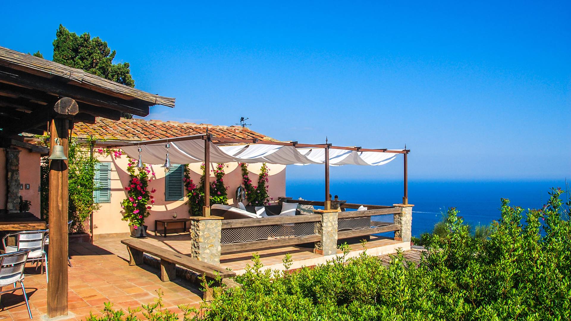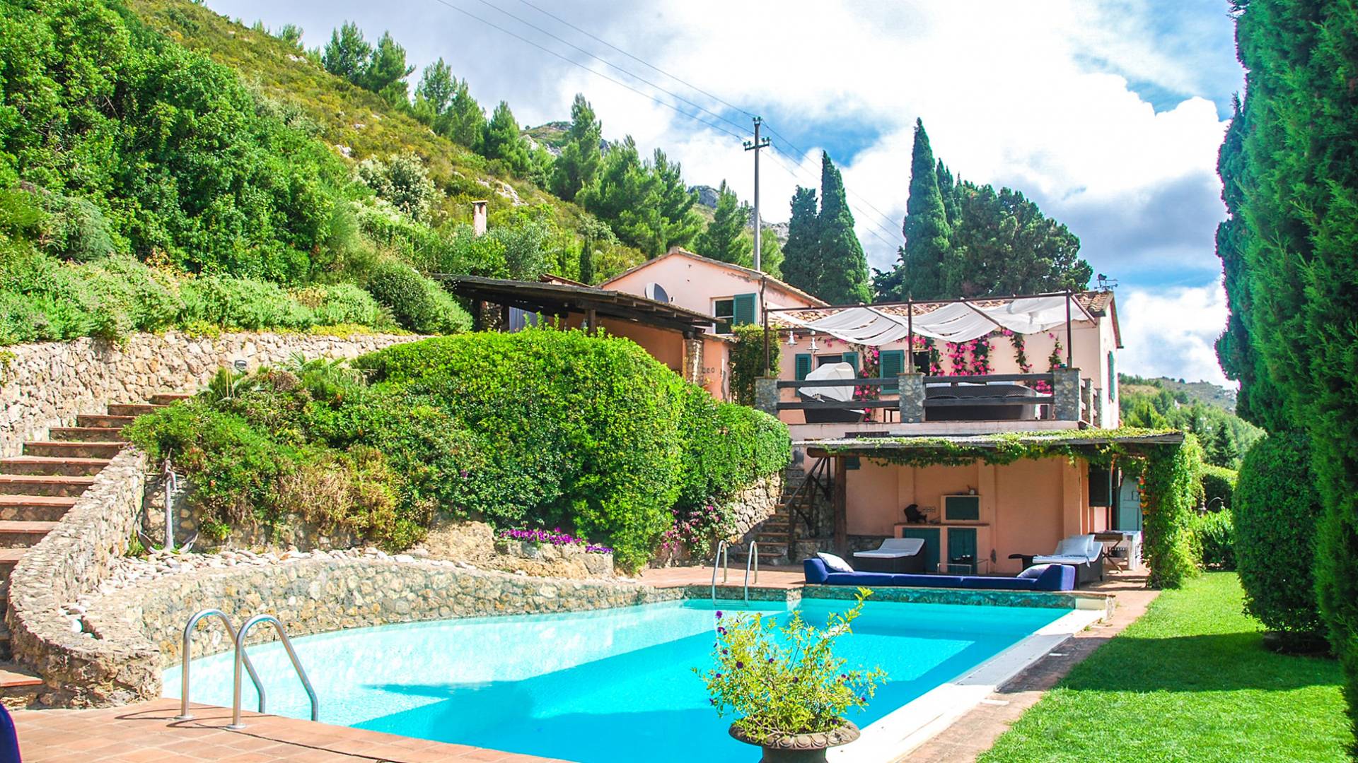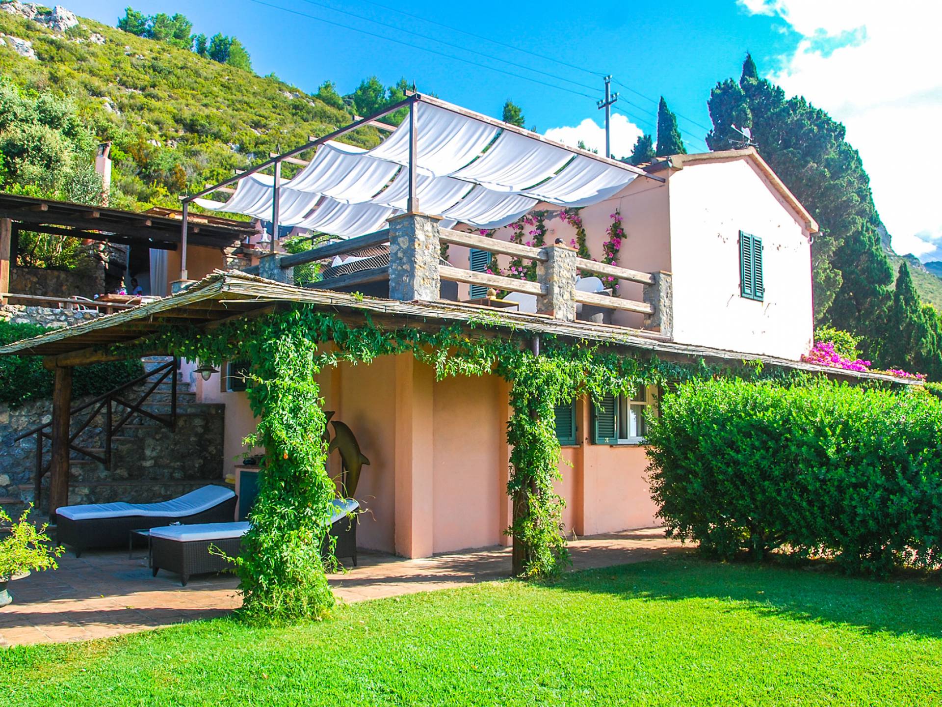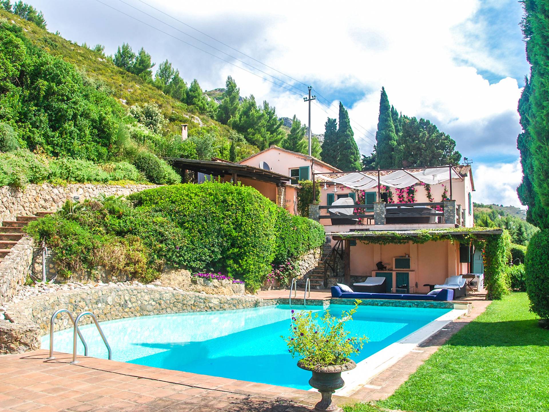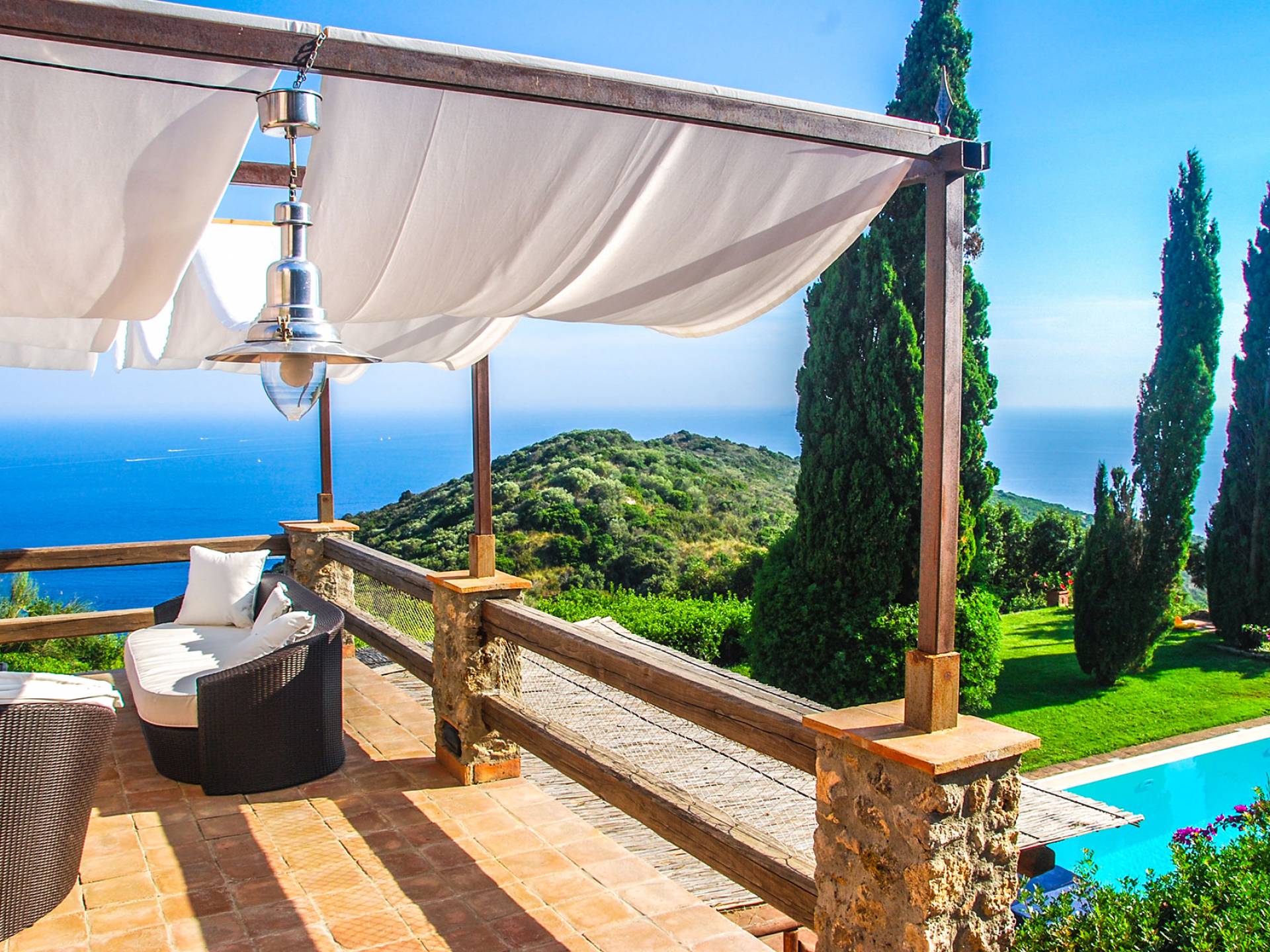 Built in typical Mediterranean style, Villa Gatto Tuscany is set on a rocky cliff climbing down to the beach with a breath-taking view, surrounded by a terraced garden with several outdoor nooks and crannies for quiet sunbathing and reading, and a swimming pool (14 by 6 metres) with a shallow paddling end, together with a large sunbathing terrace as well as a partly shaded area.