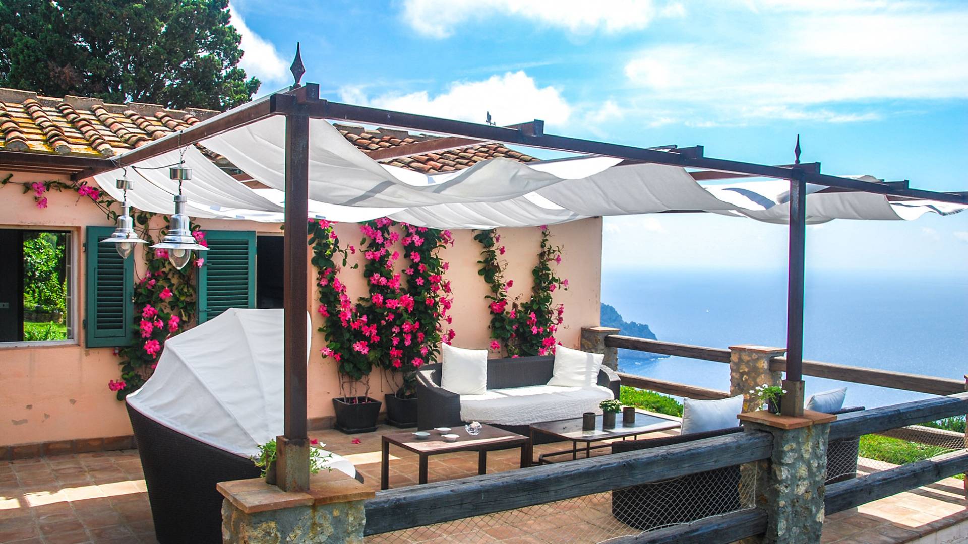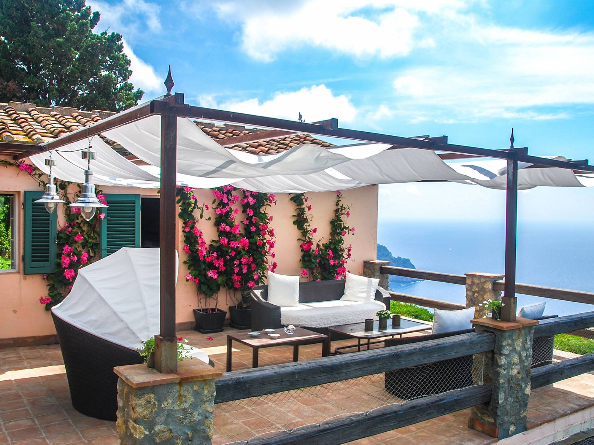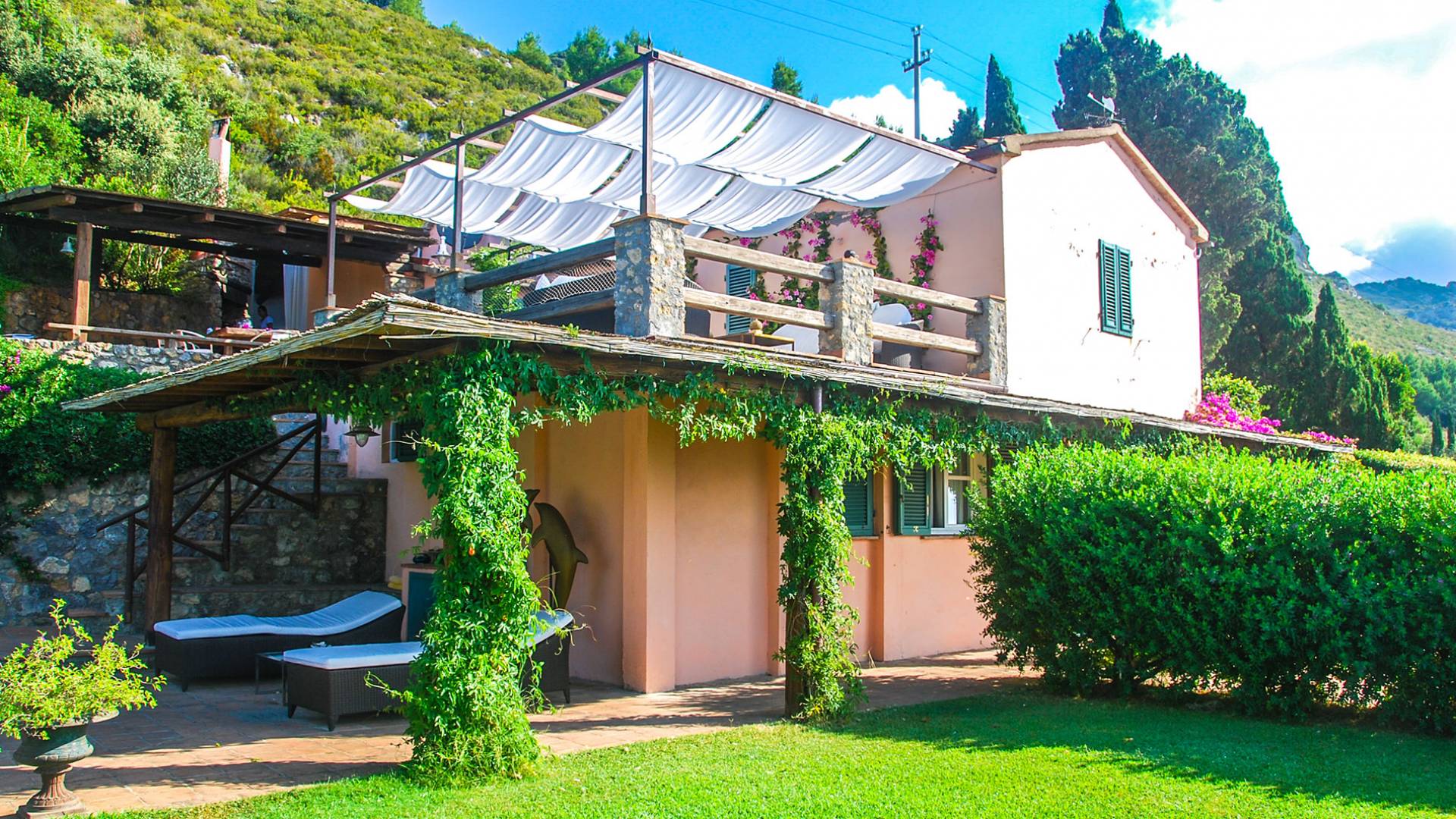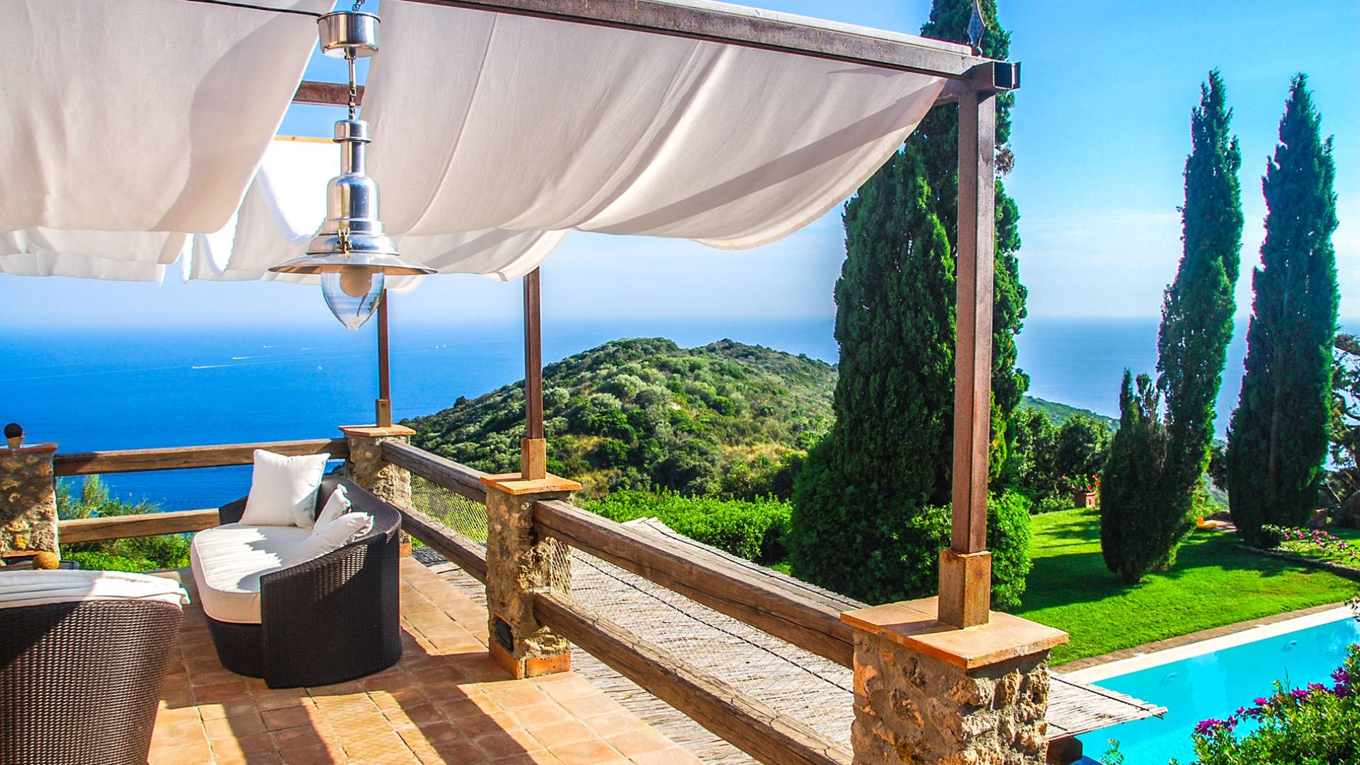 Built in typical Mediterranean style, Villa Gatto Tuscany is set on a rocky cliff climbing down to the beach with a breath-taking view, surrounded by a terraced garden with several outdoor nooks and crannies for quiet sunbathing and reading, and a swimming pool (14 by 6 metres) with a shallow paddling end, together with a large sunbathing terrace as well as a partly shaded area.