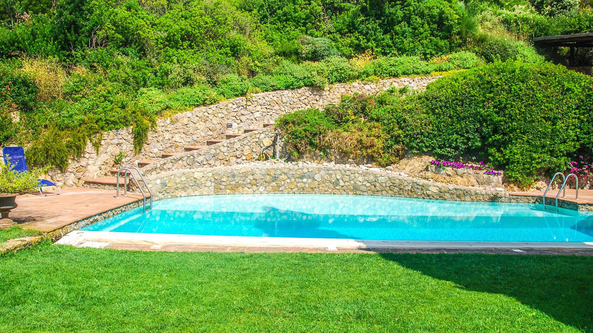 Up some steps from the pool there is a spacious covered loggia with a barbecue and table seating up to twelve people, which enjoys lovely views: the seaside and the stunning colours all around gel together and the result is simply unique. The estate sits in fact in one of the most fascinating and uncontaminated areas of Italy, a protected marine area very close to Porto Ercole called ‘Sbarcatello’.