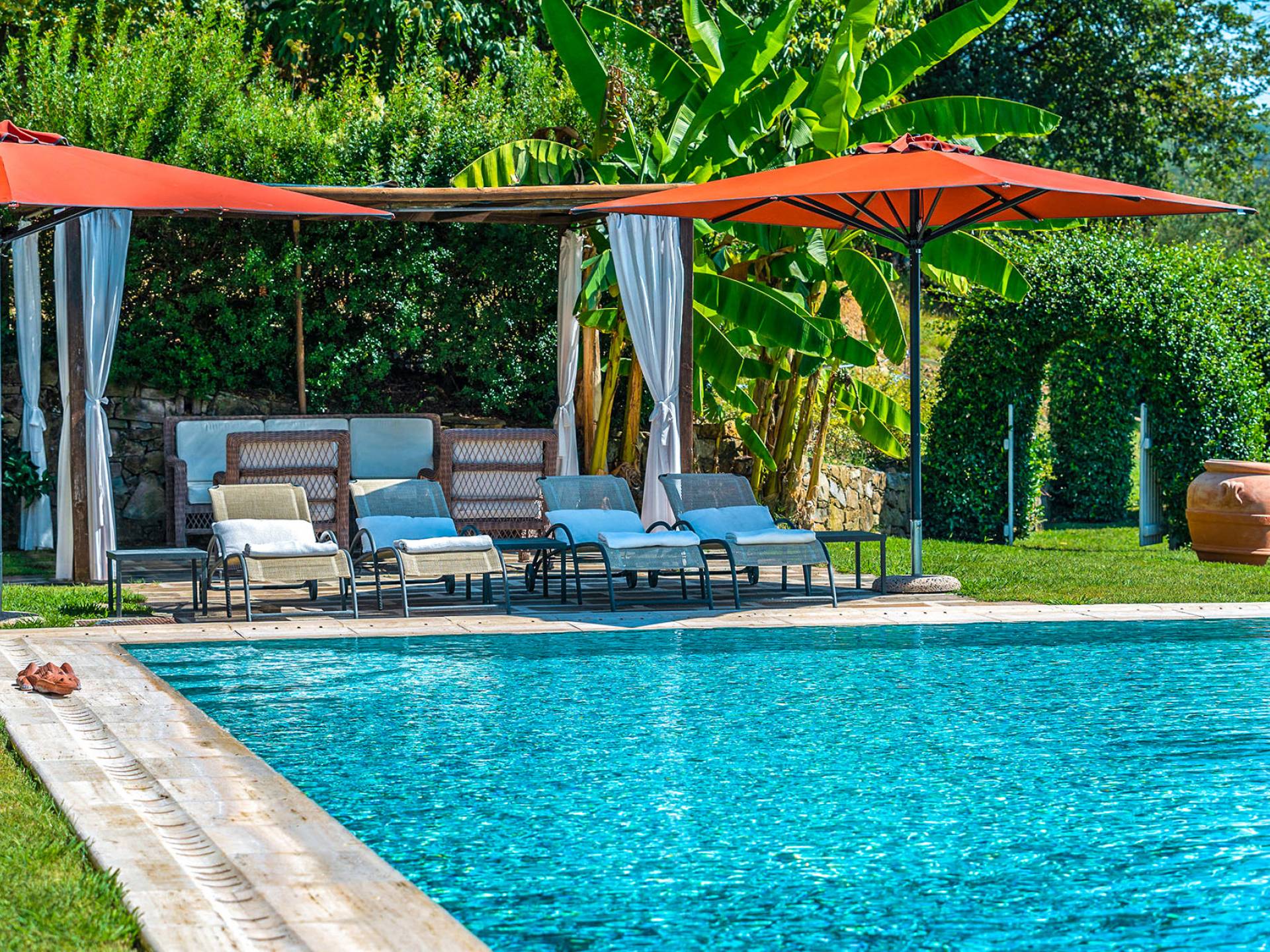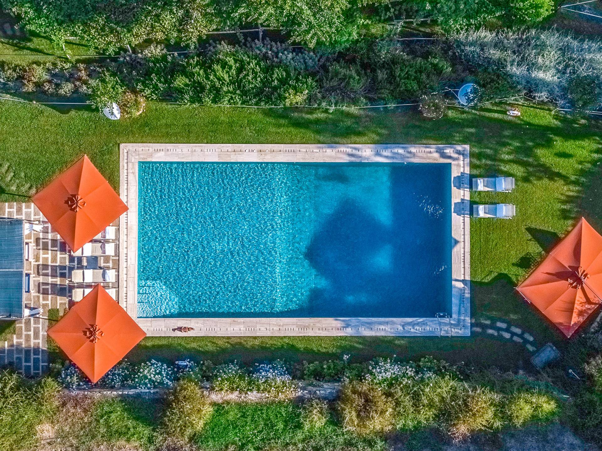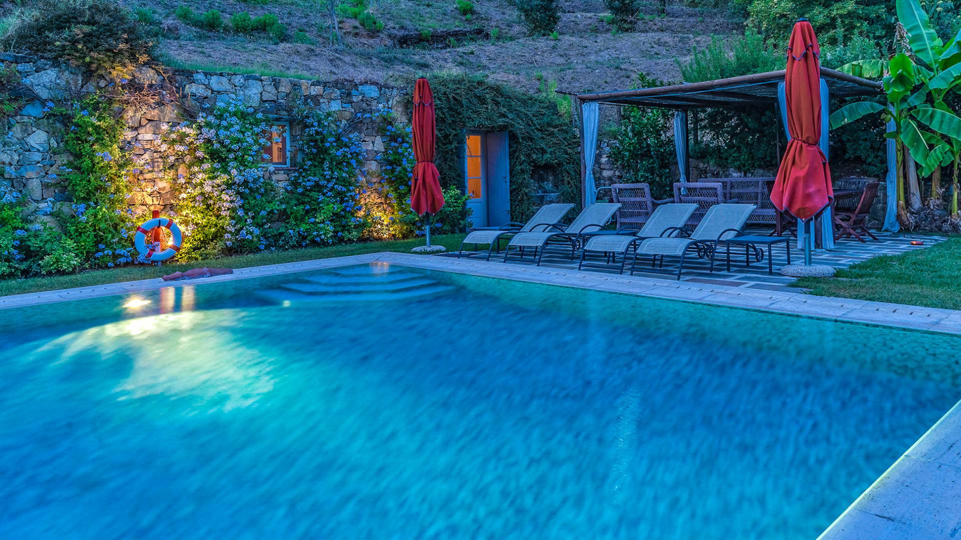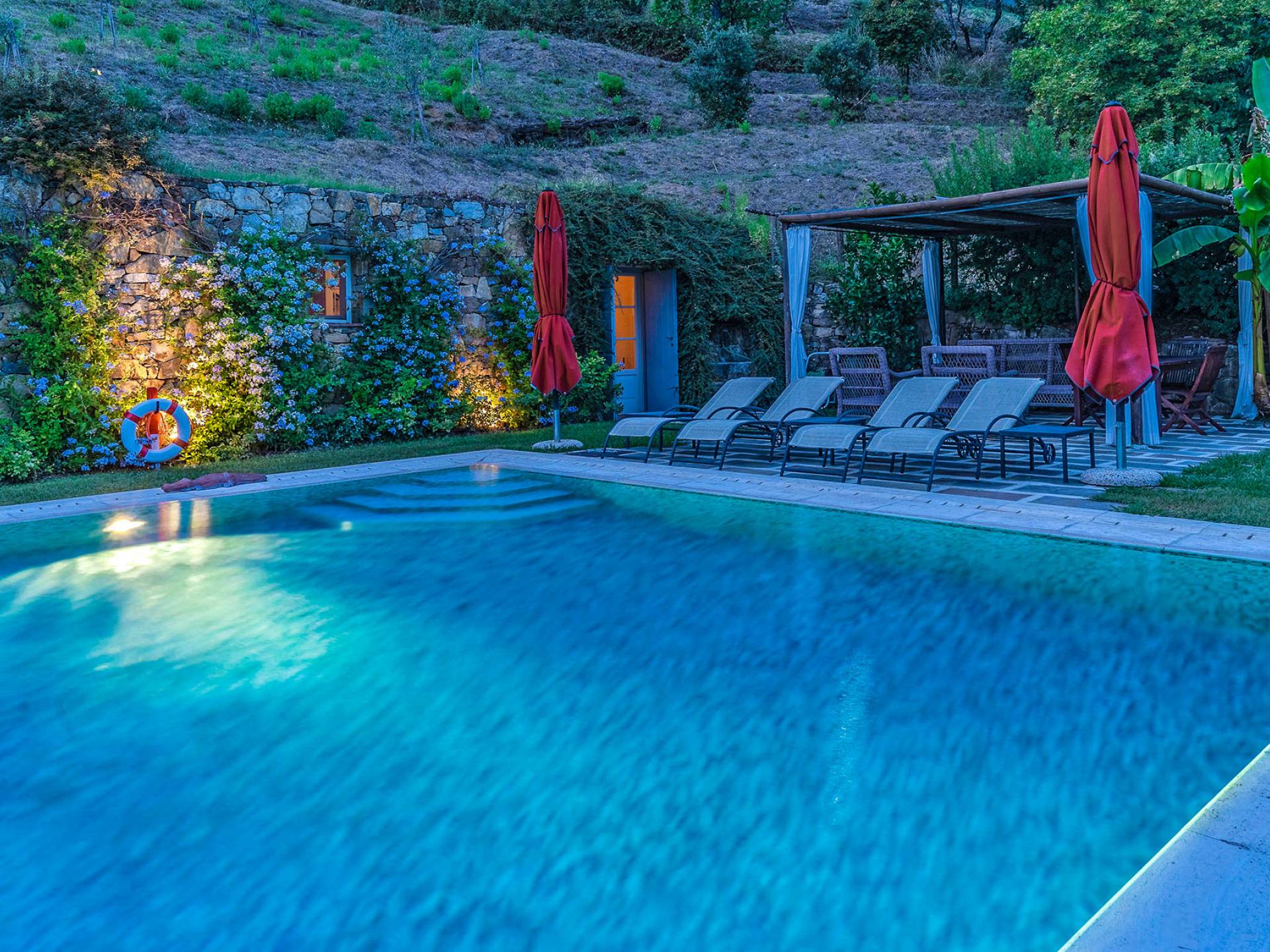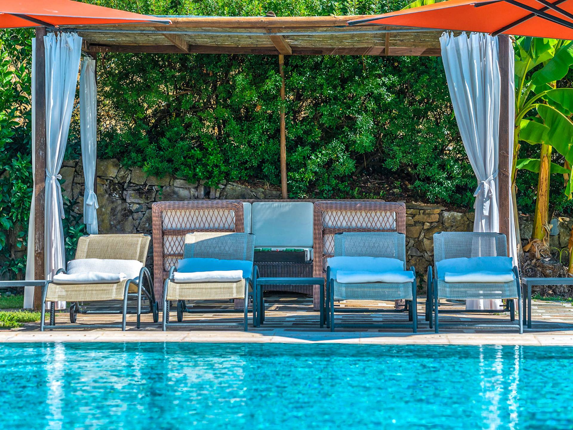 The swimming pool 7x14 (from 1mt approximately in the lower part to 2,5 mt in the deeper part) is large and well-equipped with all the necessary amenities for relaxing or sunbathing poolside. An additional gazebo provides a covered area where one can enjoy cool summer breezes. A small nearby annex serves as a changing room and is also equipped with a bathroom, shower, refrigerator, and two single beds.