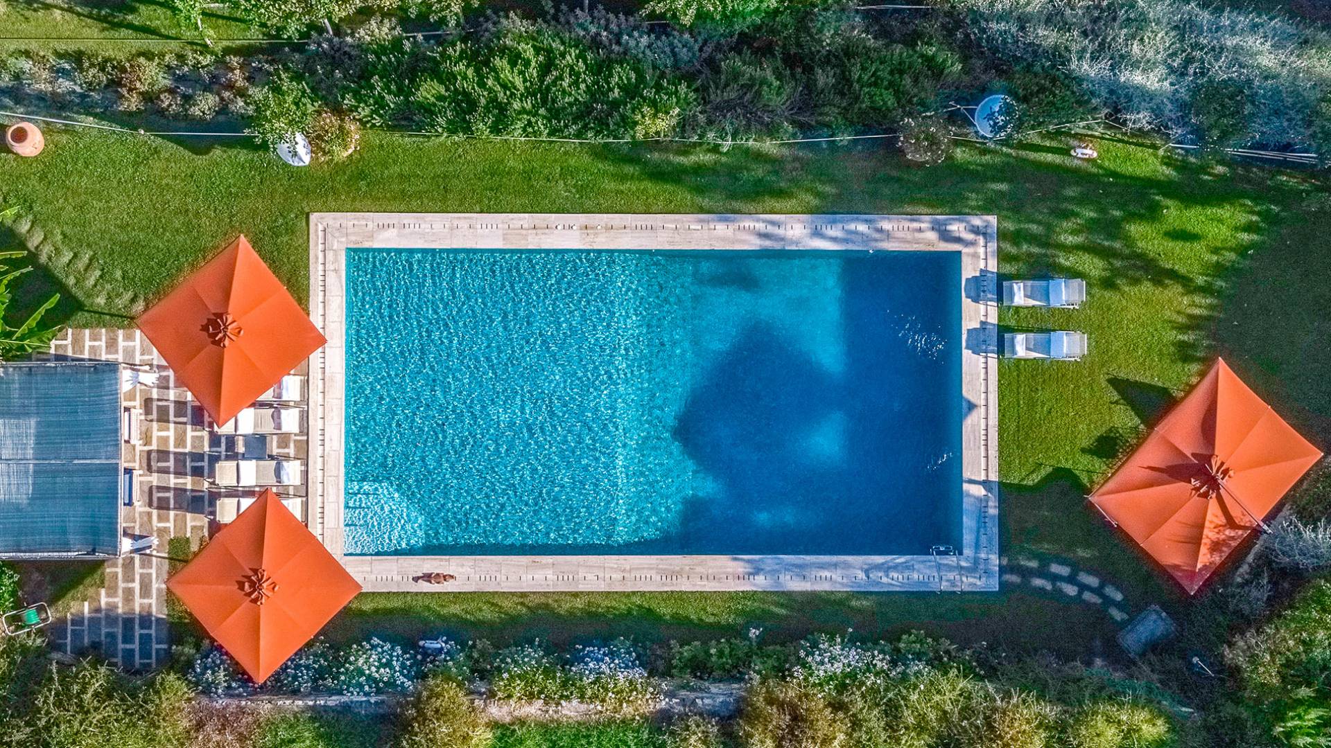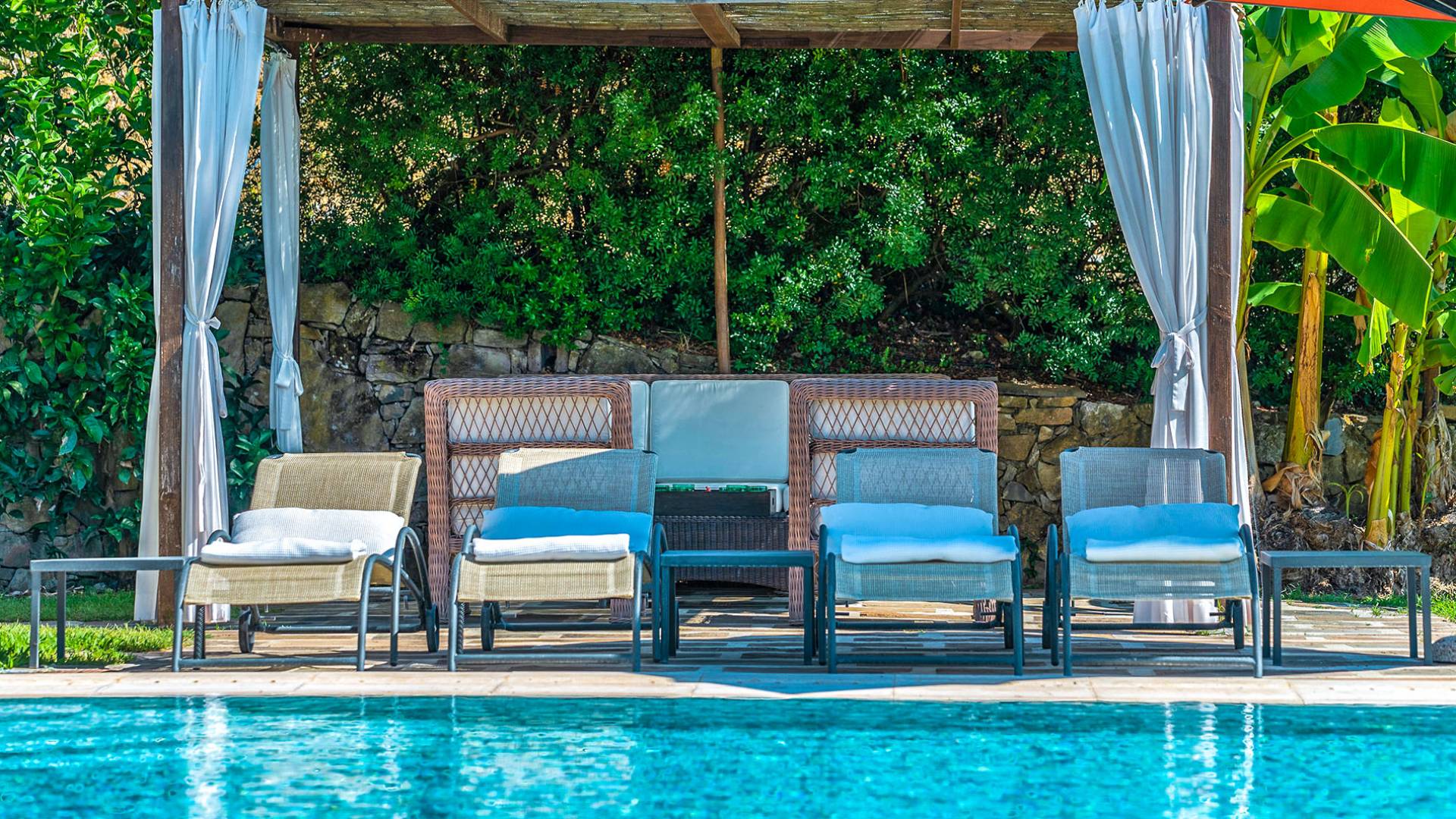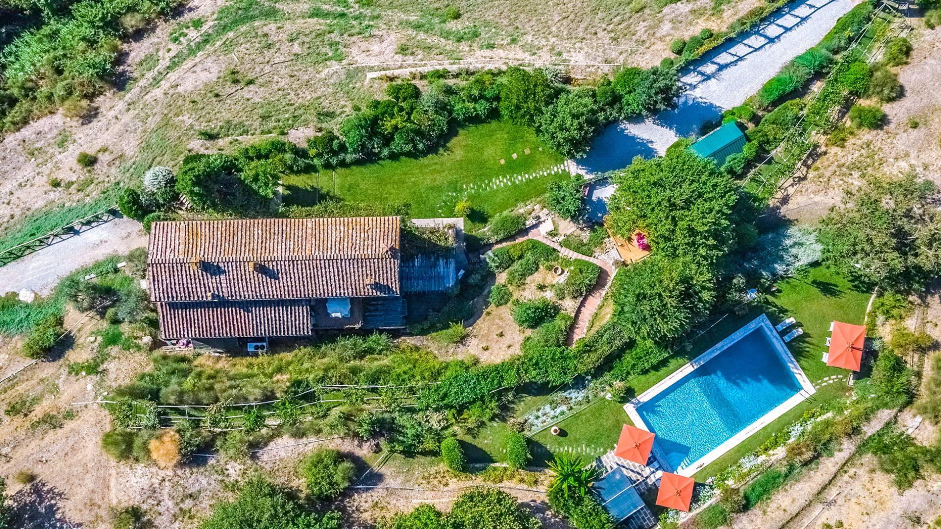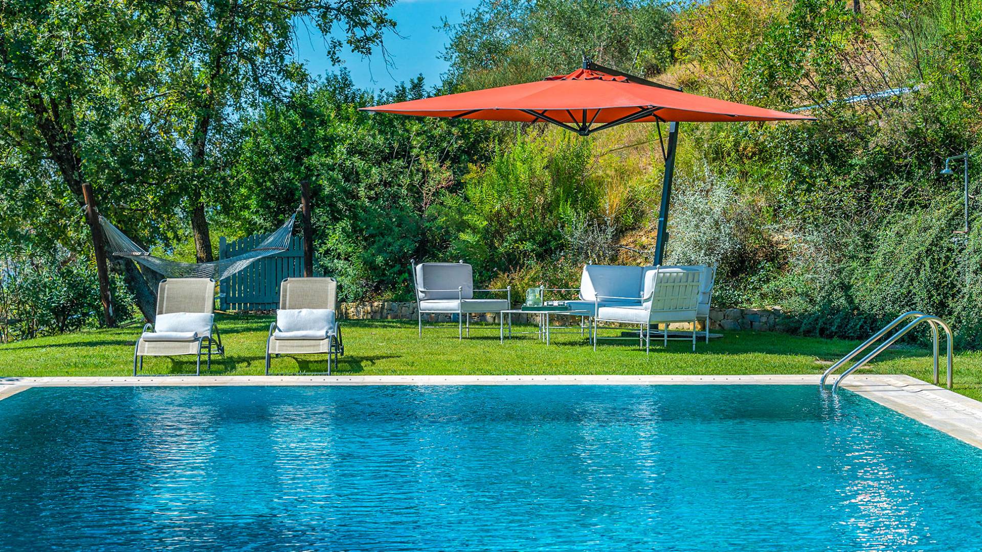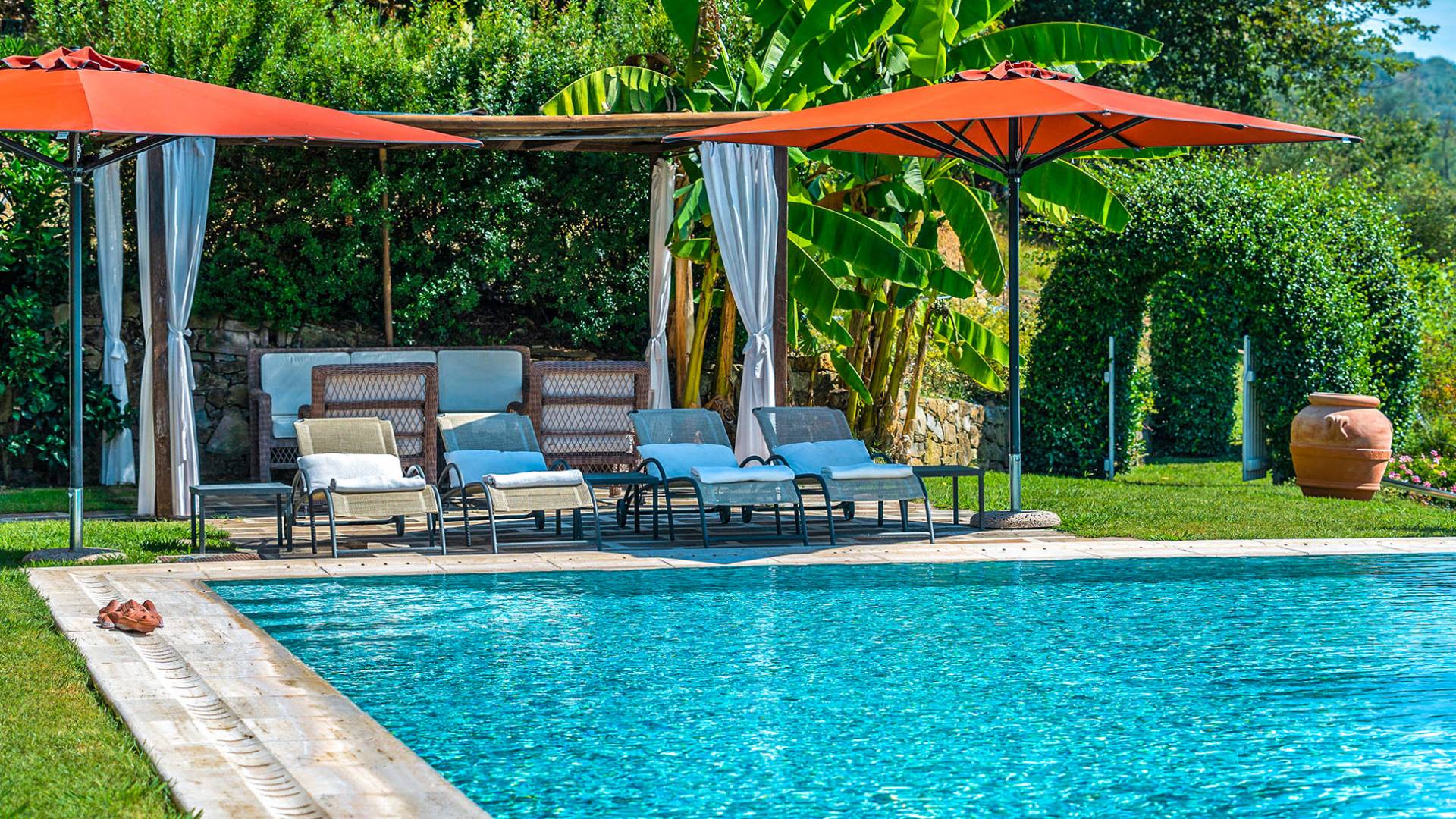 The swimming pool 7x14 (from 1mt approximately in the lower part to 2,5 mt in the deeper part) is large and well-equipped with all the necessary amenities for relaxing or sunbathing poolside. An additional gazebo provides a covered area where one can enjoy cool summer breezes. A small nearby annex serves as a changing room and is also equipped with a bathroom, shower, refrigerator, and two single beds.