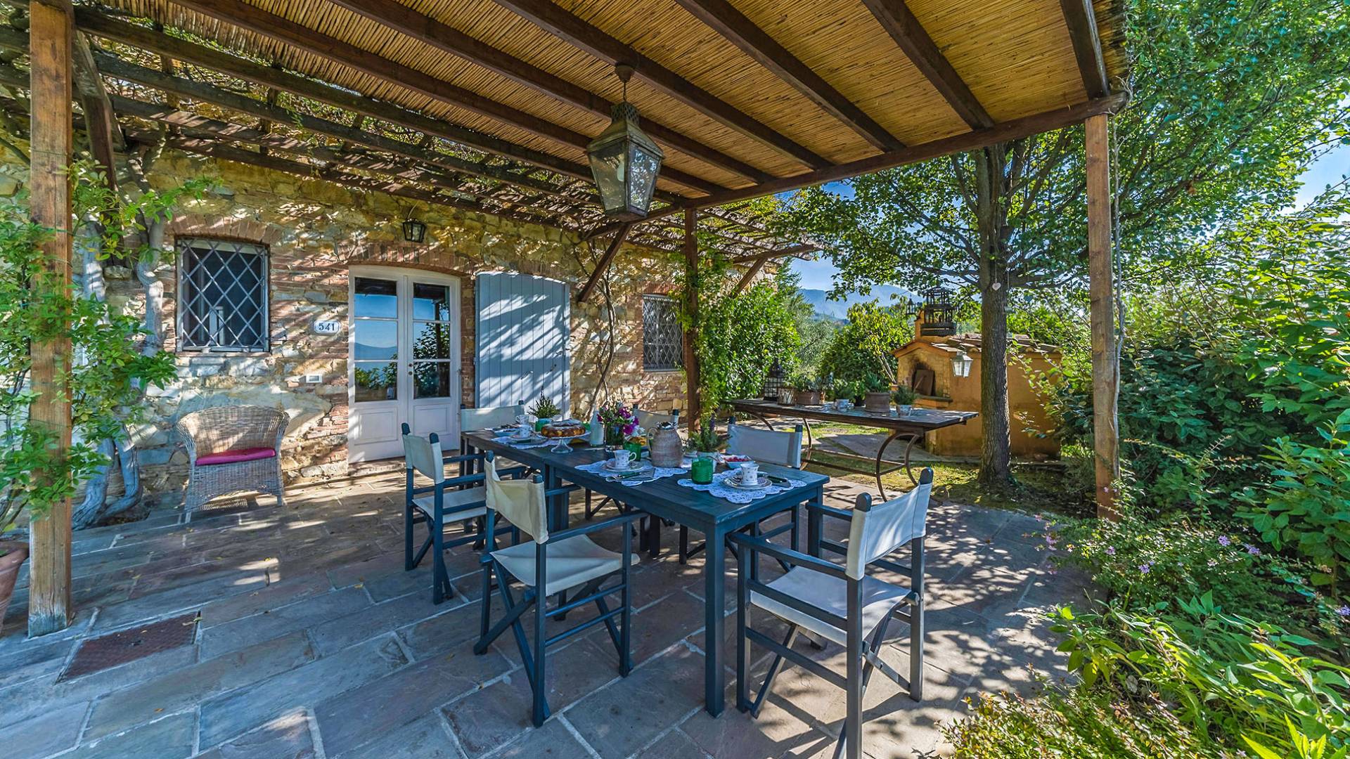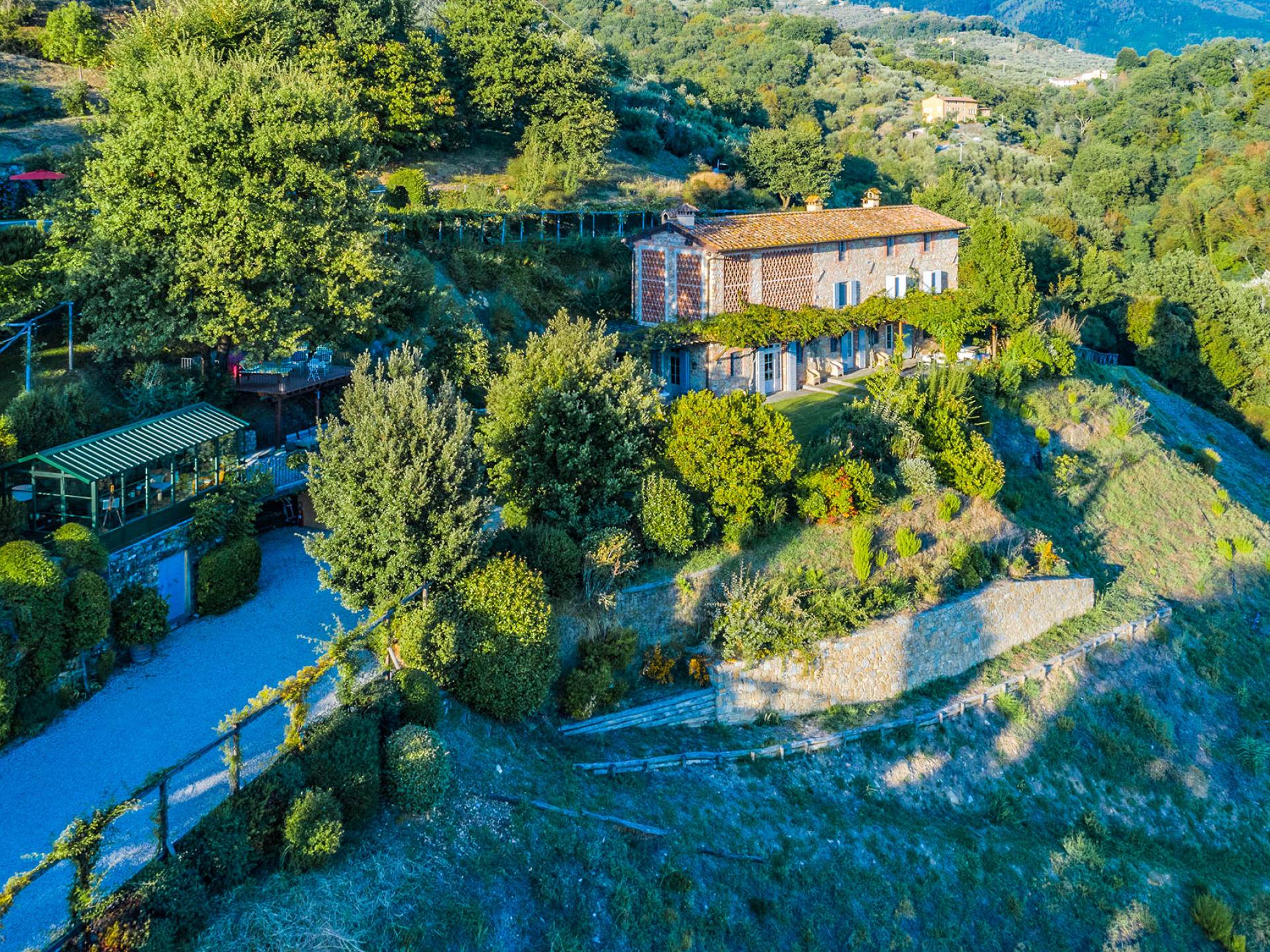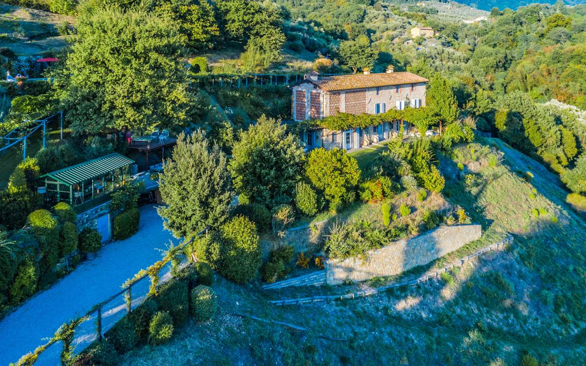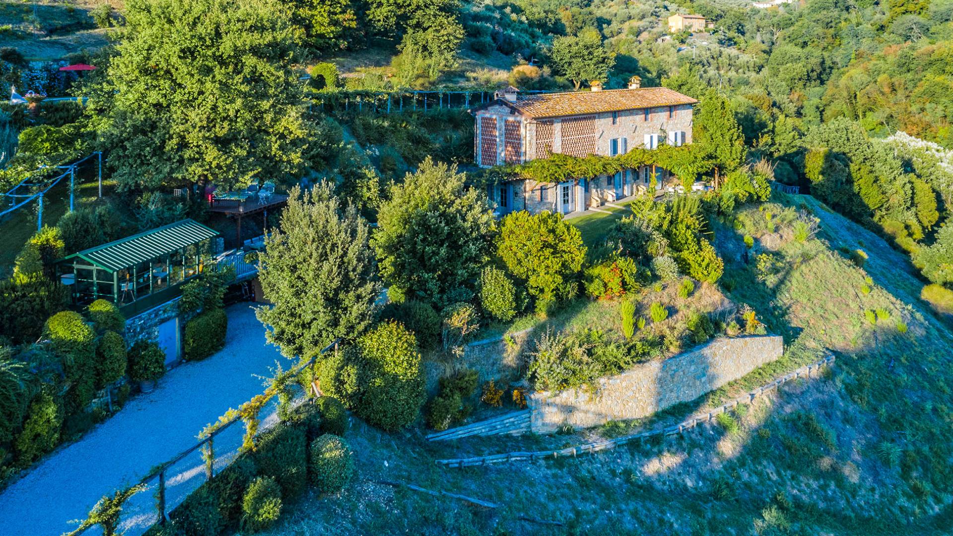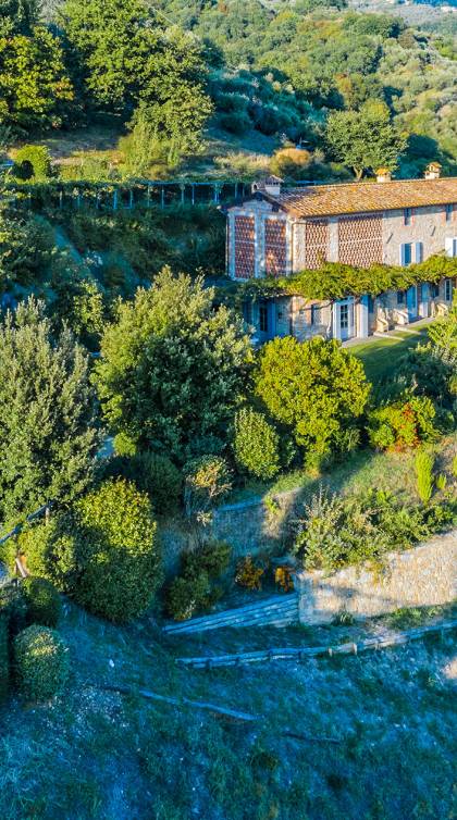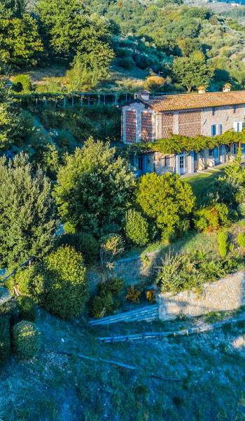 Scattered over the mountainous terrain, one can find abandoned farm buildings, uncontaminated woods, and functional mountain refuges. The hill on which the villa stands is divided into different terraced areas; visually impressive and typical of this area of Tuscany, this landscaping practice has produced what is referred to as "scaloni" or "grand staircases" molding the terrain. The villa itself is found on the first terrace; the second terrace hosts a beautiful swimming pool facing the vast valley and providing a lovely spot from which to enjoy the marvelous panorama.