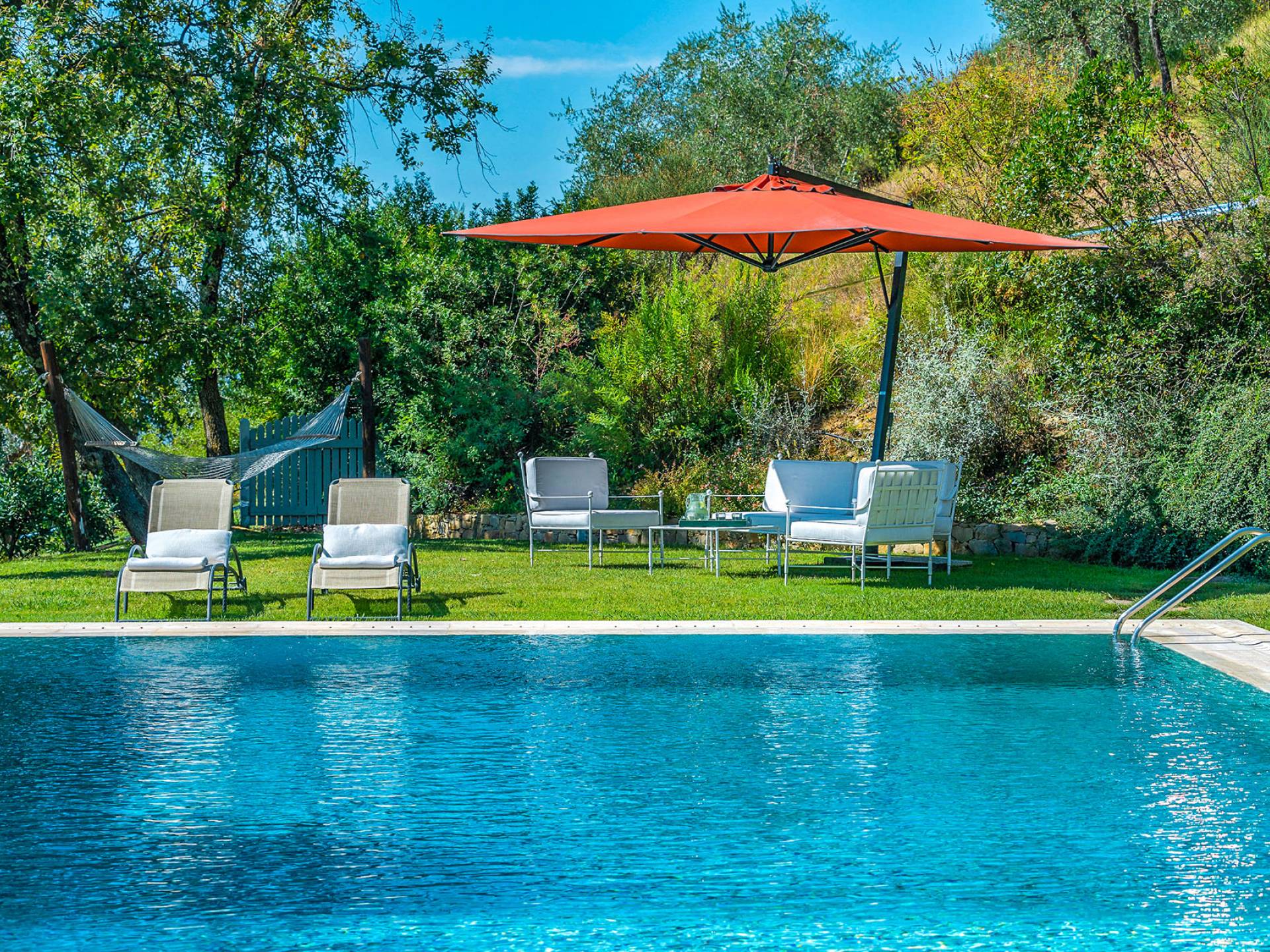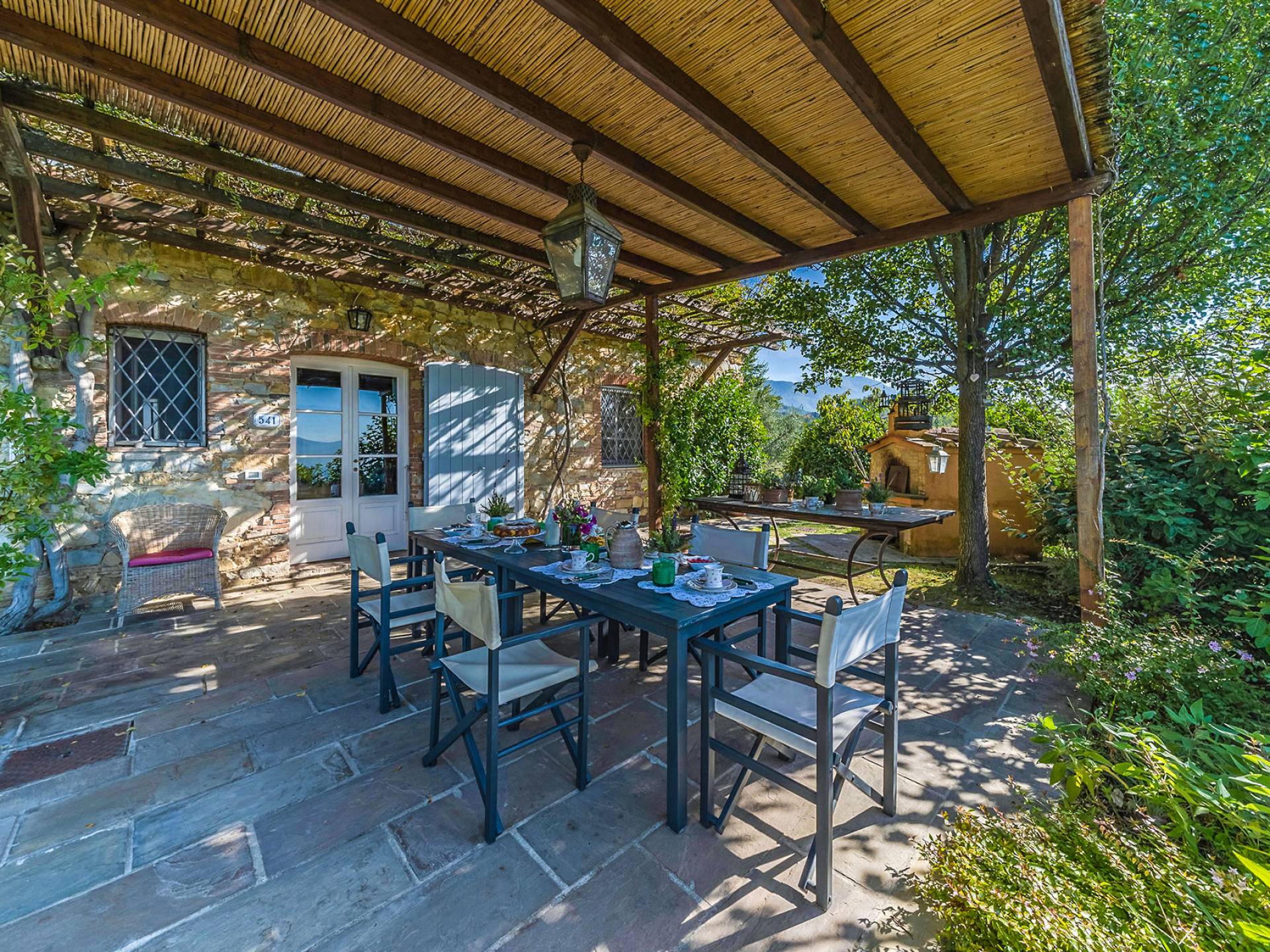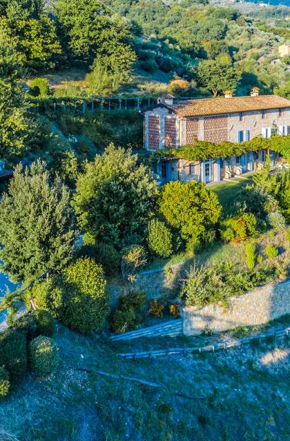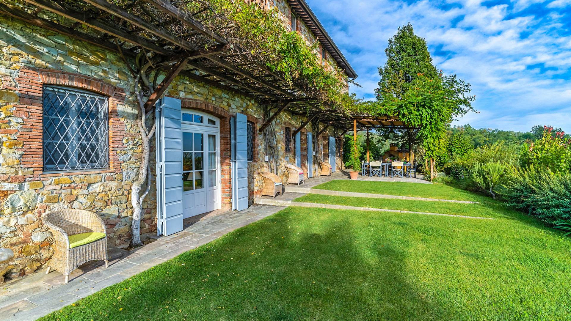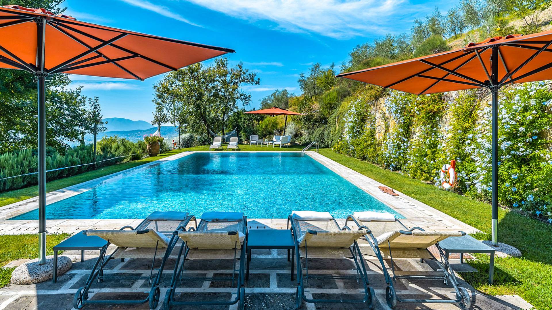 Scattered over the mountainous terrain, one can find abandoned farm buildings, uncontaminated woods, and functional mountain refuges. The hill on which the villa stands is divided into different terraced areas; visually impressive and typical of this area of Tuscany, this landscaping practice has produced what is referred to as "scaloni" or "grand staircases" molding the terrain. The villa itself is found on the first terrace; the second terrace hosts a beautiful swimming pool facing the vast valley and providing a lovely spot from which to enjoy the marvelous panorama.
