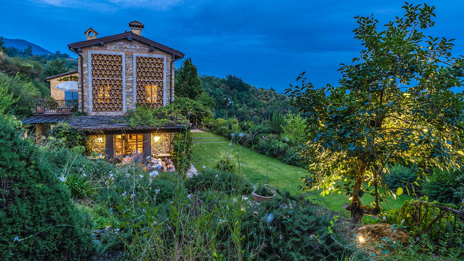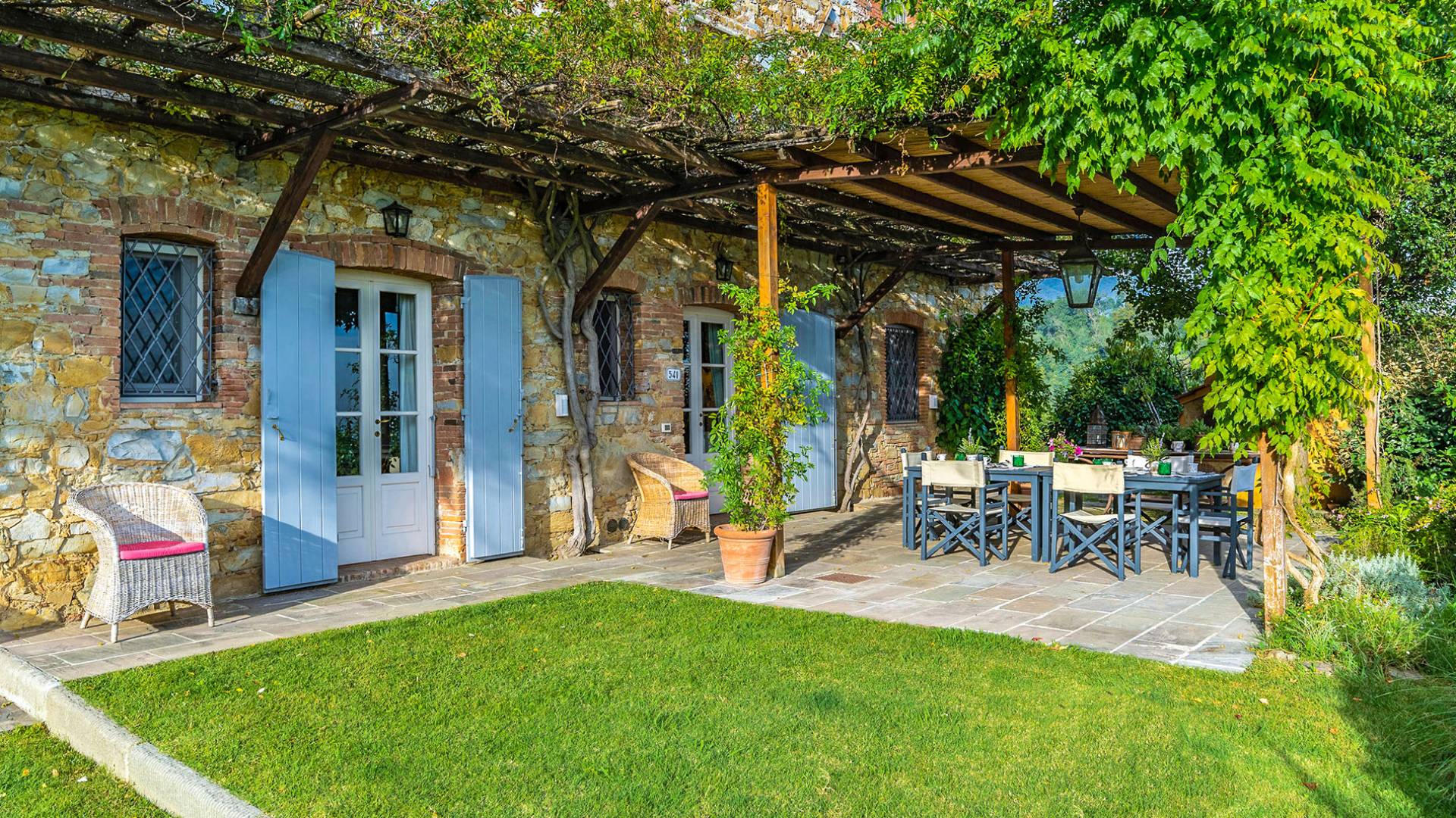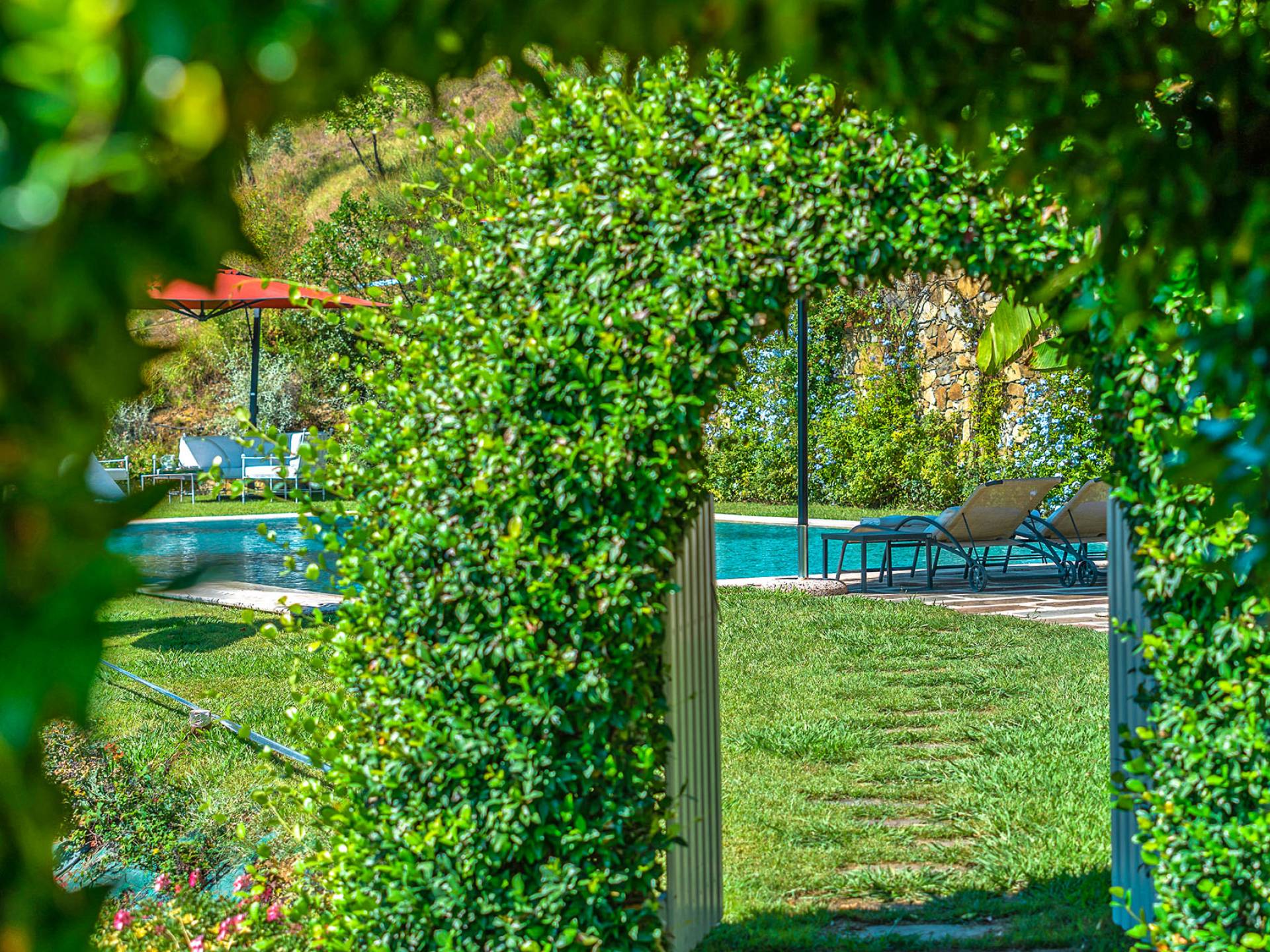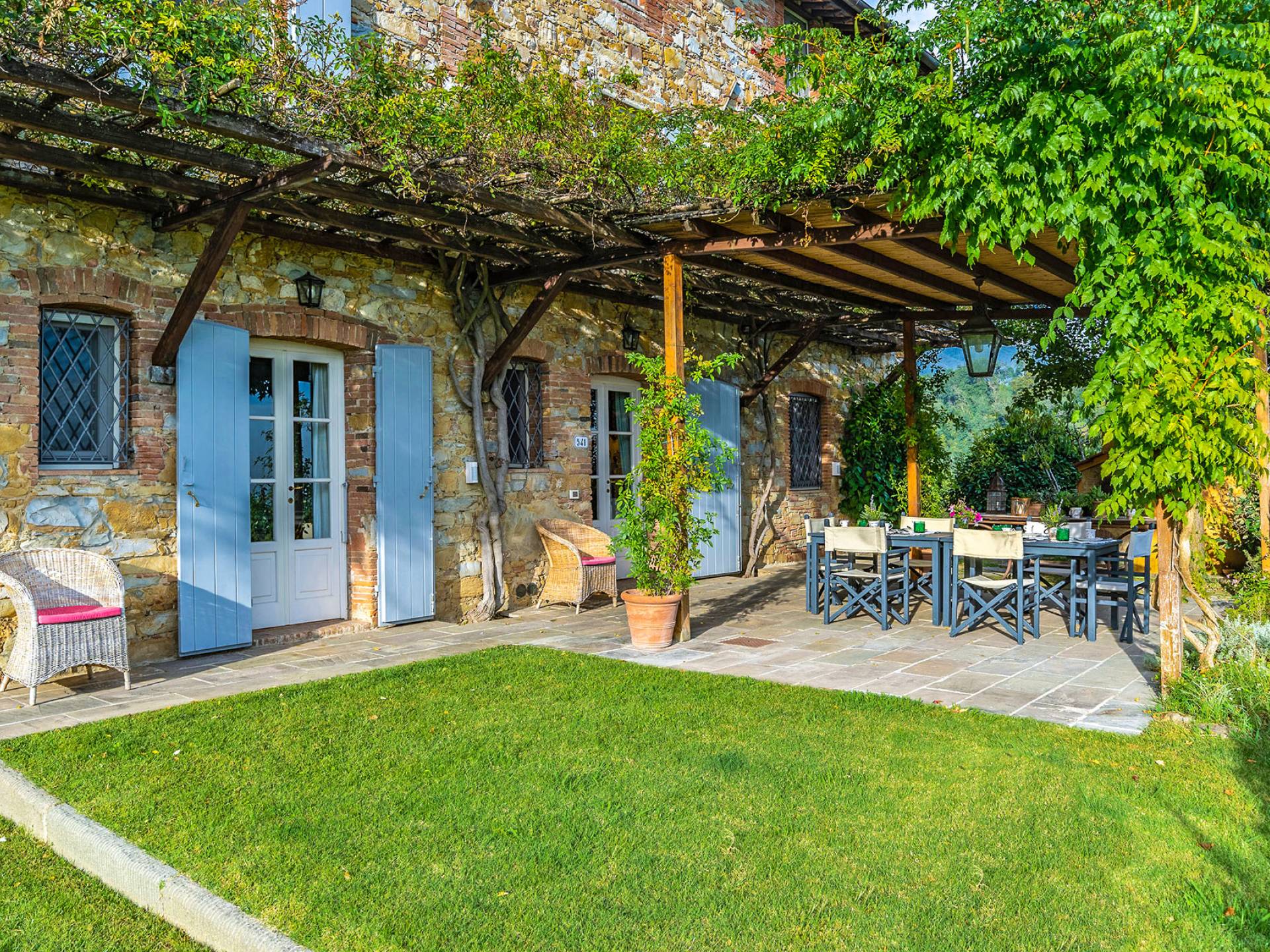 Scattered over the mountainous terrain, one can find abandoned farm buildings, uncontaminated woods, and functional mountain refuges. The hill on which the villa stands is divided into different terraced areas; visually impressive and typical of this area of Tuscany, this landscaping practice has produced what is referred to as "scaloni" or "grand staircases" molding the terrain. The villa itself is found on the first terrace; the second terrace hosts a beautiful swimming pool facing the vast valley and providing a lovely spot from which to enjoy the marvelous panorama.