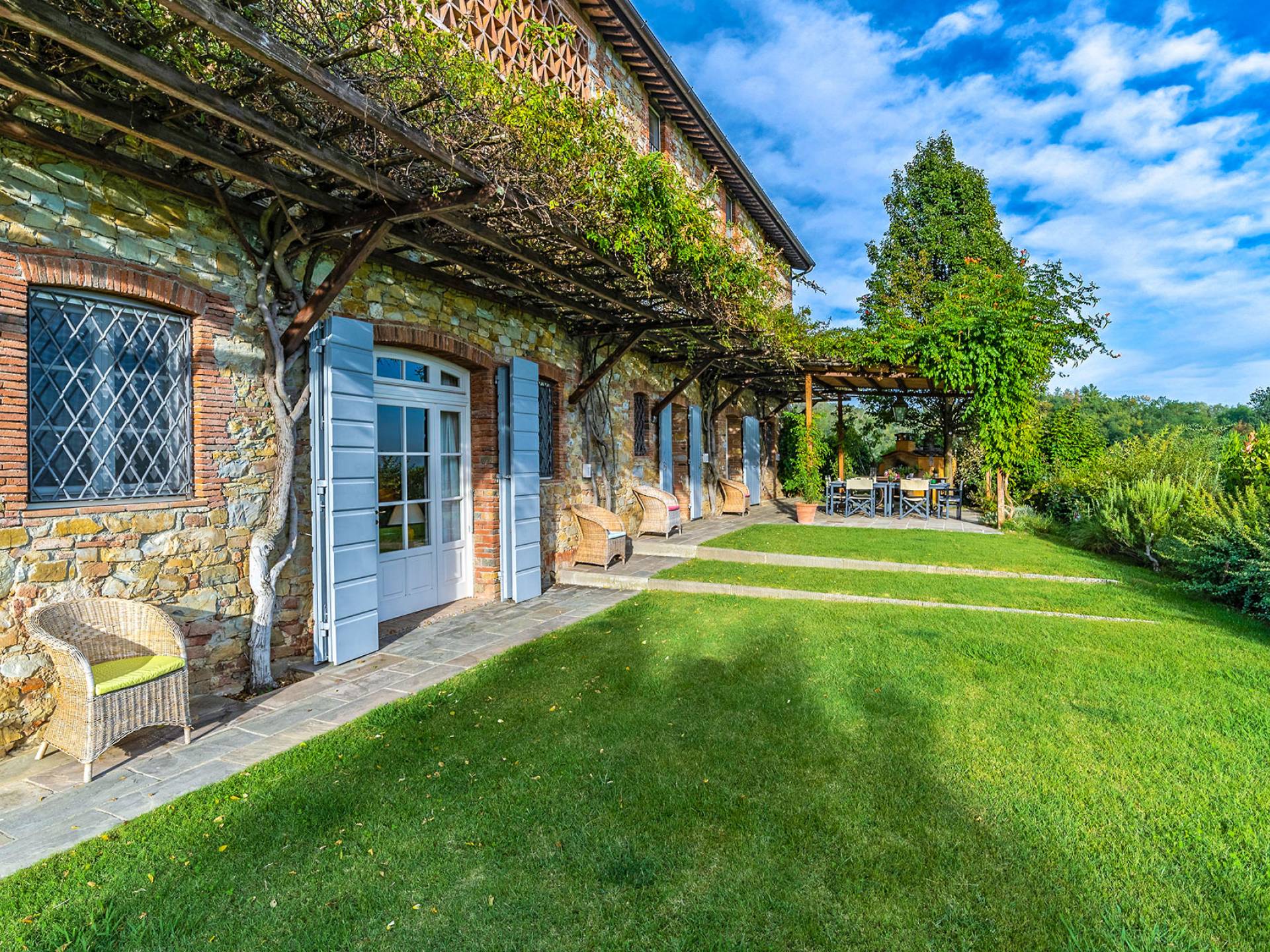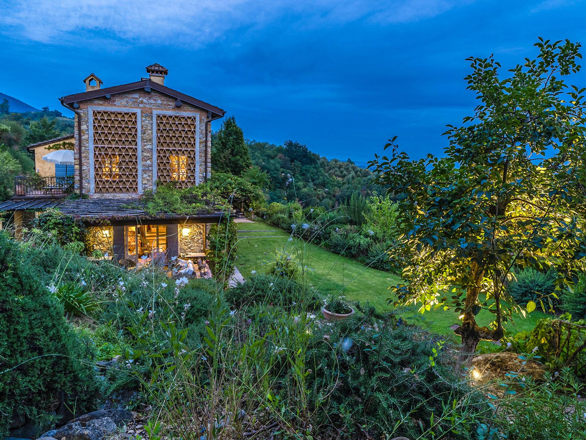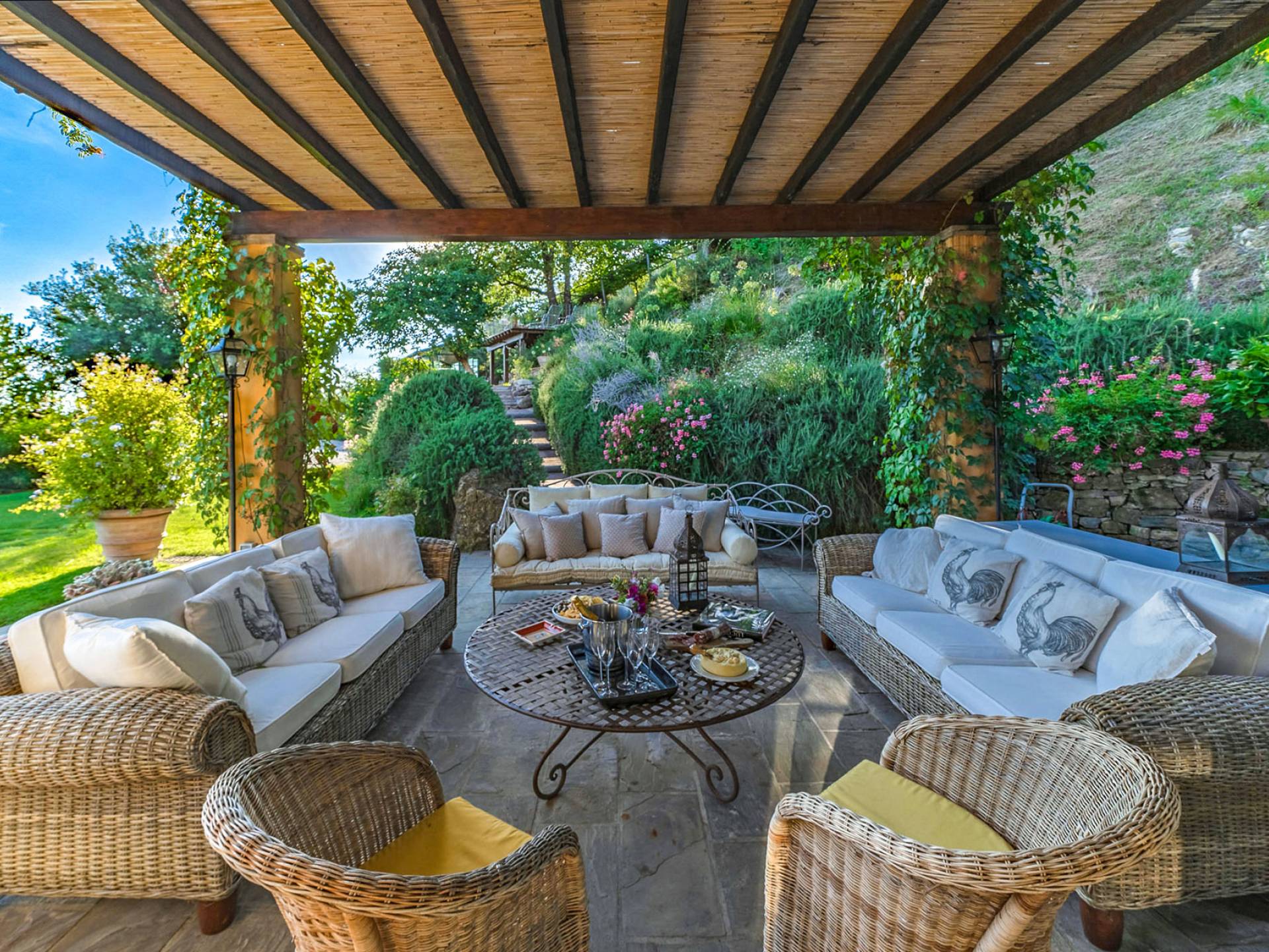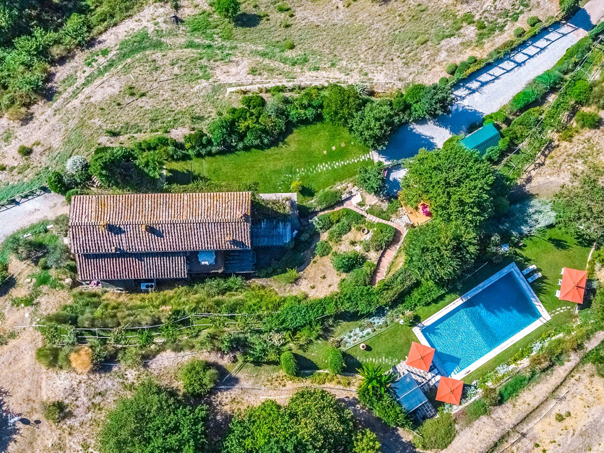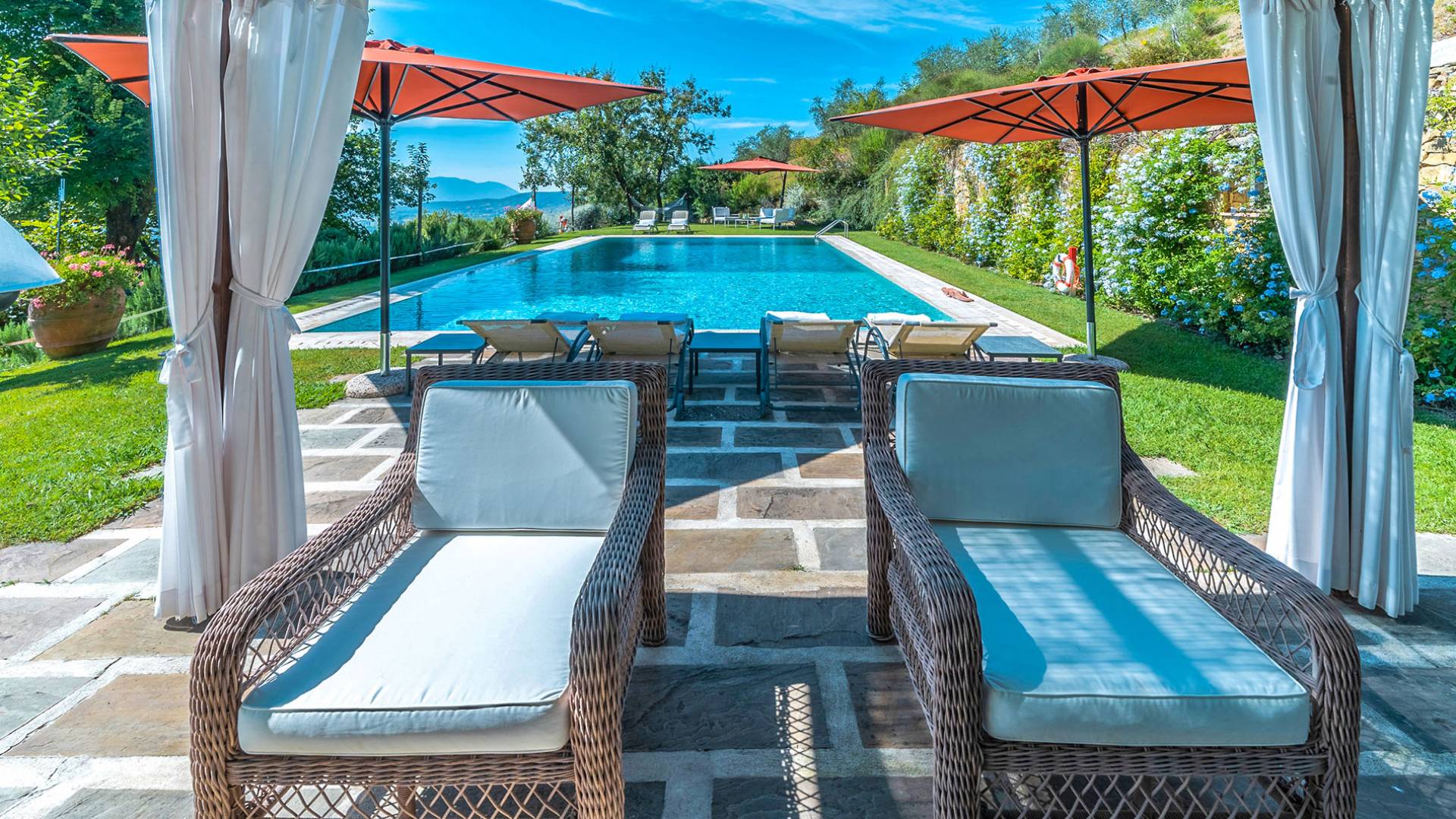 Scattered over the mountainous terrain, one can find abandoned farm buildings, uncontaminated woods, and functional mountain refuges. The hill on which the villa stands is divided into different terraced areas; visually impressive and typical of this area of Tuscany, this landscaping practice has produced what is referred to as "scaloni" or "grand staircases" molding the terrain. The villa itself is found on the first terrace; the second terrace hosts a beautiful swimming pool facing the vast valley and providing a lovely spot from which to enjoy the marvelous panorama.