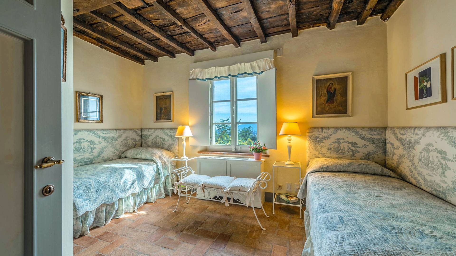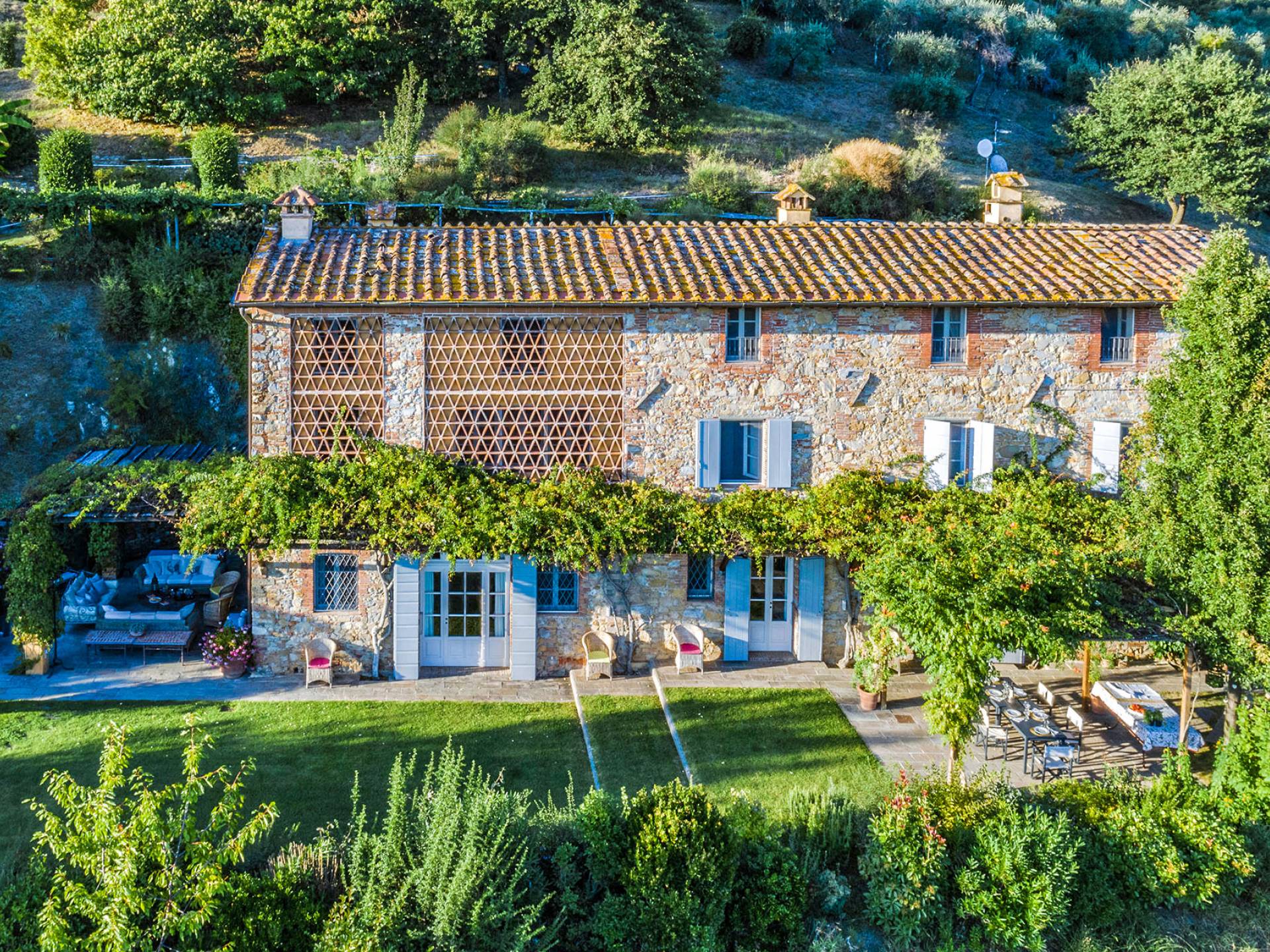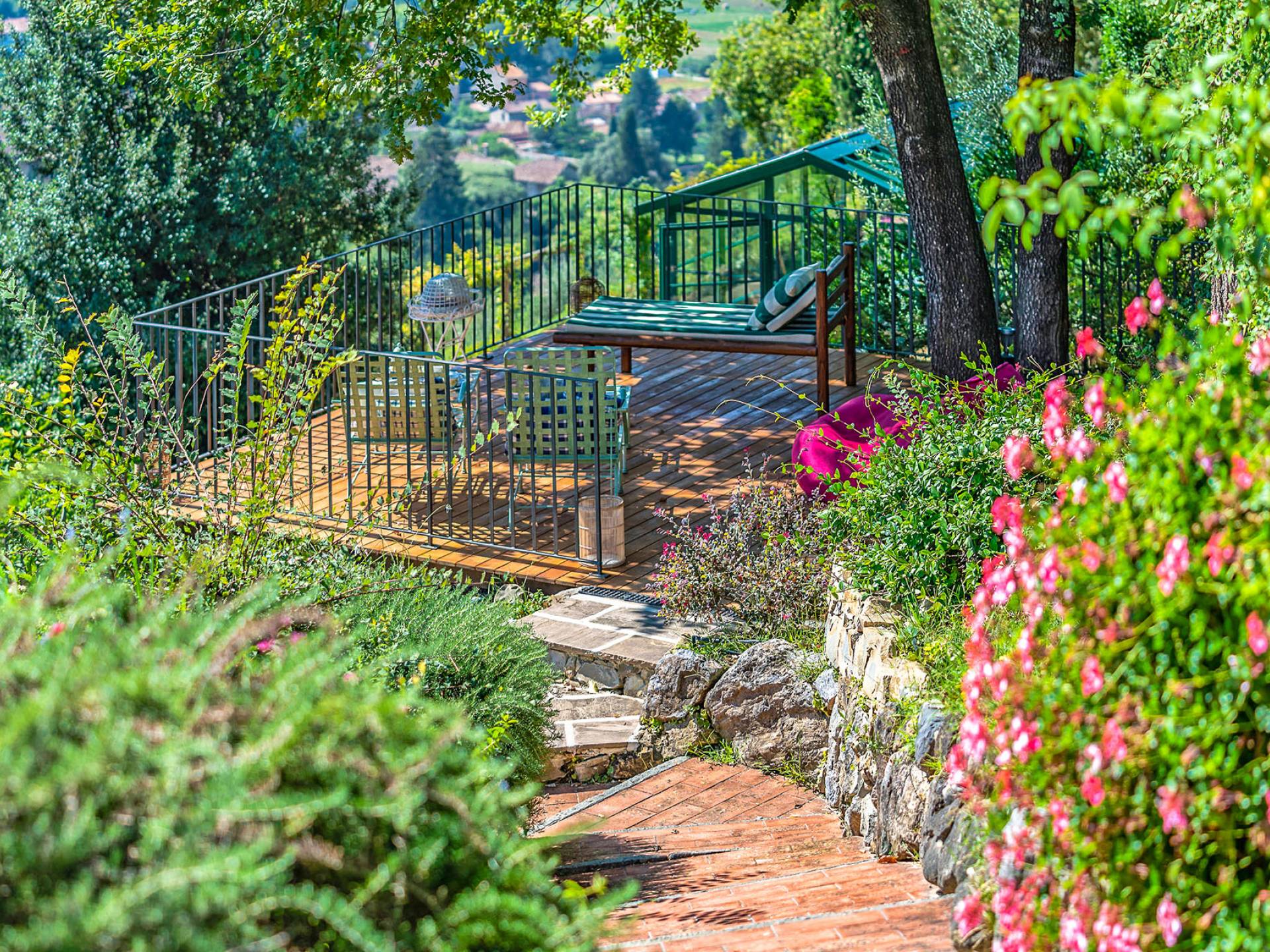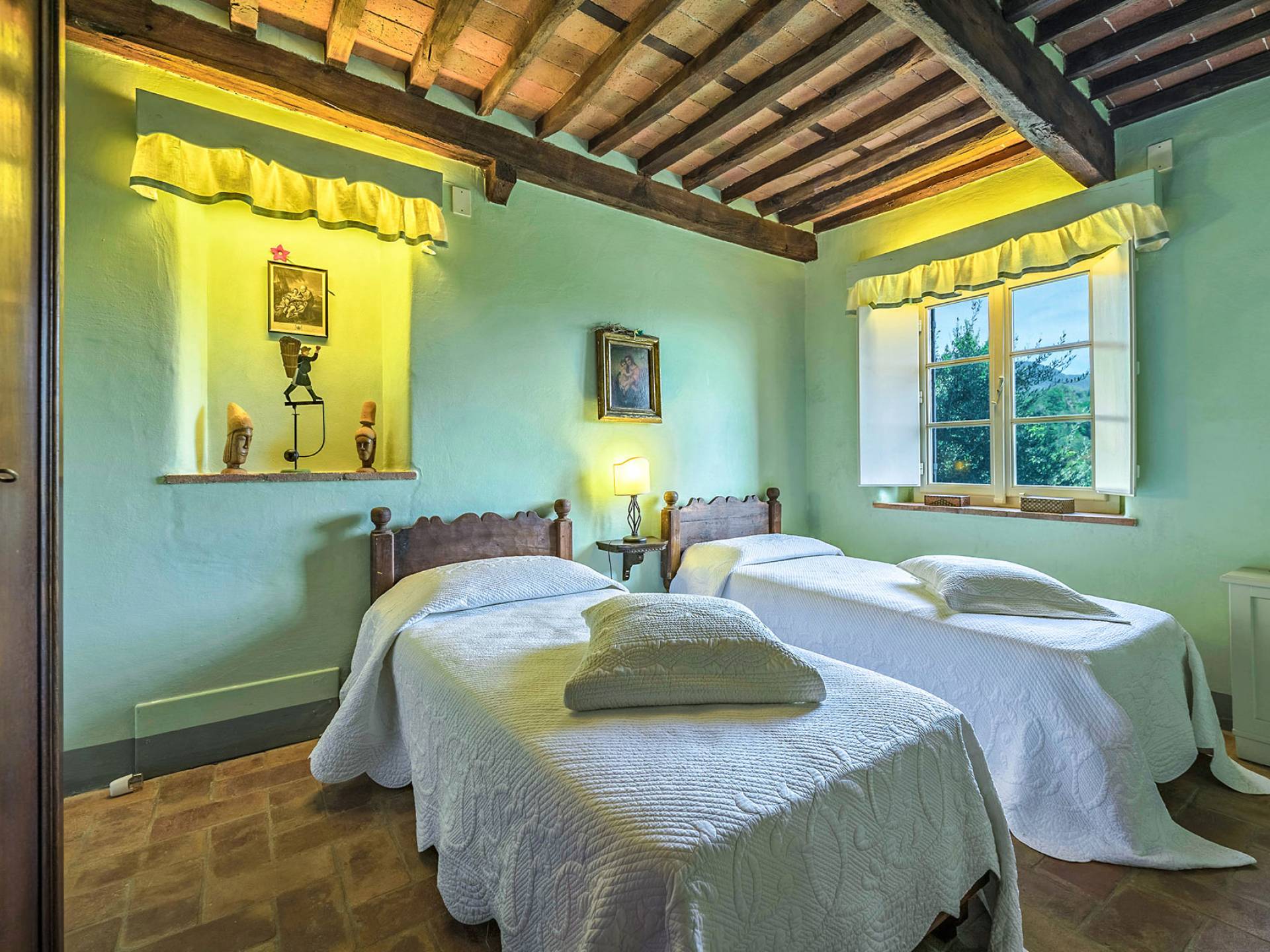 Scattered over the mountainous terrain, one can find abandoned farm buildings, uncontaminated woods, and functional mountain refuges. The hill on which the villa stands is divided into different terraced areas; visually impressive and typical of this area of Tuscany, this landscaping practice has produced what is referred to as "scaloni" or "grand staircases" molding the terrain. The villa itself is found on the first terrace; the second terrace hosts a beautiful swimming pool facing the vast valley and providing a lovely spot from which to enjoy the marvelous panorama.