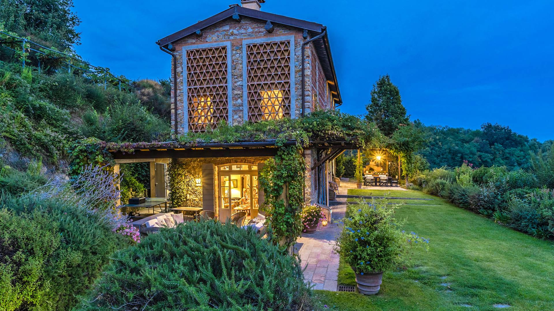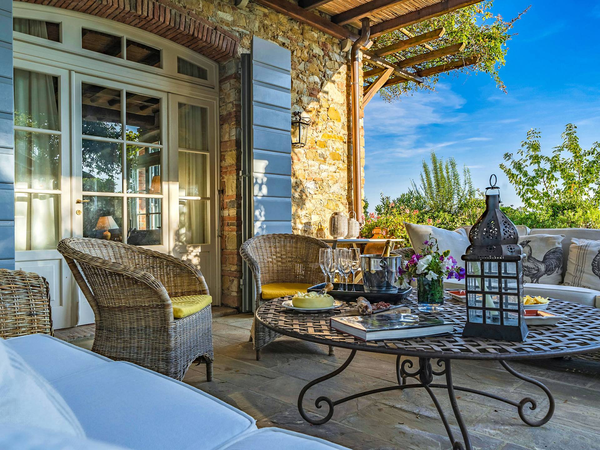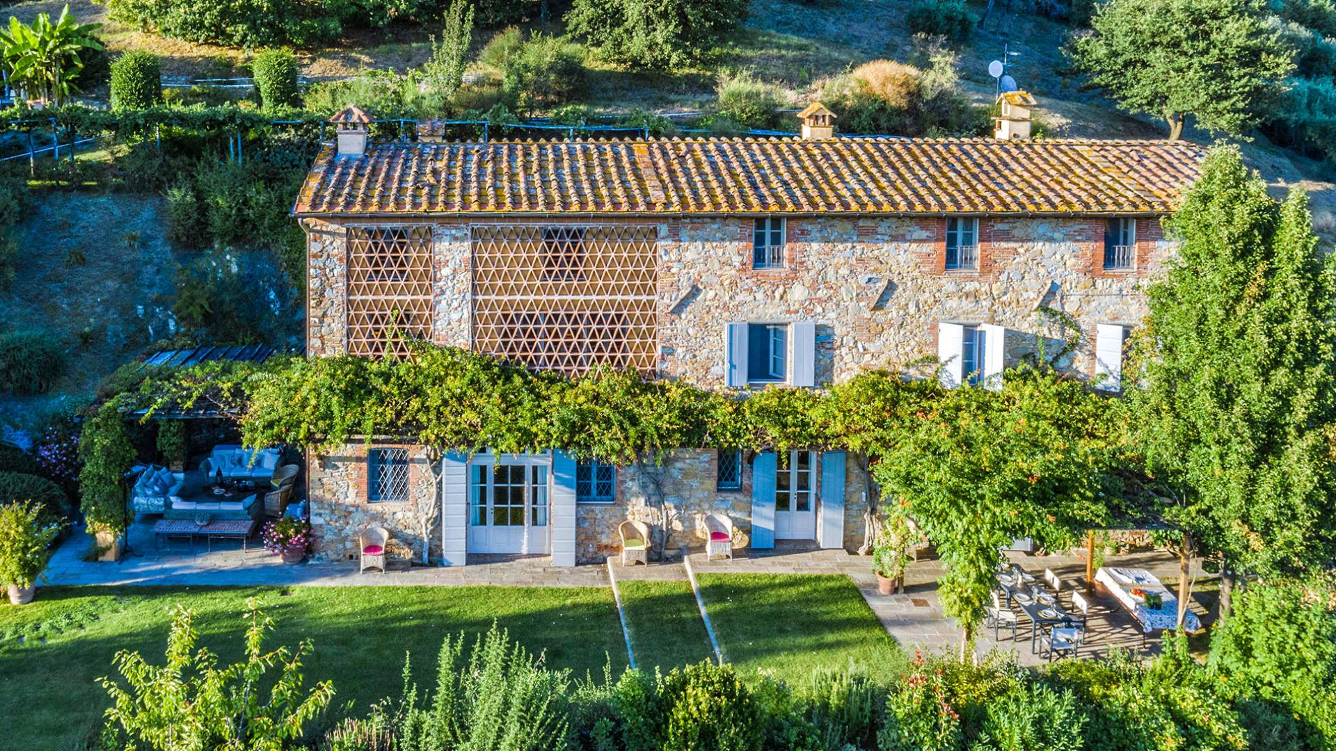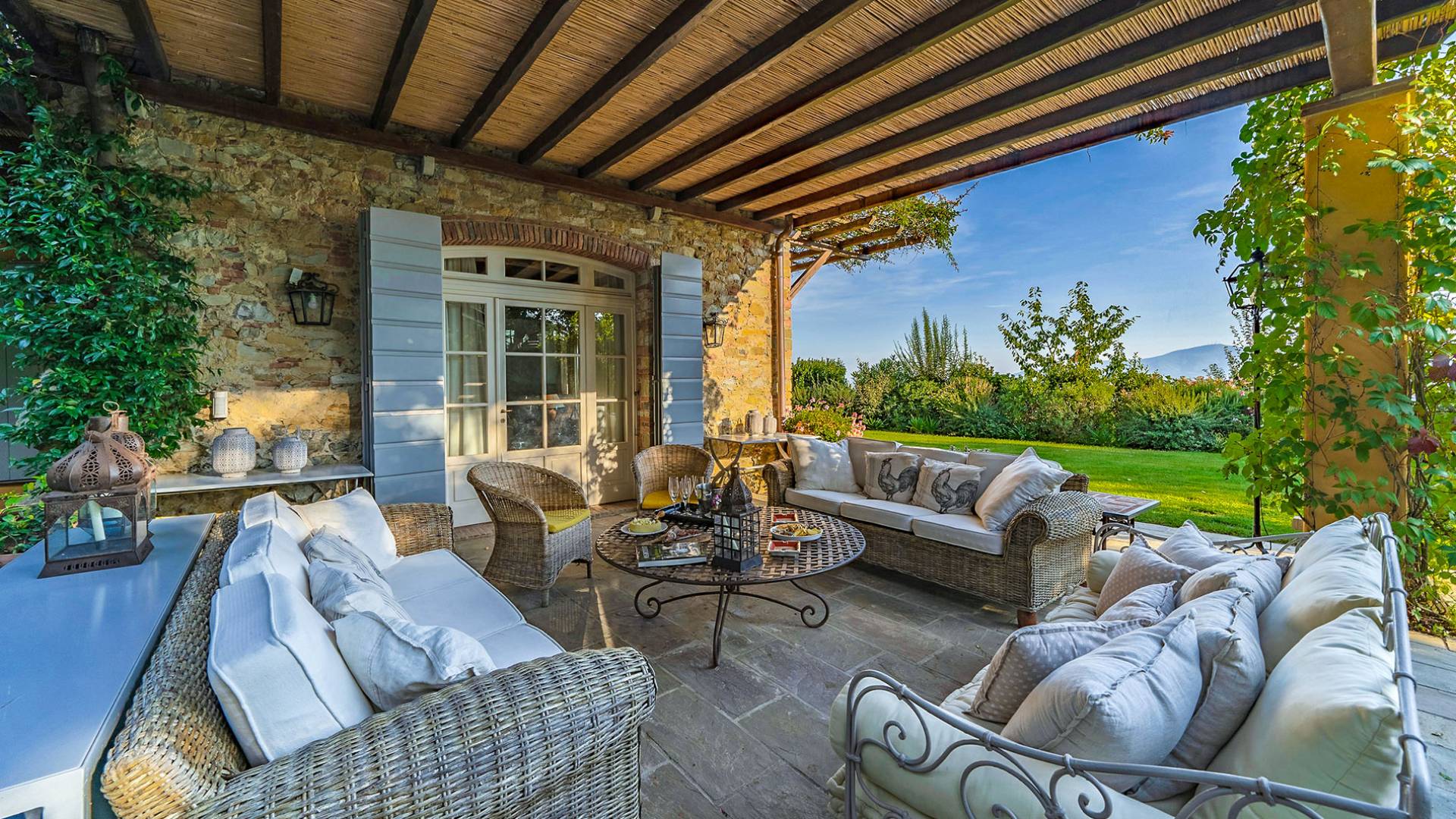 Outside, Villa i Pinoni Tuscany appears as a long building dressed with its original stone walls and displaying, on its left side, what looks like a series of red brick decorations. Typical of Tuscan rural buildings, the red brick patterns that today appear as decorations were once the perforated walls of barns, built in such a way as to allow the circulation of air throughout, so as to keep the hay from rotting.
