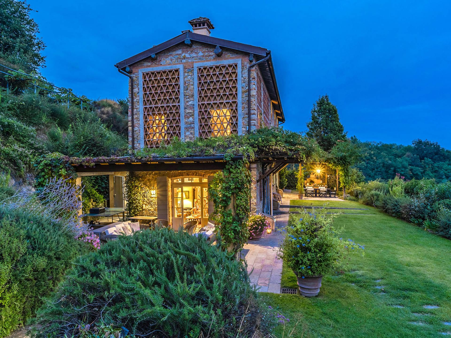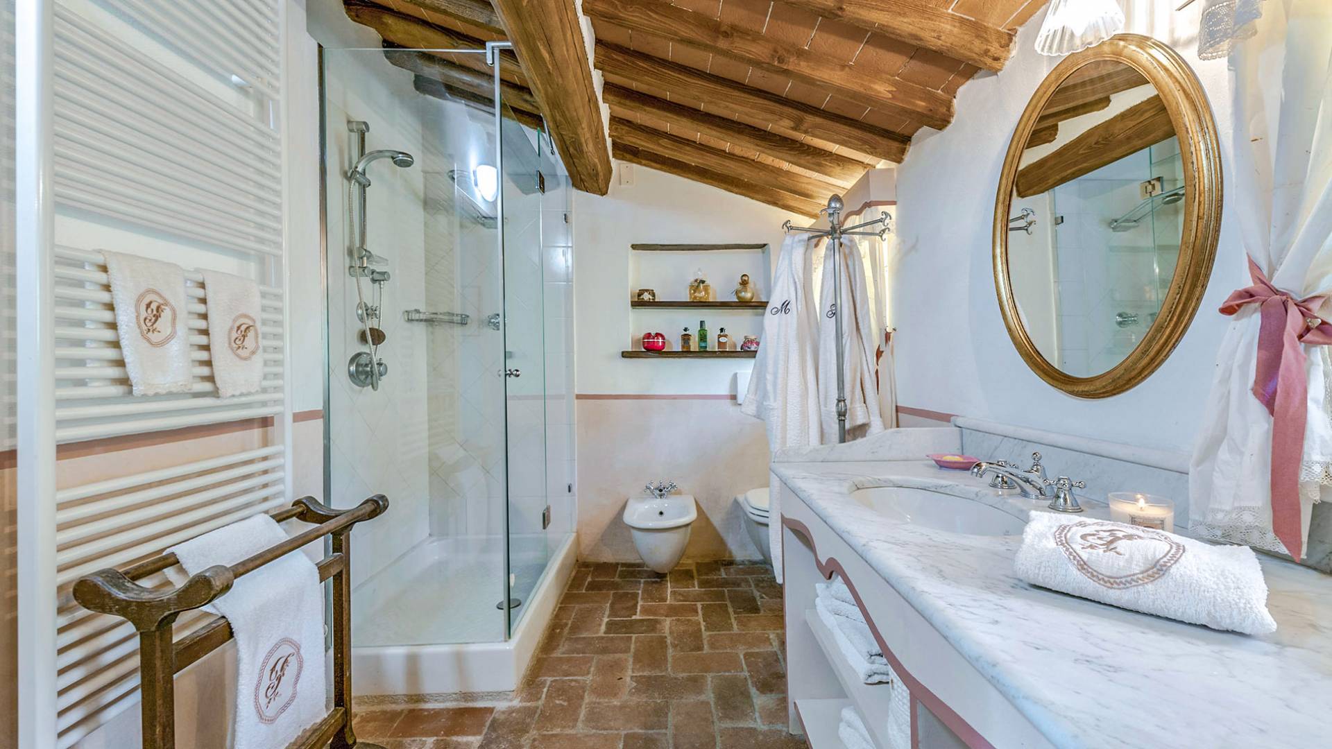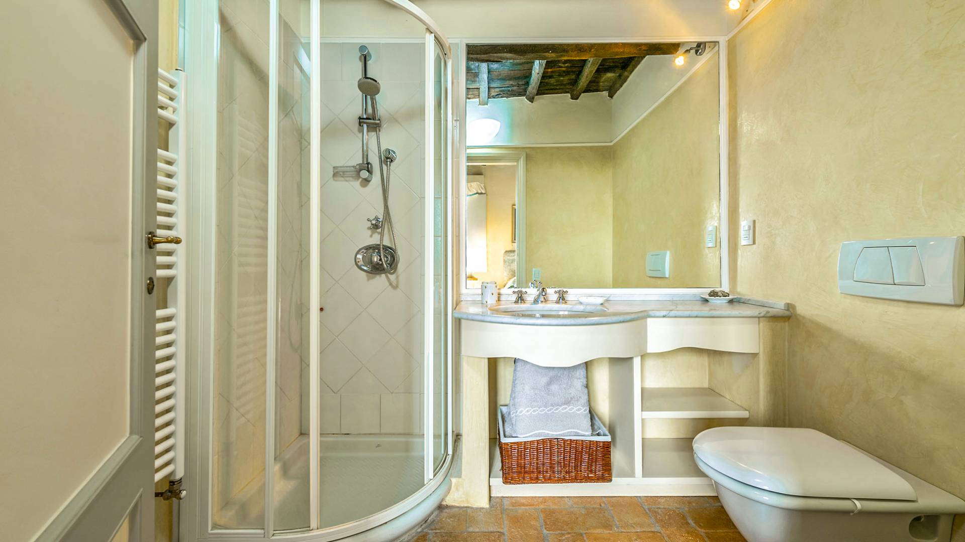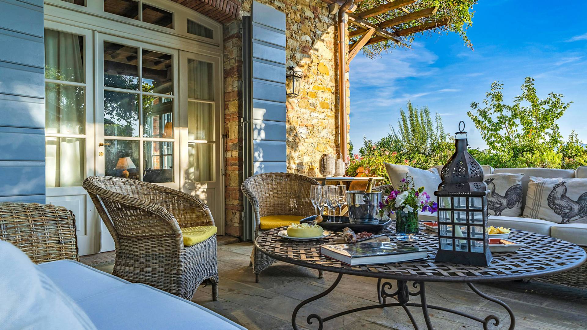 Outside, Villa i Pinoni Tuscany appears as a long building dressed with its original stone walls and displaying, on its left side, what looks like a series of red brick decorations. Typical of Tuscan rural buildings, the red brick patterns that today appear as decorations were once the perforated walls of barns, built in such a way as to allow the circulation of air throughout, so as to keep the hay from rotting.