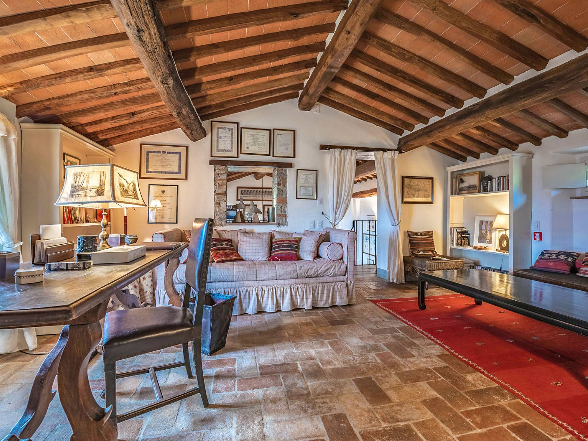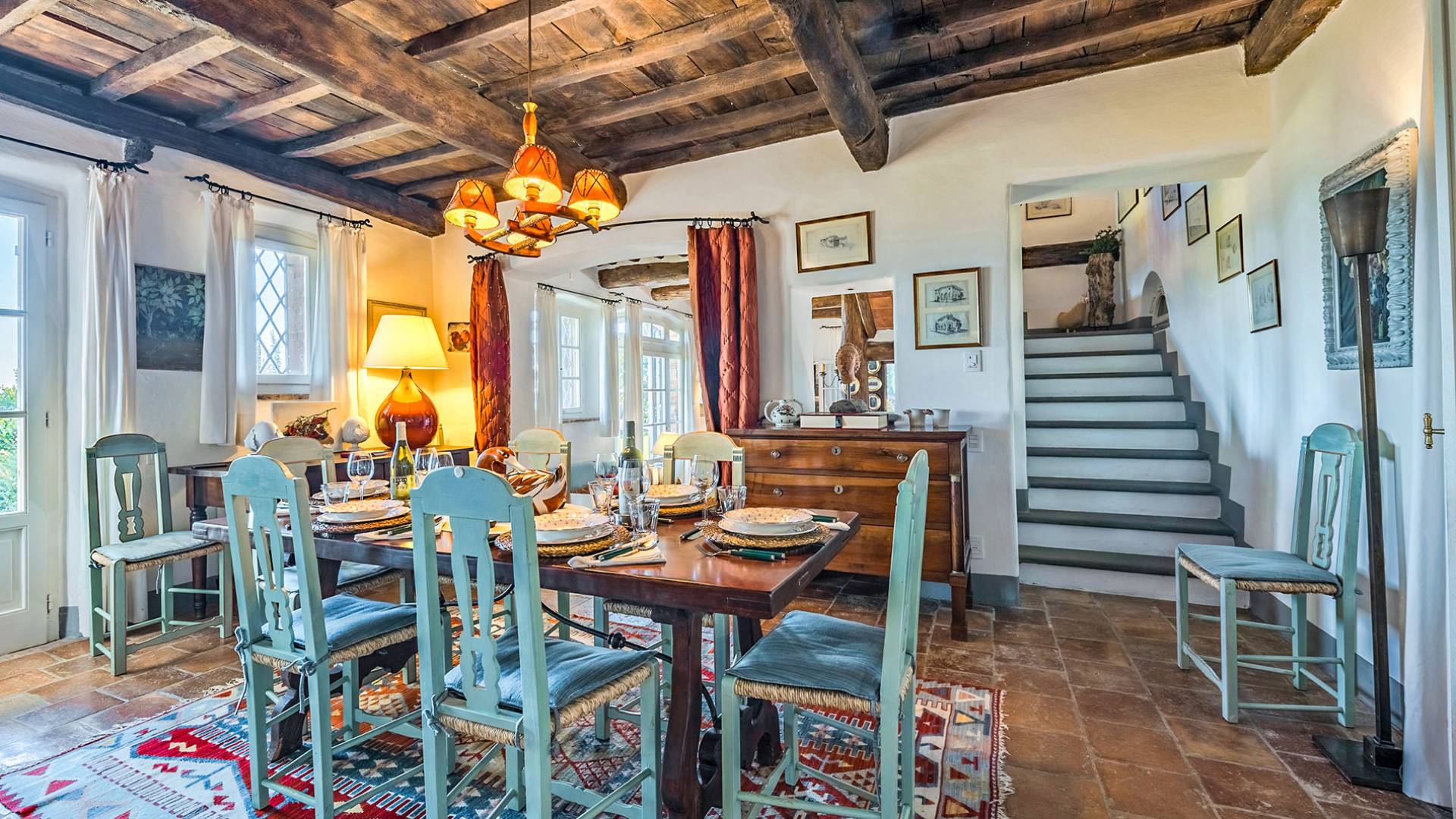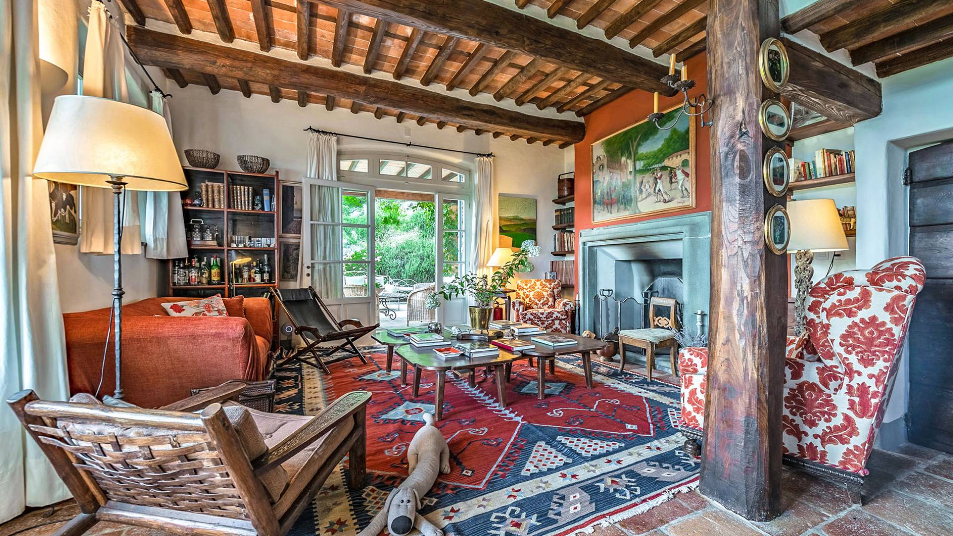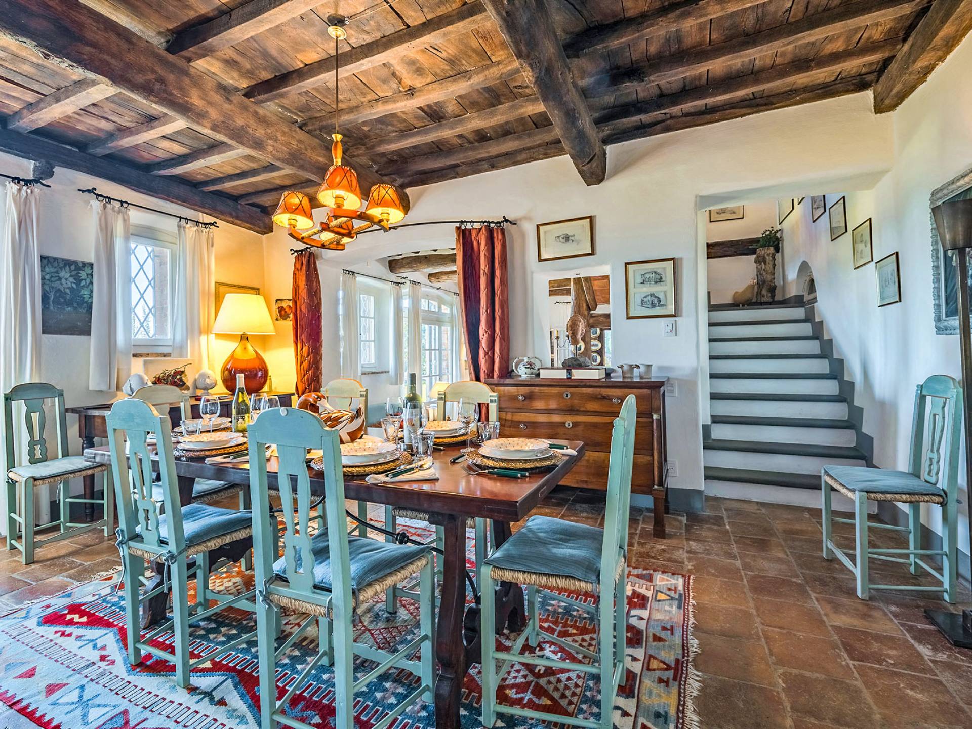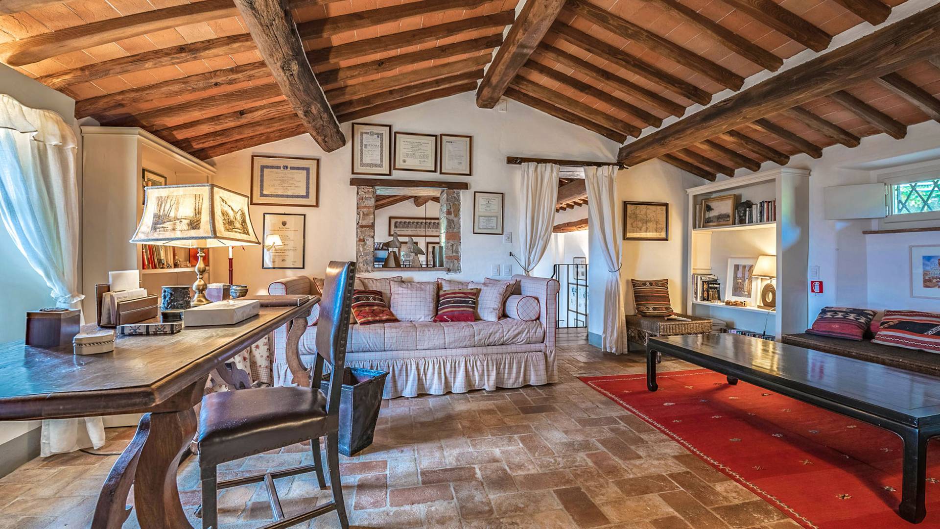 The villa's interior presents a perfect fusion of modern and functional furnishings mixed together with elegant and antique pieces. The rooms are spacious with high ceilings displaying their original wooden beams. The floors have maintained their original red terracotta tiles, and the warm and traditional atmosphere is completed with fine furniture.