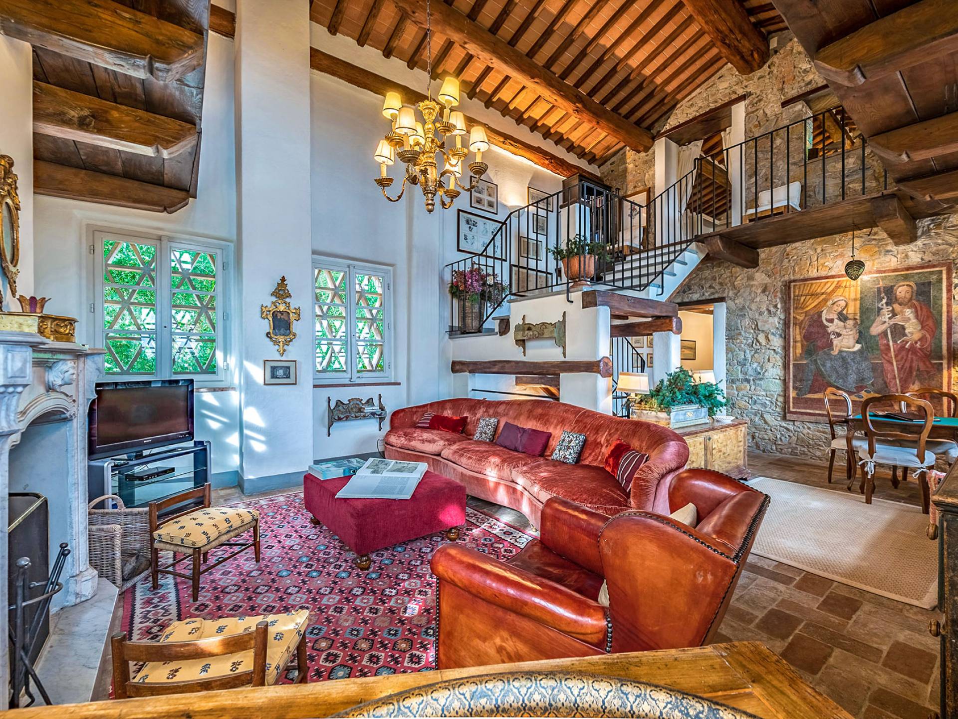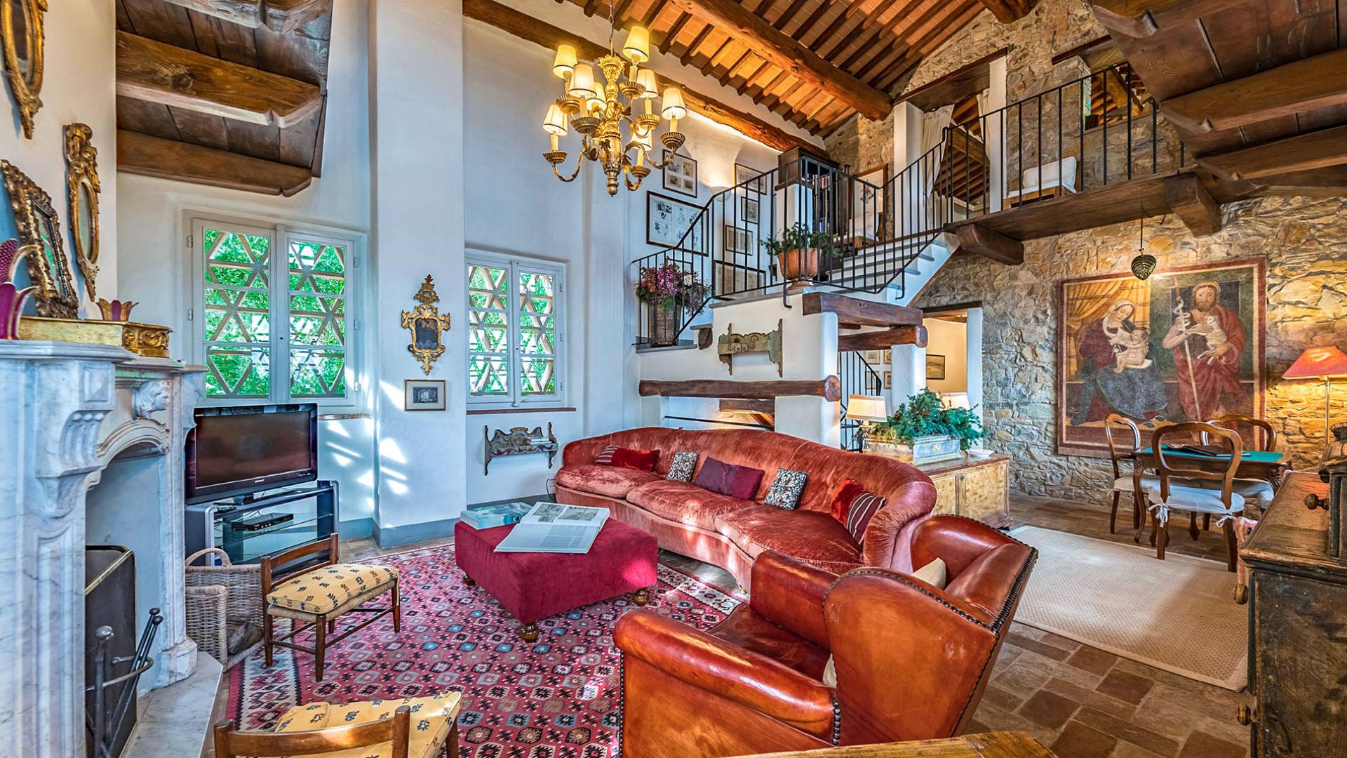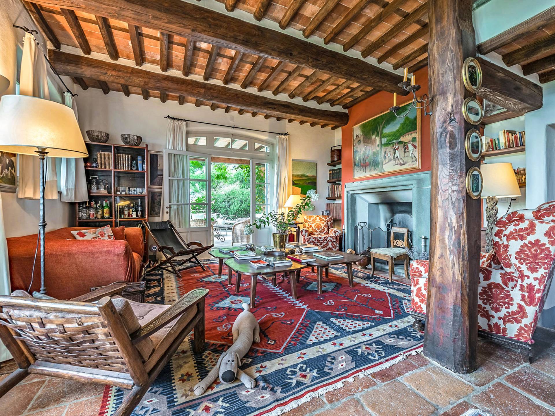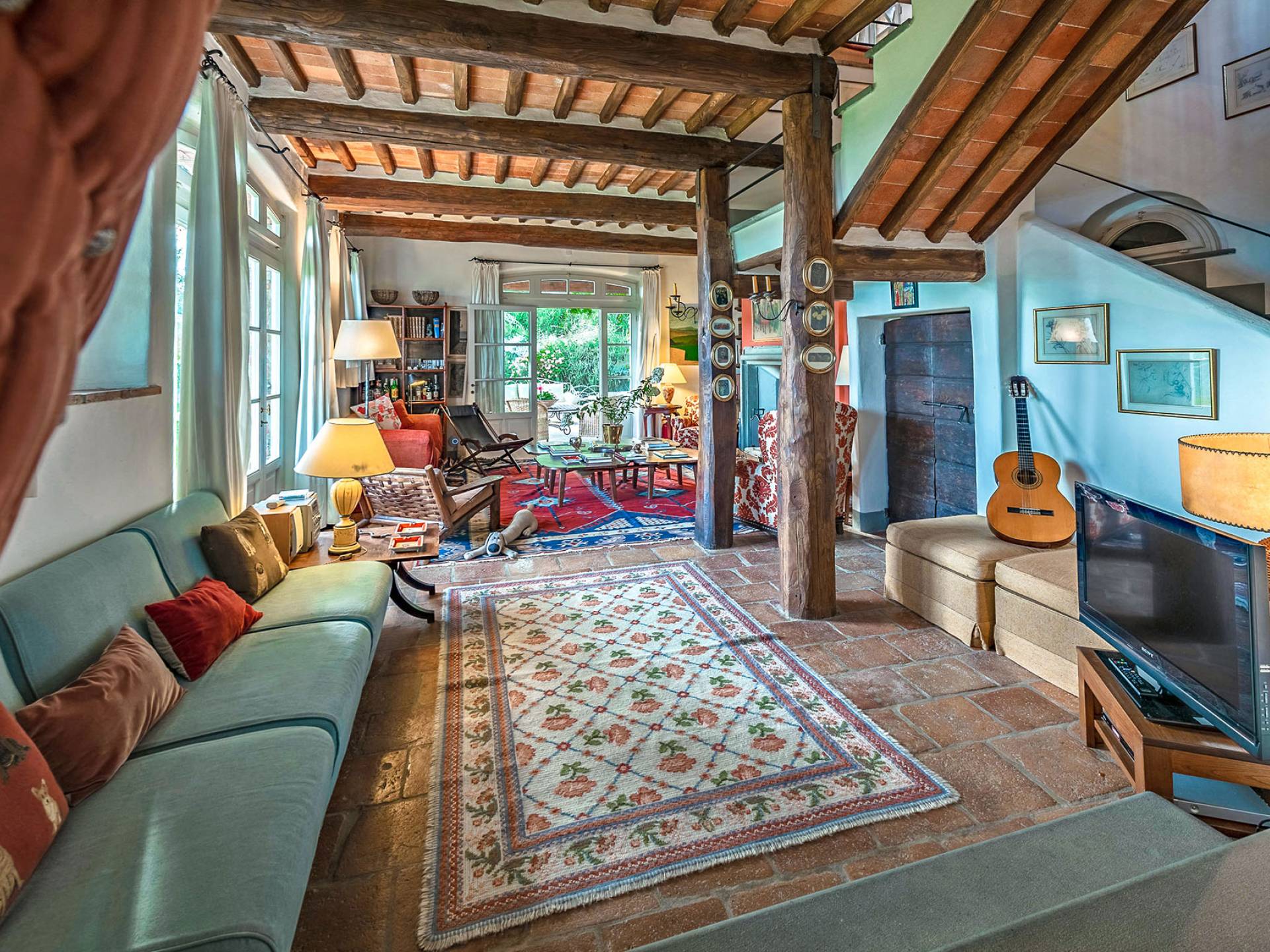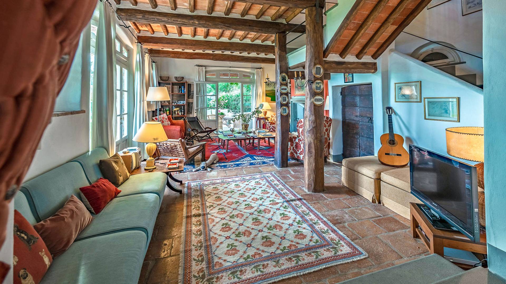 The villa's interior presents a perfect fusion of modern and functional furnishings mixed together with elegant and antique pieces. The rooms are spacious with high ceilings displaying their original wooden beams. The floors have maintained their original red terracotta tiles, and the warm and traditional atmosphere is completed with fine furniture.