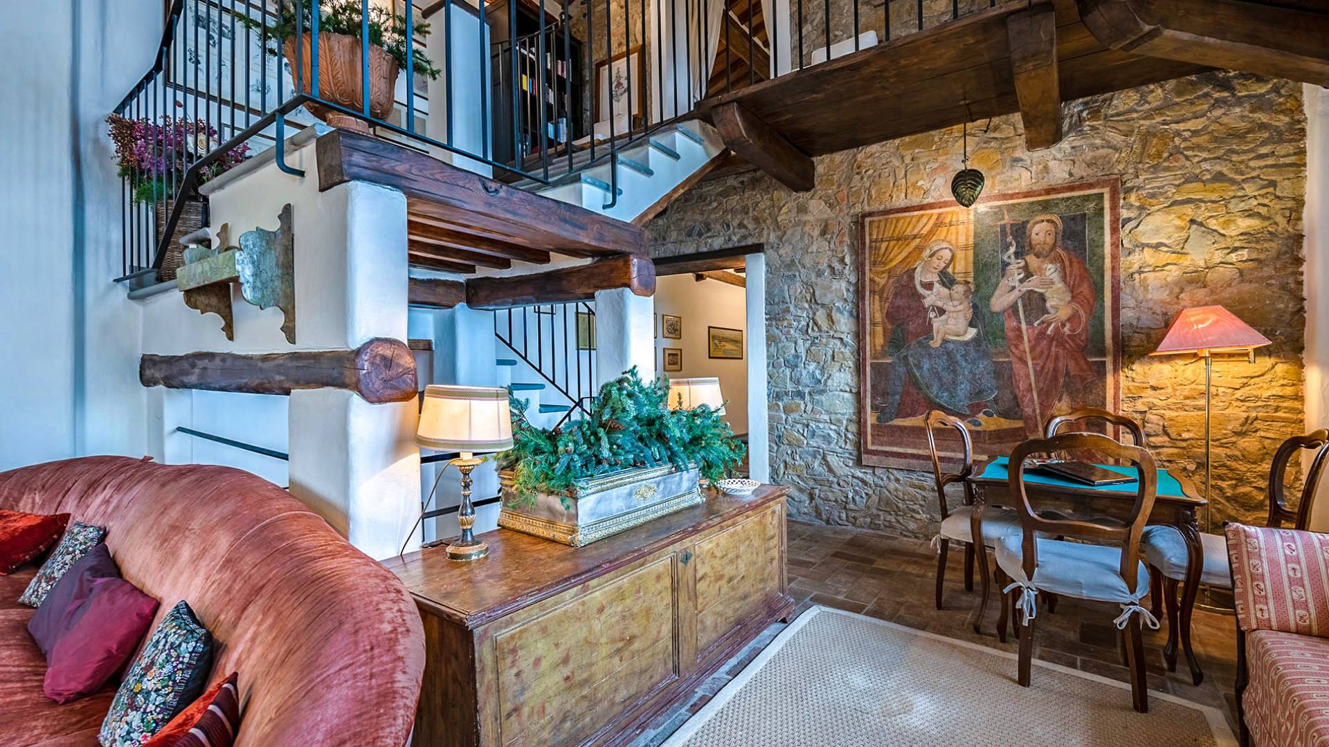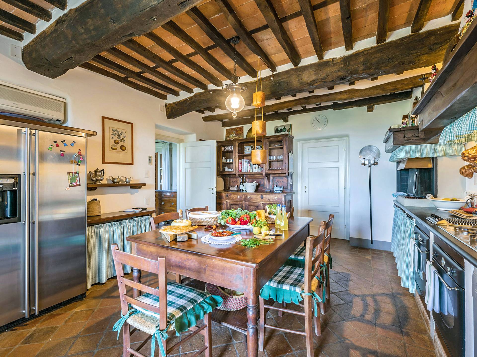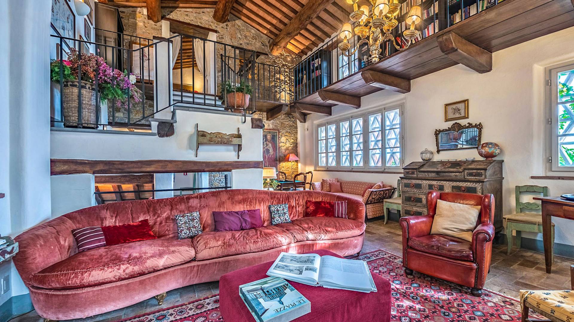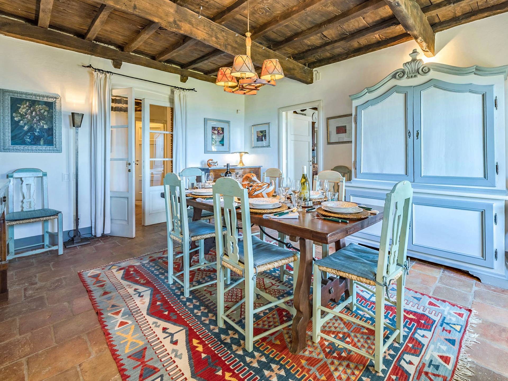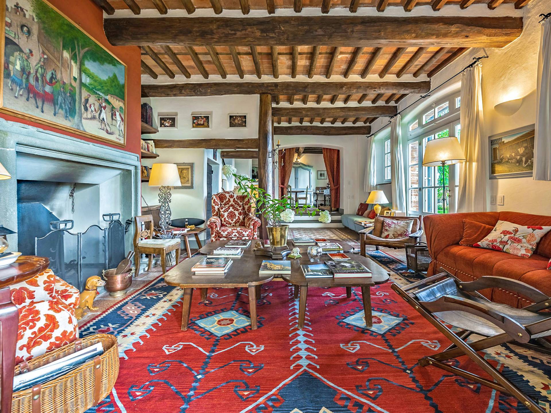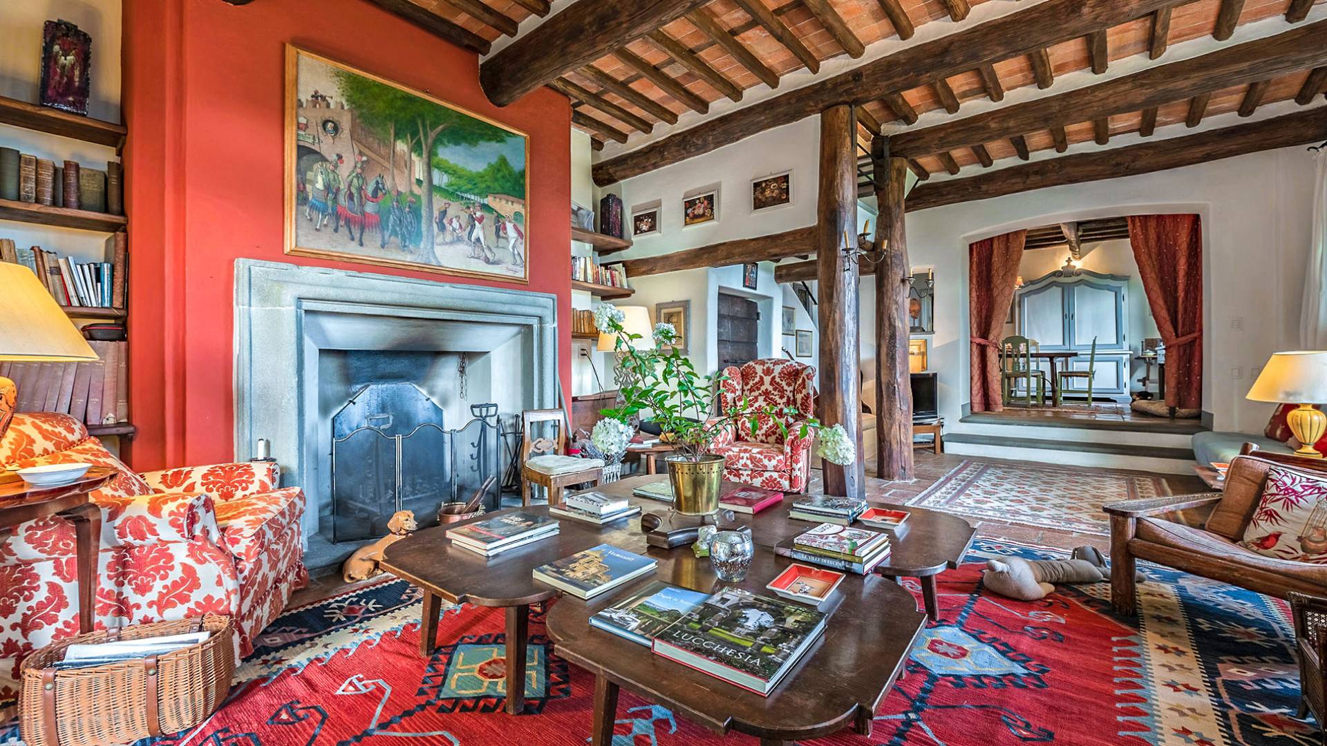 The villa's interior presents a perfect fusion of modern and functional furnishings mixed together with elegant and antique pieces. The rooms are spacious with high ceilings displaying their original wooden beams. The floors have maintained their original red terracotta tiles, and the warm and traditional atmosphere is completed with fine furniture.